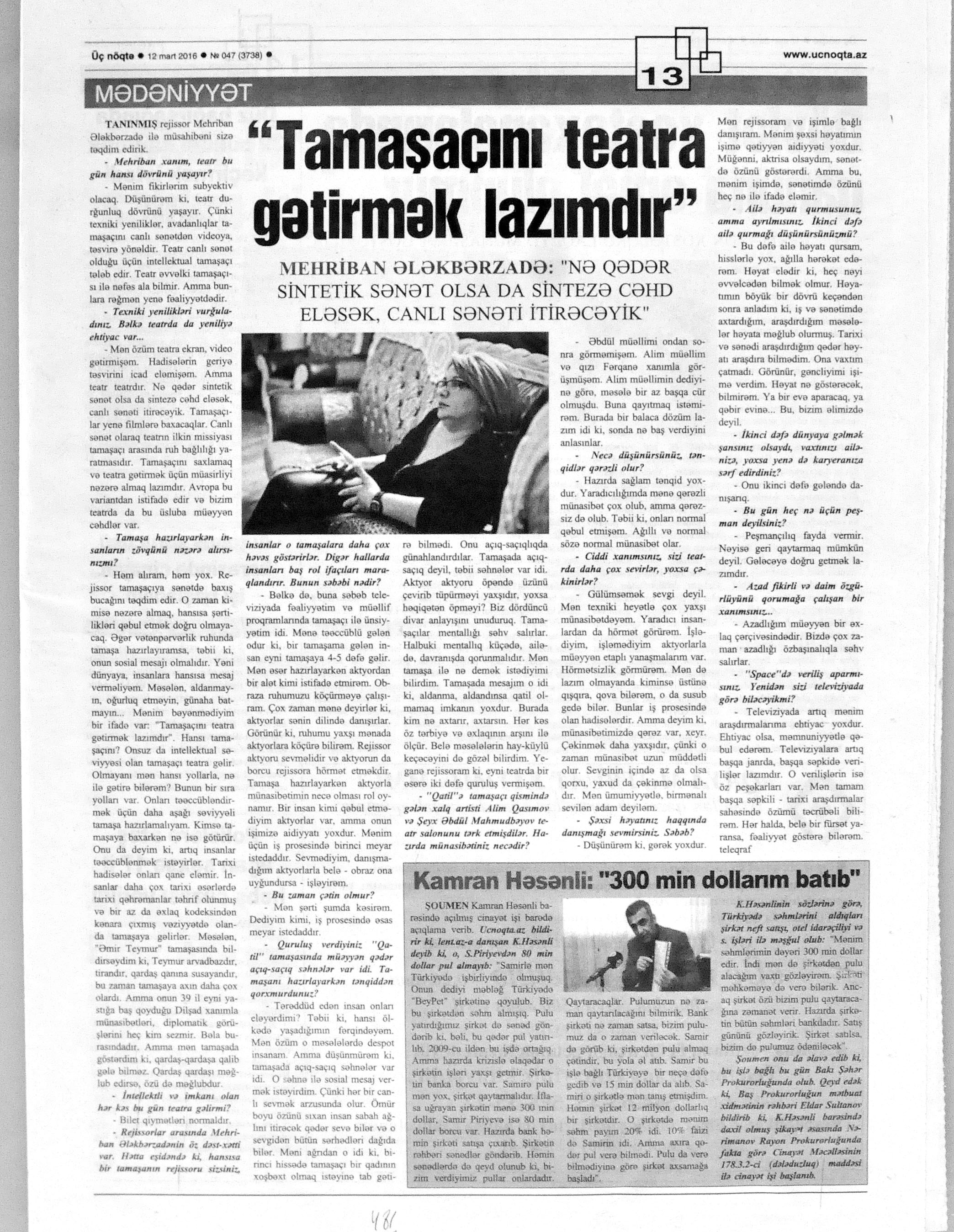 457. Cəfərli, Z. Ürəyində bir arzu tut...: “Mən bətnimdə böyütdüyüm kiçik ermənidən qisas almağa gedirdim, amma...”: [Sərvər Əliyevin “Ürəyində bir arzu tut” tamaşası haqqında] //Təzadlar.- 2016.- 1 mart.- S. 15. 458. “Çox məkanda var olmuşuq”: Yeni məkanda yeni tamaşa: [Mirsahib Ağayevin hazırladığı eyniadlı tamaşa haqqında] //Mədəniyyət.- 2016.- 2 mart.- S. 10. 459. Ələkbərzadə, M. “Tamaşaçını teatra gətirmək lazımdir”: Mehriban Ələkbərzadə: “Nə qədər sintetik sənət olsa da sintezə cəhd eləsək, canlı sənəti itirəcəyik”: [rejissorun musahibəsi] //Üç nöqtə.- 2016.- 12 mart.- S. 13. 460. Əmirbəyova, R. Aktrisanın altı monoloqu: [Səməd Vurğun adına Rus Dram Teatrının aktrisası, Əməkdar artist Rita Əmirbəyova ilə müsahibə] /müsahibəni apardı Gülcahan Mirməmməd //Mədəniyyət.- 2016.- 8 mart.- S. 11. 461. Kazımzadə, A. Kadr arxasında qalan rejissor: Tariyel Vəliyev yüksək mədəniyyətə malik, bacarıqlı və istedadlı şəxsiyyət idi //Kaspi.- 2016.- 19-28 mart.- S.7. 462. Mirməmməd, G. Sevgi üçbucağını sevdirən səs triosu: [Opera və Balet Teatrında oynanılan “Toska” operası haqqında] //Mədəniyyət.- 2016.- 2 mart.- S. 10. 463. Mirməmməd, G. “Şəhər və teatr” fərqli baxış buca-ğında: [AMEA-nın Ədəbiyyat İnstitutunda elmi-praktik konfransın keçirilməsi haqqında] //Mədəniyyət.- 2016.- 8 mart.- S. 7. 464. Nəsrəddinov, N. Ana dilində ilk coğrafiya dərsliyinin müəllifi: Əsgər ağa Goraninin gördüyü işlər millətin qaranlıqdan işığa çıxmasına xidmət edirdi //Kaspi.- 2016.- 19 fevral.- S.1. 465. O, gələcəkdə tanınmış aktyor olacağına əmindir: [Nizami Rayon Uşaq-Gənclər Yaradıcılıq Mərkəzinin üzvü Zeynalabdin Bağırzadə haqqında] //Azərbaycan müəllimi.- 2016.- 12 mart.- S.11. 466. “Olmadı elə, oldu belə” Füzuli teatrının premyerası: [Asif Şirinovun quruluşunda] //Mədəniyyət.- 2016.- 11 mart.- S.4. 467. “Oyuq” studiyasının tamaşası beynəlxalq müsabiqənin qalibi olub: [Abdulla Şaiq adına Azərbaycan Dövlət Kukla Teatrında Cəmilə Allahverdiyevanın hazırladığı tamaşa-konsert haqqında] //Mədəniyyət.- 2016.- 4 mart.- S. 4. 468. Pənahova, A. Sənətkar püxtələşdikcə ucalır: Müsahibimiz Azərbaycan Respublikasının Xalq artisti, “Şöhrət” və “Şərəf” ordenli Amaliya Pənahovadır /müsahibəni apardı Şəmsiyyə Əliqızı //İki sahil.- 2016.- 8 mart.- S.13. 469. Poladov, F. “Onun varlığı nizamlayıcı rol oynayır”: Fuad Poladov: “Seyran Səxavət əsərlərindəki müsbət qəhrəmanların həyatda sona qədər arxasında dayanmağı bacardı”: [Xalq artisti ilə müsahibə] /müsahibəni apardı Ceyhun Musaoğlu //525-ci qəzet.- 2016.- 12 mart.- S. 19. 470. Rəhimli, F. Öz yolu ilə gedən sənətkar: Ağalar İdrisoğlu – 66 //Azad Azərbaycan.- 2016.- 15 mart.- S. 7. 471. Rəis, X. Azərbaycan teatrının baharı gətirən aktrisaları //Kaspi.- 2016.- 17 mart.- S.12. 472. Səfərov, Ş. “Teatrlar arasında rəqabət olmalıdır”: [Azərbaycan Teatr Treninq Mərkəzinin direktoru Şaiq Səfərovla müsahibə] /müsahibəni apardı Gülcahan Mirməmməd //Mədəniyyət.- 2016.- 4 mart.- S. 11. 473. Səhnə fədaisinin 130 illiyi qeyd olunub: [Azərbaycan Dövlət Teatr Muzeyində SSRİ Xalq artisti Sidqi Ruhullanın (Ruhulla Axundov) yubileyinin keçirilməsi haqqında] //Mədəniyyət.- 2016.- 30 mart.- S. 6. 474. Şükufə Musayeva: “Vətənimin işğal olunmasına kənardan baxa bilməzdim”: [Əməkdar artist, Şuşa Dövlət Musiqili Dram teatrının aktrisası ilə müsahibə] /müsahibəni apardı Xəyalə Rəis //Kaspi.- 2016.- 31 mart.- S.12. 475. Təhminə. Kukla Teatrı uşaqlar üçün bir məktəbdir: Rəhman Rəhmanov: “Oynadığımız bütün əsərlər uşaqların həyata baxışında mühüm rol oynayır” //Azad Azərbaycan.- 2016.- 4 mart.- S. 7. 476. Tələbə-aktyorlar “Ölülər”i təqdim ediblər: [Azərbaycan Dövlət Mədəniyyət və İncəsənət Universitetinin tələbələri] //Mədəniyyət.- 2016.-8 mart.- S. 7. 477. Tələbələr “Şekspir yaşayır” festivalının tədris proqramında: [Mədəniyyət və İncəsənət Universitetinin SABAH qrupu tələbələri və ADO müstəqil teatr qrupu “British Council” ilə əməkdaşlıq əsasında kiçik teatr kollektivləri və teatr fakültəsi tələbələri üçün tədris proqramında] //Mədəniyyət.- 2016.- 18 mart.- S. 6. 478. Tələbələr üçün teatr tədrisi proqramı: [Mədəniyyət və İncəsənət Universitetinin SABAH qrupu tələbələri və ADO müstəqil teatr qrupu “British Council” ilə əməkdaşlıq əsasında kiçik teatr kollektivləri və teatr fakültəsi tələbələri] //Mədəniyyət.- 2016.- 11 mart.- S. 4; 18 mart.- S. 6. 479. Yusifli, V. Teatra bağlı bir ömür: (“Sənət fədailəri” silsiləsindən) : [Əməkdar artist Bürcəli Əsgərov haqqında] //Ədalət.- 2016.- 30 mart. - S.3. Bax: 754