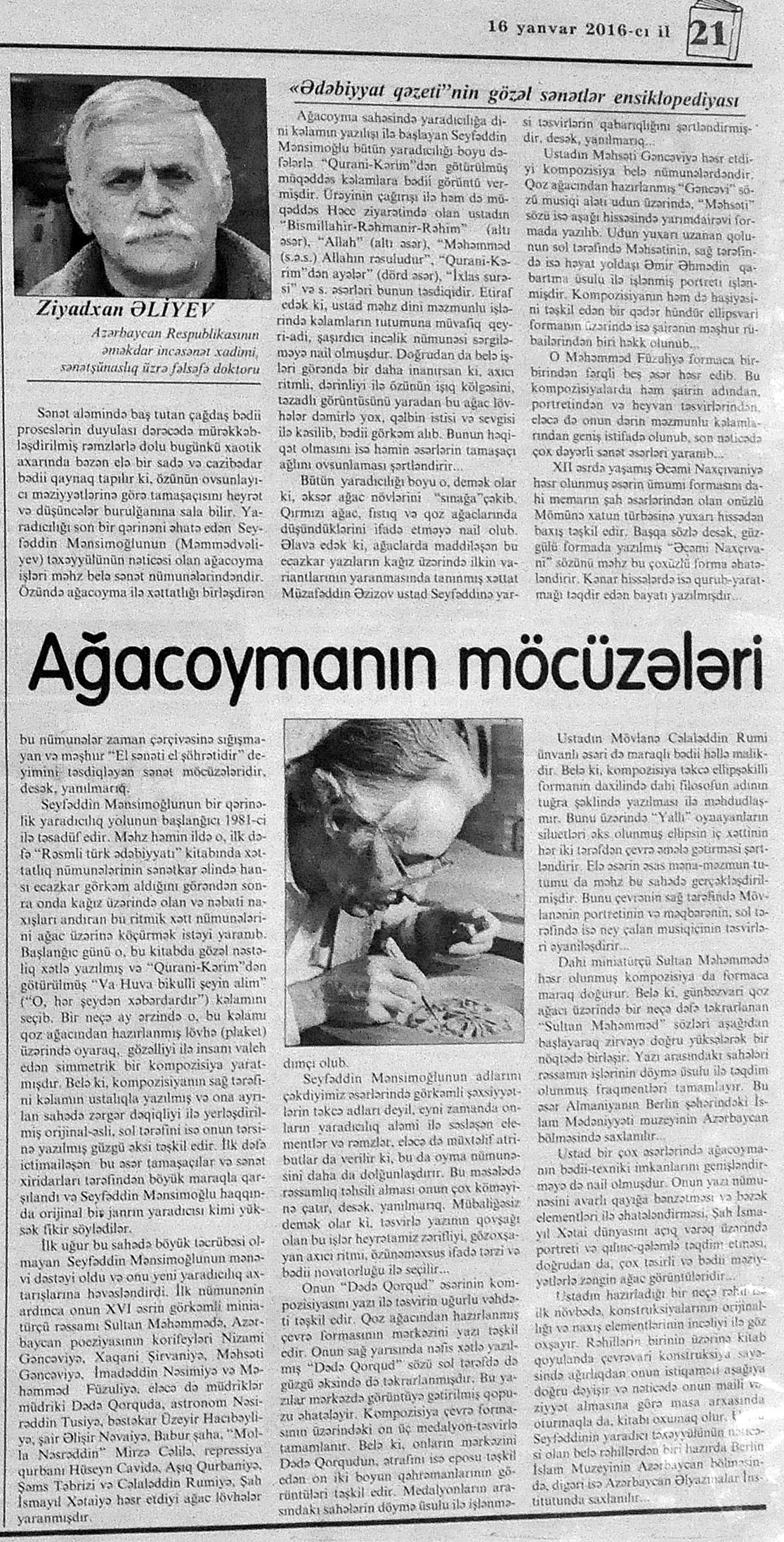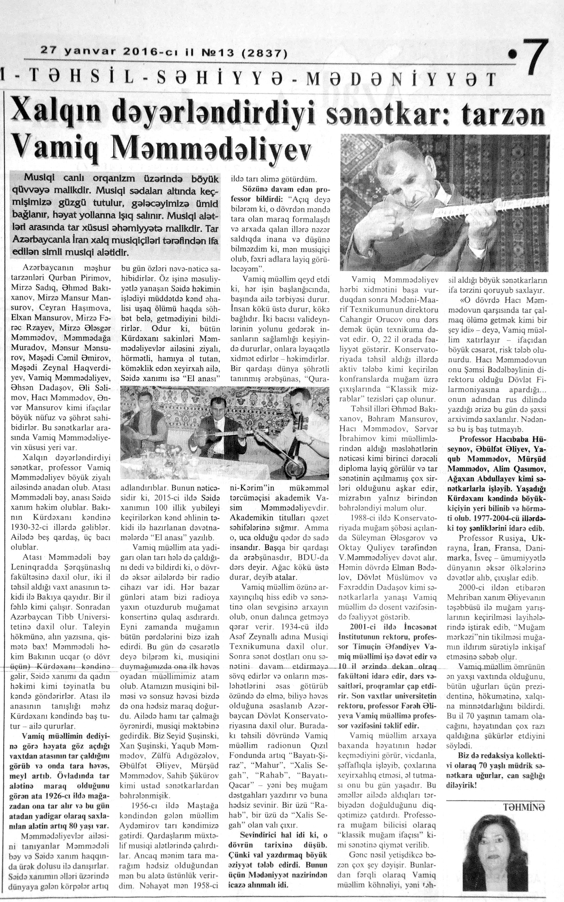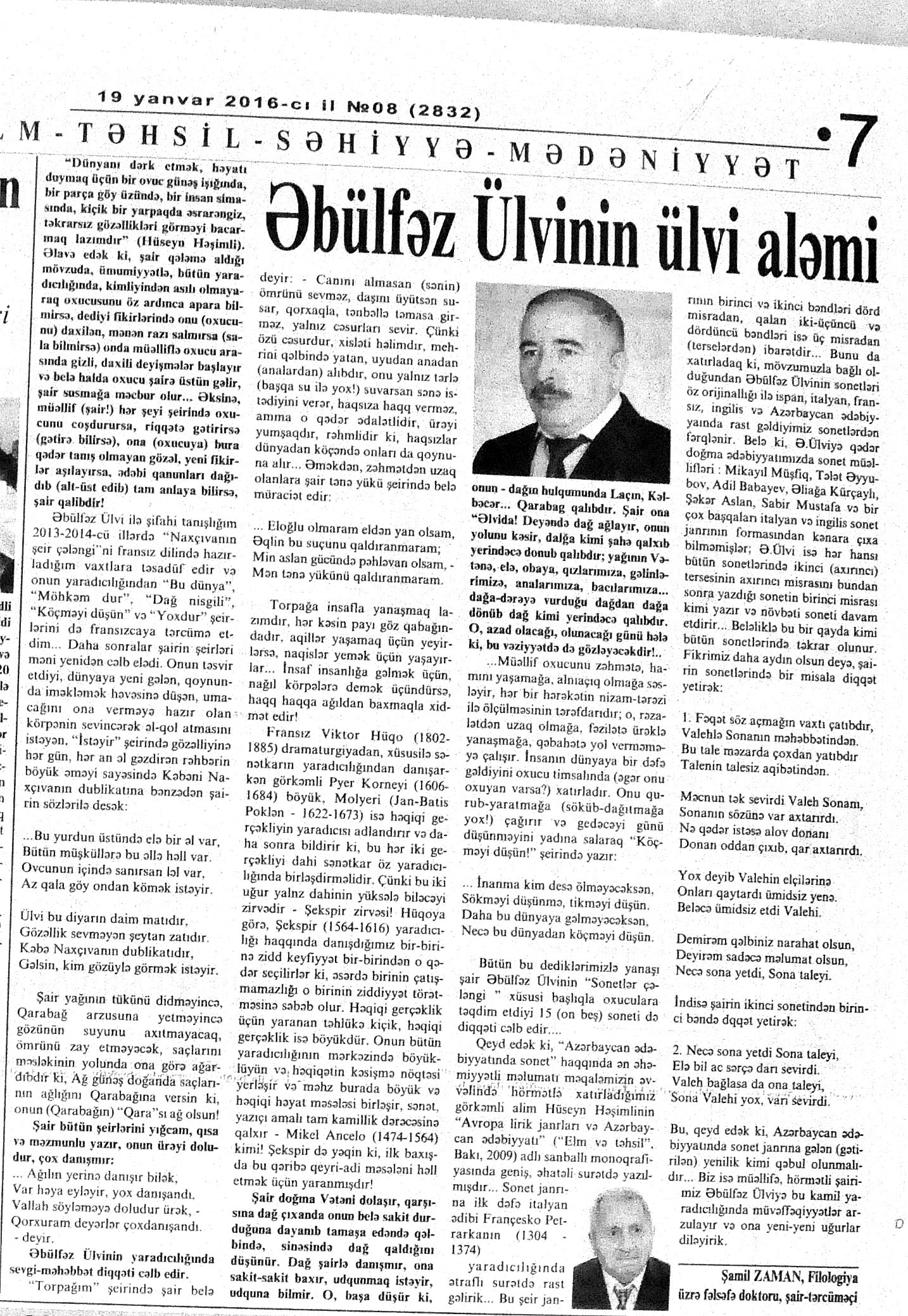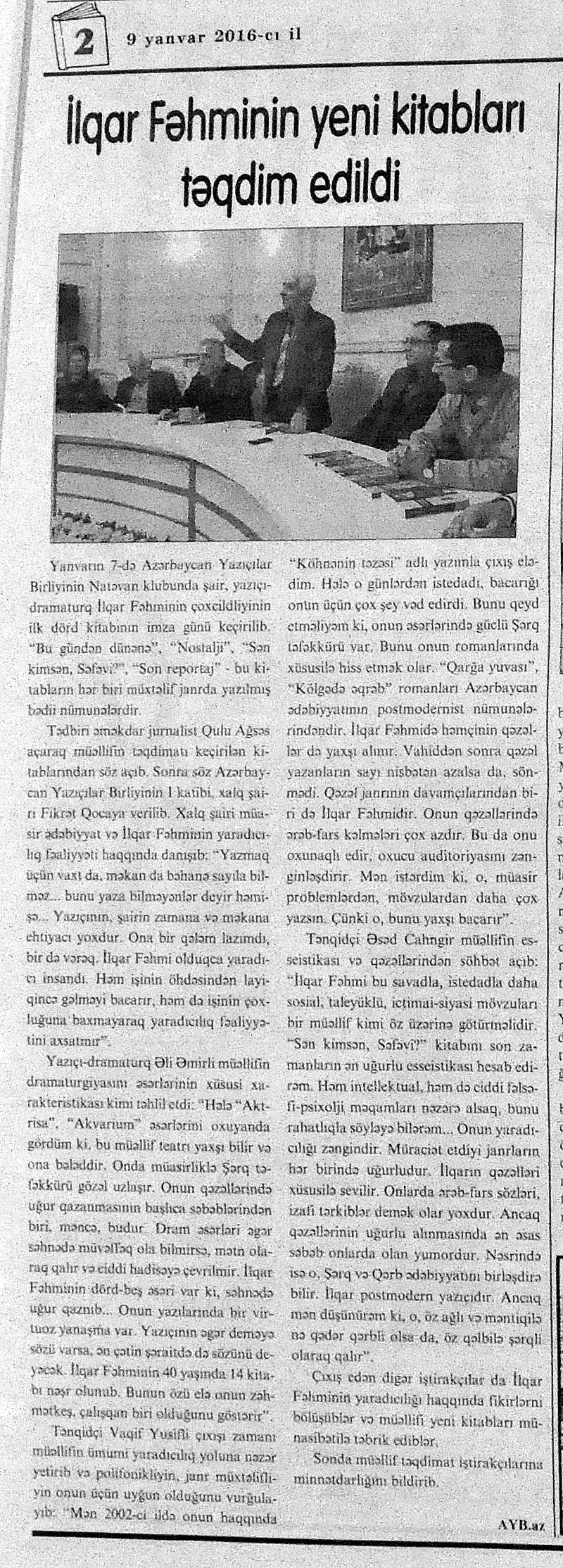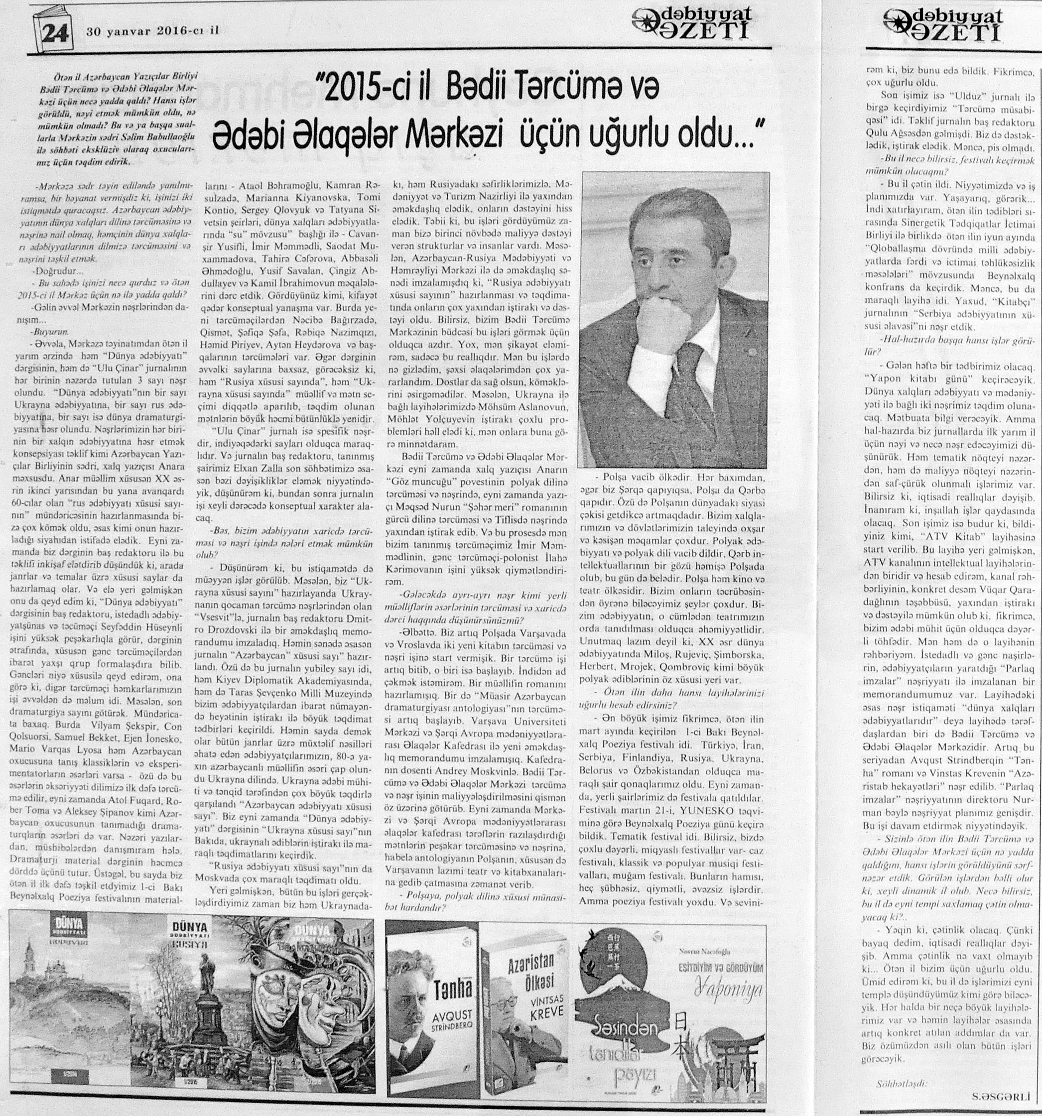 yanvar 2016-cı il //Azərbaycan.- 2016.- 12 yanvar.- S.6; Mədəniyyət.- 2016.-