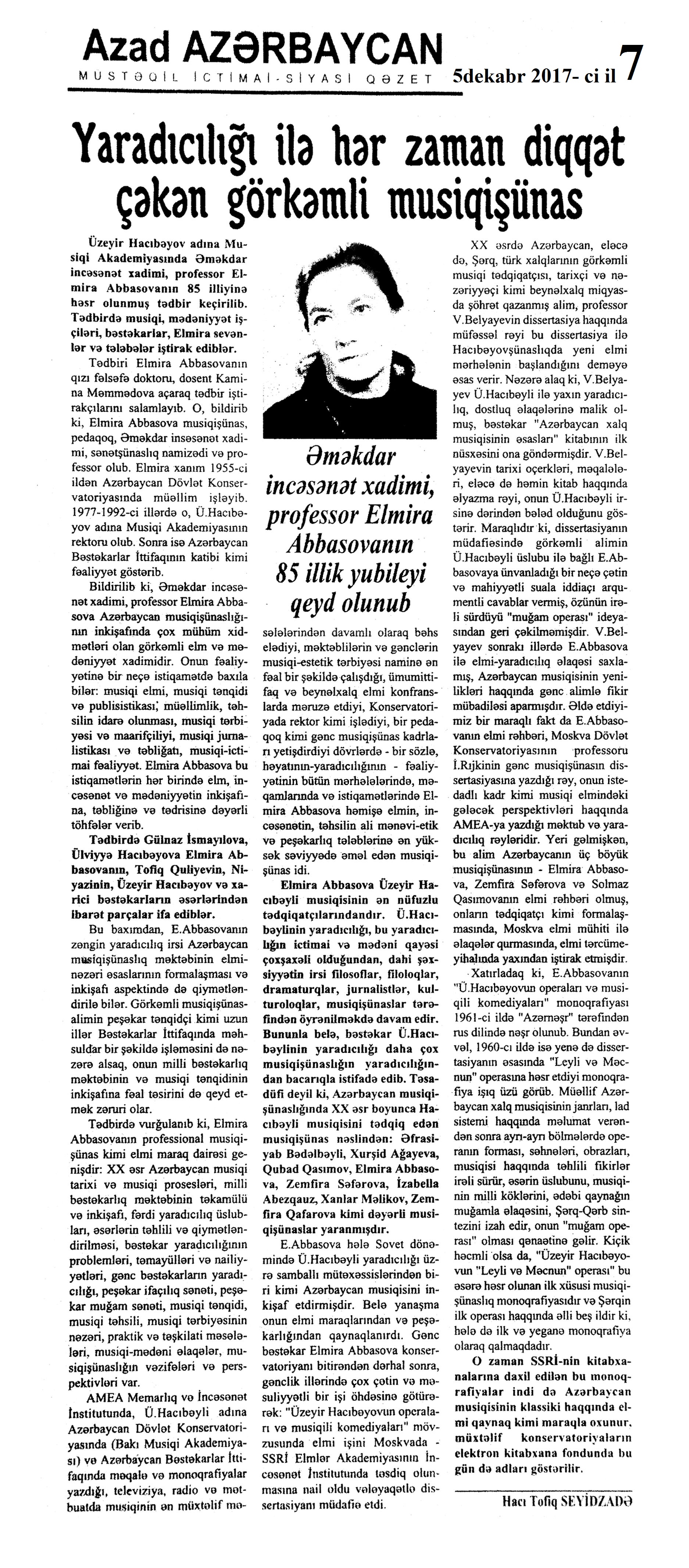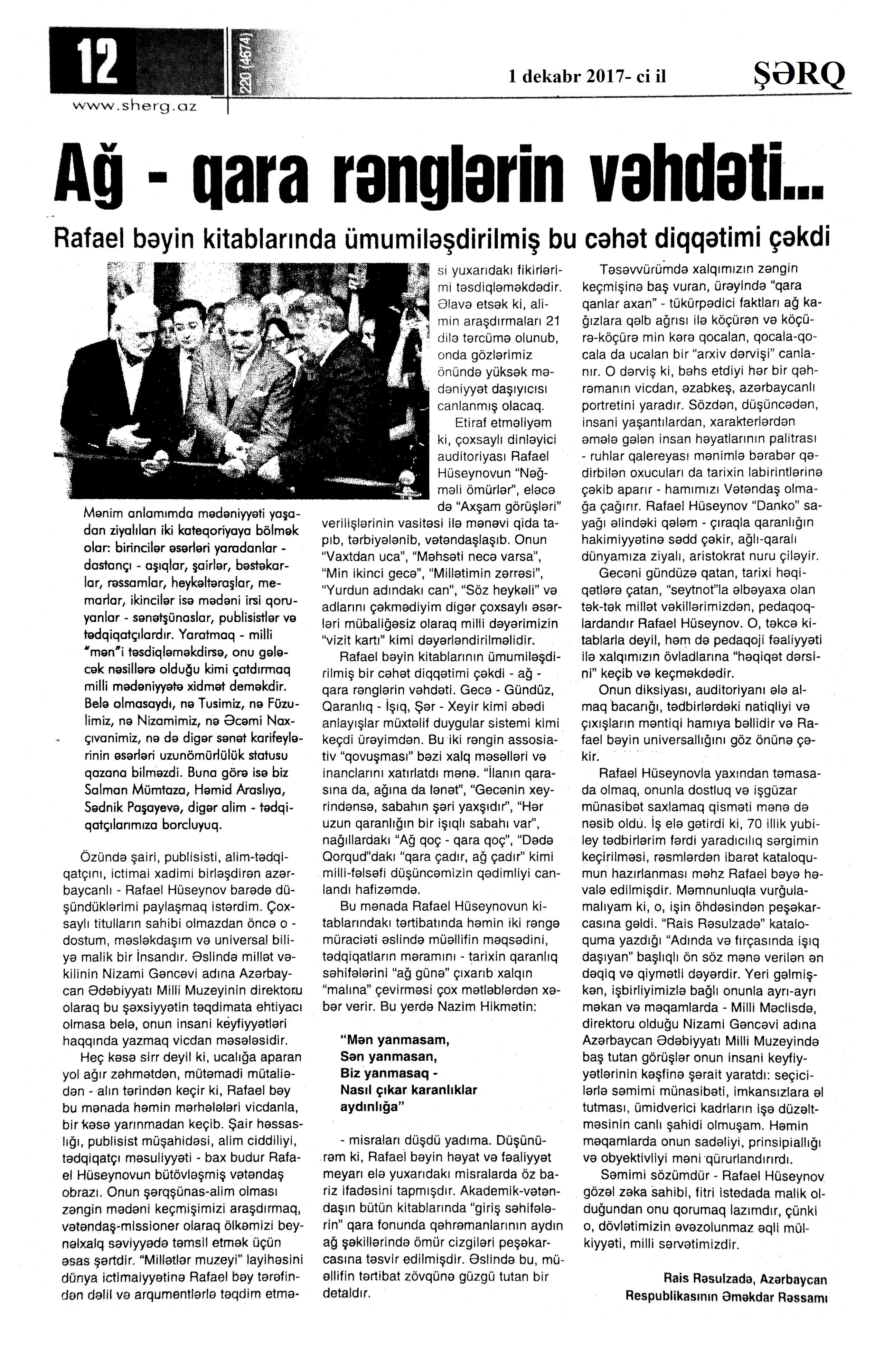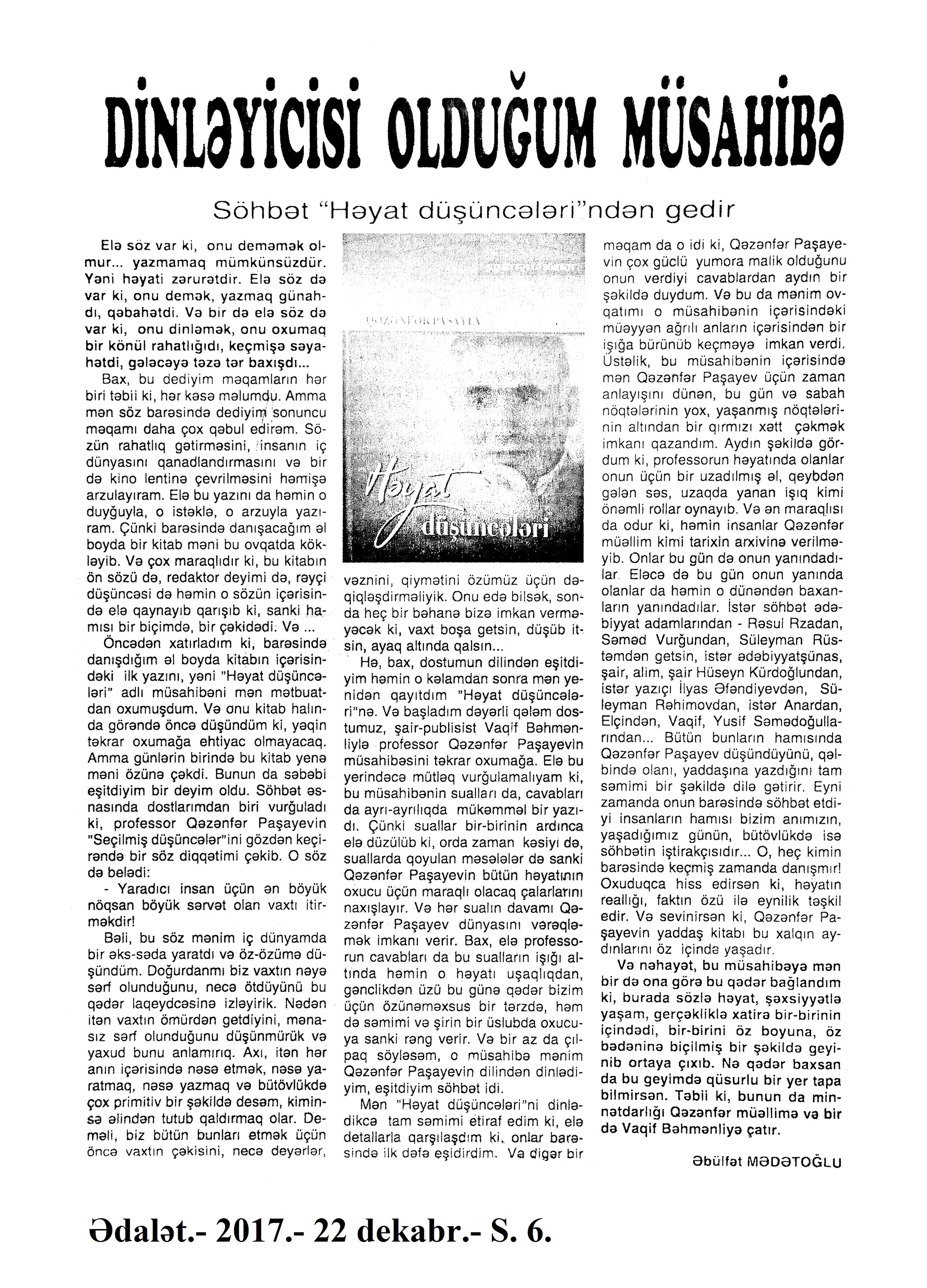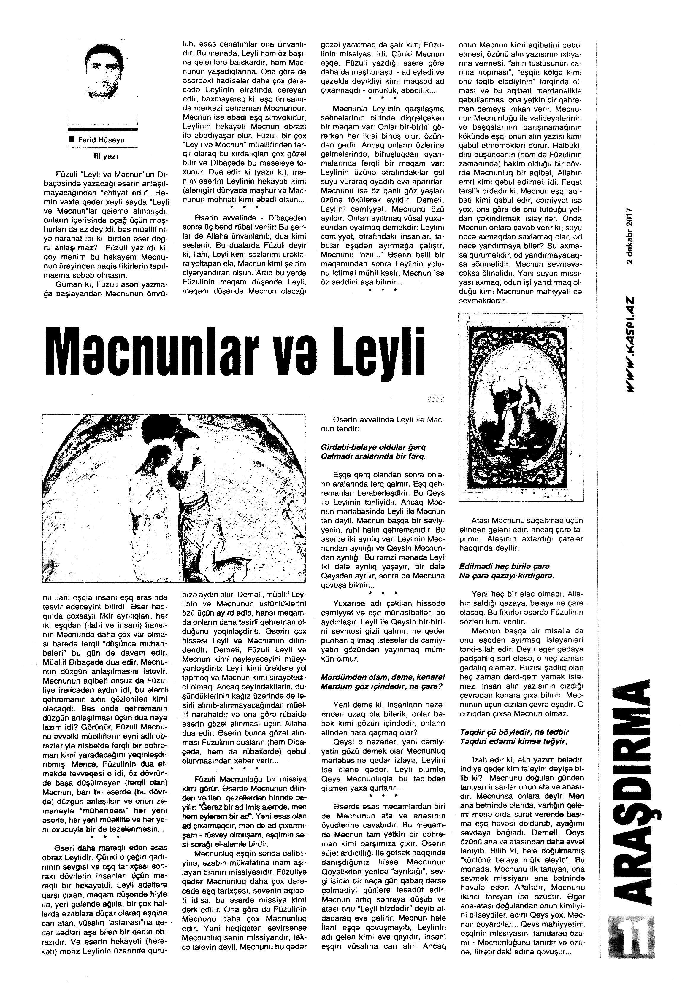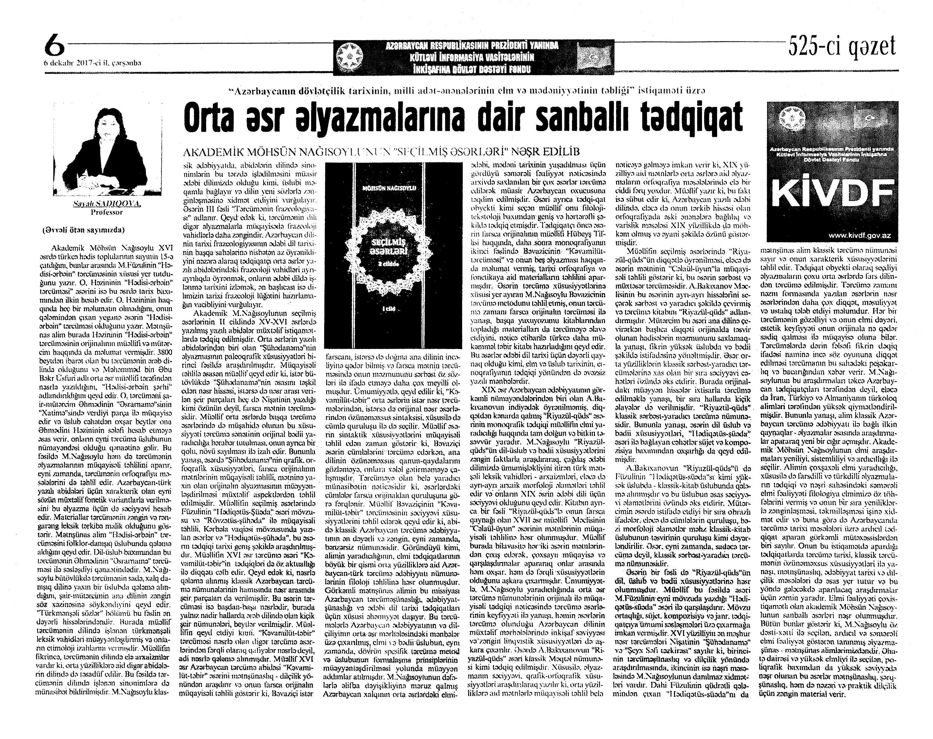 ESSELƏR 724. Babullaoğlu, S. Rəqəmlərdən mətləblərə... //525-ci qəzet.- 2017.- 9 dekabr.- S.13. 725. Hüseyn, F. Məcnunlar və Leyli //Kaspi.-2017.- 2 dekabr.- S.11. 726. Mehdi, Q. Əzizim Sərvaz...: Təəssürat-esse: [şair Sərvaz Hüseynoğluya həsr olunur] //Ədəbiyyat qəzeti.- 2017.- 23 dekabr.- S.25. 727. Niyazov, X. Xeyirxahlığın fəlsəfəsi və fəlsəfəsiz xeyirxahlıq //525-ci qəzet.- 2017.- 16 dekabr.- S.10. 728. Yusifli, C. Qorxmaz müəllim yaxud ömür mətni: [professor Qorxmaz Quliyev haqqında] //Ədəbiyyat qəzeti.- 2017.- 30 dekabr.- S.14-15.