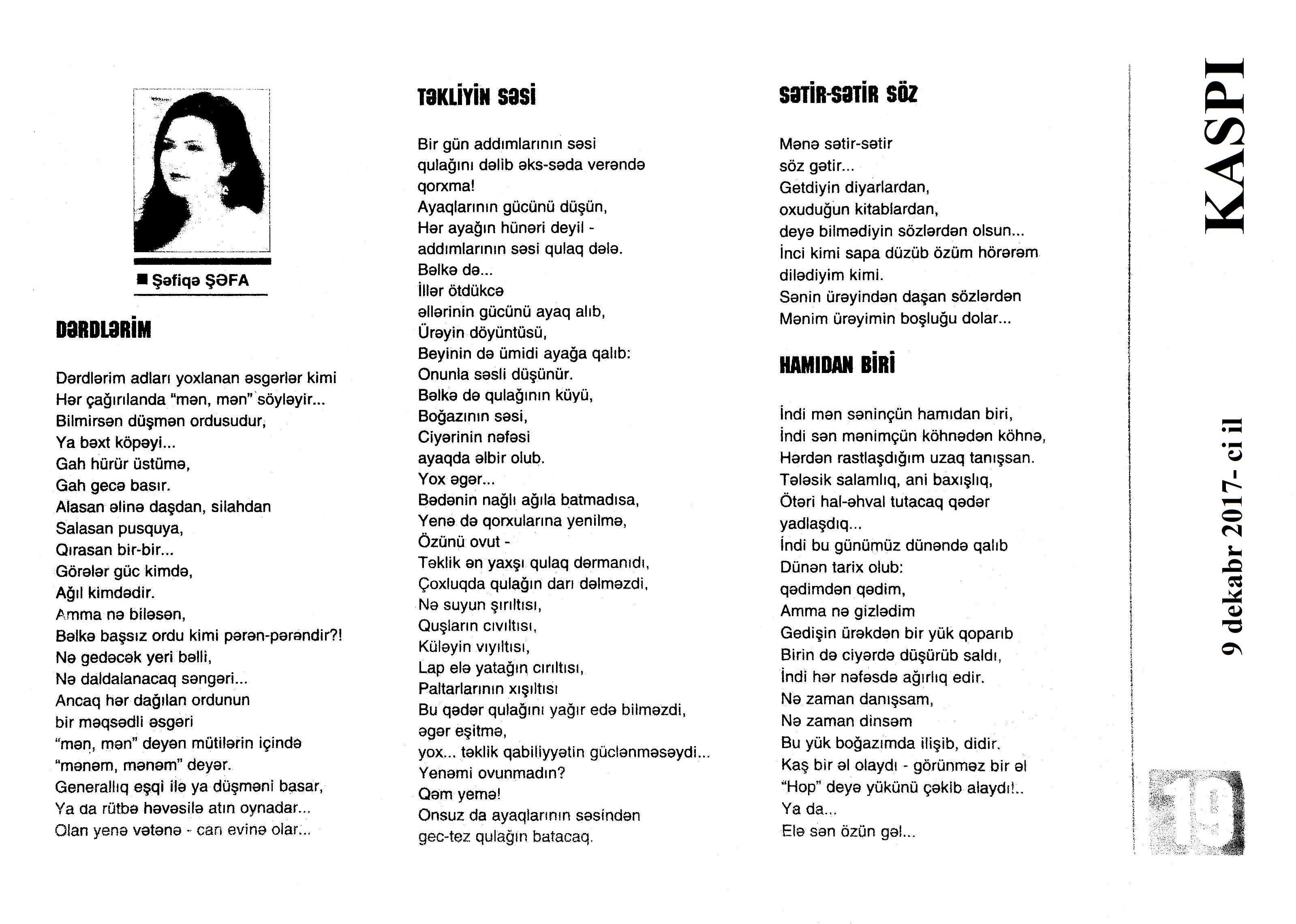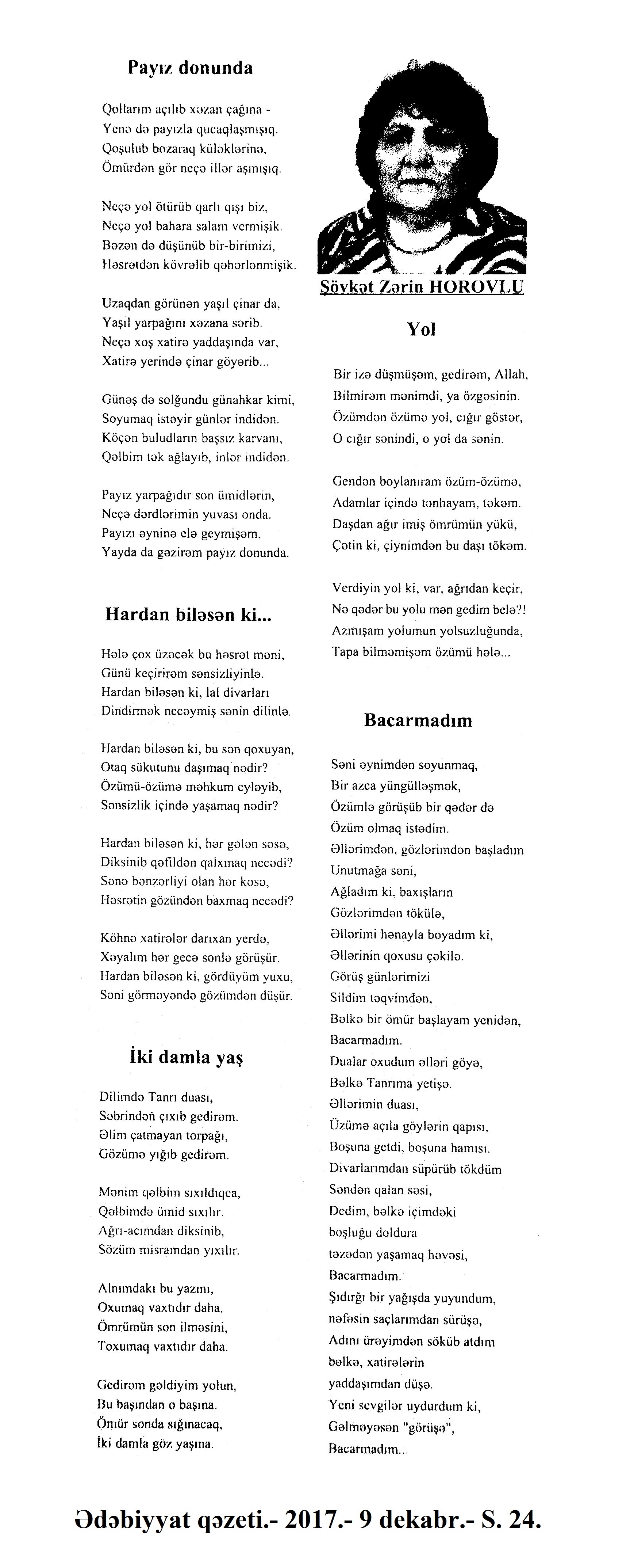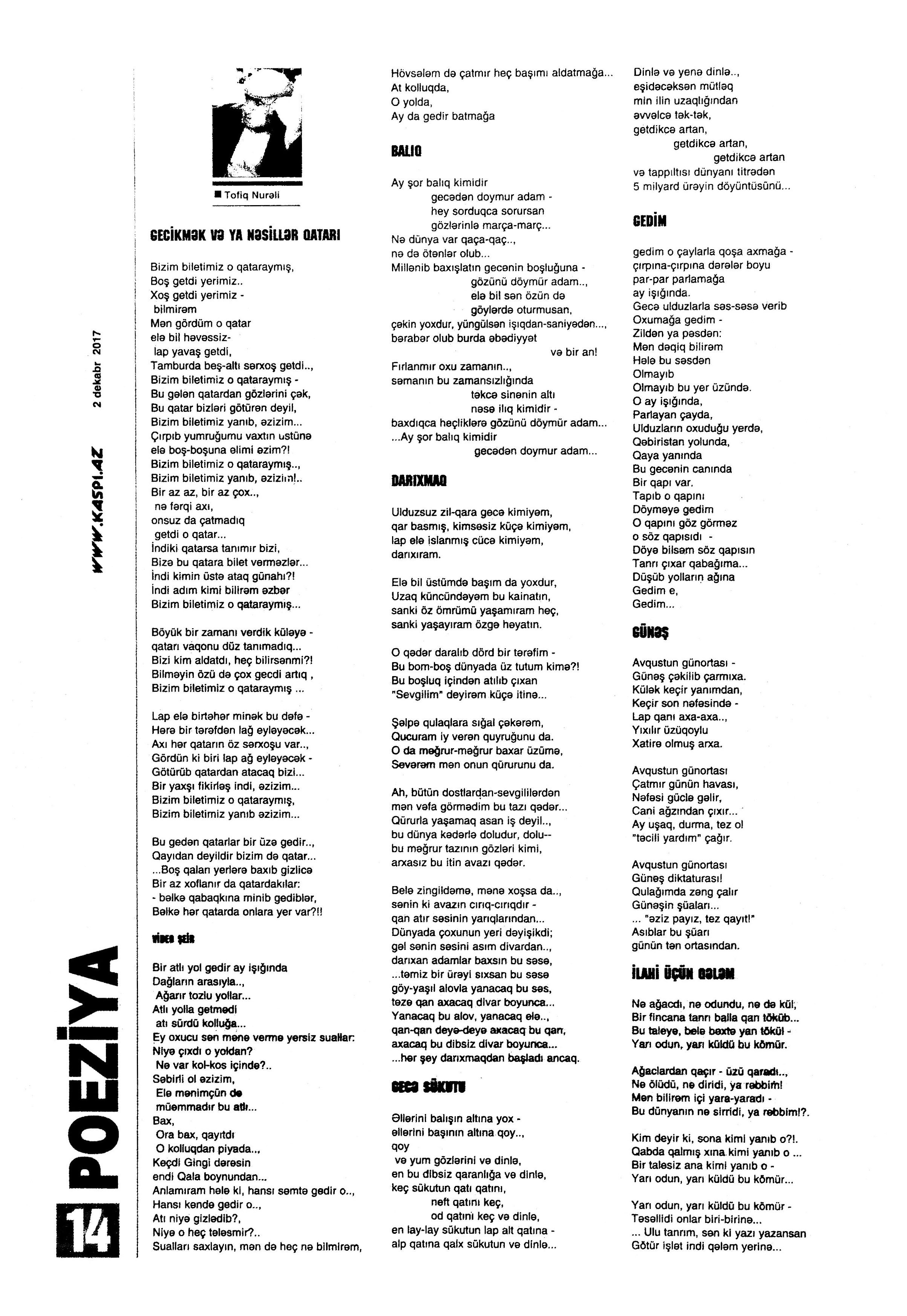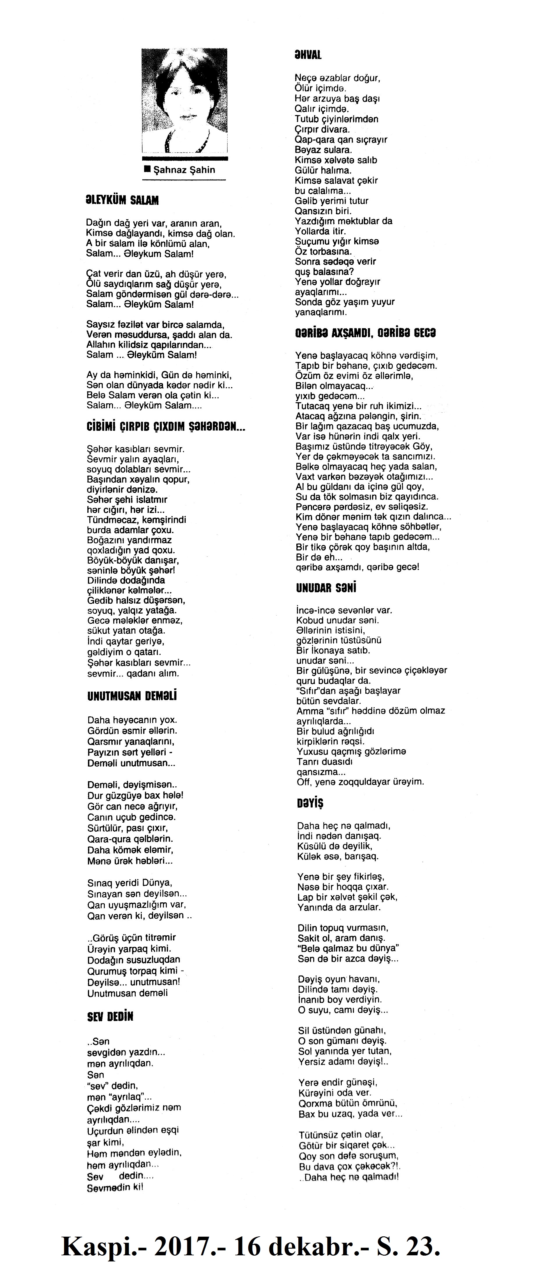 Varsa; Görmüşəm; Törəyər və s. 634. Kəbirli, T. Yetişər zəfər çağı: Humay qayasını düşünərkən; Səhv etmirikmi? //Ədalət.- 2017.- 6 dekabr.- S.8. 635. Kərimova, A. Gənc şairin ilk kitabı – Maarif Soltan: Kəndimizin kədəri; Atamın dediklərindən; Bir təpə üstündə düşündüklərim; Ötür... //Kaspi.- 2017.- 16-18 dekabr.- S.17. 636. Qafarlı, Z. Döğru; Yaşamaq; Canım; Mən niyə təkəm və s. //Ədalət.- 2017.- 9-11 dekabr.- S.23. 637. Qaraçaylı, V. Göy hasarın üstündən sallanan ağ yasəmən...; Zəlimxan köçür //Ədəbiyyat qəzeti.- 2017.- 2 dekabr.- S.25. 638. Qoca, F. Anam Azad Azərbaycan //Azərbaycan.- 2017.- 21 dekabr.- S.12.; Ədəbiyyat qəzeti.-2017.- 23 dekabr.- S.3. 639. Qoca, F. Qüds //Ədəbiyyat qəzeti.- 2017.- 30 dekabr.- S.3.; 525-ci qəzet.- 2017.- 26 dekabr.- S.7. 640. Qoca, F. Xalqın səninlədir, zəfər sənindir... //Azərbaycan. - 2017.- 24 dekabr.- S.1. 641. Lee, L. Uşaqlıq üçün himn: [amerikan ədəbiyyatı] /ingilis dilindən tərc.etdi Cavanşir Yusifli //Ədəbiyyat qəzeti.- 2017.- 9 dekabr.- S.29. 642. Mahmudzadə, L. Sona yetir məktəb illəri //Azərbaycan müəllimi.- 2017.- 8 dekabr.- S.14. 643. Mədətoğlu, Ə. Sizə ahımı göndərdim //Kaspi.- 2017.- 30 dekabr.- S.14. 644. Məmmədzadə, R. Beşik himni; Yaşamaq olmaz; “Ağdamın baməzə adamları” silsiləsindən: I “Dəli” Dilbər; II Oxuyan Elman və s. //525-ci qəzet.- 2017.- 16 dekabr.- S.22. 645. Murquzova, M. Sülh; Oxumaq //Azərbaycan müəllimi.- 2017.- 8 dekabr.- S.14. 646. Musa, M. Vətənimi sevirəm //Azərbaycan müəllimi.- 2017.- 8 dekabr.- S.14. 647. Mustafa, R. Günel; Sən yaxşı adamsan; Bir də görürsən ki...; Unutmayacam səni; Köhnə Bakı; //Ədəbiyyat qəzeti.- 2017.- 9 dekabr.- S.4. 648. Müşfiq, Ş. Ölmək gərək bəzən; Nə fərqi; Getmək düşüb könlümə; Düşüncə //Ədəbiyyat qəzeti.- 2017.- 16 dekabr.- S.11. 649. Nizam, M. İçində; Niyə dilənirsən... ; Hava bürosu və s. //Kredo.- 2017.- 15 dekabr.- S. 12. 650. Nurəli, T. Gecikmək və ya nəsillər qatarı; Video şeir; Balıq; Darıxmaq və s. //Kaspi.- 2017.- 2-4 dekabr.- S.14. 651. Nurəli, T. Səni gözləyirdim; Tale; Sual; Mənim adım və s. //Kaspi.- 2017.- 16-18 dekabr.- S.18. 652. Pas, O. Himn üçün başlanğıc: Gözlərin (1943-1948); Unutmaq; Yaşıl mürəkkəblə yaz; Bağ; Küçəylə gedirəm...: [fransız ədəbiyyatı] /tərc. etdi Cavanşir Yusifli //Ədəbiyyat qəzeti.- 2017.- 2 dekabr.- S.5.