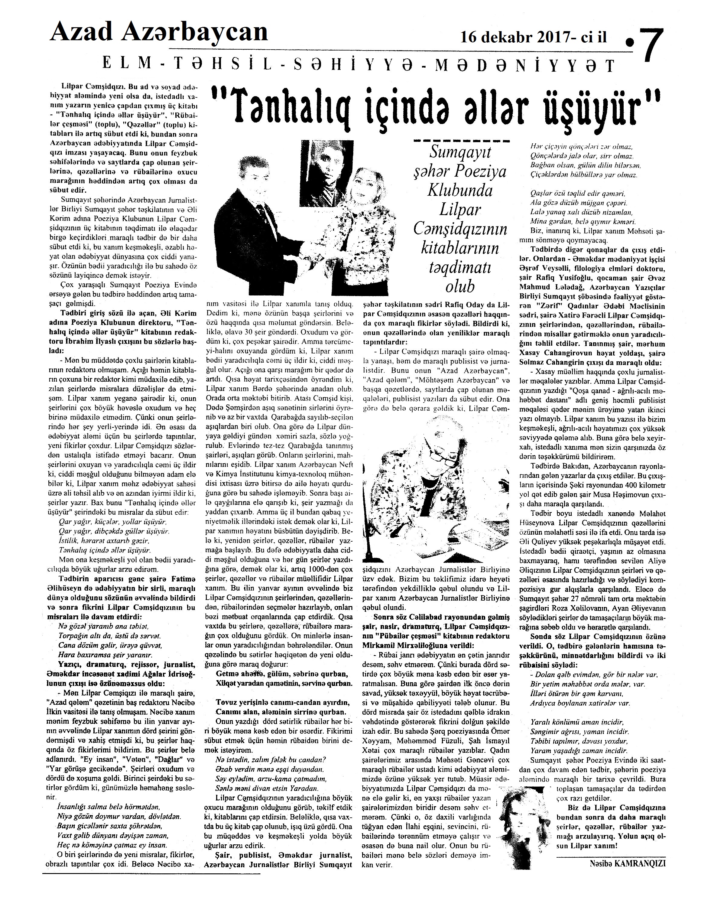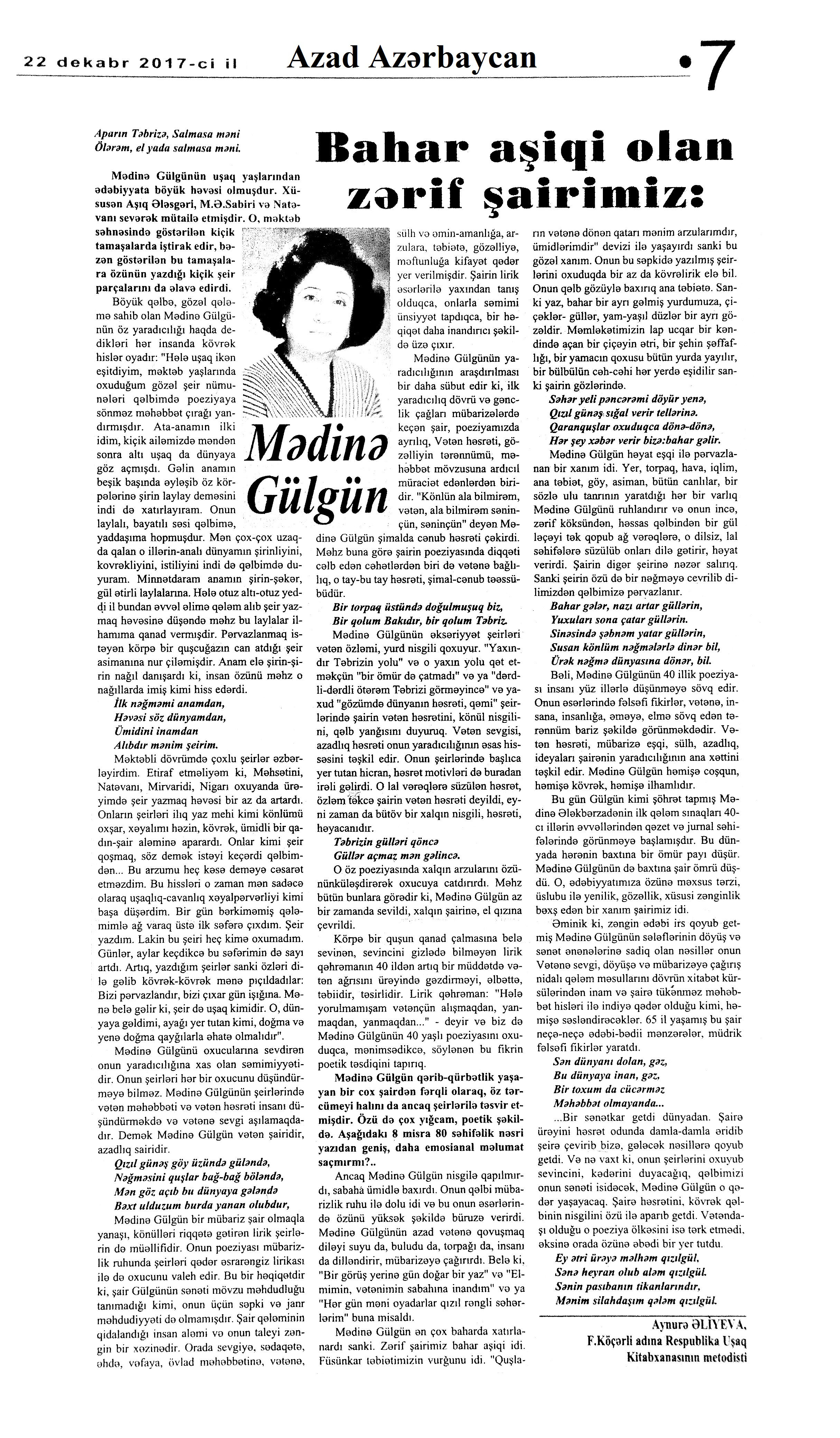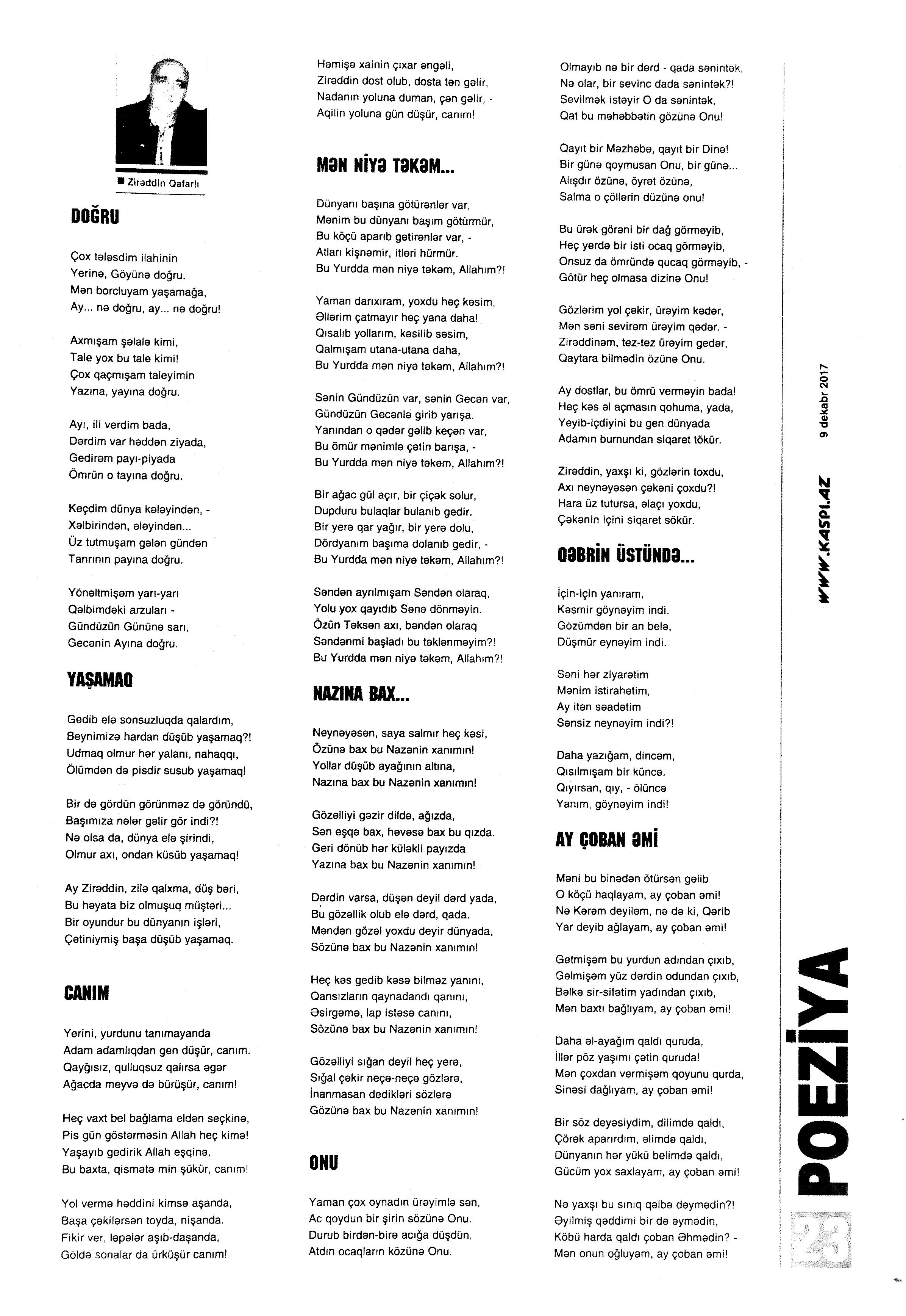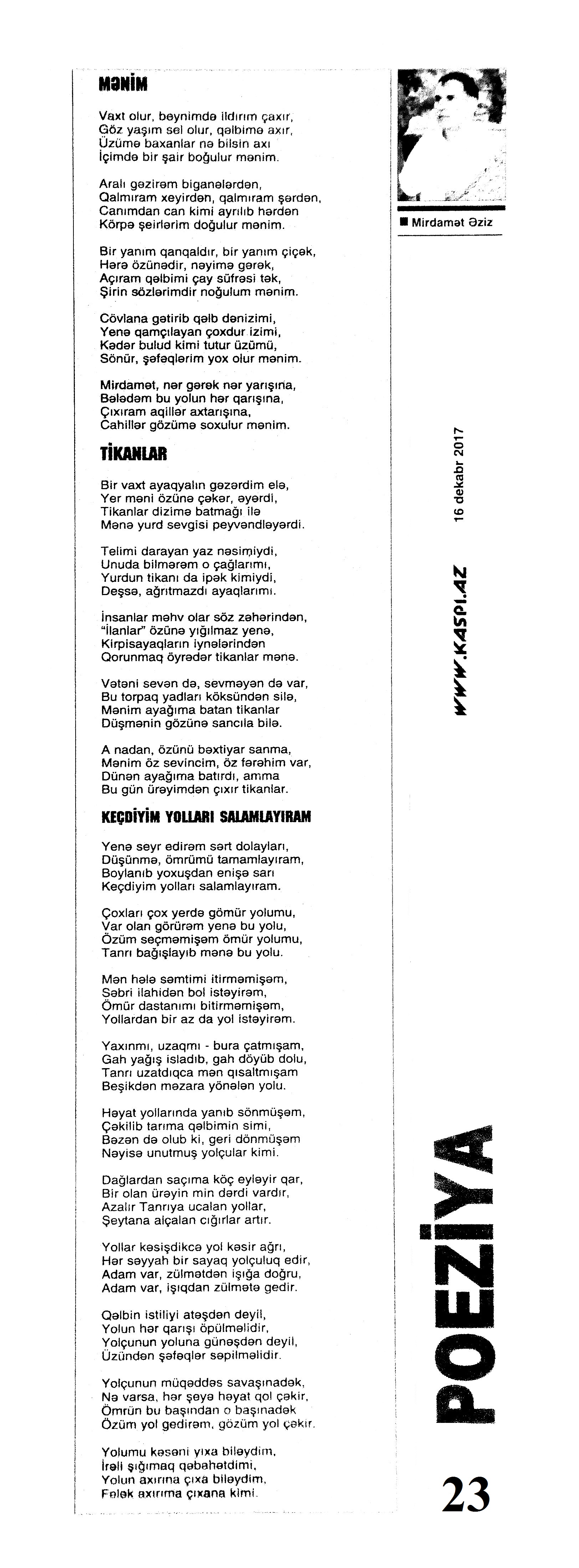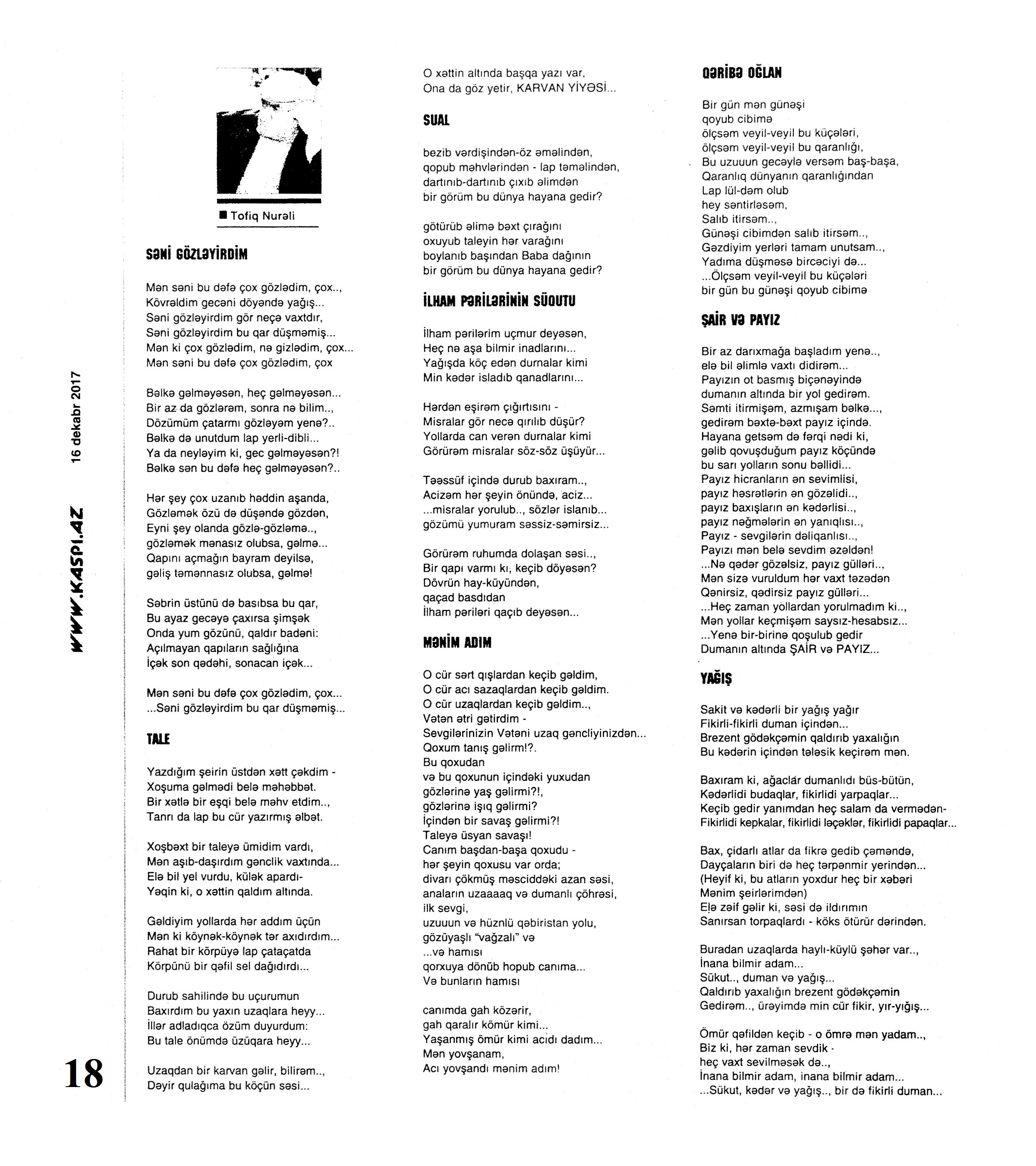 Varsa; Görmüşəm; Törəyər və s. 634. Kəbirli, T. Yetişər zəfər çağı: Humay qayasını düşünərkən; Səhv etmirikmi? //Ədalət.- 2017.- 6 dekabr.- S.8. 635. Kərimova, A. Gənc şairin ilk kitabı – Maarif Soltan: Kəndimizin kədəri; Atamın dediklərindən; Bir təpə üstündə düşündüklərim; Ötür... //Kaspi.- 2017.- 16-18 dekabr.- S.17. 636. Qafarlı, Z. Döğru; Yaşamaq; Canım; Mən niyə təkəm və s. //Ədalət.- 2017.- 9-11 dekabr.- S.23. 637. Qaraçaylı, V. Göy hasarın üstündən sallanan ağ yasəmən...; Zəlimxan köçür //Ədəbiyyat qəzeti.- 2017.- 2 dekabr.- S.25. 638. Qoca, F. Anam Azad Azərbaycan //Azərbaycan.- 2017.- 21 dekabr.- S.12.; Ədəbiyyat qəzeti.-2017.- 23 dekabr.- S.3. 639. Qoca, F. Qüds //Ədəbiyyat qəzeti.- 2017.- 30 dekabr.- S.3.; 525-ci qəzet.- 2017.- 26 dekabr.- S.7. 640. Qoca, F. Xalqın səninlədir, zəfər sənindir... //Azərbaycan. - 2017.- 24 dekabr.- S.1. 641. Lee, L. Uşaqlıq üçün himn: [amerikan ədəbiyyatı] /ingilis dilindən tərc.etdi Cavanşir Yusifli //Ədəbiyyat qəzeti.- 2017.- 9 dekabr.- S.29. 642. Mahmudzadə, L. Sona yetir məktəb illəri //Azərbaycan müəllimi.- 2017.- 8 dekabr.- S.14. 643. Mədətoğlu, Ə. Sizə ahımı göndərdim //Kaspi.- 2017.- 30 dekabr.- S.14. 644. Məmmədzadə, R. Beşik himni; Yaşamaq olmaz; “Ağdamın baməzə adamları” silsiləsindən: I “Dəli” Dilbər; II Oxuyan Elman və s. //525-ci qəzet.- 2017.- 16 dekabr.- S.22. 645. Murquzova, M. Sülh; Oxumaq //Azərbaycan müəllimi.- 2017.- 8 dekabr.- S.14. 646. Musa, M. Vətənimi sevirəm //Azərbaycan müəllimi.- 2017.- 8 dekabr.- S.14. 647. Mustafa, R. Günel; Sən yaxşı adamsan; Bir də görürsən ki...; Unutmayacam səni; Köhnə Bakı; //Ədəbiyyat qəzeti.- 2017.- 9 dekabr.- S.4. 648. Müşfiq, Ş. Ölmək gərək bəzən; Nə fərqi; Getmək düşüb könlümə; Düşüncə //Ədəbiyyat qəzeti.- 2017.- 16 dekabr.- S.11. 649. Nizam, M. İçində; Niyə dilənirsən... ; Hava bürosu və s. //Kredo.- 2017.- 15 dekabr.- S. 12. 650. Nurəli, T. Gecikmək və ya nəsillər qatarı; Video şeir; Balıq; Darıxmaq və s. //Kaspi.- 2017.- 2-4 dekabr.- S.14. 651. Nurəli, T. Səni gözləyirdim; Tale; Sual; Mənim adım və s. //Kaspi.- 2017.- 16-18 dekabr.- S.18. 652. Pas, O. Himn üçün başlanğıc: Gözlərin (1943-1948); Unutmaq; Yaşıl mürəkkəblə yaz; Bağ; Küçəylə gedirəm...: [fransız ədəbiyyatı] /tərc. etdi Cavanşir Yusifli //Ədəbiyyat qəzeti.- 2017.- 2 dekabr.- S.5.