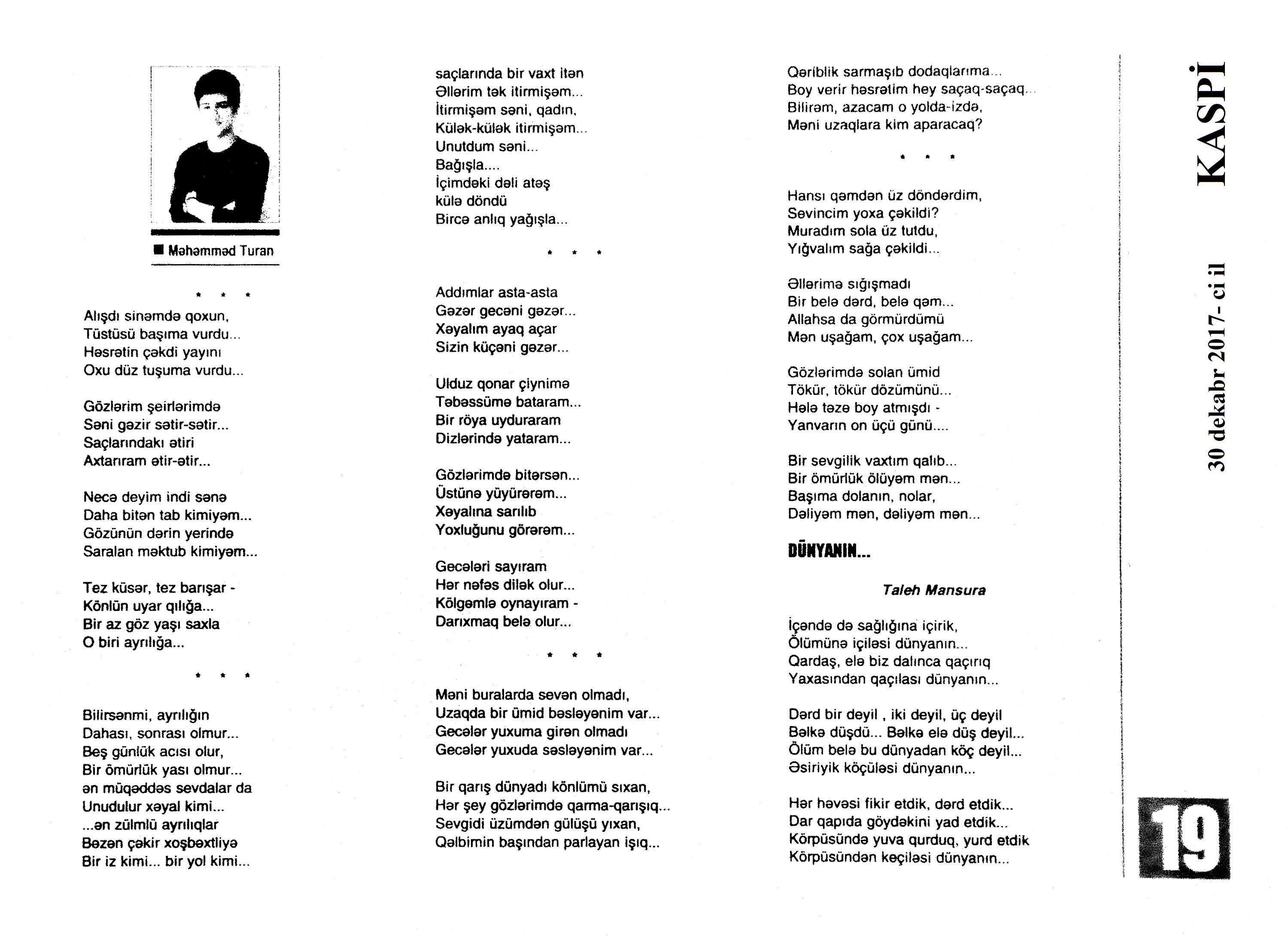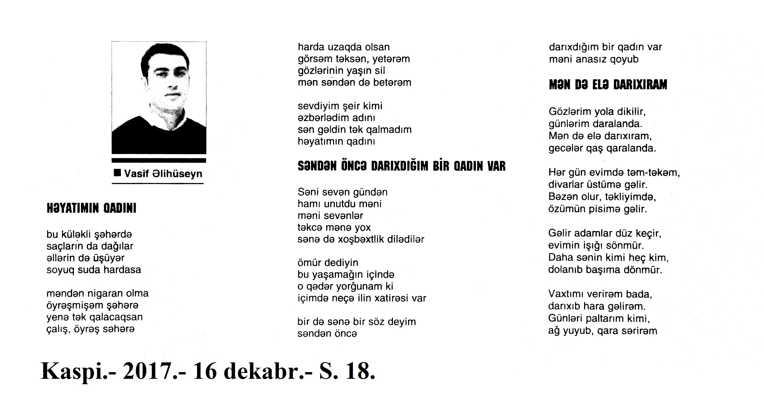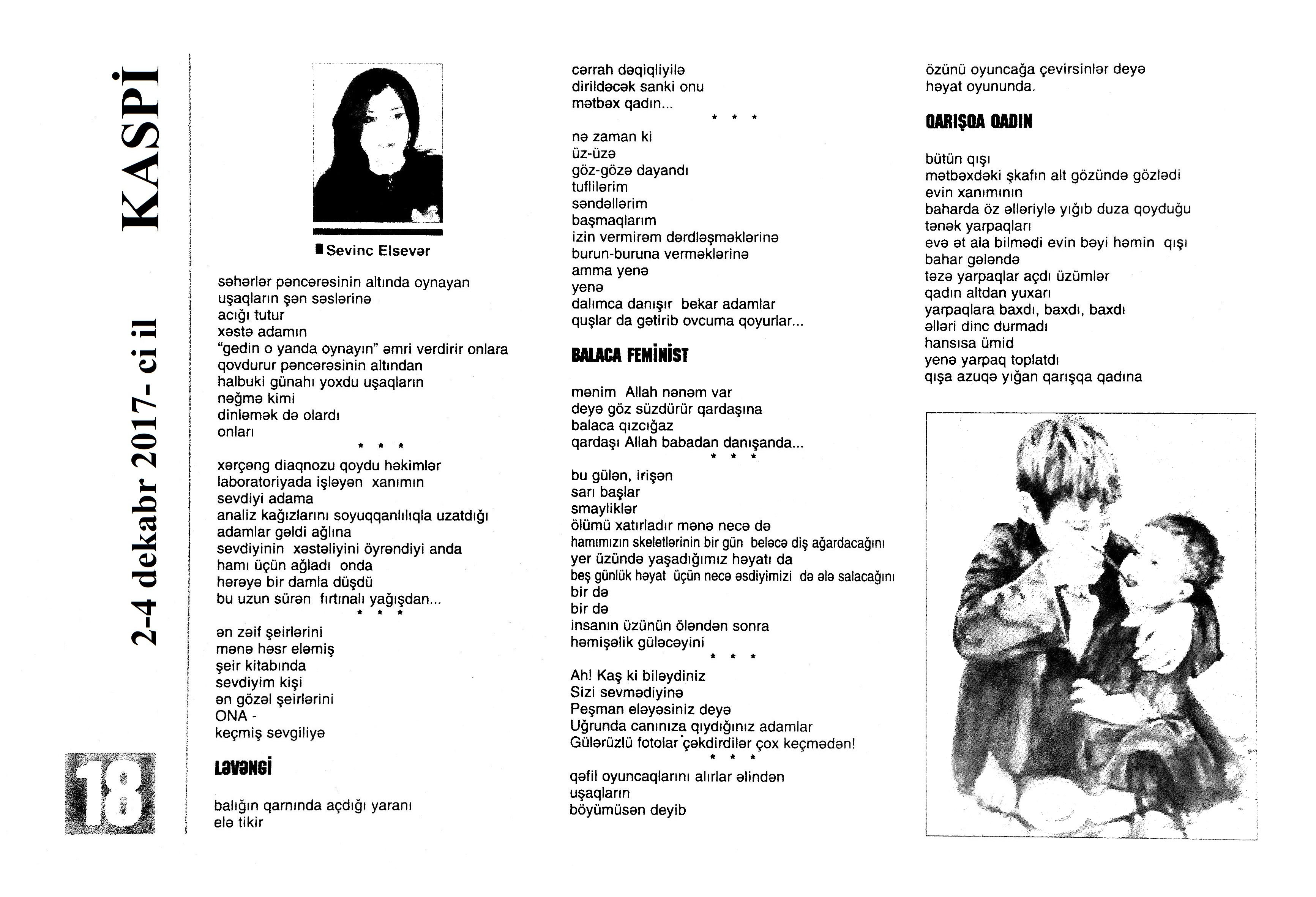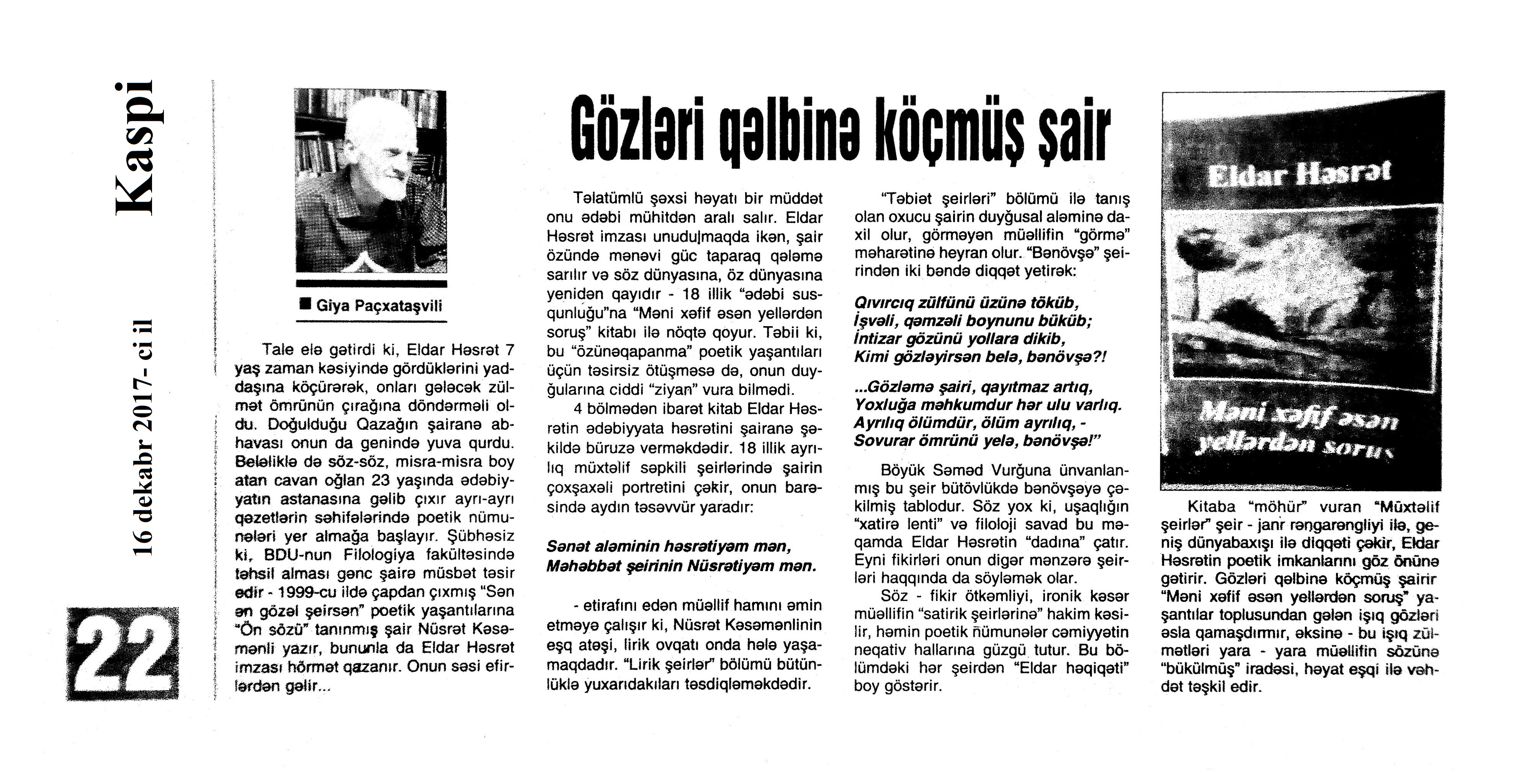 Varsa; Görmüşəm; Törəyər və s. 634. Kəbirli, T. Yetişər zəfər çağı: Humay qayasını düşünərkən; Səhv etmirikmi? //Ədalət.- 2017.- 6 dekabr.- S.8. 635. Kərimova, A. Gənc şairin ilk kitabı – Maarif Soltan: Kəndimizin kədəri; Atamın dediklərindən; Bir təpə üstündə düşündüklərim; Ötür... //Kaspi.- 2017.- 16-18 dekabr.- S.17. 636. Qafarlı, Z. Döğru; Yaşamaq; Canım; Mən niyə təkəm və s. //Ədalət.- 2017.- 9-11 dekabr.- S.23. 637. Qaraçaylı, V. Göy hasarın üstündən sallanan ağ yasəmən...; Zəlimxan köçür //Ədəbiyyat qəzeti.- 2017.- 2 dekabr.- S.25. 638. Qoca, F. Anam Azad Azərbaycan //Azərbaycan.- 2017.- 21 dekabr.- S.12.; Ədəbiyyat qəzeti.-2017.- 23 dekabr.- S.3. 639. Qoca, F. Qüds //Ədəbiyyat qəzeti.- 2017.- 30 dekabr.- S.3.; 525-ci qəzet.- 2017.- 26 dekabr.- S.7. 640. Qoca, F. Xalqın səninlədir, zəfər sənindir... //Azərbaycan. - 2017.- 24 dekabr.- S.1. 641. Lee, L. Uşaqlıq üçün himn: [amerikan ədəbiyyatı] /ingilis dilindən tərc.etdi Cavanşir Yusifli //Ədəbiyyat qəzeti.- 2017.- 9 dekabr.- S.29. 642. Mahmudzadə, L. Sona yetir məktəb illəri //Azərbaycan müəllimi.- 2017.- 8 dekabr.- S.14. 643. Mədətoğlu, Ə. Sizə ahımı göndərdim //Kaspi.- 2017.- 30 dekabr.- S.14. 644. Məmmədzadə, R. Beşik himni; Yaşamaq olmaz; “Ağdamın baməzə adamları” silsiləsindən: I “Dəli” Dilbər; II Oxuyan Elman və s. //525-ci qəzet.- 2017.- 16 dekabr.- S.22. 645. Murquzova, M. Sülh; Oxumaq //Azərbaycan müəllimi.- 2017.- 8 dekabr.- S.14. 646. Musa, M. Vətənimi sevirəm //Azərbaycan müəllimi.- 2017.- 8 dekabr.- S.14. 647. Mustafa, R. Günel; Sən yaxşı adamsan; Bir də görürsən ki...; Unutmayacam səni; Köhnə Bakı; //Ədəbiyyat qəzeti.- 2017.- 9 dekabr.- S.4. 648. Müşfiq, Ş. Ölmək gərək bəzən; Nə fərqi; Getmək düşüb könlümə; Düşüncə //Ədəbiyyat qəzeti.- 2017.- 16 dekabr.- S.11. 649. Nizam, M. İçində; Niyə dilənirsən... ; Hava bürosu və s. //Kredo.- 2017.- 15 dekabr.- S. 12. 650. Nurəli, T. Gecikmək və ya nəsillər qatarı; Video şeir; Balıq; Darıxmaq və s. //Kaspi.- 2017.- 2-4 dekabr.- S.14. 651. Nurəli, T. Səni gözləyirdim; Tale; Sual; Mənim adım və s. //Kaspi.- 2017.- 16-18 dekabr.- S.18. 652. Pas, O. Himn üçün başlanğıc: Gözlərin (1943-1948); Unutmaq; Yaşıl mürəkkəblə yaz; Bağ; Küçəylə gedirəm...: [fransız ədəbiyyatı] /tərc. etdi Cavanşir Yusifli //Ədəbiyyat qəzeti.- 2017.- 2 dekabr.- S.5.