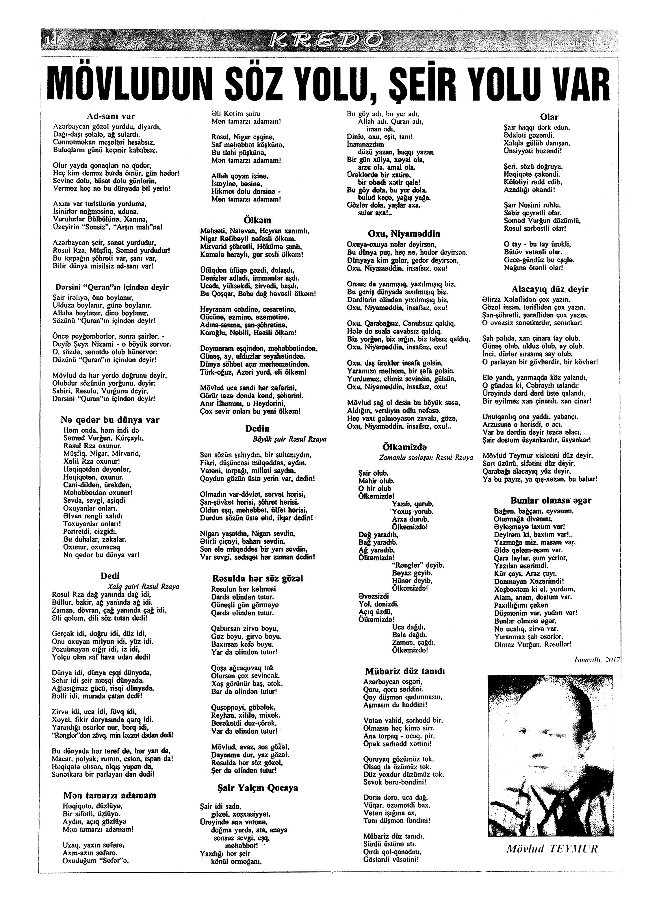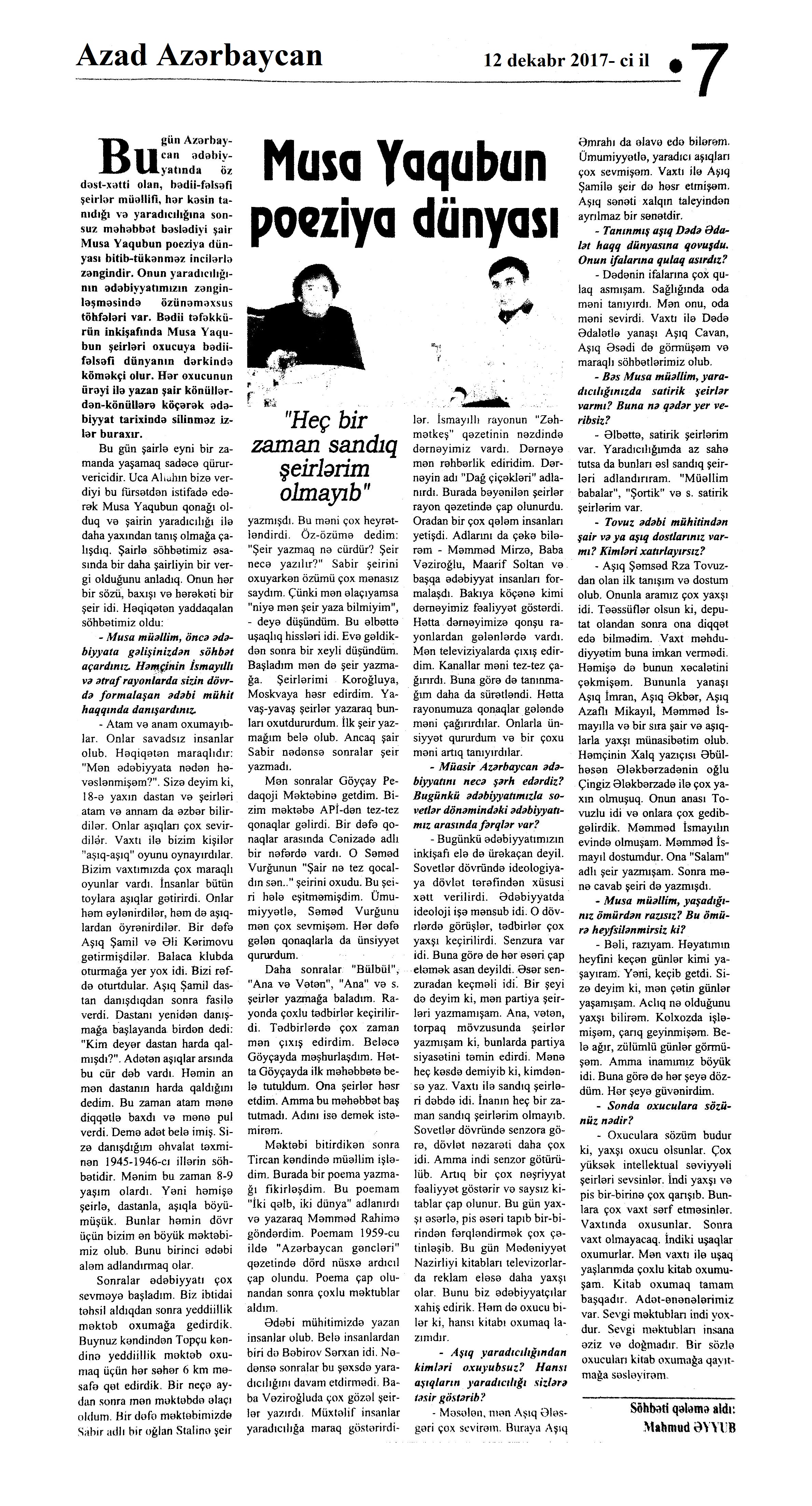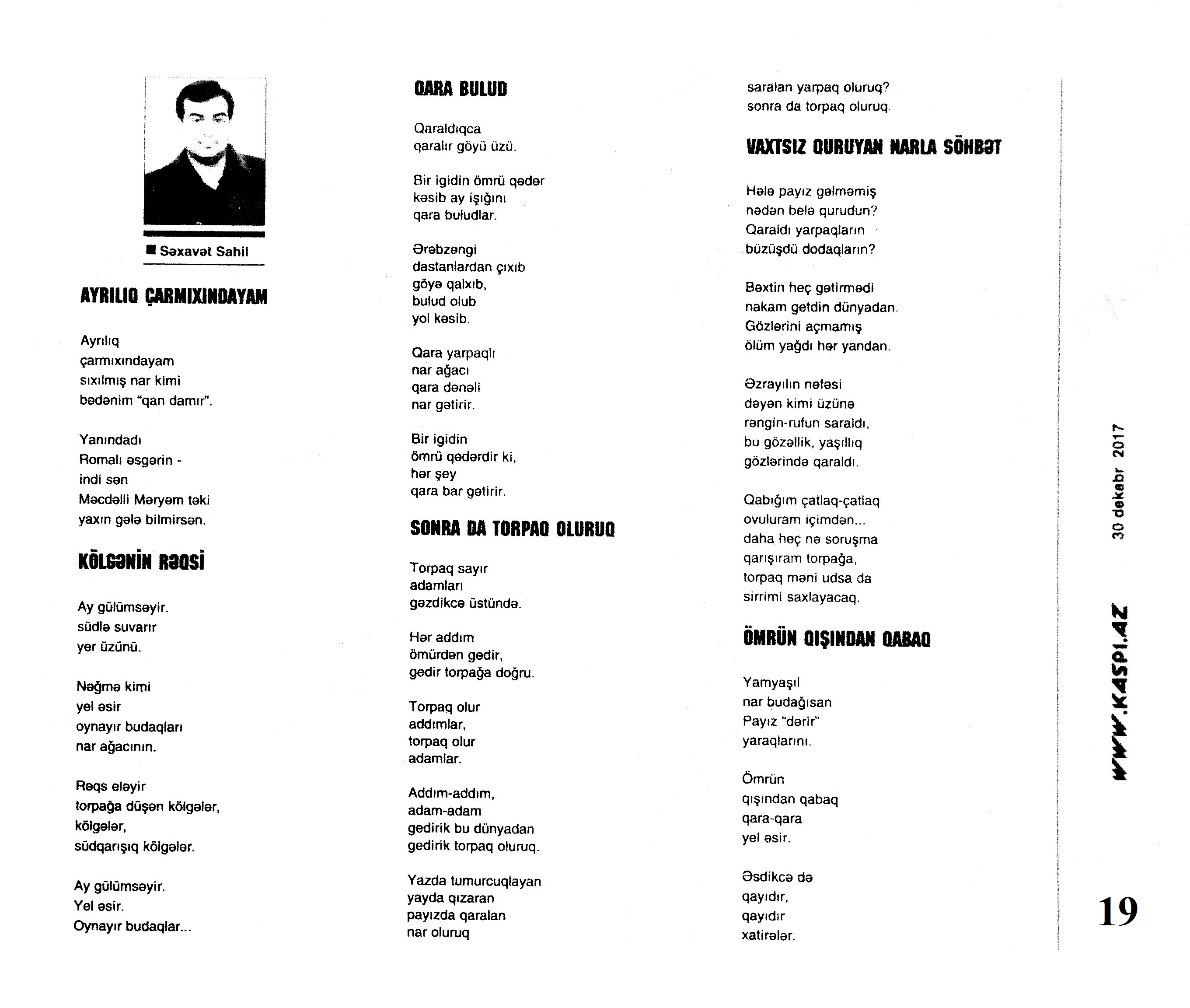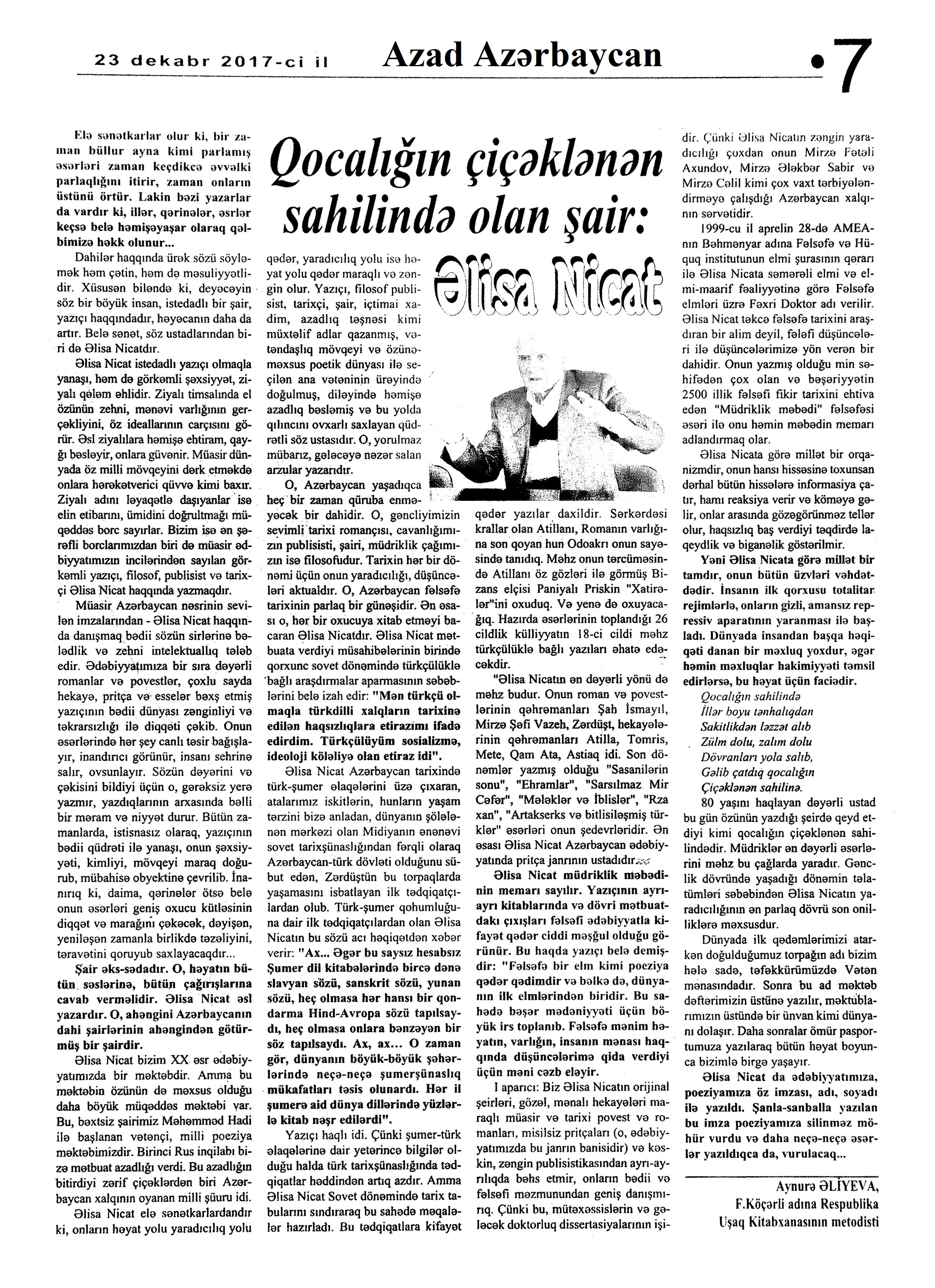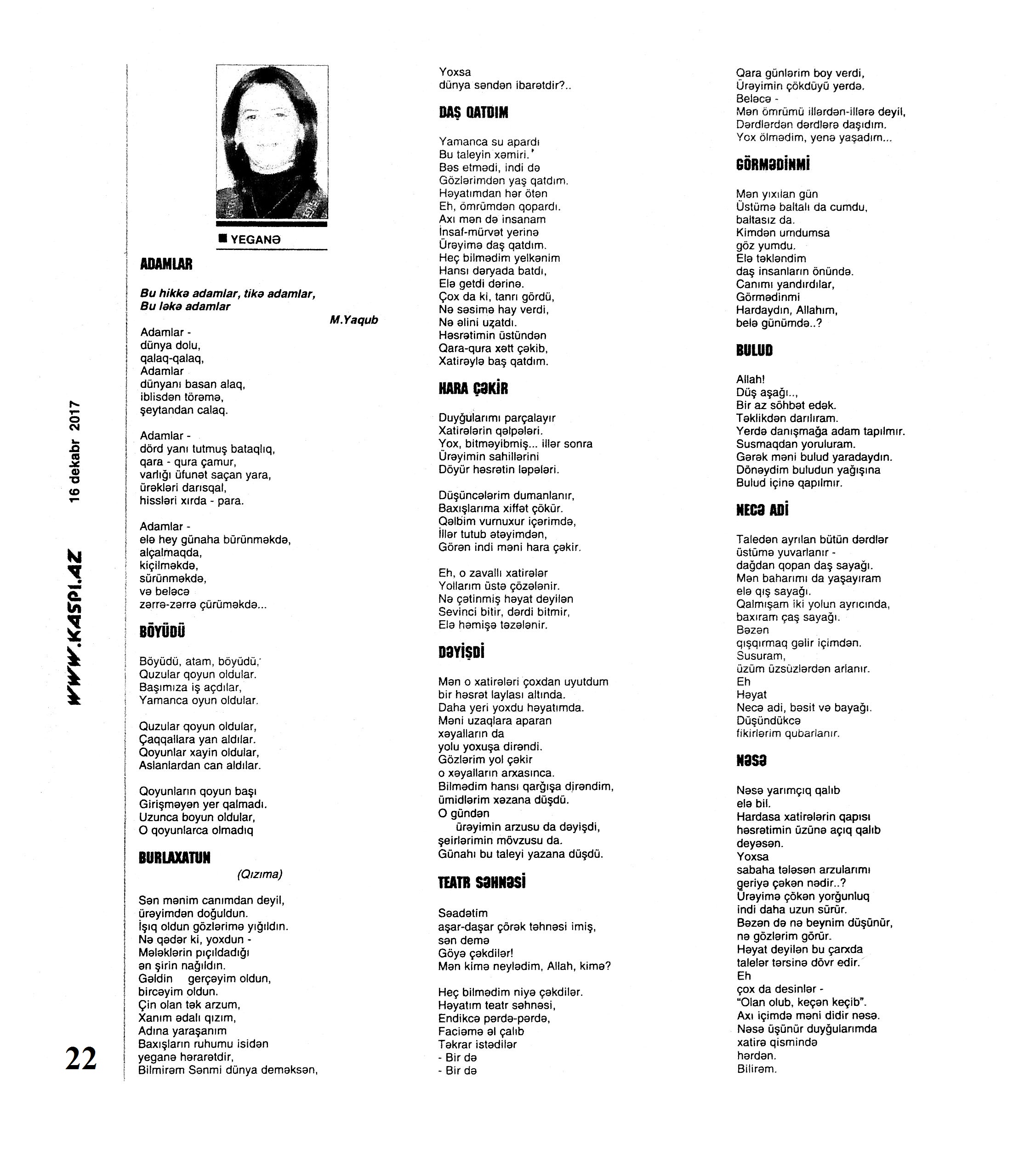 Varsa; Görmüşəm; Törəyər və s. 634. Kəbirli, T. Yetişər zəfər çağı: Humay qayasını düşünərkən; Səhv etmirikmi? //Ədalət.- 2017.- 6 dekabr.- S.8. 635. Kərimova, A. Gənc şairin ilk kitabı – Maarif Soltan: Kəndimizin kədəri; Atamın dediklərindən; Bir təpə üstündə düşündüklərim; Ötür... //Kaspi.- 2017.- 16-18 dekabr.- S.17. 636. Qafarlı, Z. Döğru; Yaşamaq; Canım; Mən niyə təkəm və s. //Ədalət.- 2017.- 9-11 dekabr.- S.23. 637. Qaraçaylı, V. Göy hasarın üstündən sallanan ağ yasəmən...; Zəlimxan köçür //Ədəbiyyat qəzeti.- 2017.- 2 dekabr.- S.25. 638. Qoca, F. Anam Azad Azərbaycan //Azərbaycan.- 2017.- 21 dekabr.- S.12.; Ədəbiyyat qəzeti.-2017.- 23 dekabr.- S.3. 639. Qoca, F. Qüds //Ədəbiyyat qəzeti.- 2017.- 30 dekabr.- S.3.; 525-ci qəzet.- 2017.- 26 dekabr.- S.7. 640. Qoca, F. Xalqın səninlədir, zəfər sənindir... //Azərbaycan. - 2017.- 24 dekabr.- S.1. 641. Lee, L. Uşaqlıq üçün himn: [amerikan ədəbiyyatı] /ingilis dilindən tərc.etdi Cavanşir Yusifli //Ədəbiyyat qəzeti.- 2017.- 9 dekabr.- S.29. 642. Mahmudzadə, L. Sona yetir məktəb illəri //Azərbaycan müəllimi.- 2017.- 8 dekabr.- S.14. 643. Mədətoğlu, Ə. Sizə ahımı göndərdim //Kaspi.- 2017.- 30 dekabr.- S.14. 644. Məmmədzadə, R. Beşik himni; Yaşamaq olmaz; “Ağdamın baməzə adamları” silsiləsindən: I “Dəli” Dilbər; II Oxuyan Elman və s. //525-ci qəzet.- 2017.- 16 dekabr.- S.22. 645. Murquzova, M. Sülh; Oxumaq //Azərbaycan müəllimi.- 2017.- 8 dekabr.- S.14. 646. Musa, M. Vətənimi sevirəm //Azərbaycan müəllimi.- 2017.- 8 dekabr.- S.14. 647. Mustafa, R. Günel; Sən yaxşı adamsan; Bir də görürsən ki...; Unutmayacam səni; Köhnə Bakı; //Ədəbiyyat qəzeti.- 2017.- 9 dekabr.- S.4. 648. Müşfiq, Ş. Ölmək gərək bəzən; Nə fərqi; Getmək düşüb könlümə; Düşüncə //Ədəbiyyat qəzeti.- 2017.- 16 dekabr.- S.11. 649. Nizam, M. İçində; Niyə dilənirsən... ; Hava bürosu və s. //Kredo.- 2017.- 15 dekabr.- S. 12. 650. Nurəli, T. Gecikmək və ya nəsillər qatarı; Video şeir; Balıq; Darıxmaq və s. //Kaspi.- 2017.- 2-4 dekabr.- S.14. 651. Nurəli, T. Səni gözləyirdim; Tale; Sual; Mənim adım və s. //Kaspi.- 2017.- 16-18 dekabr.- S.18. 652. Pas, O. Himn üçün başlanğıc: Gözlərin (1943-1948); Unutmaq; Yaşıl mürəkkəblə yaz; Bağ; Küçəylə gedirəm...: [fransız ədəbiyyatı] /tərc. etdi Cavanşir Yusifli //Ədəbiyyat qəzeti.- 2017.- 2 dekabr.- S.5.