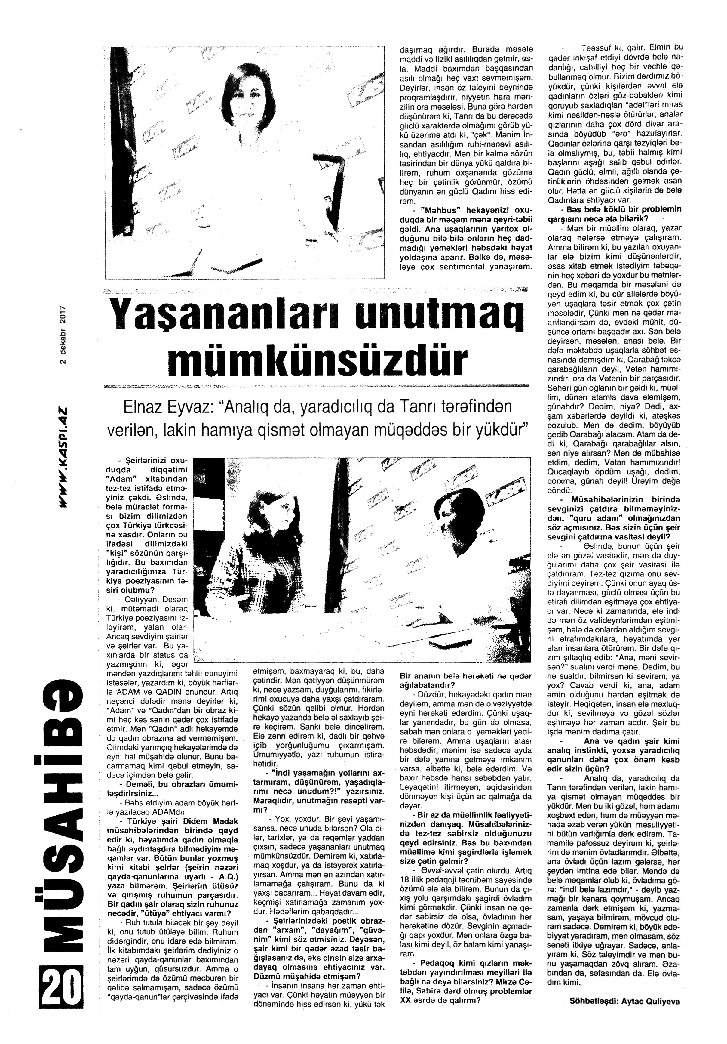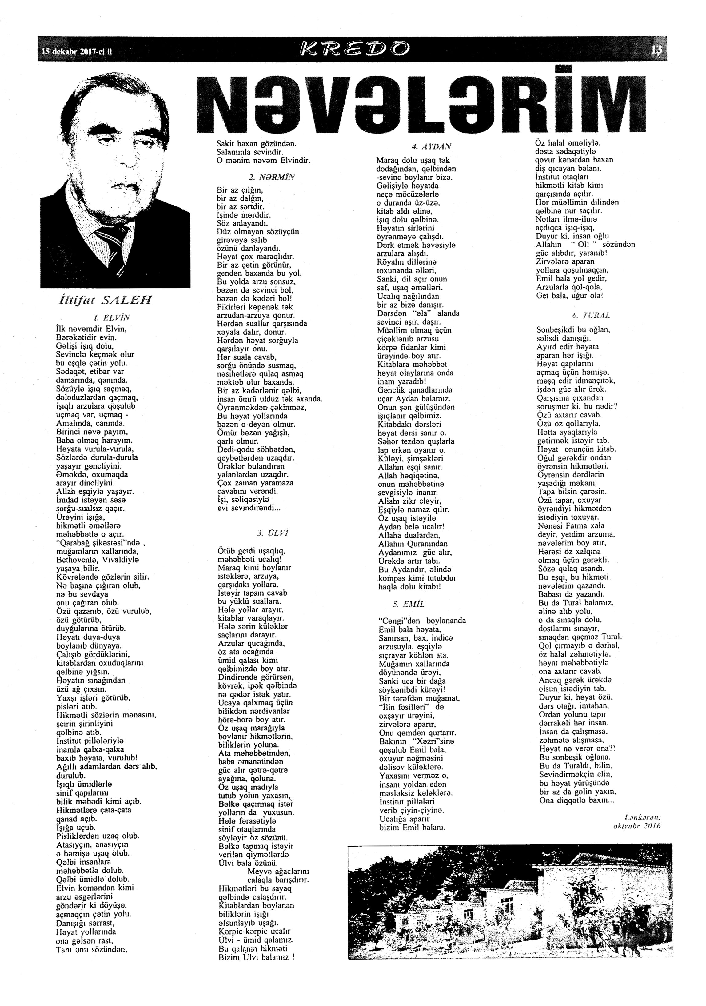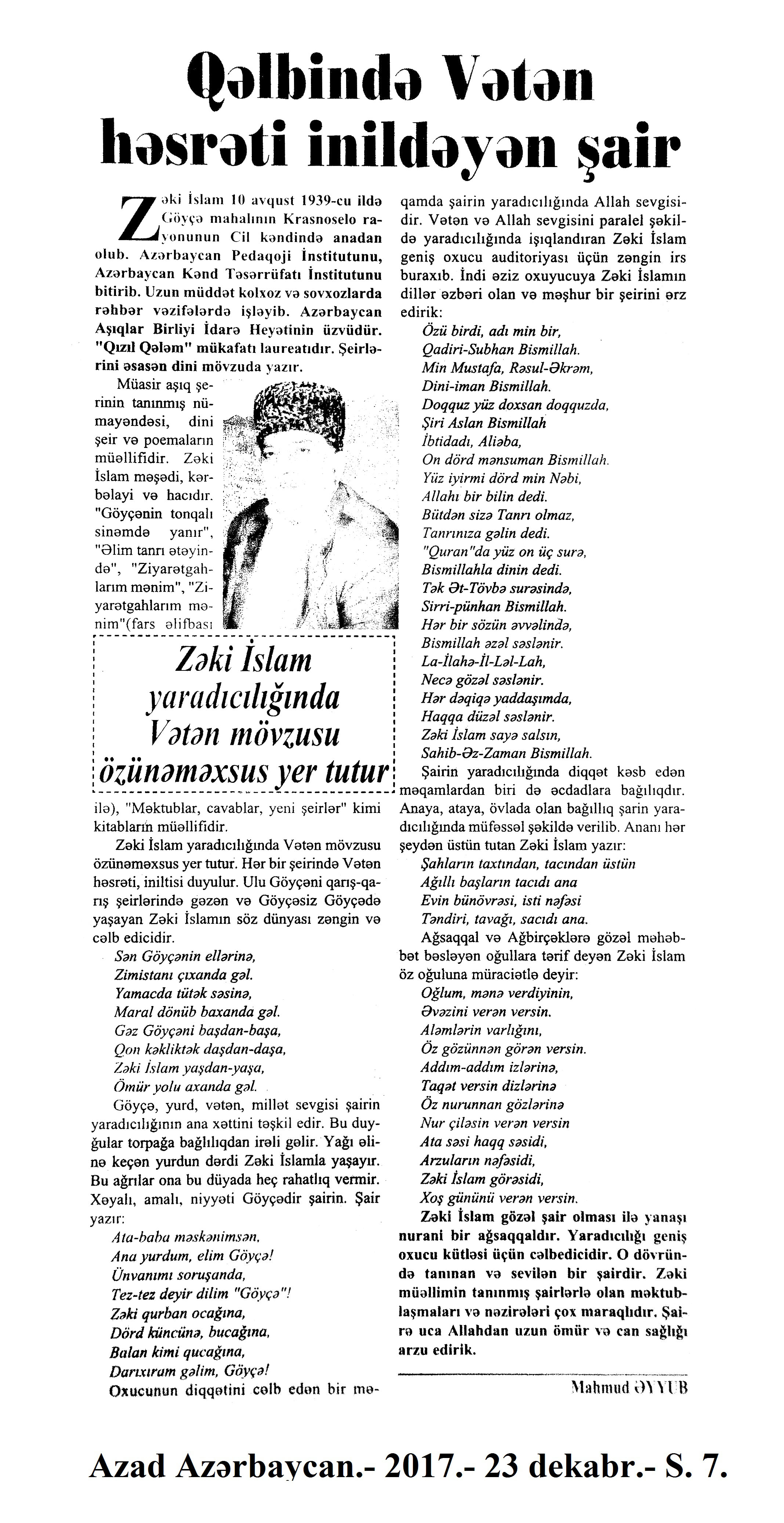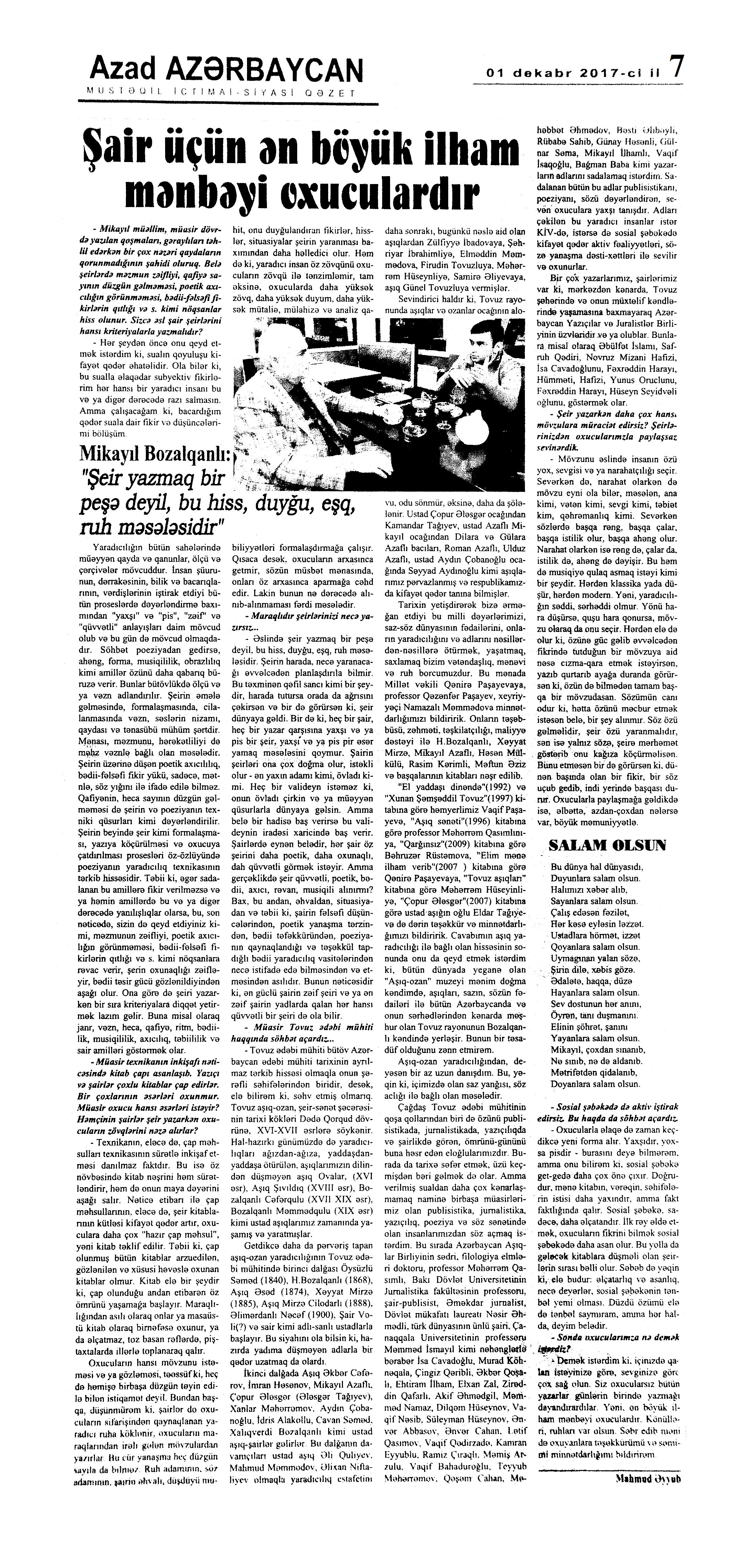 Varsa; Görmüşəm; Törəyər və s. 634. Kəbirli, T. Yetişər zəfər çağı: Humay qayasını düşünərkən; Səhv etmirikmi? //Ədalət.- 2017.- 6 dekabr.- S.8. 635. Kərimova, A. Gənc şairin ilk kitabı – Maarif Soltan: Kəndimizin kədəri; Atamın dediklərindən; Bir təpə üstündə düşündüklərim; Ötür... //Kaspi.- 2017.- 16-18 dekabr.- S.17. 636. Qafarlı, Z. Döğru; Yaşamaq; Canım; Mən niyə təkəm və s. //Ədalət.- 2017.- 9-11 dekabr.- S.23. 637. Qaraçaylı, V. Göy hasarın üstündən sallanan ağ yasəmən...; Zəlimxan köçür //Ədəbiyyat qəzeti.- 2017.- 2 dekabr.- S.25. 638. Qoca, F. Anam Azad Azərbaycan //Azərbaycan.- 2017.- 21 dekabr.- S.12.; Ədəbiyyat qəzeti.-2017.- 23 dekabr.- S.3. 639. Qoca, F. Qüds //Ədəbiyyat qəzeti.- 2017.- 30 dekabr.- S.3.; 525-ci qəzet.- 2017.- 26 dekabr.- S.7. 640. Qoca, F. Xalqın səninlədir, zəfər sənindir... //Azərbaycan. - 2017.- 24 dekabr.- S.1. 641. Lee, L. Uşaqlıq üçün himn: [amerikan ədəbiyyatı] /ingilis dilindən tərc.etdi Cavanşir Yusifli //Ədəbiyyat qəzeti.- 2017.- 9 dekabr.- S.29. 642. Mahmudzadə, L. Sona yetir məktəb illəri //Azərbaycan müəllimi.- 2017.- 8 dekabr.- S.14. 643. Mədətoğlu, Ə. Sizə ahımı göndərdim //Kaspi.- 2017.- 30 dekabr.- S.14. 644. Məmmədzadə, R. Beşik himni; Yaşamaq olmaz; “Ağdamın baməzə adamları” silsiləsindən: I “Dəli” Dilbər; II Oxuyan Elman və s. //525-ci qəzet.- 2017.- 16 dekabr.- S.22. 645. Murquzova, M. Sülh; Oxumaq //Azərbaycan müəllimi.- 2017.- 8 dekabr.- S.14. 646. Musa, M. Vətənimi sevirəm //Azərbaycan müəllimi.- 2017.- 8 dekabr.- S.14. 647. Mustafa, R. Günel; Sən yaxşı adamsan; Bir də görürsən ki...; Unutmayacam səni; Köhnə Bakı; //Ədəbiyyat qəzeti.- 2017.- 9 dekabr.- S.4. 648. Müşfiq, Ş. Ölmək gərək bəzən; Nə fərqi; Getmək düşüb könlümə; Düşüncə //Ədəbiyyat qəzeti.- 2017.- 16 dekabr.- S.11. 649. Nizam, M. İçində; Niyə dilənirsən... ; Hava bürosu və s. //Kredo.- 2017.- 15 dekabr.- S. 12. 650. Nurəli, T. Gecikmək və ya nəsillər qatarı; Video şeir; Balıq; Darıxmaq və s. //Kaspi.- 2017.- 2-4 dekabr.- S.14. 651. Nurəli, T. Səni gözləyirdim; Tale; Sual; Mənim adım və s. //Kaspi.- 2017.- 16-18 dekabr.- S.18. 652. Pas, O. Himn üçün başlanğıc: Gözlərin (1943-1948); Unutmaq; Yaşıl mürəkkəblə yaz; Bağ; Küçəylə gedirəm...: [fransız ədəbiyyatı] /tərc. etdi Cavanşir Yusifli //Ədəbiyyat qəzeti.- 2017.- 2 dekabr.- S.5.