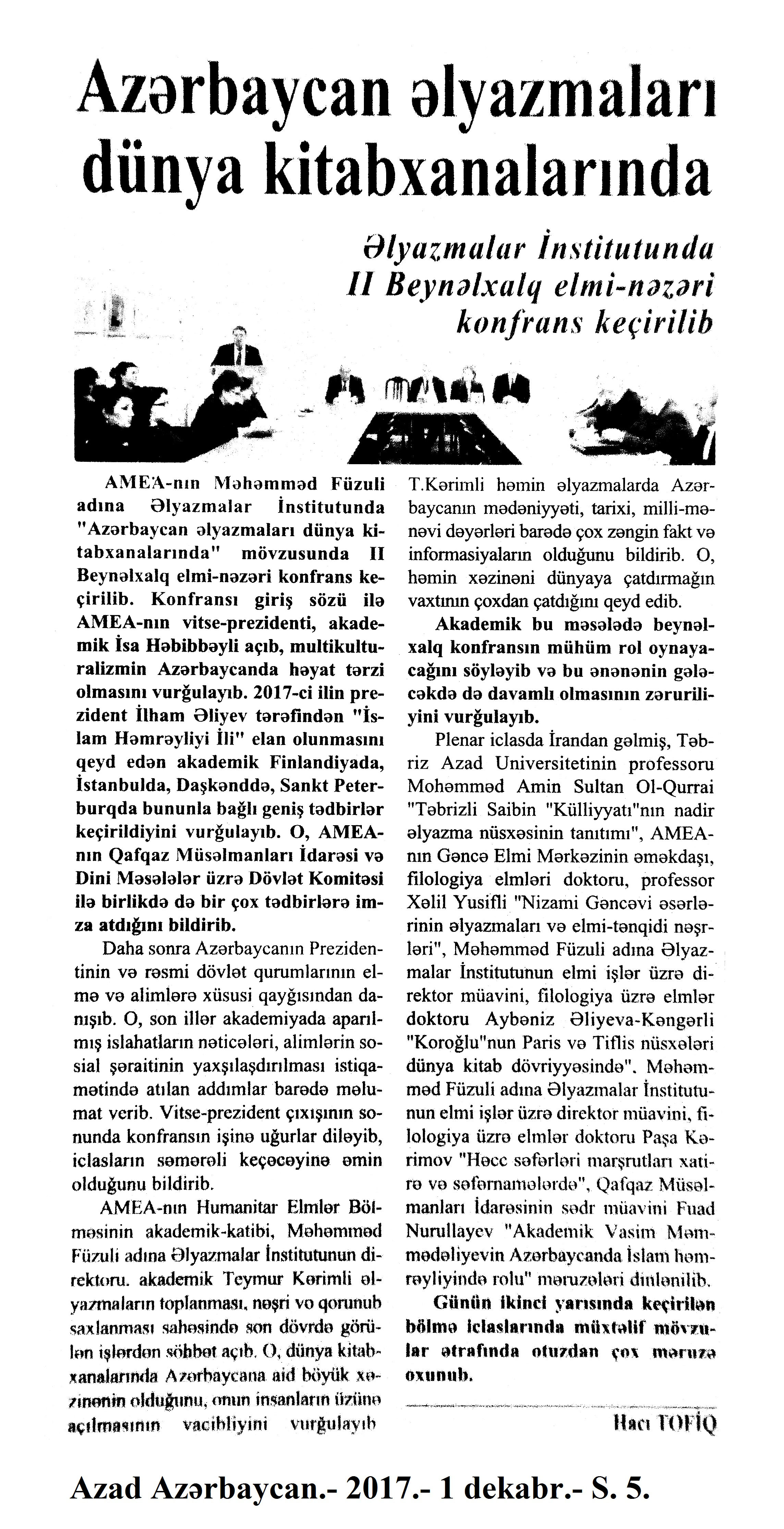 Bax: 106; 160; 183; 210; 212; 258; 261; 288; 289; 298; 304; 307; 322; 323; 332; 335; 338; 342; 350; 364; 369; 386; 388; 408; 410; 422; 425; 428; 448; 458; 462; 469; 470; 473; 477; 480; 493; 494; 499; 500; 505; 531; 538; 541; 564; 588; 592; 594; 595; 598 “2017 – İslam Həmrəyliyi İli: Dinlər və mədəniyyətlərarası dialoq” 184. Azərbaycan dövləti və xalqı Səudiyyə Ərəbistanının Ermənistanla əlaqə qurmamasını yüksək qiymətləndirir: [Prezident İlham Əliyev Səudiyyə Ərəbistanı Krallığının İslam işləri, Dəvət və İrşad nazirinin birinci müavini Tofiq Əl-Sudeyrini qəbul edib] //Azərbaycan.- 2017.-22 dekabr.- S.5. 185. Beynəlxalq konfrans işini plenar iclasla davam etdirib: Konfransda dövlət başçılarına, beynəlxalq təşkilatlara və dini liderlərə müraciət qəbul olunub: [“2017 – İslam Həmrəyliyi İli: Dinlər və mədəniyyətlərarası dialoq” mövzusunda keçirilən beynəlxalq konfrans haqqında] //Azərbaycan.- 2017.- 22 dekabr.- S.8. 186. Dinlər və mədəniyyətlərarası dialoq: “2017 – İslam həmrəyliyi ili: dinlər və mədəniyyətlərarası dialoq” mövzusunda beynəlxalq konfrans keçirilib: [Heydər Əliyev Mərkəzində] //Mədəniyyət.- 2017.- 22 dekabr.- S.2. 187. Əliyev, İ. Azərbaycan sivilizasiyalararası, dinlərarası əməkdaşlığın uğurla gerçəkləşdiyi məkandır: Prezident İlham Əliyev ölkədə dinlərarası münasibətlərin yüksək səviyyədə tənzimlənməsini, müsəlmanlar arasında mövcud olan birliyi və qarşılıqlı anlaşmanı Azərbaycanı gücləndirən əsas amillərdən biri kimi səciyyələndirdi: Prezident İlham Əliyevin nitqi: [Heydər Əliyev Mərkəzində “2017 - İslam Həmrəyliyi İli: Dinlər və mədəniyyətlərarası dialoq” mövzusunda keçirilən beynəlxalq konfransdakı çıxışlar] //Azərbaycan.- 2017.- 22 dekabr.- S. 1-4. 188. ISESCO-nun baş direktoru: “Azərbaycanda əldə olunan möhtəşəm uğurlar islam dünyasında və ondan kənarda böyük maraqla qarşılanır”: [Prezident İlham Əliyev ISESCO-nun baş direktoru Əbdüləziz Osman əl-Tuveycrini qəbul edib] //Azərbaycan.- 2017.-22 dekabr.- S.5. 189. Özbəkistan Prezidentinin dövlət müşaviri: “Xalqın tolerantlığı və sülhün qorunub saxlanmasına ölkələrimizin bir çox eyni yanaşması var”: [Prezident İlham Əliyev Özbəkistan Respublikası Prezidentinin dövlət müşaviri Rüstəm Kamilovu qəbul edib] //Azərbaycan.- 2017.-22 dekabr.- S.5. 190. Şövqi İbrahim Allam: “2017 – İslam Həmrəyliyi İli: Dinlər və mədəniyyətlərarası dialoq” mövzusunda beynəlxalq konfrans islam həmrəyliyinin gücləndirilməsinə böyük töhfədir”: [Prezident İlham Əliyev Misir diyarının müftisi Şövqi İbrahim Allam ilə görüşüb] //Azərbaycan.- 2017.-22 dekabr.- S.5.