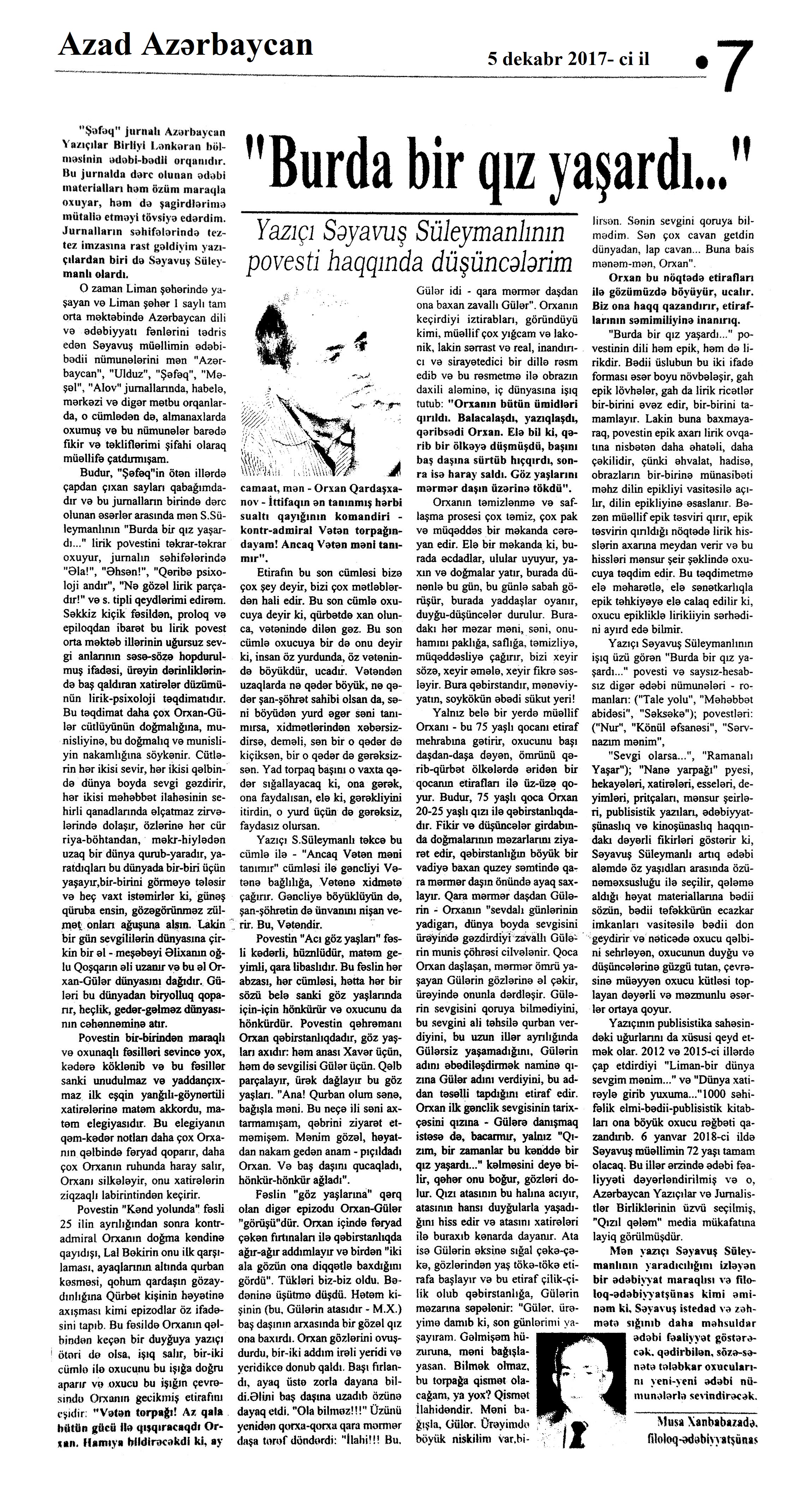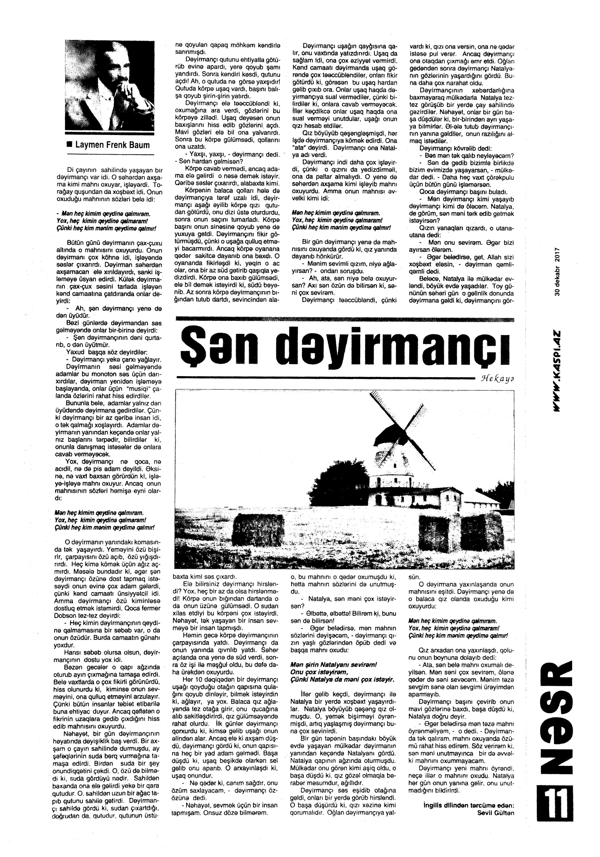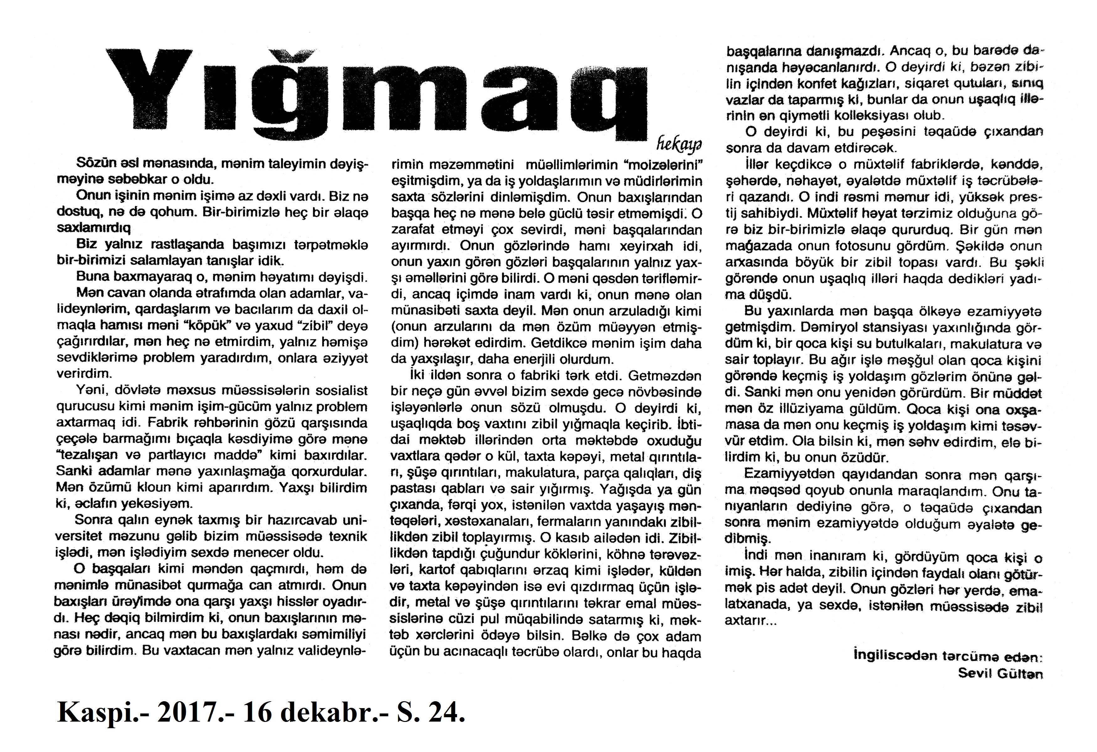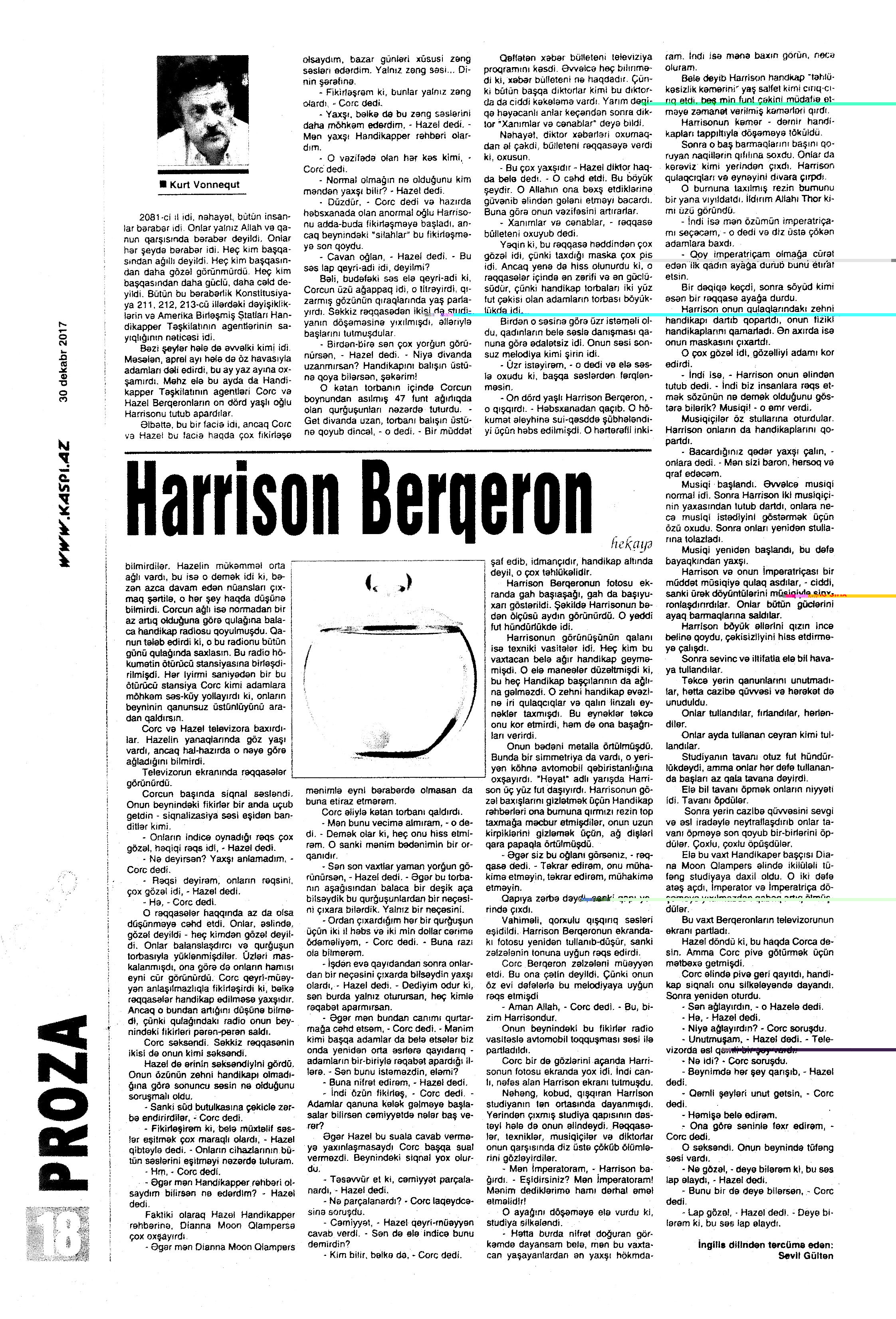 Falçı: 21 Azər hərəkatı xatirəsinə... 717. Nəccari, Ü. Sarı cənnət //Ədəbiyyat qəzeti.- 2017.- 30 dekabr.- S.3. 718. Nəzirli, K. “Ən qısa hekayələr” silsiləsindən //525-ci qəzet.- 2017.- 30 dekabr.- S.15. 719. Nəzirli, K. Şopenin sonatası //Ədəbiyyat qəzeti.- 2017.- 30 dekabr.- S.6-7. 720. Sultanlı, V. Çarpaz kölgə //Ədəbiyyat qəzeti.- 2017.- 9 dekabr.- S.5. 721. Vəlioğlu, Ə. Mirzəhüseyn segahı //Ədəbiyyat qəzeti.- 2017.- 30 dekabr.- S.28. 722. Vonnegut, K. Harrison Berqeron: [ingilis dilindən tərcümə] /tərc.etdi Sevil Gültən //Kaspi.- 2017.- 30 dekabr.- S.18. 723. Zeynalov, E. “Boğa” //525-ci qəzet.- 2017.- 6 dekabr.- S.7.