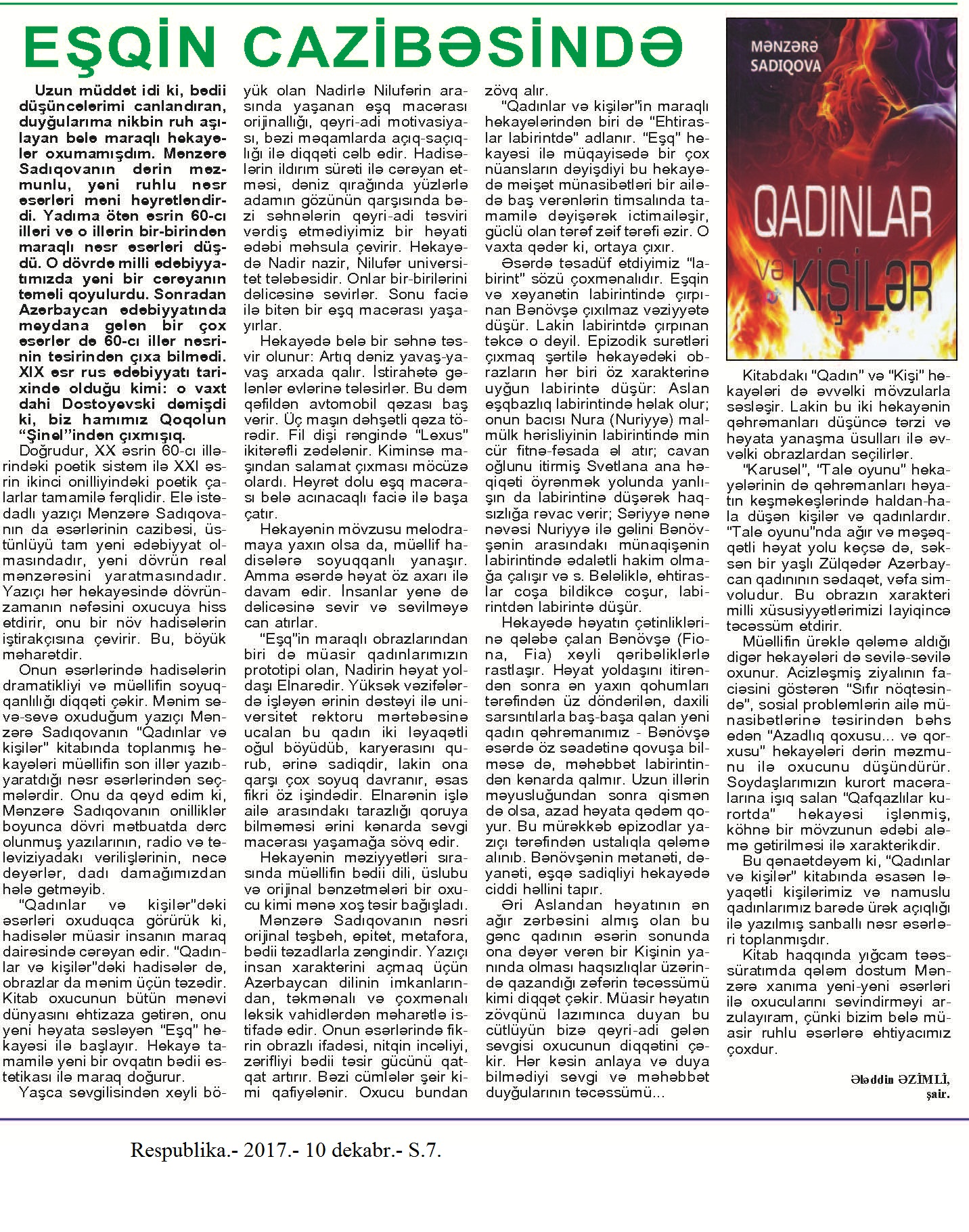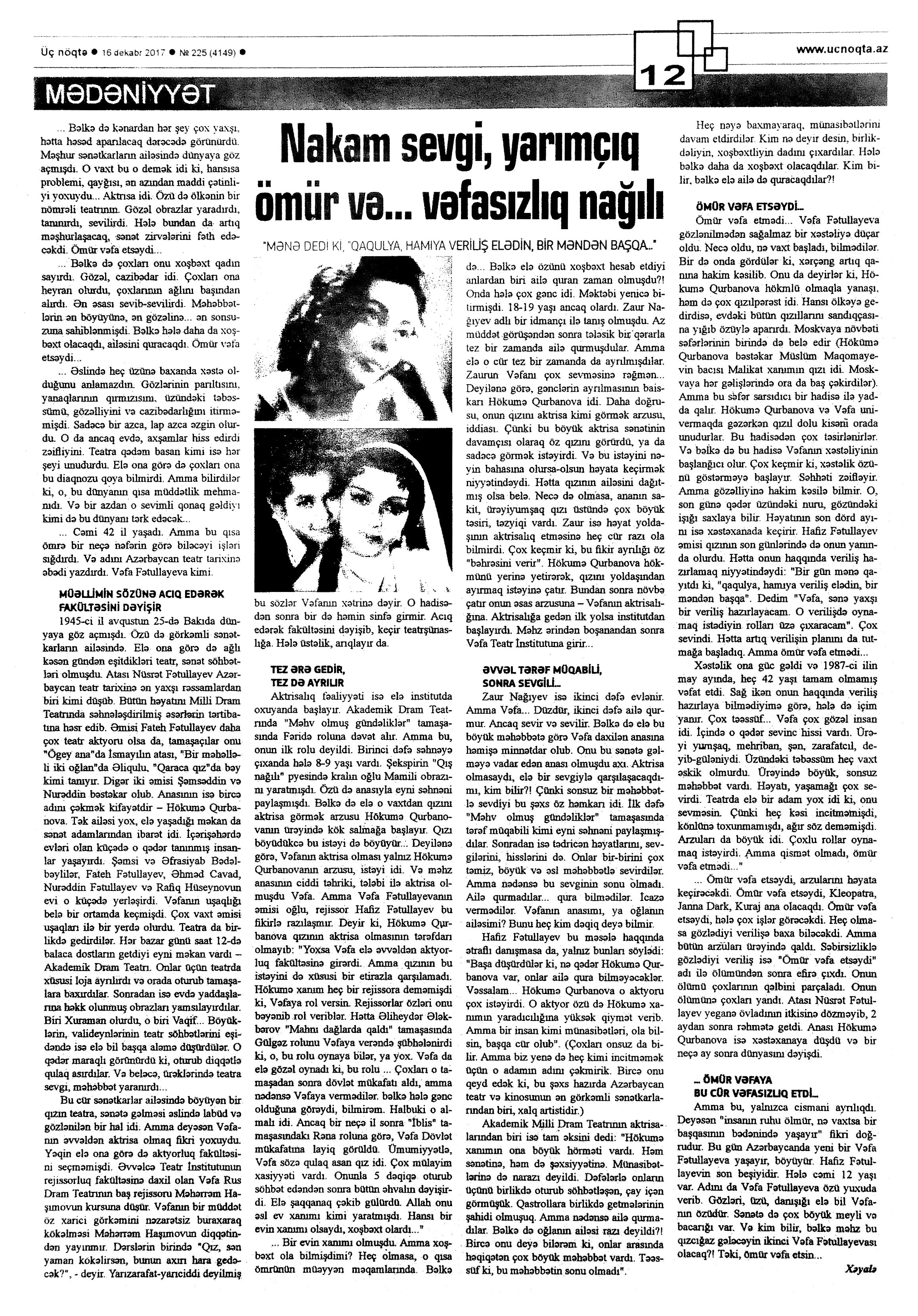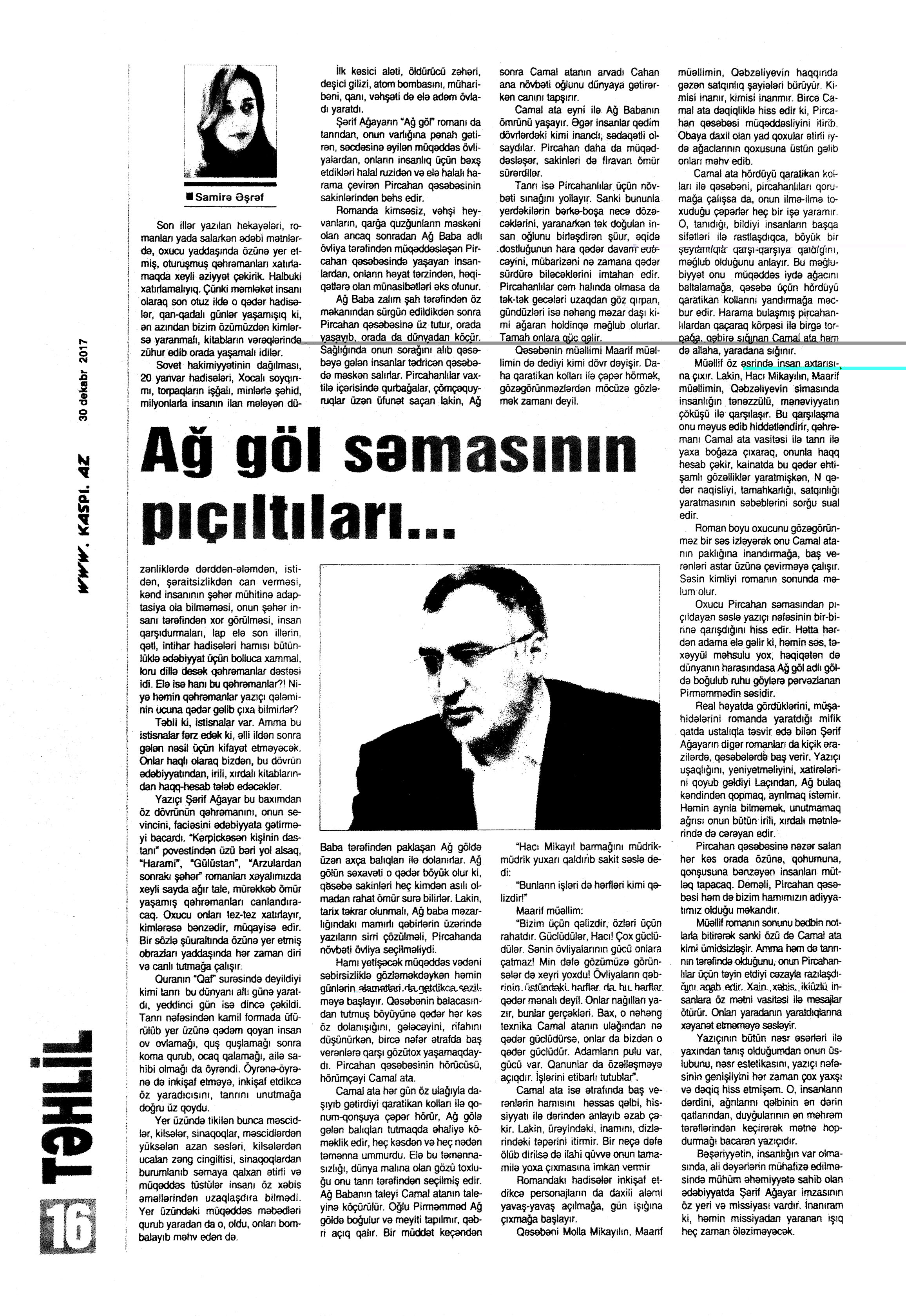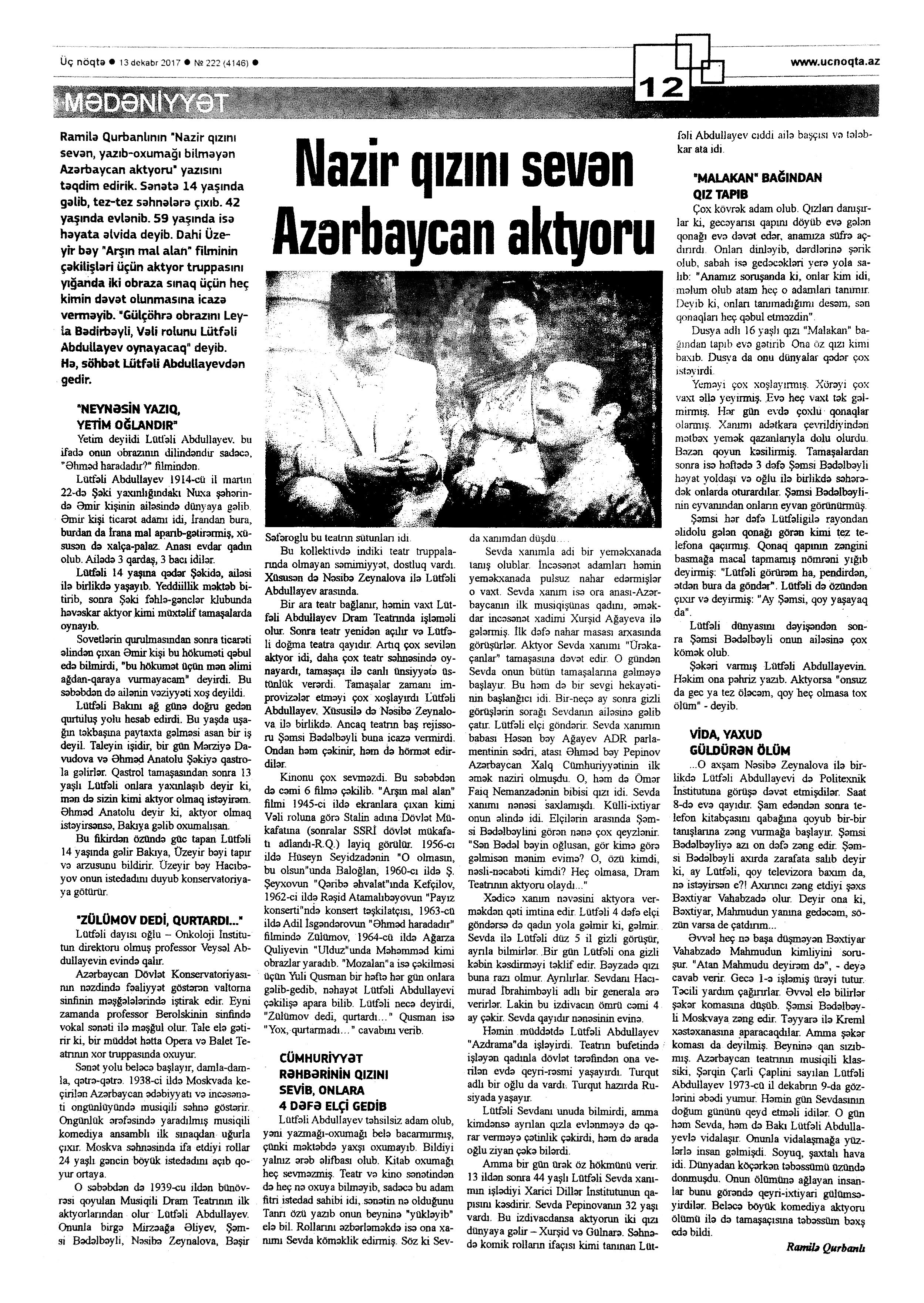 Falçı: 21 Azər hərəkatı xatirəsinə... 717. Nəccari, Ü. Sarı cənnət //Ədəbiyyat qəzeti.- 2017.- 30 dekabr.- S.3. 718. Nəzirli, K. “Ən qısa hekayələr” silsiləsindən //525-ci qəzet.- 2017.- 30 dekabr.- S.15. 719. Nəzirli, K. Şopenin sonatası //Ədəbiyyat qəzeti.- 2017.- 30 dekabr.- S.6-7. 720. Sultanlı, V. Çarpaz kölgə //Ədəbiyyat qəzeti.- 2017.- 9 dekabr.- S.5. 721. Vəlioğlu, Ə. Mirzəhüseyn segahı //Ədəbiyyat qəzeti.- 2017.- 30 dekabr.- S.28. 722. Vonnegut, K. Harrison Berqeron: [ingilis dilindən tərcümə] /tərc.etdi Sevil Gültən //Kaspi.- 2017.- 30 dekabr.- S.18. 723. Zeynalov, E. “Boğa” //525-ci qəzet.- 2017.- 6 dekabr.- S.7.