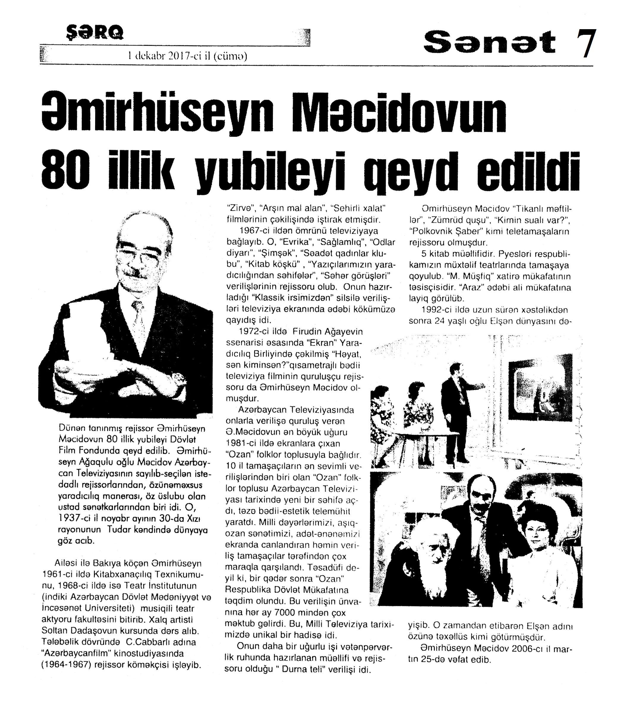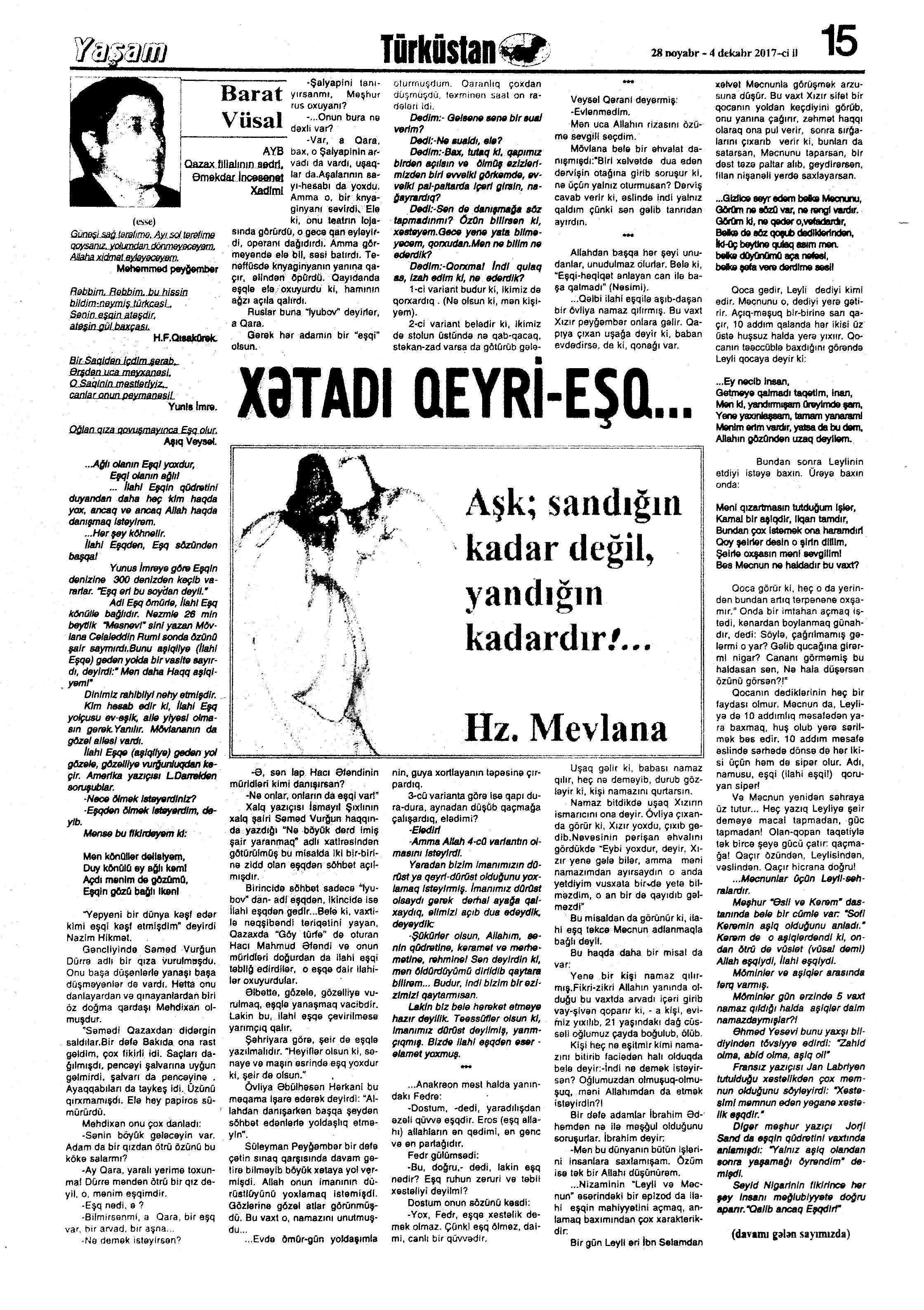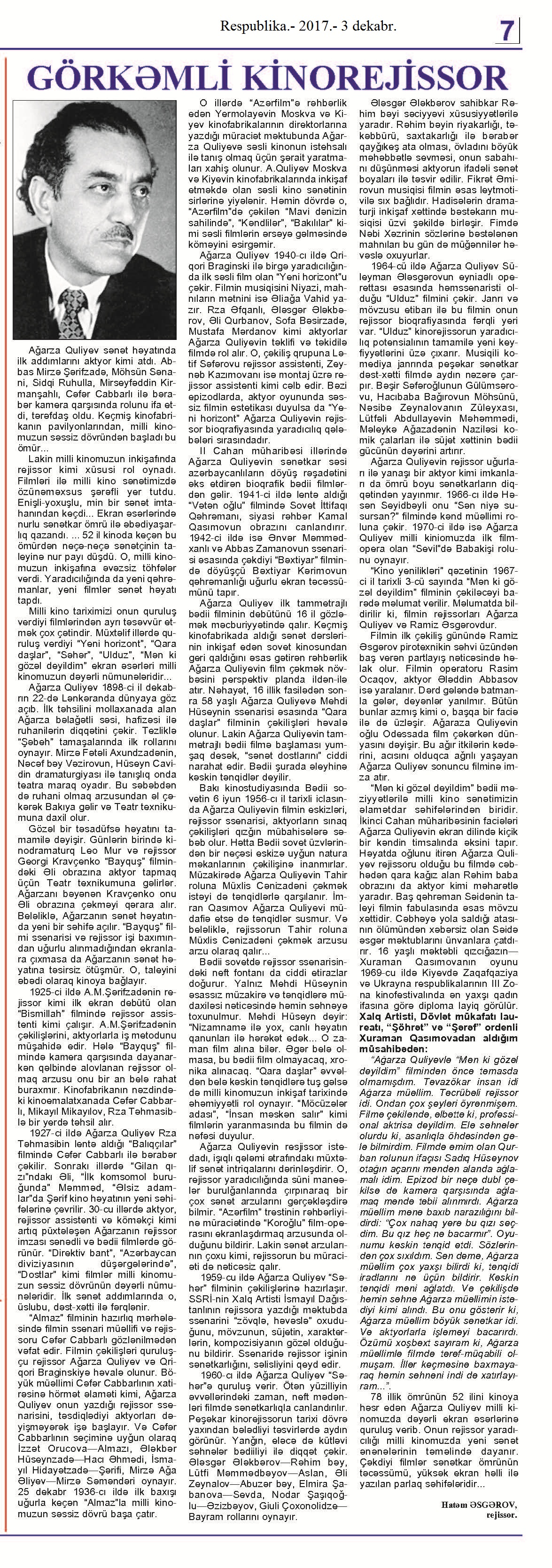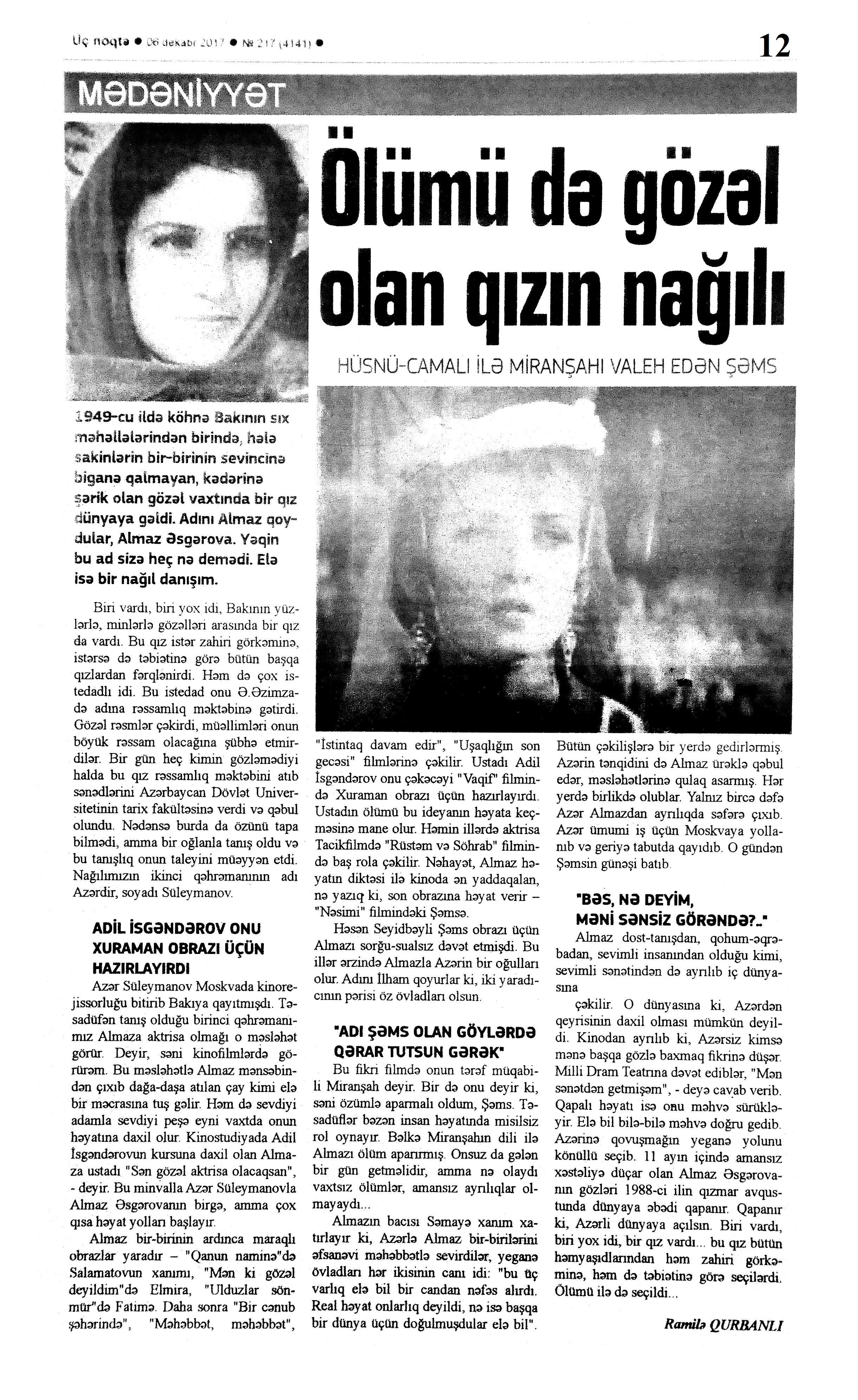 Falçı: 21 Azər hərəkatı xatirəsinə... 717. Nəccari, Ü. Sarı cənnət //Ədəbiyyat qəzeti.- 2017.- 30 dekabr.- S.3. 718. Nəzirli, K. “Ən qısa hekayələr” silsiləsindən //525-ci qəzet.- 2017.- 30 dekabr.- S.15. 719. Nəzirli, K. Şopenin sonatası //Ədəbiyyat qəzeti.- 2017.- 30 dekabr.- S.6-7. 720. Sultanlı, V. Çarpaz kölgə //Ədəbiyyat qəzeti.- 2017.- 9 dekabr.- S.5. 721. Vəlioğlu, Ə. Mirzəhüseyn segahı //Ədəbiyyat qəzeti.- 2017.- 30 dekabr.- S.28. 722. Vonnegut, K. Harrison Berqeron: [ingilis dilindən tərcümə] /tərc.etdi Sevil Gültən //Kaspi.- 2017.- 30 dekabr.- S.18. 723. Zeynalov, E. “Boğa” //525-ci qəzet.- 2017.- 6 dekabr.- S.7.