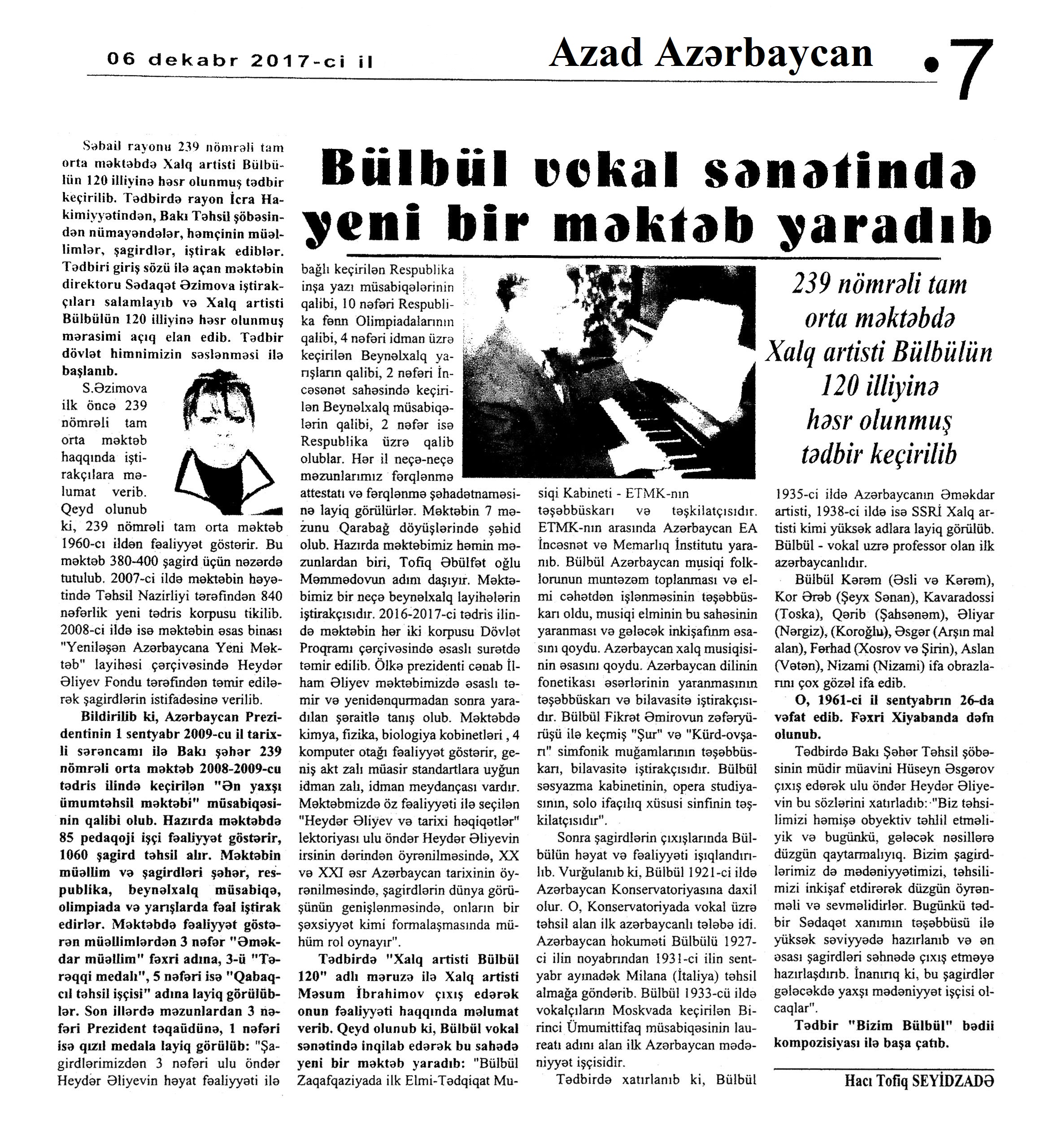 Bülbül – 120 397. Abdullayeva, A. Bülbül yaradıcılığına dair ilk biblioqrafik mənbə //525-ci qəzet.- 2017.- 30 dekabr.- S.9. 398. Bəşirov, V. Azərbaycanın Bülbülü: Müsəlman aləmindən İtaliyada təhsil alan ilk vokalçı //Azərbaycan müəllimi.- 2017.- 15 dekabr.- S.13. 399. Bülbülün anadan olmasının 120 illik yubileyinə həsr olunmuş musiqi festivalının qalibləri mükafatlandırılıblar: [Beynəlxalq Muğam Mərkəzində] //Azərbaycan.- 2017.-24 dekabr.- S.12. 400. Bülbülün 120 illiyinə həsr edilən musiqi festivalı: [Azərbaycan Milli Konservatoriyasında] //Mədəniyyət.-2017.- 20 dekabr.- S.2. 401. Fərəcov, S. Azərbaycan professional vokal sənətinin banisi: “Bülbül. Biblioqrafiya” kitabı və “Bülbül” elektron məlumat bazasının təqdimatı keçirildi: [Milli Kitabxanada SSRİ Xalq artisti Bülbülün anadan olmasının 120 illiyi ilə bağlı] //Mədəniyyət.- 2017.- 27 dekabr.- S.7. 402. “Koroğlu”nun növbəti tamaşası Bülbülün 120 illiyinə həsr olunacaq: [Akademik Opera və Balet Teatrında] //Mədəniyyət.- 2017.- 13 dekabr.- S.4. 403. Rəhman, X. Milli Kitabxanada Bülbüllə bağlı elmi konfrans: [konfrans çərçivəsində görkəmli müğənniyə həsr edilmiş “Bülbül. Biblioqrafiya” kitabının və “Bülbül” elektron məlumat bazasının təqdimatı] //525-ci qəzet.- 2017.- 26 dekabr.- S.7. 404. Seyidzadə, T. Bülbül vokal sənətində yeni bir məktəb yaradıb: [239 saylı tam orta məktəbdə Xalq artisti Bülbülün yubileyinə həsr olunmuş tədbirin keçırılməsi haqqında] //Azad Azərbaycan.- 2017.- 6 dekabr.- S.7. 405. Yusifoğlu, Q. “Bülbül və Azərbaycan poeziyası”: [AMEA-nın Nizami adına Ədəbiyyat Muzeyində keçirilən tədbir haqqında] //Xalq qəzeti.- 2017.- 27 dekabr.- S.16.