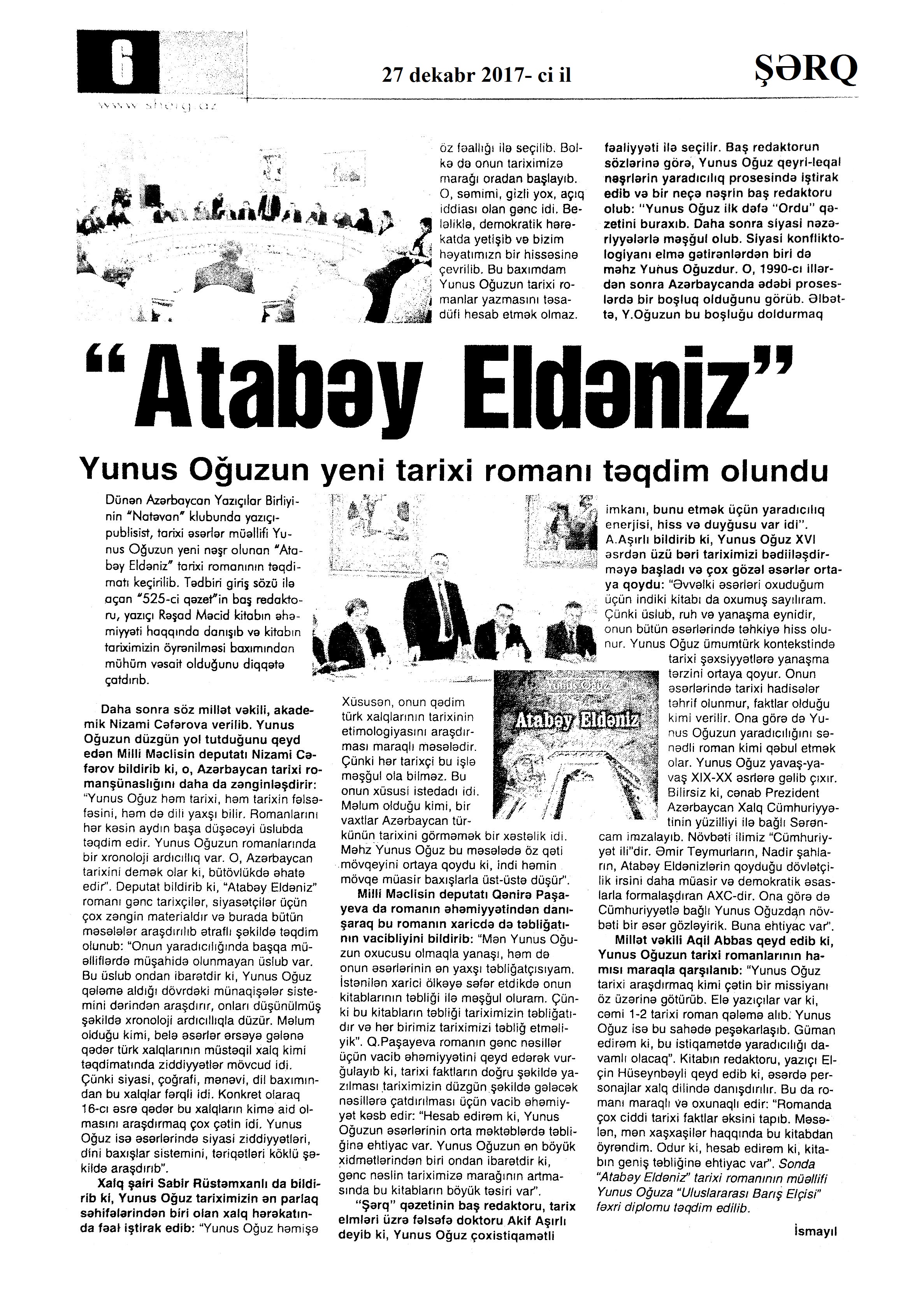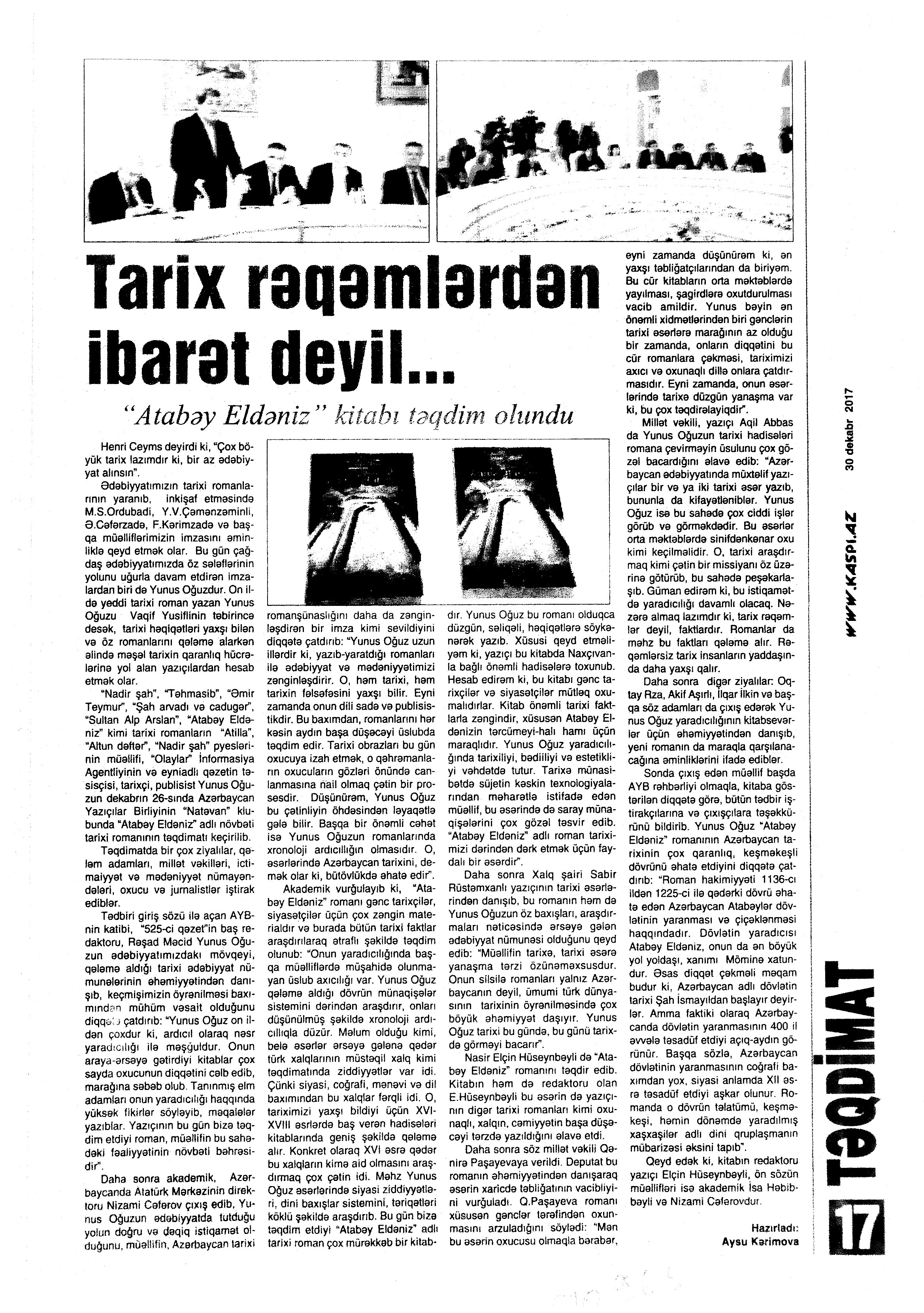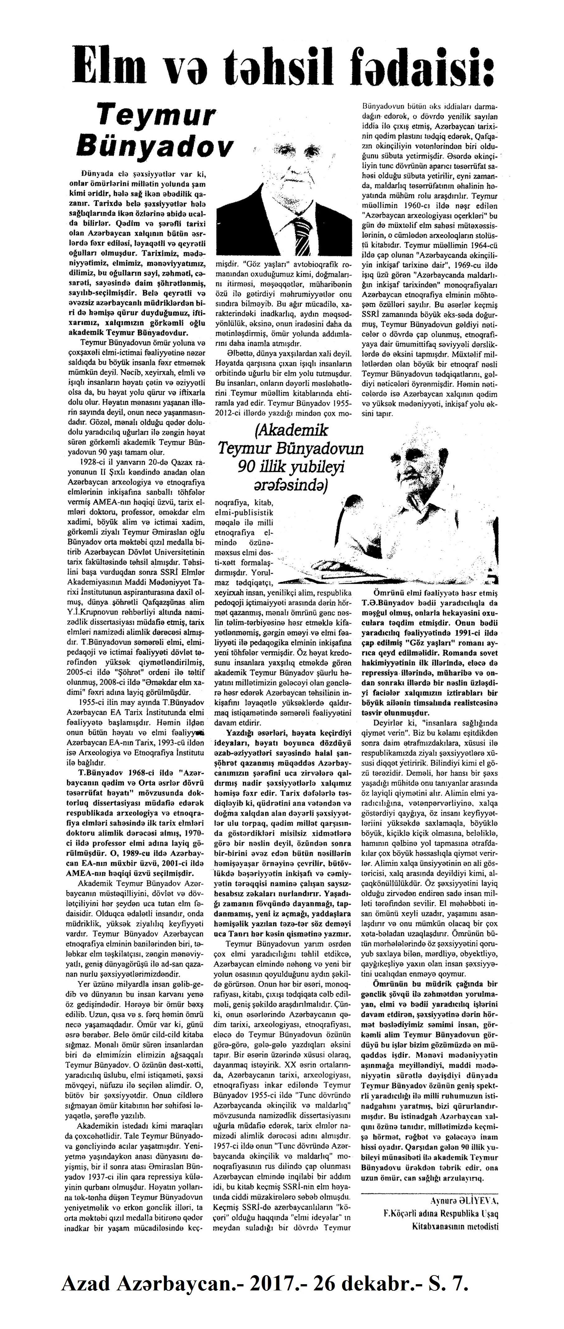 989. Yunus Oğuzun “Atabəy Eldəniz” romanının təqdimatı olub: [AMEA-da] //Ədalət. - 2017.- 26 dekabr.- S.7. 990. Yurdoğlu, E. “Öz əsərini danışdır”: Elxan Yurdoğlu-“Eynəli bəy Sultanov”: [yazıçı ilə eyniadlı əsəri haqqında müsahibə] /müsahibəni apardı Hədiyyə Şəfaqət //Ədəbiyyat qəzeti.- 2017.- 23 dekabr.- S.14-15. 991. Yusifli, C. Uşaqlığın himni: [ingilis dilli şair Li-Young Leenin həyat və yaradıcılığı haqqında] //Ədəbiyyat qəzeti.- 2017.- 9 dekabr.- S.28. 992. Yusifli, V. Azərbaycan qəzəli: V yazı: [şair Məhəmməd Füzulinin yaradıcılığı haqqında] //Ədalət.-2017.- 2 dekabr.- S.15. 993. Yusifli, V. Azərbaycan qəzəli: [şair Seyid Əzimin qəzəlləri haqqında]: VI yazı //Ədalət.- 2017.- 30 dekabr.- S.15. 994. Yusifli, V. Elçinin “missiya”sı //Ədalət.- 2017.- 9 dekabr.- S.15. 995. Yusifli, V. “Əli İldırımoğlu yaradıcılığında milli-mənəvi özünüdərk”: [yazıçı-tədqiqatçı Loğman Rəşidzadənin eyniadlı monoqrafiyası haqqında] //525-ci qəzet.- 2017.- 9 dekabr.- S.14. 996. Yusifli, V. Qəzənfər müəllimin Şuşaya yürüşü niyə baş tutmadı?: [şair Əjdər Olun yaradıcılığı haqqında] //Ədalət.- 2017.- 20 dekabr.- S.7. 997. Yusifli, V. Mənim tanıdığım Əliyar Səfərli: [filologiya elmləri doktorunun yaradıcılığı haqqında] //Ədəbiyyat qəzeti.- 2017.- 9 dekabr.- S.27. 998. Yusifli, V. Ovqatın bütün rənglərində ehtiyac duyulan insan: Müəllimim, ustadım, anam – Əzizə Cəfərzadə //Kaspi.- 2017.- 28 dekabr.- S.15. 999. Yusifli, V. Tanış olun: Əjdər Yunis Rza: [şair haqqında] //Ədalət.- 2017.- 16 dekabr.- S.15. 1000. Yusifli, V. Unutmadığım Vilayət Rüstəmzadə: [ədəbiyyatşünas alimin yaradıcılığı haqqında] //Ədəbiyyat qəzeti.- 2017.- 30 dekabr.- S.7. 1001. Yusifli, V. Zakir Bayramlının “Çağlayan bulağ”ı: [şairin yaradıcılığı haqqında] //Ədalət.-2017.- 5 dekabr.- S.8. 1002. Yusifli, V. Zamanın çaşdıra bilmədiyi şair: (Yusif Həsənbəyin 85 yaşına) //Ədalət.- 2017.- 23 dekabr.- S.15. 1003. Zərdabişünas alim Esmira Cavadovanın 75 illik yubileyi ilə bağlı toplantı keçirilib: [Beynəlxalq Mətbuat Mərkəzində] //Azərbaycan.- 2017.-14 dekabr.- S.3. 525-ci qəzet.- 2017.-14 dekabr.- S.3.; Kaspi.- 2017.-14 dekabr.- S.6. 1004. Zülaloğlu, A. Xatirəmdə yaşayan Zəlimxan Yaqub //Ədalət.- 2017.- 26 dekabr.- S.6.