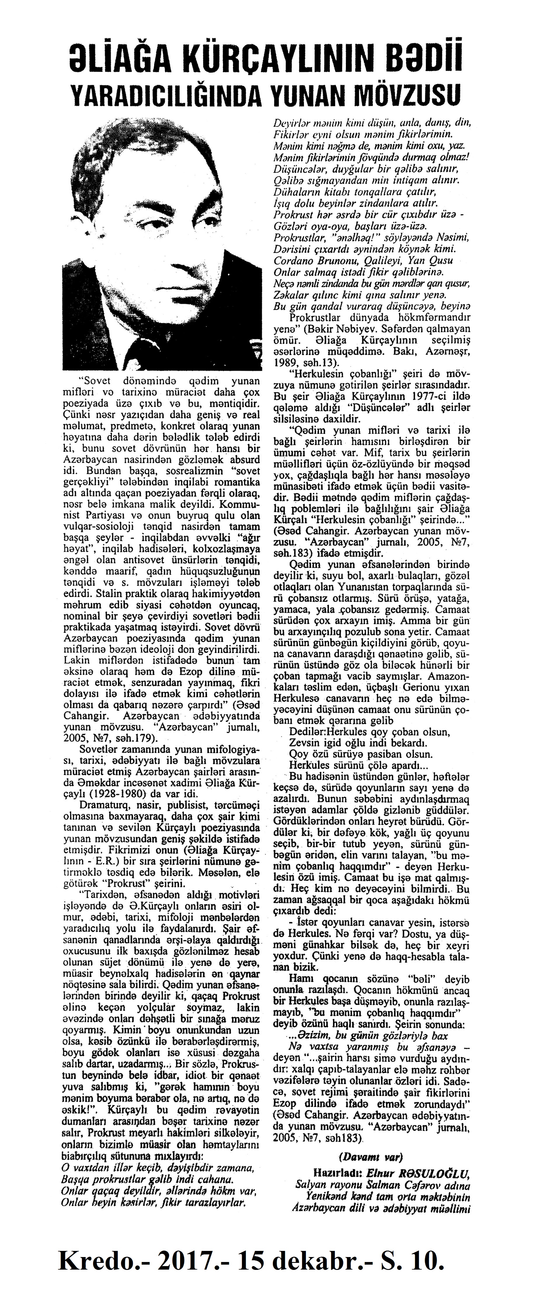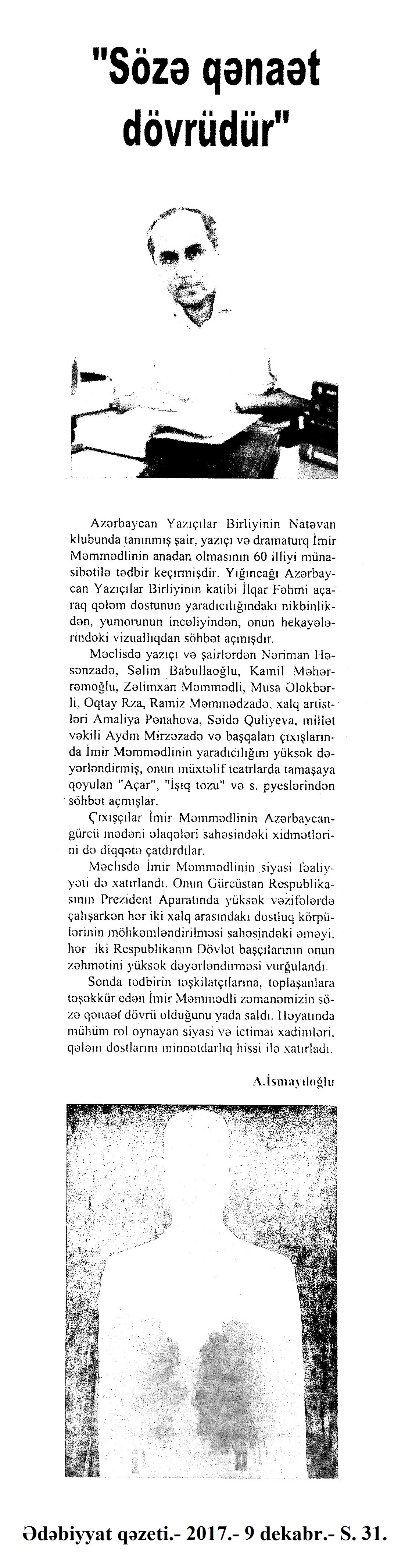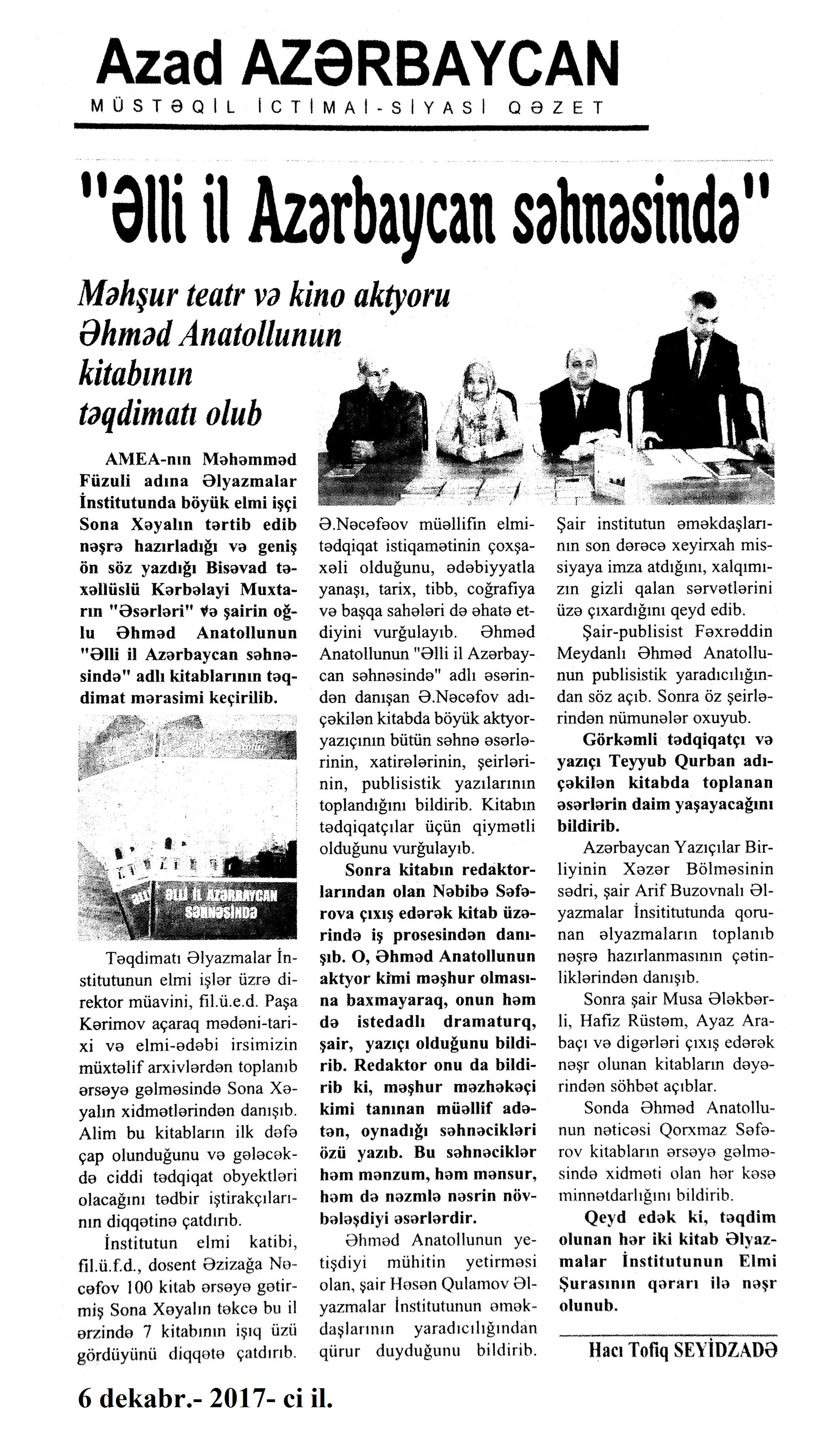 989. Yunus Oğuzun “Atabəy Eldəniz” romanının təqdimatı olub: [AMEA-da] //Ədalət. - 2017.- 26 dekabr.- S.7. 990. Yurdoğlu, E. “Öz əsərini danışdır”: Elxan Yurdoğlu-“Eynəli bəy Sultanov”: [yazıçı ilə eyniadlı əsəri haqqında müsahibə] /müsahibəni apardı Hədiyyə Şəfaqət //Ədəbiyyat qəzeti.- 2017.- 23 dekabr.- S.14-15. 991. Yusifli, C. Uşaqlığın himni: [ingilis dilli şair Li-Young Leenin həyat və yaradıcılığı haqqında] //Ədəbiyyat qəzeti.- 2017.- 9 dekabr.- S.28. 992. Yusifli, V. Azərbaycan qəzəli: V yazı: [şair Məhəmməd Füzulinin yaradıcılığı haqqında] //Ədalət.-2017.- 2 dekabr.- S.15. 993. Yusifli, V. Azərbaycan qəzəli: [şair Seyid Əzimin qəzəlləri haqqında]: VI yazı //Ədalət.- 2017.- 30 dekabr.- S.15. 994. Yusifli, V. Elçinin “missiya”sı //Ədalət.- 2017.- 9 dekabr.- S.15. 995. Yusifli, V. “Əli İldırımoğlu yaradıcılığında milli-mənəvi özünüdərk”: [yazıçı-tədqiqatçı Loğman Rəşidzadənin eyniadlı monoqrafiyası haqqında] //525-ci qəzet.- 2017.- 9 dekabr.- S.14. 996. Yusifli, V. Qəzənfər müəllimin Şuşaya yürüşü niyə baş tutmadı?: [şair Əjdər Olun yaradıcılığı haqqında] //Ədalət.- 2017.- 20 dekabr.- S.7. 997. Yusifli, V. Mənim tanıdığım Əliyar Səfərli: [filologiya elmləri doktorunun yaradıcılığı haqqında] //Ədəbiyyat qəzeti.- 2017.- 9 dekabr.- S.27. 998. Yusifli, V. Ovqatın bütün rənglərində ehtiyac duyulan insan: Müəllimim, ustadım, anam – Əzizə Cəfərzadə //Kaspi.- 2017.- 28 dekabr.- S.15. 999. Yusifli, V. Tanış olun: Əjdər Yunis Rza: [şair haqqında] //Ədalət.- 2017.- 16 dekabr.- S.15. 1000. Yusifli, V. Unutmadığım Vilayət Rüstəmzadə: [ədəbiyyatşünas alimin yaradıcılığı haqqında] //Ədəbiyyat qəzeti.- 2017.- 30 dekabr.- S.7. 1001. Yusifli, V. Zakir Bayramlının “Çağlayan bulağ”ı: [şairin yaradıcılığı haqqında] //Ədalət.-2017.- 5 dekabr.- S.8. 1002. Yusifli, V. Zamanın çaşdıra bilmədiyi şair: (Yusif Həsənbəyin 85 yaşına) //Ədalət.- 2017.- 23 dekabr.- S.15. 1003. Zərdabişünas alim Esmira Cavadovanın 75 illik yubileyi ilə bağlı toplantı keçirilib: [Beynəlxalq Mətbuat Mərkəzində] //Azərbaycan.- 2017.-14 dekabr.- S.3. 525-ci qəzet.- 2017.-14 dekabr.- S.3.; Kaspi.- 2017.-14 dekabr.- S.6. 1004. Zülaloğlu, A. Xatirəmdə yaşayan Zəlimxan Yaqub //Ədalət.- 2017.- 26 dekabr.- S.6.