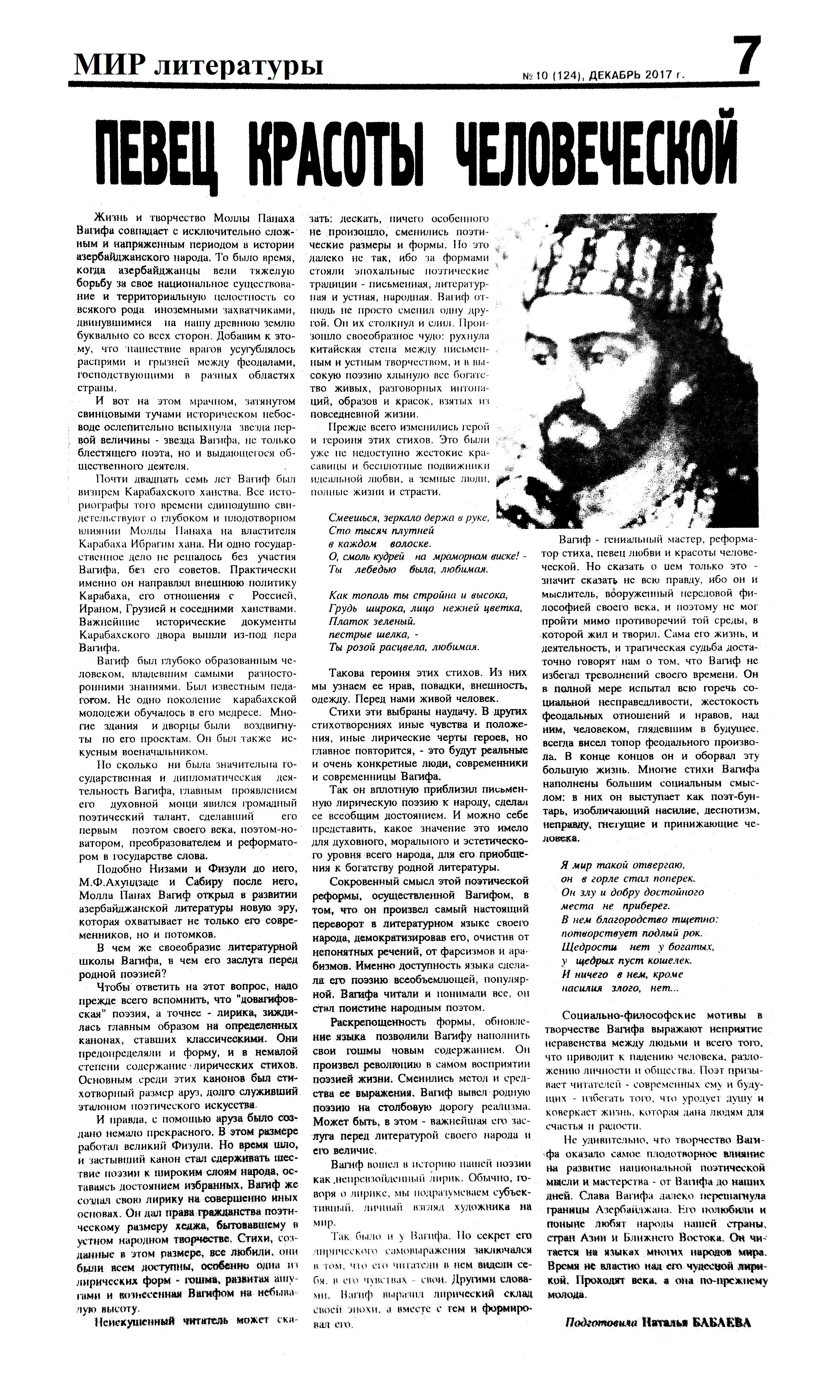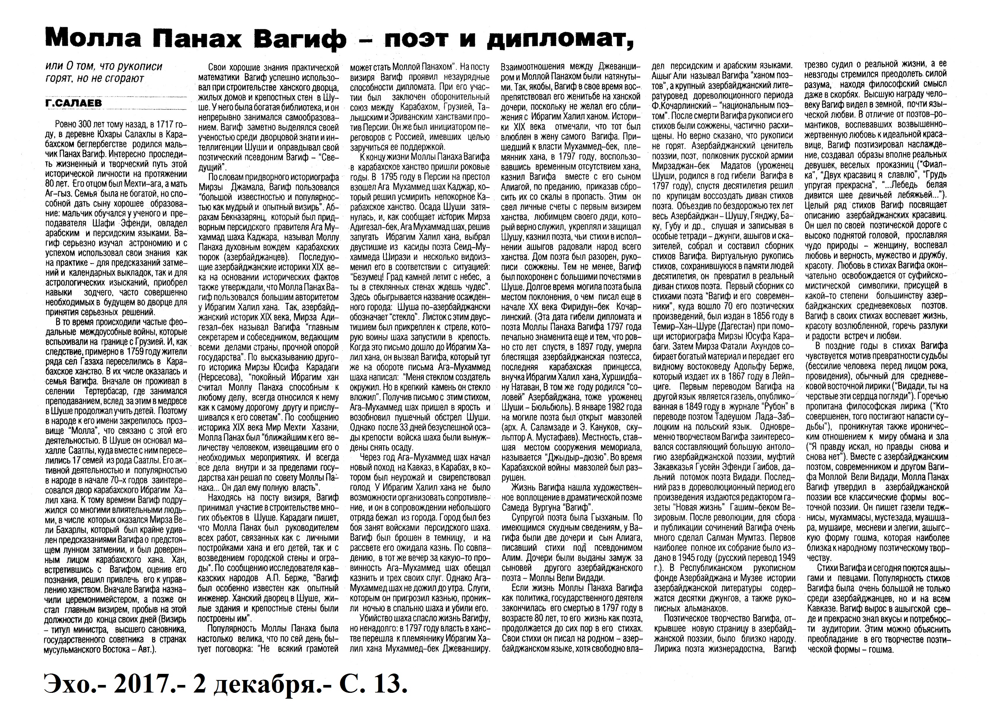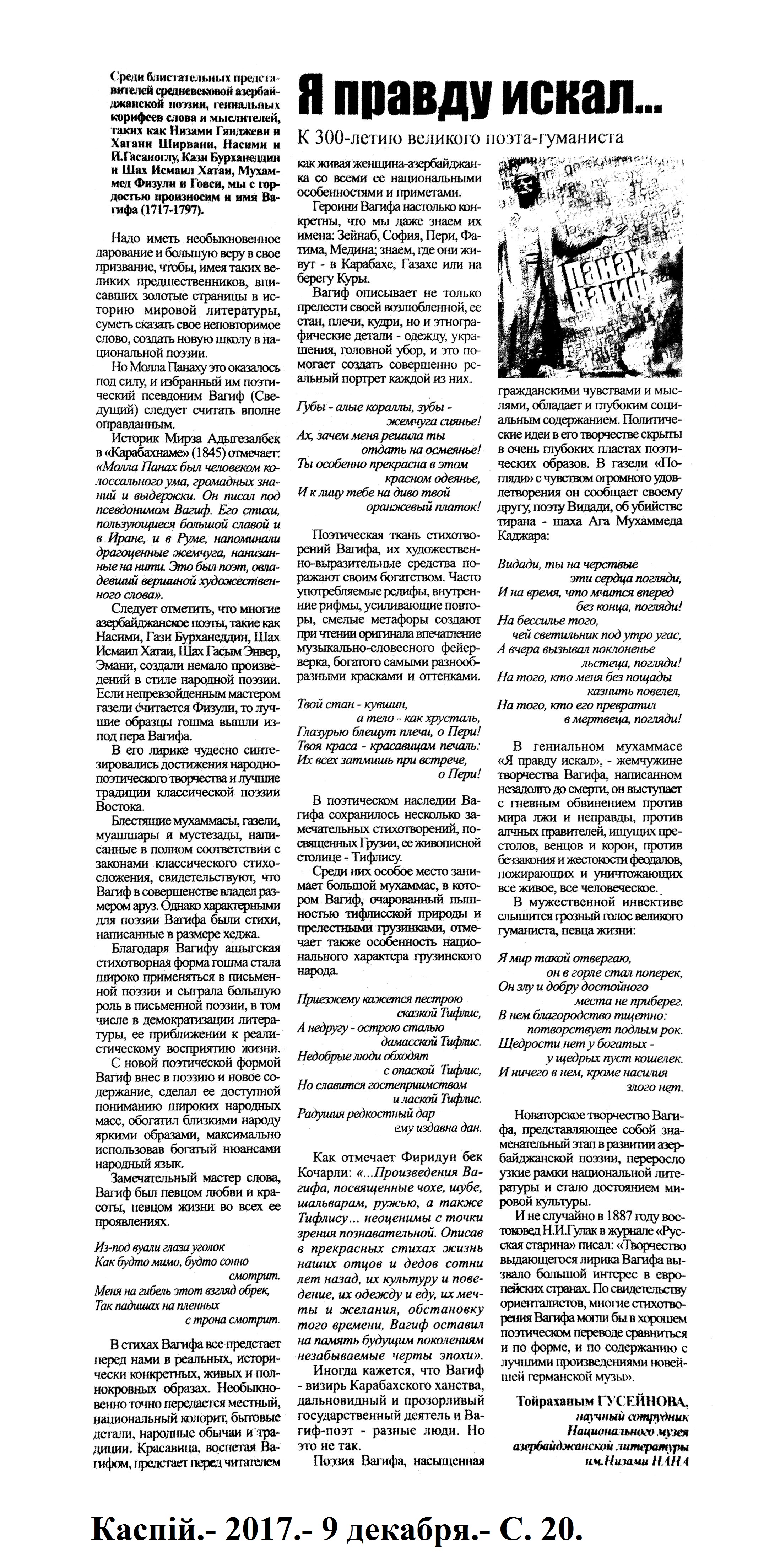 Молла Панах Вагиф – 300 1284. Асадова, И. «Сокровищница тайн»: Мероприятие, посвященное Молла Панах Вагифу состоялось в Газахе //Эхо.- 2017.- 5 декабря.- С.8. 1285. Бабаева, Н. Певец красоты человеческой //Мир литературы.- 2017.- № 10 (124) декабрь.- С.7. 1286. Гусейнова, Т. Я правду искал...: К 300 - летию великого поэта-гуманиста //Каспiй.- 2017.- 9 декабря.- С.20. 1287. Ислам, А. Певец любви и красоты: Молла Панах Вагиф – 300 //Каспiй.- 2017.- 16 декабря.- С.13. 1288. Ислам, А. Связующий фактор: Делегация Türksoy приняла участие в мероприятиях в Баку: [научно-практическая конференция в Национальной Библиотеке] //Каспiй.- 2017.- 12 декабря.- С.9. 1289. Салаев, Г. Моллах Панах Вагиф - поэт и дипломат: Или о том, что рукописи горят, но не сгорают //Эхо.- 2017.- 2 декабря.- С.13.
