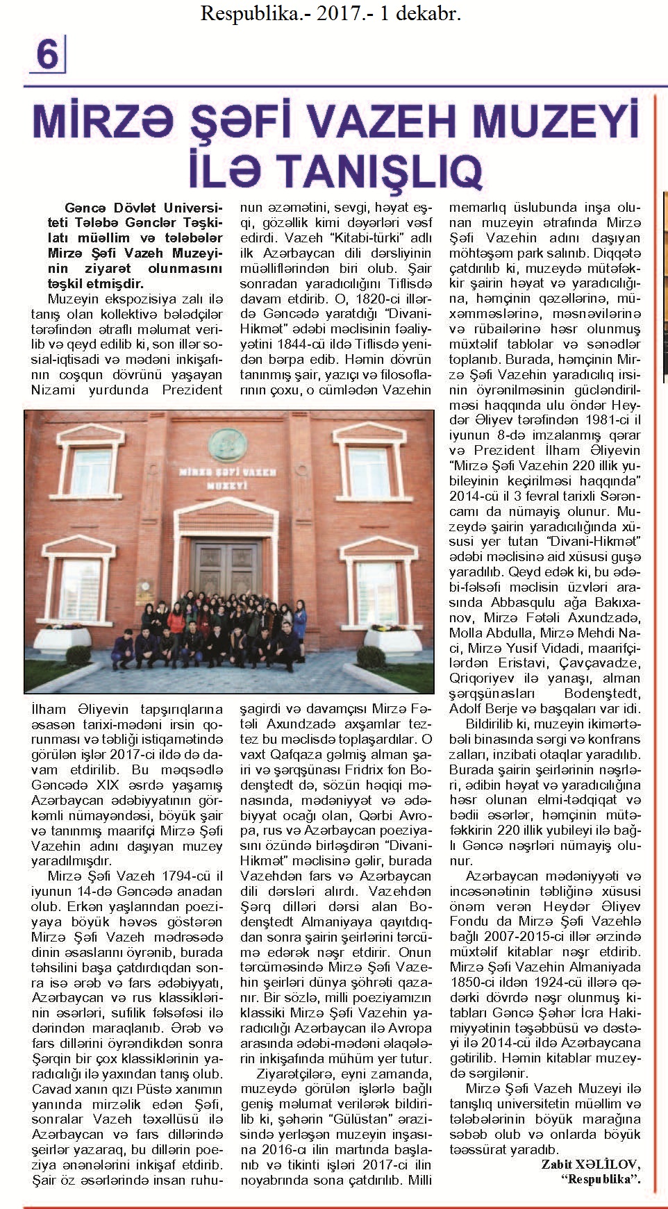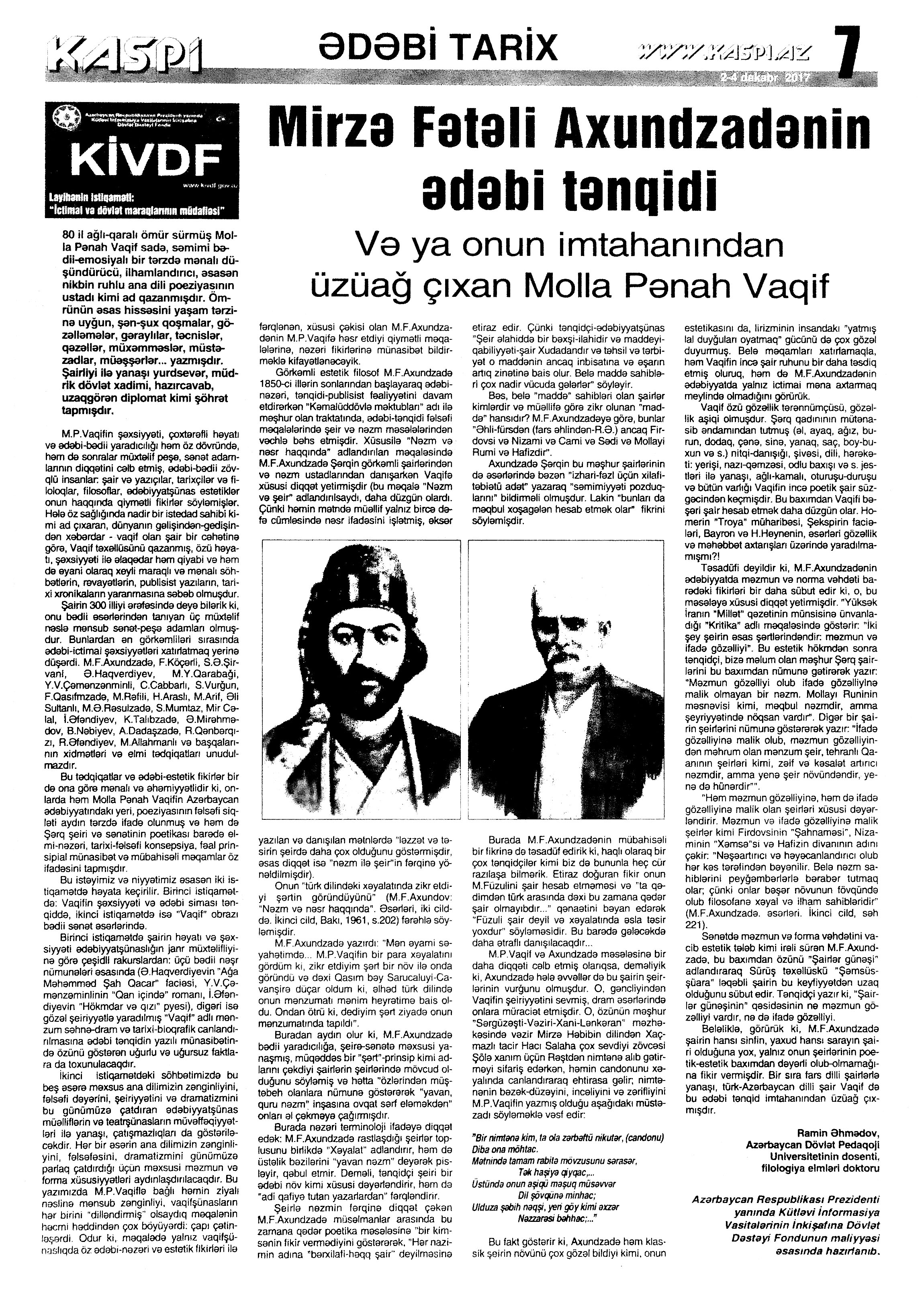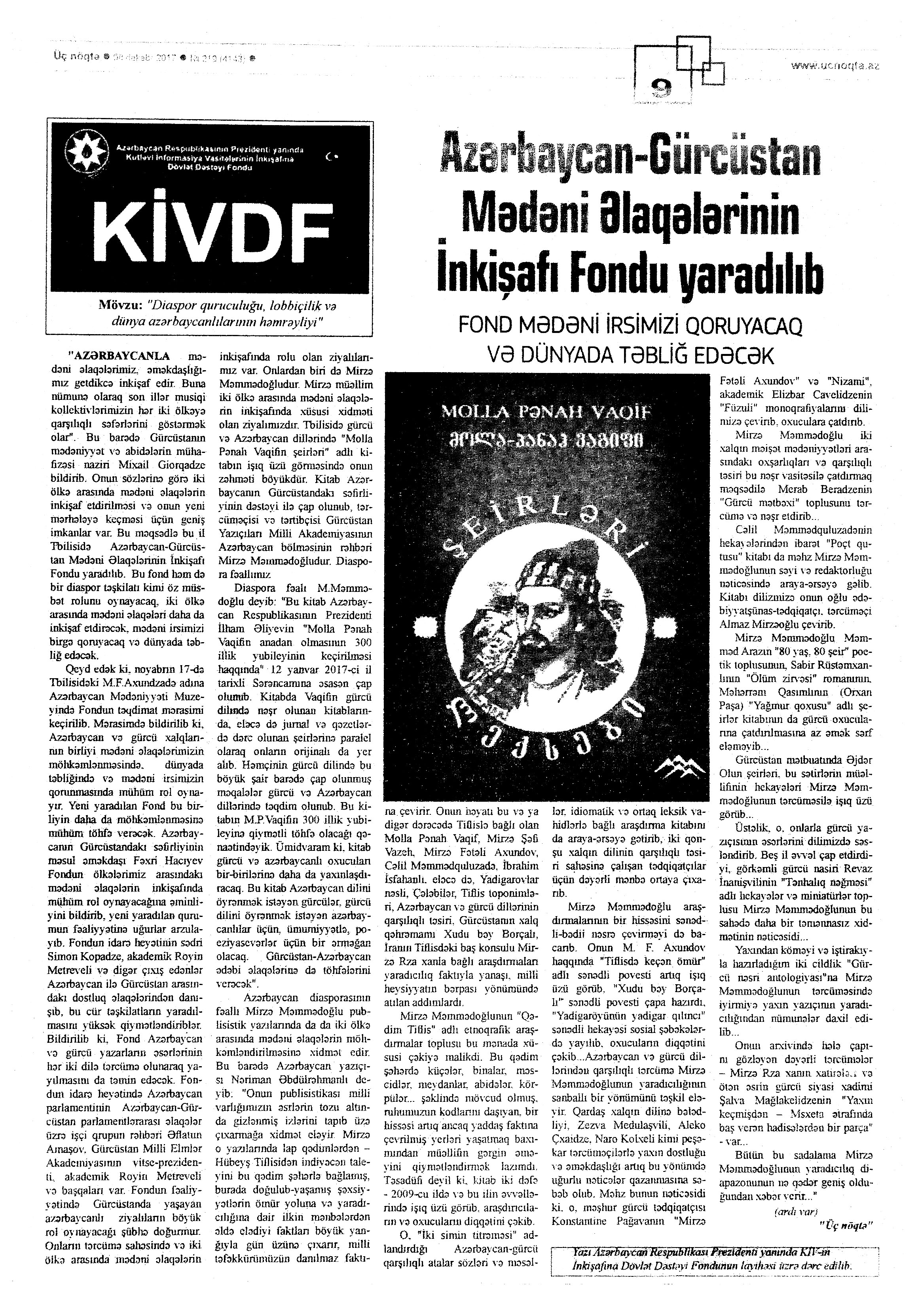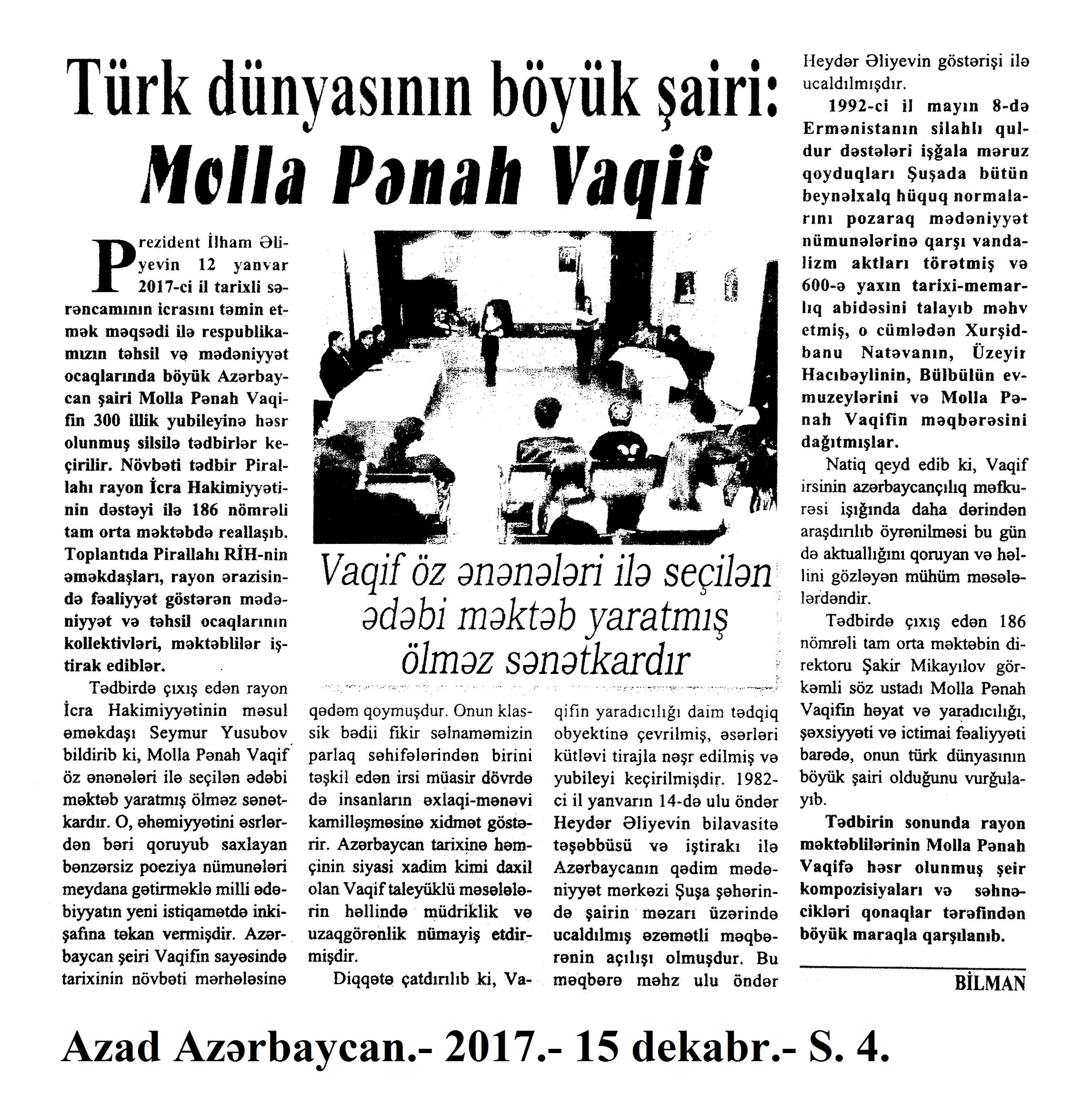 Молла Панах Вагиф – 300 1284. Асадова, И. «Сокровищница тайн»: Мероприятие, посвященное Молла Панах Вагифу состоялось в Газахе //Эхо.- 2017.- 5 декабря.- С.8. 1285. Бабаева, Н. Певец красоты человеческой //Мир литературы.- 2017.- № 10 (124) декабрь.- С.7. 1286. Гусейнова, Т. Я правду искал...: К 300 - летию великого поэта-гуманиста //Каспiй.- 2017.- 9 декабря.- С.20. 1287. Ислам, А. Певец любви и красоты: Молла Панах Вагиф – 300 //Каспiй.- 2017.- 16 декабря.- С.13. 1288. Ислам, А. Связующий фактор: Делегация Türksoy приняла участие в мероприятиях в Баку: [научно-практическая конференция в Национальной Библиотеке] //Каспiй.- 2017.- 12 декабря.- С.9. 1289. Салаев, Г. Моллах Панах Вагиф - поэт и дипломат: Или о том, что рукописи горят, но не сгорают //Эхо.- 2017.- 2 декабря.- С.13.