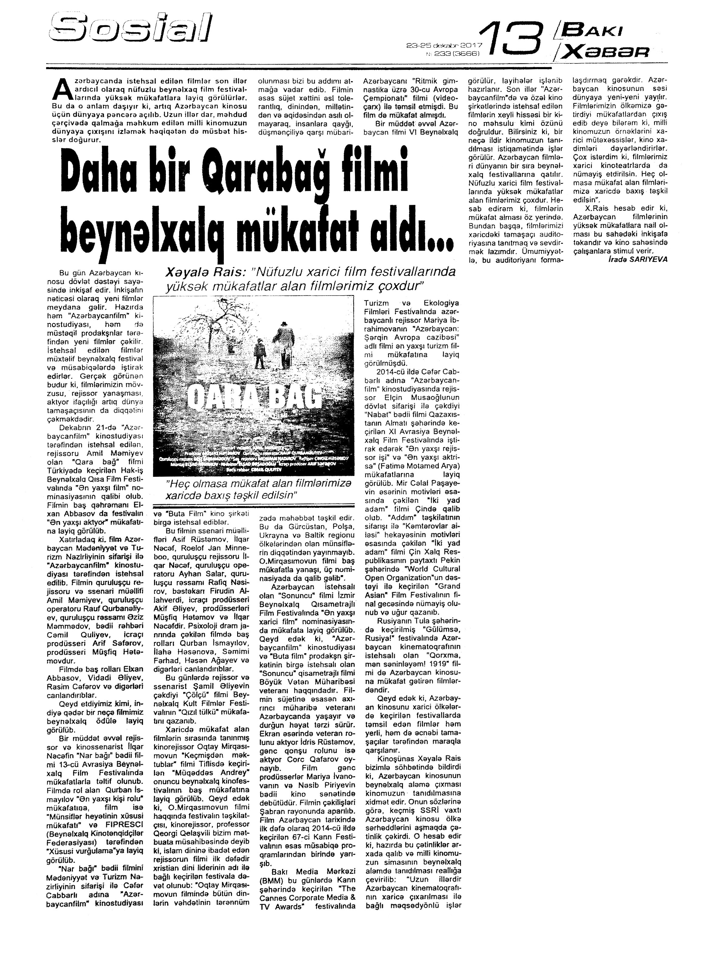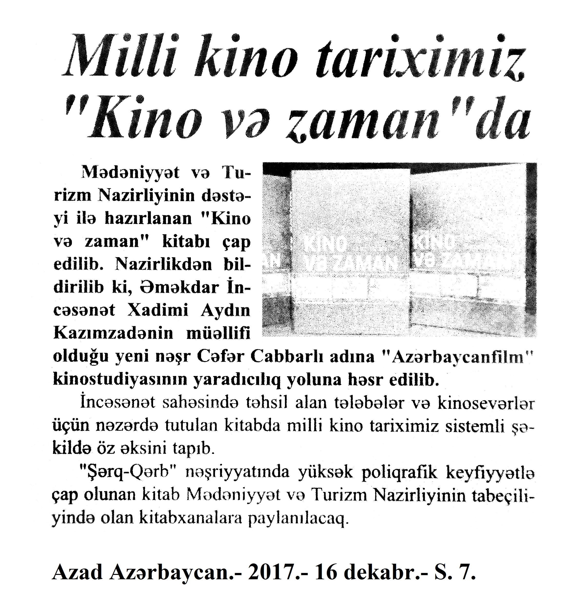 KİNO 460. Abbaslı, T. O, bütöv bir canlı Səhnə: bütün Azərbaycan anşlaq Salon, bütün xalq isə qəşşi-Tamaşaçı idi...: [Xalq artisti Lütfəli Abdullayev haqqında] //Mədəniyyət.- 2017.- 8 dekabr.- S.13. 461. Adamlar içində tənha: Mərhum rejissor Şamil Mahmudbəyovun son filmi təqdim olunub: [Nizami Kino Mərkəzində “Adam” qısametrajlı bədii filminin təqdimatı haqqında] //Mədəniyyət.- 2017.- 27 dekabr.- S.16. 462. Aktyorlarımız Türkiyədə mükafata layiq görülüblər: [5-ci Antakya Beynəlxalq Film Festivalında Hikmət Rəhimovun və İlahə Həsənovanın mükafata layiq görülmələri haqqında] //Mədəniyyət.- 2017.- 15 dekabr.- S.6. 463. Azəri, L. Kino lentində qalanlar: [2017-ci il də Azərbaycan kinosunda yadda qalan əlamətdar hadisələr haqqında] //Mədəniyyət.- 2017.- 29 dekabr.- S.12. 464. Azəri, L. Milli kinomuzda əcnəbi musiqilər //Mədəniyyət.- 2017.- 1 dekabr.- S.10. 465. Azəri, L. Milli kinomuzda əcnəbi musiqilər: İkinci yazı //Mədəniyyət.- 2017.- 20 dekabr.- S.13. 466. Beynəlxalq kino günü münasibətilə konsert: [Cəfər Cabbarlı adına Azərbaycan Dövlət Teatr Muzeyində] //Mədəniyyət.-2017.- 22 dekabr.- S.5. 467. “Biz bir filmi bir aya dublyaj edirdik, indi bir günə edirlər”: [Əməkdar mədəniyyət işçisi Əsəd Əsədov haqqında] //Üç nöqtə.- 2017.- 28 dekabr.- S.10. 468. Cabbarov, Ə. Prosesin hədəfə çatması üçün onun dərk olunması vacibdir: [prodüser, rejissor, kinematoqraf Əli İsa Cabbarovla söhbət] /söhbəti apardı Samirə Əşrəf //Ədəbiyyat qəzeti.- 2017.- 9 dekabr.- S.12-13. 469. “Çölçü” beynəlxalq festivalda mükafat qazanıb: [Şamil Əliyevin eyniadlı filmi Hindistanın Kəlküttə şəhərində keçirilən beynəlxalq film festivalında] //Mədəniyyət.- 2017.- 8 dekabr.- S.16. 470. Daha bir Qarabağ filmi beynəlxalq mükafat aldı...: [Amil Məmiyevin “Qara bağ” filmi Türkiyədə kecirilən Hak-İş Beynəlxalq Qısa Film Festivalında “Ən yaxşı film” nominasiyasının qalibi oldu] //Bakı xəbər.- 2017.- 23-25 dekabr.- S.13. 471. “Daşla danışan adam”: [Bilik Fondunda Nicat Qafuroğlunun hazırladığı eyniadlı filmin təqdimatı haqqında] //Mədəniyyət.- 2017.- 1 dekabr.- S.15. 472. “Döyüşçü” filmi Kann Qızıl Mükafatına layiq görülüb: [BP-nin ikiqat paraolimpiya çempionu İlham Zəkiyev haqqında çəkilmiş film] //Azərbaycan. - 2017.- 26 dekabr.- S.8. 473. “Əli və Nino” filmi Zaqrebdə nümayiş olunub: [Asif Kapadianın hazırladığı eyniadlı film Xorvatiyanın paytaxtında] //Mədəniyyət.- 2017.- 15 dekabr.- S.5. 474. Əmirhüseyn Məcidovun 80 illik yubileyi qeyd edildi: [Dövlət Film Fondunda] //Şərq.- 2017. -1 dekabr.- S.13. 475. Əsgərov, H. Görkəmli kinorejissor: [Ağarza Quliyev haqqında] //Respublika.- 2017.- 3 dekabr.- S.3. 476. Əsgərov, H. Rəssamlıqdan başlayan sənət yolu: [kinorejissor Əlisəttar Atakişiyev haqqında] //Respublika.- 2017.- 31 dekabr.- S.6. 477. “Əzəli dostluq riştələri”: Səmərqənddə Azərbaycan mədəniyyəti həftəsində sənədli filmin təqdimatı: [Eldar Məmmədovun hazırladığı eyniadlı filmin təqdimatı haqqında] //Mədəniyyət.- 2017.- 1 dekabr.- S.16. 478. Əzməmmədov, N. “Vicdanın nə tərifi var, nə də ölçüsü...” //Üç nöqtə. - 2017.- 19 dekabr.- S.12. 479. Görkəmli rejissorun yubileyi qeyd edilib: [Dövlət Film Fondunda televiziya rejissoru Əmirhüseyn Məcidovun 80 illiyinə həsr edilmiş tədbin keçirilməsi haqqında] //Mədəniyyət.- 2017.-1 dekabr.- S.3. 480. Xədicə. “Əli və Nino” filmi Xorvatiyada nümayiş olundu: [Asif Kapadianın hazırladığı eyniadlı film Xorvatiyanın paytaxtı Zaqrebdə] //525-ci qəzet.- 2017.- 16 dekabr.- S.5. 481. Xədicə. Aydın Kazımzadədən “Kino və zaman”: [tanınmış kinoşünasın eyniadlı kitabının təqdimatı haqqında] //525-ci qəzet.- 2017.- 16 dekabr.- S.12. 482. Xəyalə. Nakam sevgi, yarımçıq ömür və... vəfasızlıq nağılı: [Əməkdar artist Vəfa Fətullayeva haqqında: //Üç nöqtə.- 2017.- 16 dekabr.- S.12. 483. “Kino və zaman” kitabı çapdan çıxıb: [Əməkdar incəsənət xadimi Aydın Kazımzadənin eyniadlı kitabı haqqında] //Mədəniyyət.- 2017.- 15 dekabr.- S.4. 484. Qurbanlı, R. Nazir qızını sevən Azərbaycan aktyoru: [Xalq artisti Lütfəli Abdullayev haqqında] //Üç nöqtə.- 2017.- 13 dekabr.- S.12. 485. Qurbanlı, R. Ölümü də gözəl olan qızın nağılı: Hüsnü-camalı ilə Miranşahı Valeh edən Şəms: [aktrisa Almaz Əsgərova haqqında] //Üç nöqtə.- 2017.- 6 dekabr.- S.12. 486. Manafov, F. “Yaradıcı adam gərək ac qarına sənət yaratsın”: [Xalq artisti, tanınmış aktyor Fəxrəddin Manafovun müsahibəsi] /müsahibəni apardı Tahirə //Şərq.- 2017.-16 dekabr.- S.13. 487. Məhərrəmova, T. Unudulan aktyor: Və ya “romantizmin son ulduzu”: [Xalq artisti Həsənağa Salayev haqqında] //Kaspi.- 2017.- 5 dekabr.- S.7. 488. Milli kino tariximiz “Kino və zaman” da //Azad Azərbaycan.- 2017.- 16 dekabr.- S.7. 489. Mirməmməd, G. Mixaylodan Lirədək: unudulmaz Nodar Şaşıqoğlu: [Dövlət Rus Dram Teatrında Xalq artisti Nodar Şaşıqoğlunun 90 illik yubileyi münasibətilə keçirilən tədbir haqqında] //Mədəniyyət.- 2017.- 22 dekabr.- S.10. 490. Mirzəzadə, Z. “Kinoteatrlar artsa da tamaşaçı artmır”: [rejissor-prodüser Zaur Mirzəzadə ilə müsahibə] /müsahibəni apardı Qan Turalı //Ədalət.- 2017.- 9-11 dekabr.- S.20. 491. Mükərrəmoğlu, M. “Kino və zaman” kitabı nəşr olunub: [Aydın Kazımzadənin eyniadlı kitabının təqdimatı haqqında] //Xalq qəzeti. - 2017.- 17 dekabr.- S.8. 492. Mükərrəmoğlu, M. 50 il ekranlarda: [Kamil Rüstəmbəyovun “Dağlarda döyüş” filmi haqqında] //Xalq qəzeti.- 2017.- 3 dekabr.- S.5. 493. Müşfiq, Ş. IV “İpək Yolu” Beynəlxalq 
