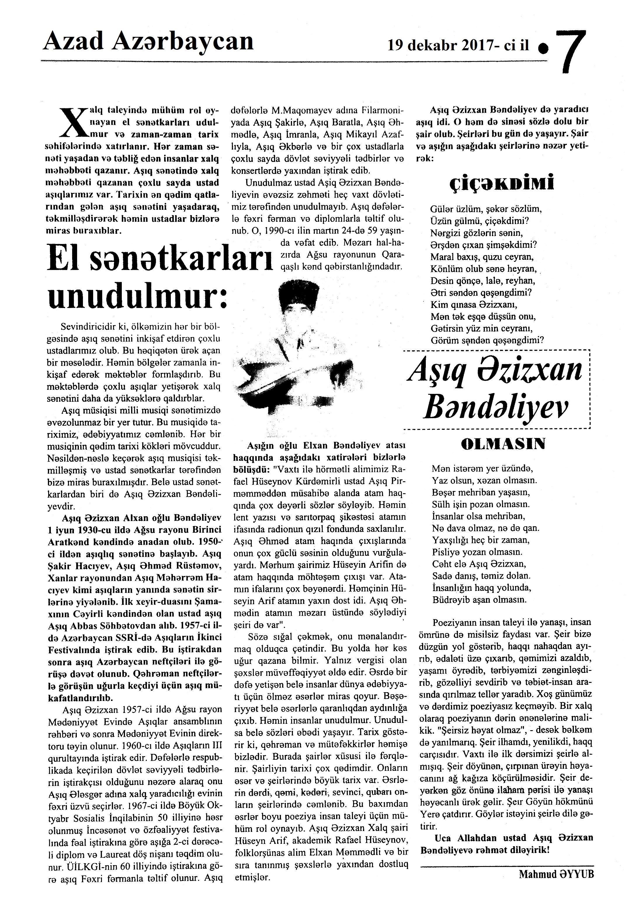 XALQ YARADICILIĞI 445. Aşıq Yanvarın yubileyi qeyd olunub: [İsmayıllı Rayon Mədəniyyət evində] //Mədəniyyət.- 2017.- 1 dekabr.- S.7. 446. Aşıq, Ə. Sənətkarı eldən soruş...: “Aşıq sözü aşiq sözündən törəmədir”: [Aşıq Əlifağa ilə müsahibə] /müsahibəni apardı Samir Qurbanov //Ədalət.- 2017.- 19 dekabr.- S.8. 447. Əyyub, M. El sənətkarları unudulmur: Aşıq Əzizxan Bəndəliyev //Azad Azərbaycan.- 2017.- 19 dekabr.- S. 7. 448. İranda beynəlxalq aşıq festivalı: [Elxan Cəlilovun ölkəmizi təmsil etməsi haqqında] //Mədəniyyət.- 2017.- 13 dekabr.- S.4. 449. Qorxmaz Tofiqoğlu: “Sazın qüdrəti hər cür mənfi ehtimalı puça çıxarır”: [İctimai Televiziyanın “Ozan məclisi” proqramının müəllifi və aparıcısı ilə müsahibə] /müsahibəni apardı Şahanə Müşfiq //525-ci qəzet.-2017.- 19 dekabr.- S.7. 450. Mahmud. Elm və sənət toplusu “Ozan”ın ilk buraxılışında...: [Azərbaycan Aşıqlar Birliyinin yeni nəşri olan eyniadlı toplu haqqında] //Azad Azərbaycan.- 2017.- 8 dekabr.- S.7. 451. Mirişova, F. Klassik havalar və dastan bilicisi: 1984-cü ildə Aşıq Şakirin səsi sovet hakimiyyətinin ideoloji düşməni olan ölkələrdə dinlənilirdi //Xalq cəbhəsi.- 2017.- 28 dekabr.- S. 14. 452. Ölkəmiz Tehranda aşıq festivalında təmsil olunub //Mədəniyyət.- 2017.- 15 dekabr.- S.7. 453. “Sazımızın qüdrəti, sözümüzün hikməti”: [Ağstafa Şəhər Heydər Əliyev Mərkəzində eyniadlı konsert proqramının keçirilməsi haqqında] //Mədəniyyət.- 2017.- 8 dekabr.- S.7.