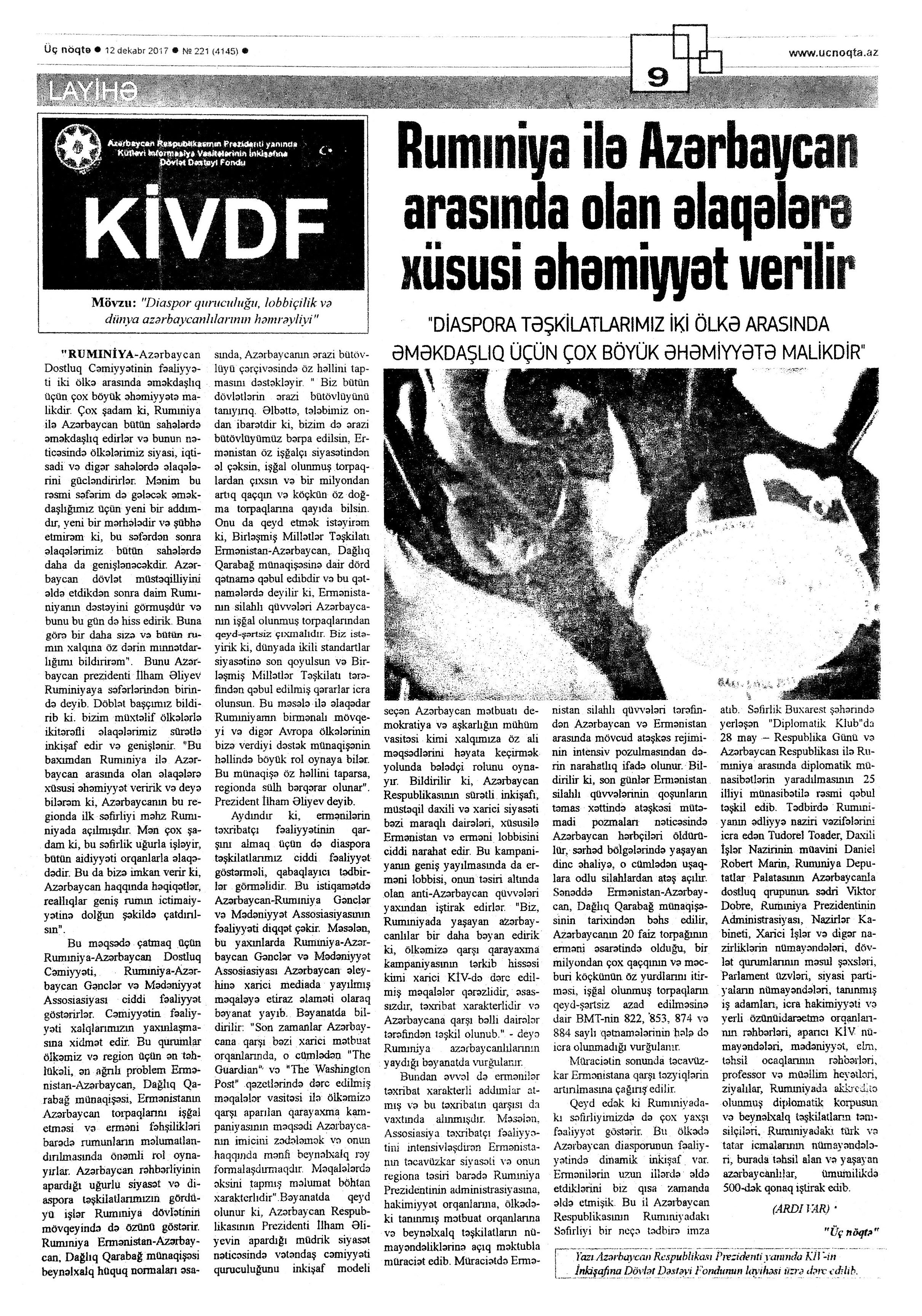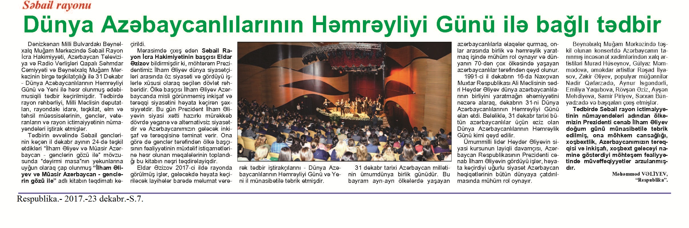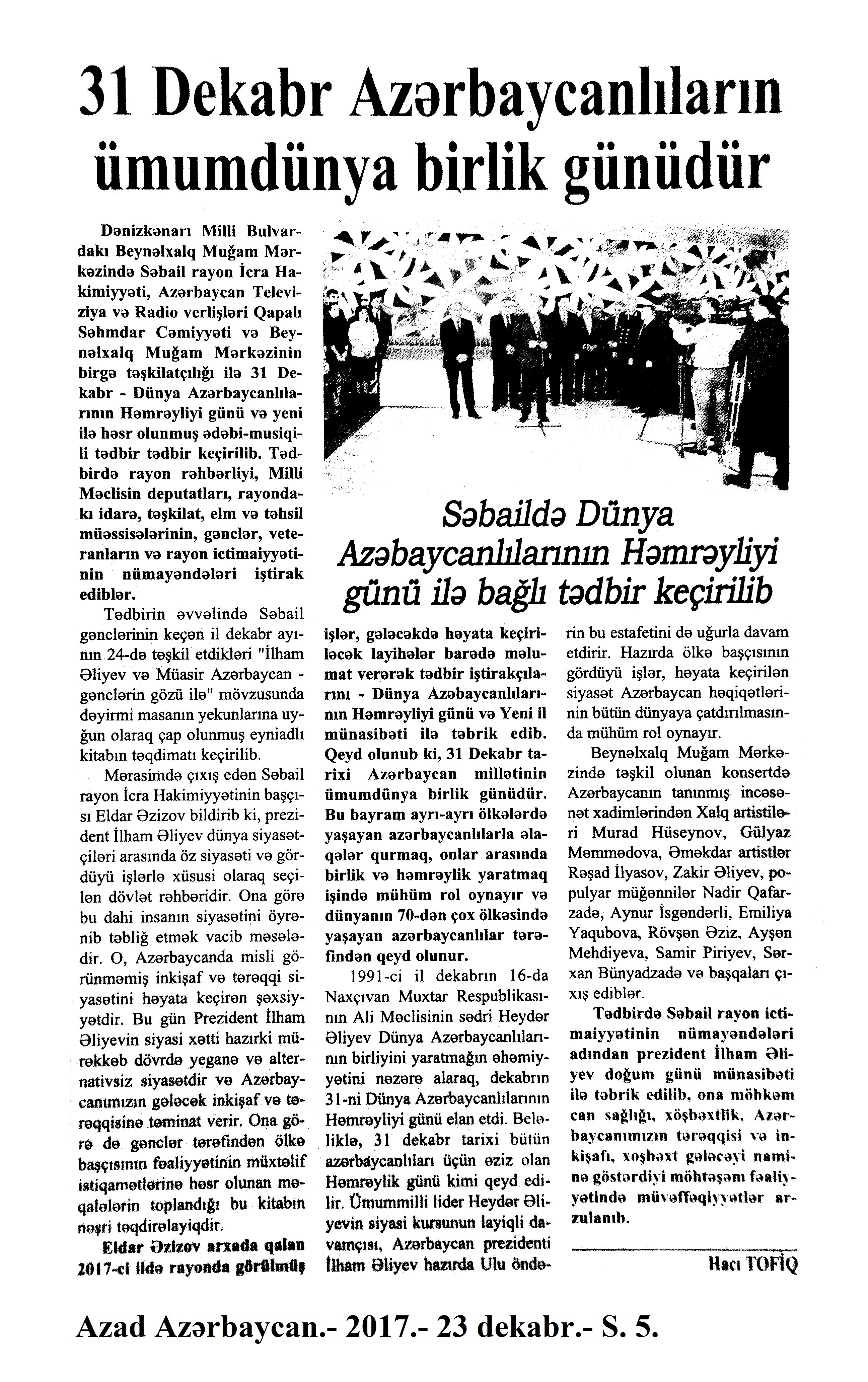 Dünya Azərbaycanlılarının həmrəylik günü 96. Bayram bayrama qovuşanda... [Dünya Azərbaycanlılarının Həmrəylik Günü və Yeni il münasibətilə keçirilən tədbirlər haqqında] //Mədəniyyət.- 2017.- 29 dekabr.- S.2. 97. Dənizkənarı Milli Parkda “Qış nağılı” festivalı başlanılıb //Azərbaycan.- 2017.- 31 dekabr.- S.6. 98. Dəyirmi masa keçirilib: [Heydər Əliyev Mərkəzində Dünya Azərbaycanlılarının Həmrəylik Günü və Yeni il münasibətilə keçirilən tədbirdə “Heydər Əliyev Vətənin keşiyində” filminin nümayiş olunması haqqında] //Mədəniyyət.- 2017.- 29 dekabr.- S.2. 99. Mehriban Əliyeva: “Biz yenə də birlikdəyik”: Heydər Əliyev Fondu uşaqlar üçün ənənəvi bayram şənliyi təşkil edib: Mehriban Əliyevanın çıxışı: [Birinci vitse-prezident Mehriban Əliyeva, Fondun vitse-prezidenti Leyla Əliyeva və Arzu Əliyeva uşaqların bayram şənliyində iştirak ediblər] //Azərbaycan.- 2017.-30 dekabr.- S.1-2. 100. Fariz. Dünya Azərbaycanlılarının Həmrəylik Gününə həsr olunmuş konsert: [Dövlət Akademik Filarmoniyasında] //Mədəniyyət.- 2017.- 29 dekabr.- S.2. 101. Fərəcova, Z. Mənəvi birliyin rəmzi //Azərbaycan.- 2017.-31 dekabr.- S.1; 6. 102. Heydər Əliyev Fondu uşaqlar üçün ənənəvi bayram şənliyi təşkil edib: [“Buta” sarayında təşkil edilmış şənlik haqqında] //İki sahil. - 2017.- 30 dekabr.- S.4. 103. Hüseynov, F. ATMU-da bayramlarla bağlı tədbir keçirilib: [Dünya Azərbaycanlılarının Həmrəylik Günü və Yeni il münasibətilə keçirilən musiqili kompozisiya haqqında] //Mədəniyyət.- 2017.- 27 dekabr.- S.6. 104. İmanquliyev, B. Yeni il – Tokiodan Londona, yanvardan dekabra kimi //Azərbaycan.- 2017.- 31 dekabr.- S.3-4. 105. Mingəçevir Turizm Kollecinin bayram şənliyi //Mədəniyyət.- 2017.- 29 dekabr.- S.2. 106. Moskvada Leyla Əliyevanın təşəbbüsü ilə Dünya Azərbaycanlılarının Həmrəyliyi Gününə həsr edilən tədbir keçirilib //Yeni Azərbaycan.- 2017.- 26 dekabr.- S.11. 107. Regional idarənin müəssisələrində bayram tədbirləri: [regionlarda keçirilən musiqili tədbirlər haqqında] //Mədəniyyət.- 2017.- 29 dekabr.- S.5. 108. Tofiq, H. 31 dekabr Azərbaycanlıların ümumdünya birlik günüdür: Səbaildə Dünya Azərbaycanlılarının Həmrəylik Günü ilə bağlı tədbir keçirilib //Azad Azərbaycan.-2017.- 23 dekabr- S. 5. 109. Vəliyev, M. Dünya Azərbaycanlılarının Həmrəyliyi Günü ilə bağlı tədbir: [Beynəlxalq Muğam Mərkəzində] //Respublika.- 2017.- 23 dekabr.- S.7. 110. “Yeni il gəlir” adlı konsert proqramı: [Heydər Əliyev Sarayında] //Mədəniyyət.- 2017.- 15 dekabr.- S.4.