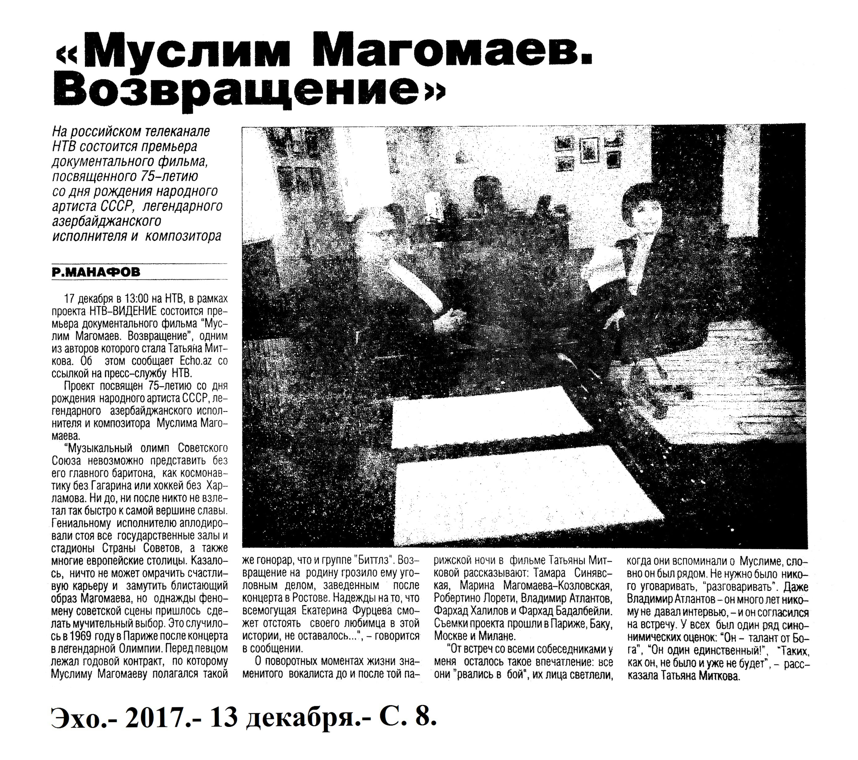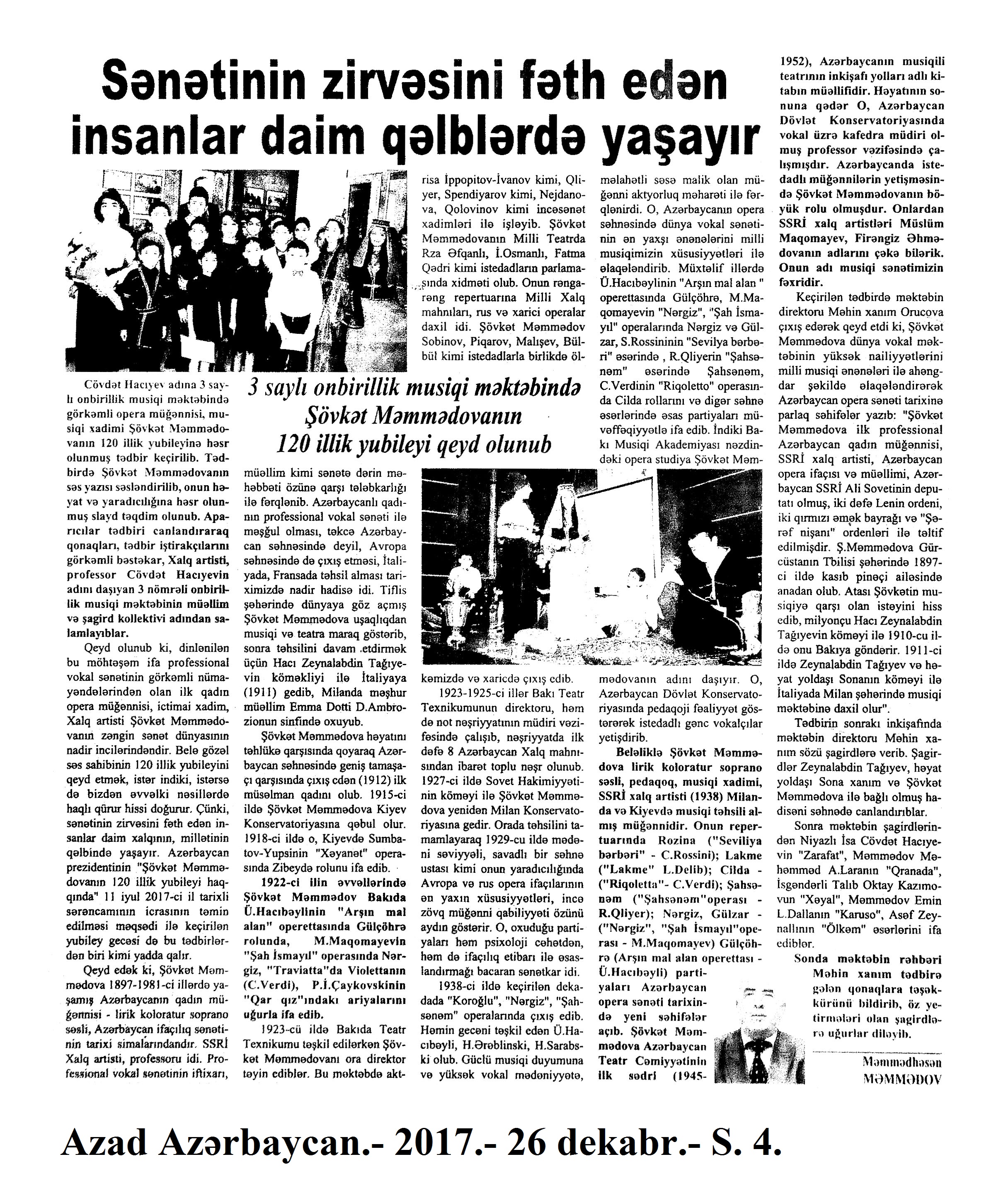 Müslüm Maqomayev – 75 421. Böyük sənətkarın xatirəsi yad olunub: [Musiqi Mədəniyyəti Dövlət Muzeyində] //Mədəniyyət.- 2017.- 8 dekabr.- S.8. 422. Daşkənddə M.Maqomayevin 75 illiyi ilə bağlı konsert keçirilib //Palitra.- 2017.- 7 dekabr.- S.16. 423. “Müslüm Maqomayev gənclərin ifasında”: [Müslüm Maqomayev adına 26 saylı 11 illik musiqi məktəbində SSRİ Xalq artistinin yubileyinə həsr edilmiş eyniadlı tədbirin keçirilməsi haqqında] //Mədəniyyət.- 2017.- 22 dekabr.- S.3. 424. Müslüm Maqomayev gənclərin ifasında: Müsabiqənin qalibləri mükafatlandırılıb: [Müslüm Maqomayev adına 26 saylı 11 illik musiqi məktəbində SSRİ Xalq artistinin 75 illiyinə həsr edilmiş eyniadlı tədbirin keçirilməsi haqqında] //Mədəniyyət.- 2017.- 29 dekabr.- S.5. 425. Rəhman, X. Daşkənddə Müslüm Maqomayevin 75 illiyi konsertlə qeyd olundu //525-ci qəzet.- 2017.- 7 dekabr.- S.7.
