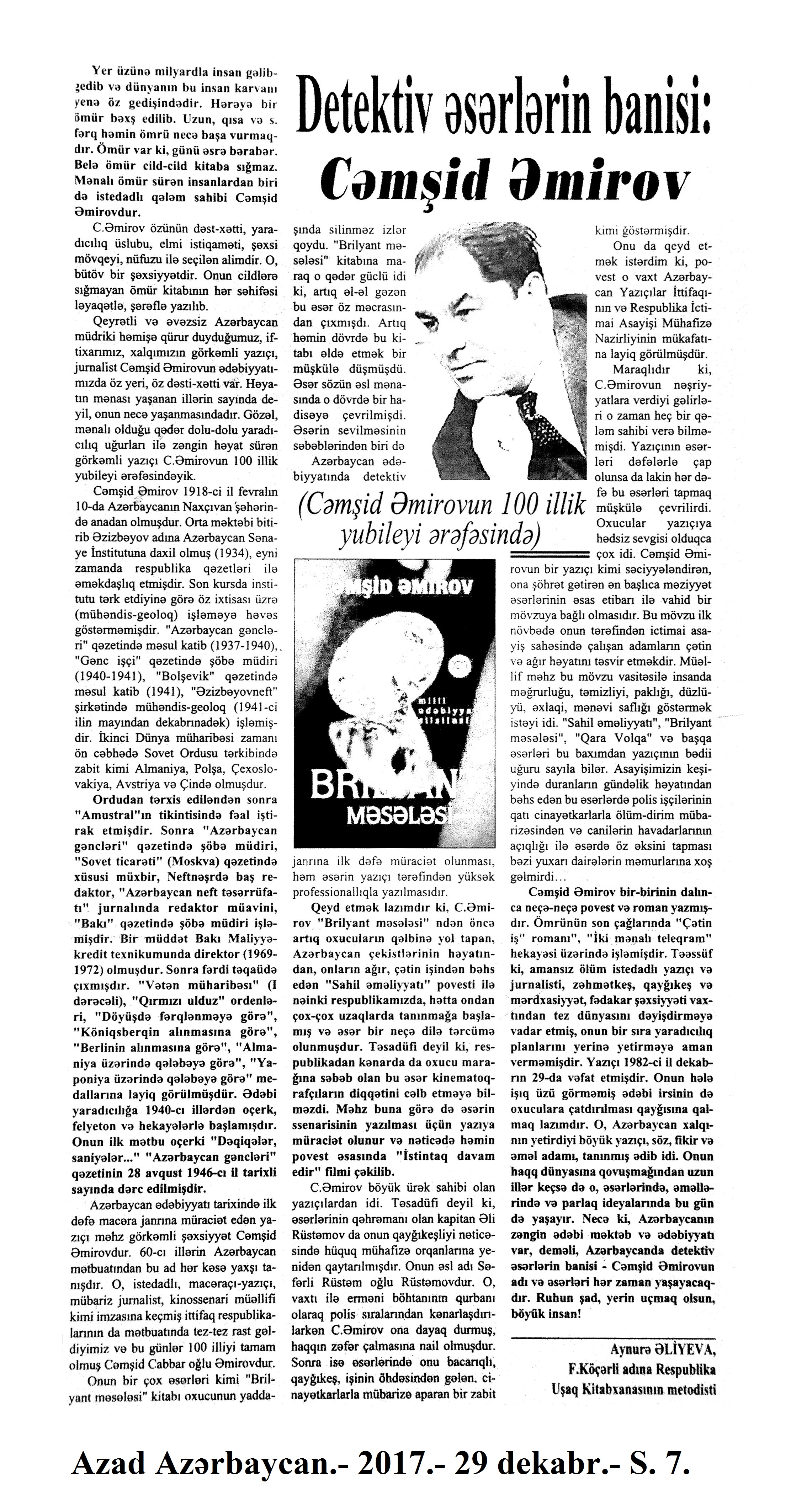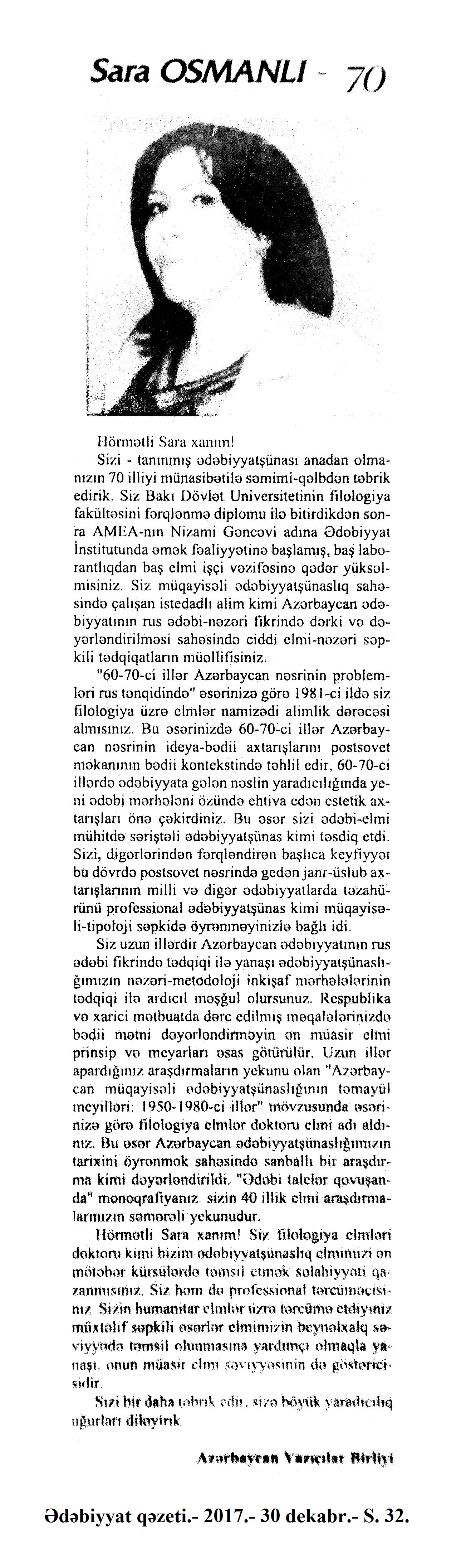 ƏDƏBİYYATŞÜNASLIQ VƏ ƏDƏBİ TƏNQİD 741. Abbaslı, T. “Balaca” xalqın Böyük Oğlu!: Ən dramatik dövrlərimizdən birinin (və hələ ki sonralarımızın) baş dramaturqu – Cəfər Cabbarlı... //Mədəniyyət.- 2017.- 29 dekabr. - S.13. 742. Abbaslı, T. Salamat yat, ŞAİRimiz, salamat...: Səni çox incitmiş bu dünyada buçağkı sayğı-sanın sarı arxayın ol, o dünyadan muğayat...: [Məmməd Arazın yaradıcılığı haqqında] //Mədəniyyət.-2017.- 1 dekabr.- S.15. 743. Abbaslı, T. Teodor Drayzer -: “Okeanın o tayı” da adlandırdığımız möcüzələr ölkəsinin ədəbi-bədii “Kolumb”u...: [Amerika ədəbiyyatçısı haqqında] //Mədəniyyət.- 2017.- 27 dekabr. - S.13. 744. Abdullayev, M. Mətbu sözün sehri: [Əməkdar mədəniyyət işçisi, yazıçı-publisist Afət Sadıqoğlu haqqında] //525-ci qəzet.- 2017.- 14 dekabr.- S.8. 745. Adil, N. Elçin Hüseynbəyli “Yenə iki od arasında” adlı yeni romanını təqdim etdi: Yunus Oğuz: “Müəllif bu romanda sanki Çəmənzəminlinin məhbəs həyatını yaşayıb, onunla bir yerdə Sibirdə olub”: [AYB-də] //Olaylar.- 2017. - 14 dekabr.- S.8. 746. Ağamusa, D. Üç il ayrılıq...: [Nurəngiz Günün xatirəsinə həsr olunur] //Ədəbiyyat qəzeti.- 2017.- 16 oktyabr.- S.23. 747. Albantürk, A. C. Qubalı ziyalılardan biri: [yazıçı, jurnalist, tərcüməçi Əhməd Həmid oğlu Xaspoladov haqqında] //Mədəniyyət.- 2017.- 22 dekabr.- S.12. 748. Alim. “Fəxr etməliyik ki, Yunus Oğuz kimi fədaimiz var”: Yunus Oğuzun “Atabəy Eldəniz” tarixi romanının təqdimatı keçirilib: [AYB-də] //Olaylar.- 2017. - 27 dekabr.- S.9. 749. Amin, S. Bu ömür ki var - əvvəli hanı?: [Kamal Abdullanın “Alın yazısı hədər yazılmır” şeiri haqqında] //Ədəbiyyat qəzeti.- 2017.- 9 dekabr.- S.11. 750. Amin, S. Sənət, siyasət, cəmiyyət: [siyasi hadisələrin bədii ədəbiyyatda əksi haqqında] //Ədəbiyyat qəzeti.- 2017.- 30 dekabr.- S.29. 751. Anar. Əlvida 17, salam 18!: “Səhər-səhər” rubrikası //525-ci qəzet.- 2017.- 30 dekabr.- S.11. 752. Aran, S. Oyanma və ya Səltənətin bir gündə üç dəfə bayılması //Ədalət.- 2017.- 9 dekabr.- S.12.; 525-ci qəzet.- 2017.- 9 dekabr.- S.16. 753. Azəri, L. “Qarabağ lətifələri” toplusu təqdim edildi: [F.Köçərli adına Respublika Uşaq Kitabxanasında] //Mədəniyyət.- 2017.- 8 dekabr.- S.5. 754. Azəri, L. Yaxşılıq deyilsə əgər vərdişin, söylə bu dünyada bəs nədir işin...: [Buzovna qəsəbəsindəki Ruhulla Axundov adına Mədəniyyət evində şair Hacı Mailin xatirəsinə həsr edilmiş tədbirin keçirilməsi haqqında] //Mədəniyyət.- 2017.- 15 dekabr.- S.13. 755. Azəri, L. “Yeddi gözəl” əsəri əsasında səs instalyasiyası: [Şirvanşahlar sarayında Nizami Gəncəvinin eyniadlı əsəri əsasında hazırlanan “Vertiqo” səs instalyasiyasının təqdimatı haqqında] //Mədəniyyət.- 2017.- 20 dekabr.- S.11. 756. Babanlı, V. Özümlə müsahibəm //Ədəbiyyat qəzeti.- 2017.- 16 dekabr.- S.12-13. 757. Bayramqızı, Ə. “Ozan” elm və sənət toplusu təqdim edilib: [Milli Kitabxanada keçirilən tədbir haqqında] //Xalq qəzeti.- 2017.- 27 dekabr.- S.6. 758. Bayramov, Q. Poetik fikrin təbiiliyi...: [şair Sahib Əliyev haqqında] //Ədalət.- 2017.- 14 dekabr.- S.4. 759. Bayramov, V. Şeirlərində də elə özü olan şair...: [Əli Nəcəfxanlının “Söz yerə düşməsin” adlı şeirlər kitabı haqqında] //Xalq qəzeti.- 2017.- 10 dekabr.- S.7. 760. Bayramov, V. Təbiət təravətli şair dünyası: [Hikmət Mahmudun “Seçilmiş əsərləri” haqqında] //Xalq qəzeti.- 2017.- 24 dekabr.- S.16. 761. Bərdəli, B. Nurəngiz Günün poemalarında müharibə və insan amili //525-ci qəzet.- 2017.- 20 dekabr.- S.7. 762. Cabiroğlu, M. Cabir Novruz: “Məni taparsınız şeirlərimdə”: [Cabir Novruzun oğlu ilə müsahibə] /müsahibəni apardı Sərvaz Hüseynoğlu //Ədəbiyyat qəzeti.- 2017.- 16 dekabr.- S.5. 763. Camalov, K. Pak və ülvi duyğuların tərənnümçüsü Süsən Kərimli: [şairin “Bir ömürlük xatirə” kitabı haqqında] //Ədalət.- 2017.- 15 dekabr.- S.6. 764. Cəfərov, N. “Azərbaycan-qazax ədəbi əlaqələri”: [Pərixanım Soltanqızının eyniadlı kitabı haqqında] //Azərbaycan müəllimi.- 2017.- 15 dekabr.- S.15. 765. Cavi, D. Kabinədə zəng gözləyən yazarlar //Ədəbiyyat qəzeti.- 2017.- 16 dekabr.- S.22. 766. Cavidan. Şeir yazmaq: [Kamal Abdullanın “Alın yazısı hədər yazılmır” şeiri haqqındda] //Ədəbiyyat qəzeti.- 2017.- 9 dekabr.- S.11. 767. Cəbrayıl, P. “Öz əsərini danışdır”: Pərviz Cəbrayıl-“Öləngi”: [yazıçı ilə müsahibə] /müsahibəni apardı Hədiyyə Şəfaqət //Ədəbiyyat qəzeti.- 2017.- 9 dekabr.- S.18-19. 768. Cəbrayıloğlu, E. Onun adı Rey: Kəşfiyyatçının ilk kitabında toplanan maraqlı xatirələri //Ədalət. -2017.- 2 dekabr.- S.10. 769. Cəfərov, N. İslam Sadığın yaradıcılığı və folklor //Ədalət.- 2017.- 21 dekabr.- S.6. 770. Cəfərov, N. Tarix yalnız arxada qalmır, həm də öndən gəlir...: Yunis Oğuzun “Ovçu” romanı haqqında //525-ci qəzet.-2017.- 12 dekabr.- S.7. 771. Elvüsal, H. Kəlbəcərə gedən qatar: [şair-publisist, tərcüməçi, filologiya üzrə fəlsəfə doktoru Adil Cəmilin yaradıcılığı haqqında] //Ədalət.- 2017.- 29 dekabr.- S.6. 772. Elsevər, İ. “Şumer dövrünün adamı”: Yaxud şifahi xalq ədəbiyyatı ənənələrimiz İslam Sadıq yaradıcılığında //525-ci qəzet.- 2017.- 22 dekabr.- S.4. 773. Eminov, A. Bir həftənin payız ritmləri: (Vahid Əzizin şeirləri haqqında) //Ədalət.- 2017.- 28 dekabr.- S.6. 774. Eminov, A. Əliağa Kürçaylının “Daşlar”ı: [şairin silsilə şeir yaradıcılığı haqqında] //Ədəbiyyat qəzeti.- 2017.- 2 dekabr.- S.29. 775. Eminov, M. İmir Məmmədlinin 60 yaşı...: ...Azərbaycan 