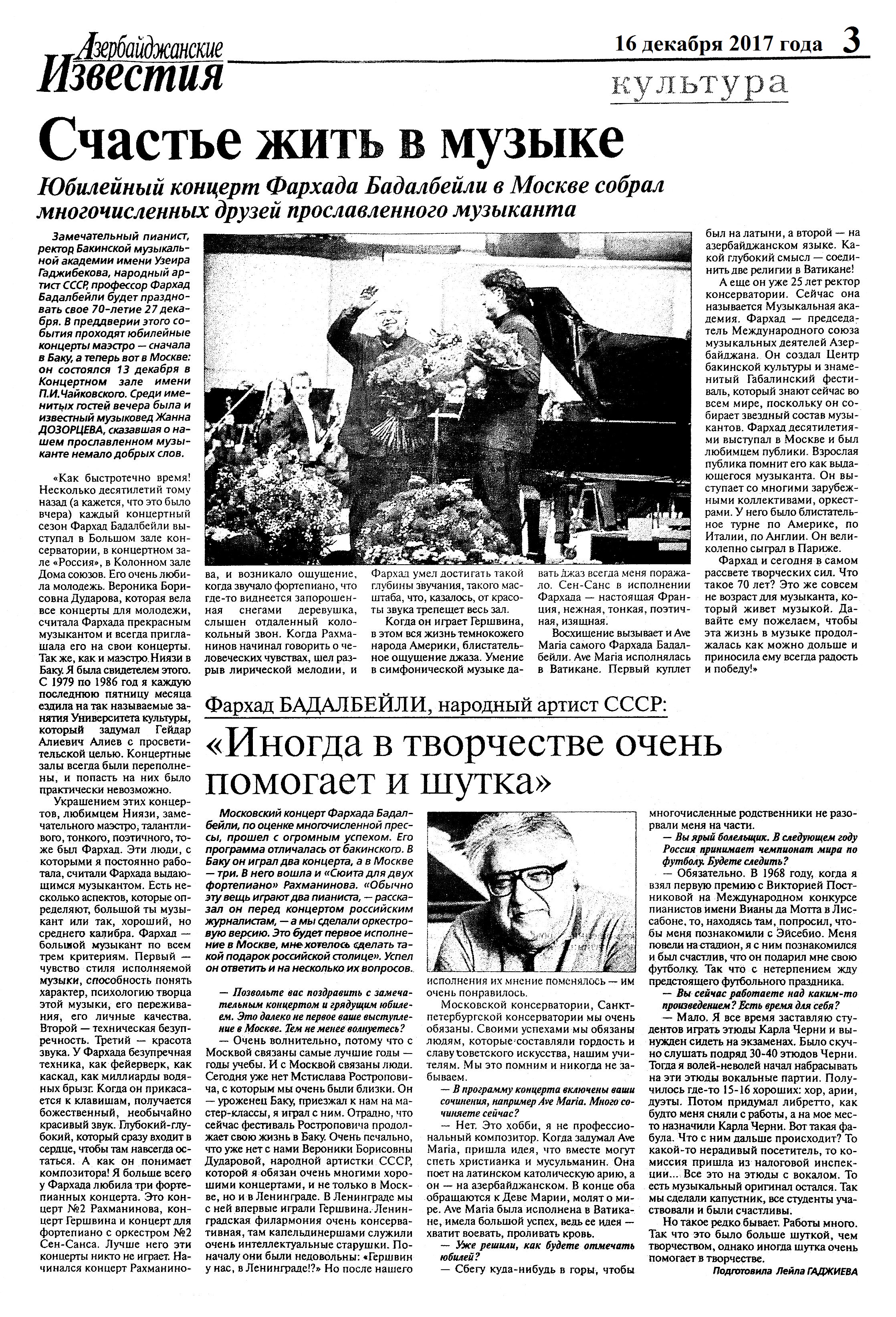 Фархад Бадалбейли – 70 1234. Асадова, И. Ильхам Алиев вручил Фархаду Бадалбейли орден «Истиглал» //Эхо.- 2017.- 27 декабря.- С. 8. 1235. Бадалбейли, Ф. Фархад Бадалбейли, народный артист СССР: «Иногда в творчестве очень помогает и шутка»: [беседа с музыкантом] //Азербайджанские известия.- 2017.- 16 декабря.- С.3. 1236. Президент Ильхам Алиев вручил народному артисту Фархаду Бадалбейли орден «Истиглал» //Бакинский рабочий.- 2017.- 26 декабря.- С. 4. 1237. Счастье жить в музыке: Юбилейный концерт Фархада Бадалбейли в Москве собрал многочисленных друзей прославленного музыканта //Азербайджанские известия.- 2017.- 16 декабря.- С.3.