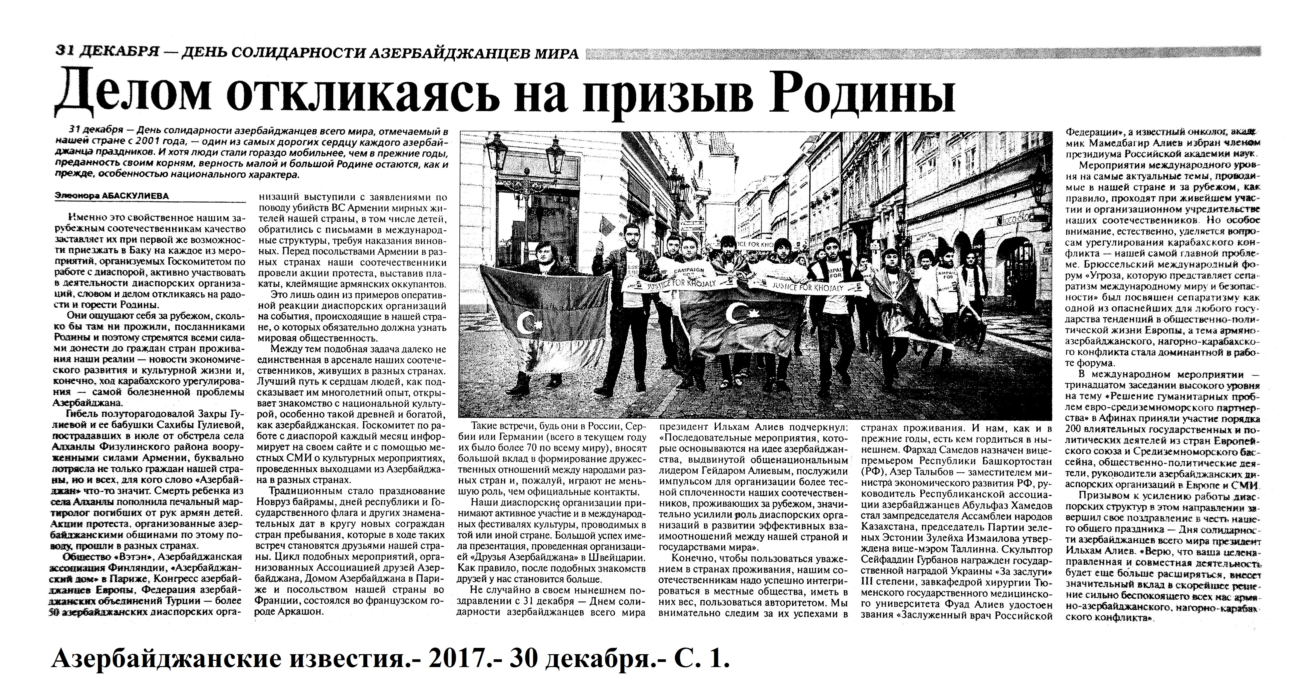 День солидарности азербайджанцев мира 1111. Абаскулиева, Э. Делом откликаясь на призыв Родины //Азербайджанские известия.- 2017.- 30 декабря.- С. 1. 1112. В Бакинском госуниверситете отметили День солидарности азербайджанцев мира //Бакинский рабочий. - 2017.- 29 декабря.- С. 7. 1113. В Киеве отметили День солидарности азербайджанцев мира //Бакинский рабочий. - 2017.- 28 декабря.- С. 3. 1114. «День поэзии» в Габале собрал любителей стихов //Бакинский рабочий. - 2017.- 19 декабря.- С. 5.