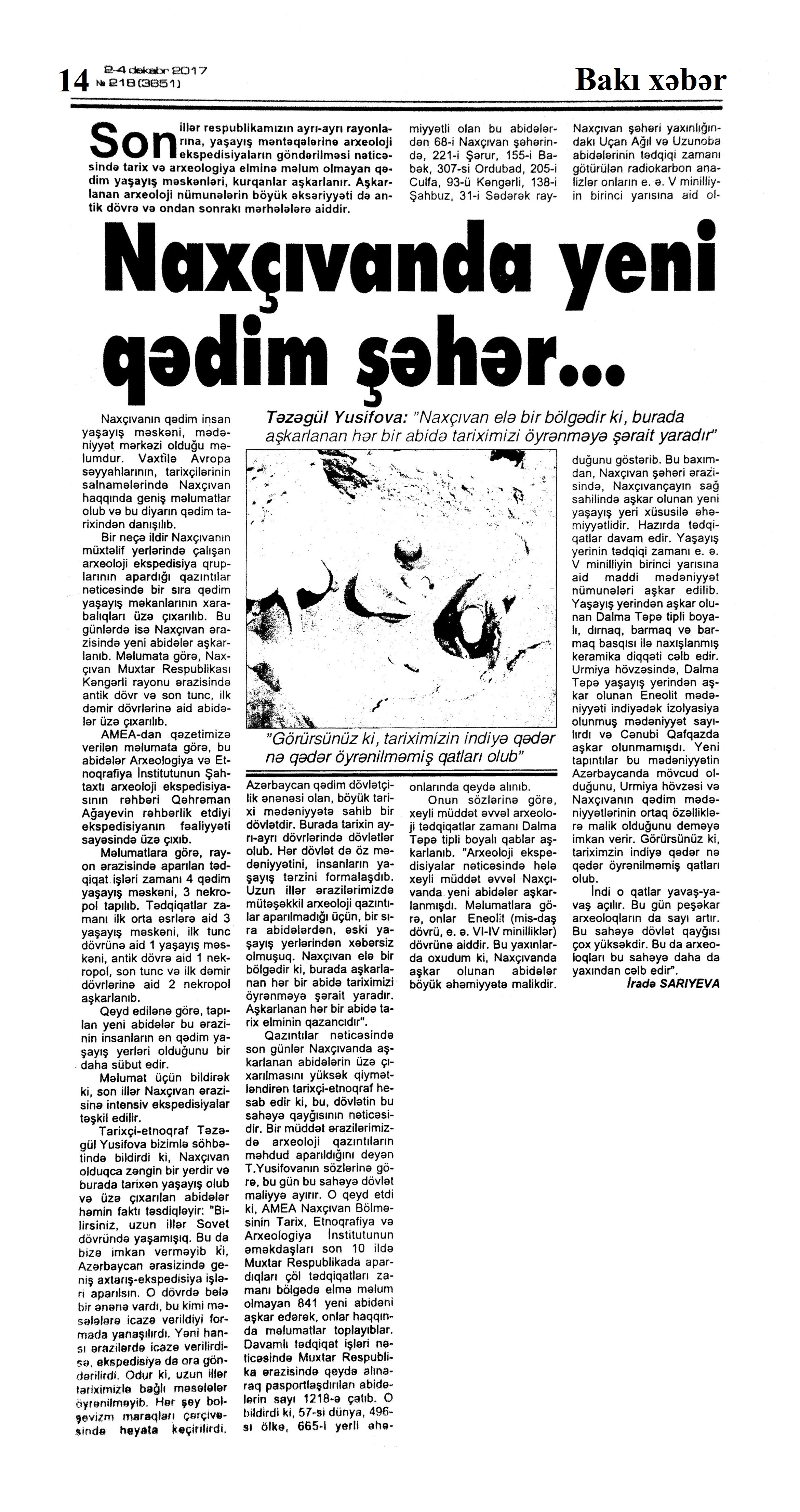 TARİX VƏ MƏDƏNİYYƏT ABİDƏLƏRİ 224. Azəri, L. Tarixi-mədəni irsi yaşadan məkanların yubileyləri: [“Qobustan” Milli Tarixi-Bədii Qoruğunun yaradılmasının 50, Xalça Muzeyinin 50, “Yuxarı Baş” qoruğunun 50 və Muzey Sərvətləri və Xatirə Əşyalarının Elmi-Bərpa Mərkəzinin 60 illiyinə həsr olunan tədbirlər haqqında] //Mədəniyyət.- 2017.- 29 dekabr.- S.5. 225. Dövlət başçısından ciddi tapşırıq: “Yanardağ” Qoruğunda qısa müddət ərzində yüksək standartlara cavab verən şərait yaradılsın: [Prezident İlham Əliyev “Yanardağ” Dövlət Tarix-Mədəniyyət və Təbiət Qoruğunda olub] //Azərbaycan.- 2017.-30 dekabr.- S.1. 226. Mədətoğlu, Ə. Əsir Abidələr: [Azıx mağarası haqqında] //Ədalət.- 2017.- 12 dekabr.- S.7. 227. Mədətoğlu, Ə. Əsir Abidələr: [Azıx mağarası haqqında: ] //Ədalət.- 2017.- 13 dekabr.- S.7. 228. Mədətoğlu, Ə. Tarixin şahidi qalalar: [Azərbaycan ərazisində] //Ədalət.- 2017.- 15 dekabr.- S.7. 229. Mədətoğlu, Ə. Tarixin şahidi qalalar: [Qalalar haqqında] //Ədalət.- 2017.- 14 dekabr.- S.3. 230. Sarıyeva, İ. Naxçıvanda yeni qədim şəhər //Bakı Xəbər.- 2017.- 2 dekabr.- S.14. 231. Zəngin tarixi-mədəni irsi yaşadan məkanın yubileyi: Şəkidə “Yuxarı Baş” Dövlət Tarix-Memarlıq Qoruğunun 50 illiyi qeyd olunub // Mədəniyyət.- 2017.- 27 dekabr.- S.4.