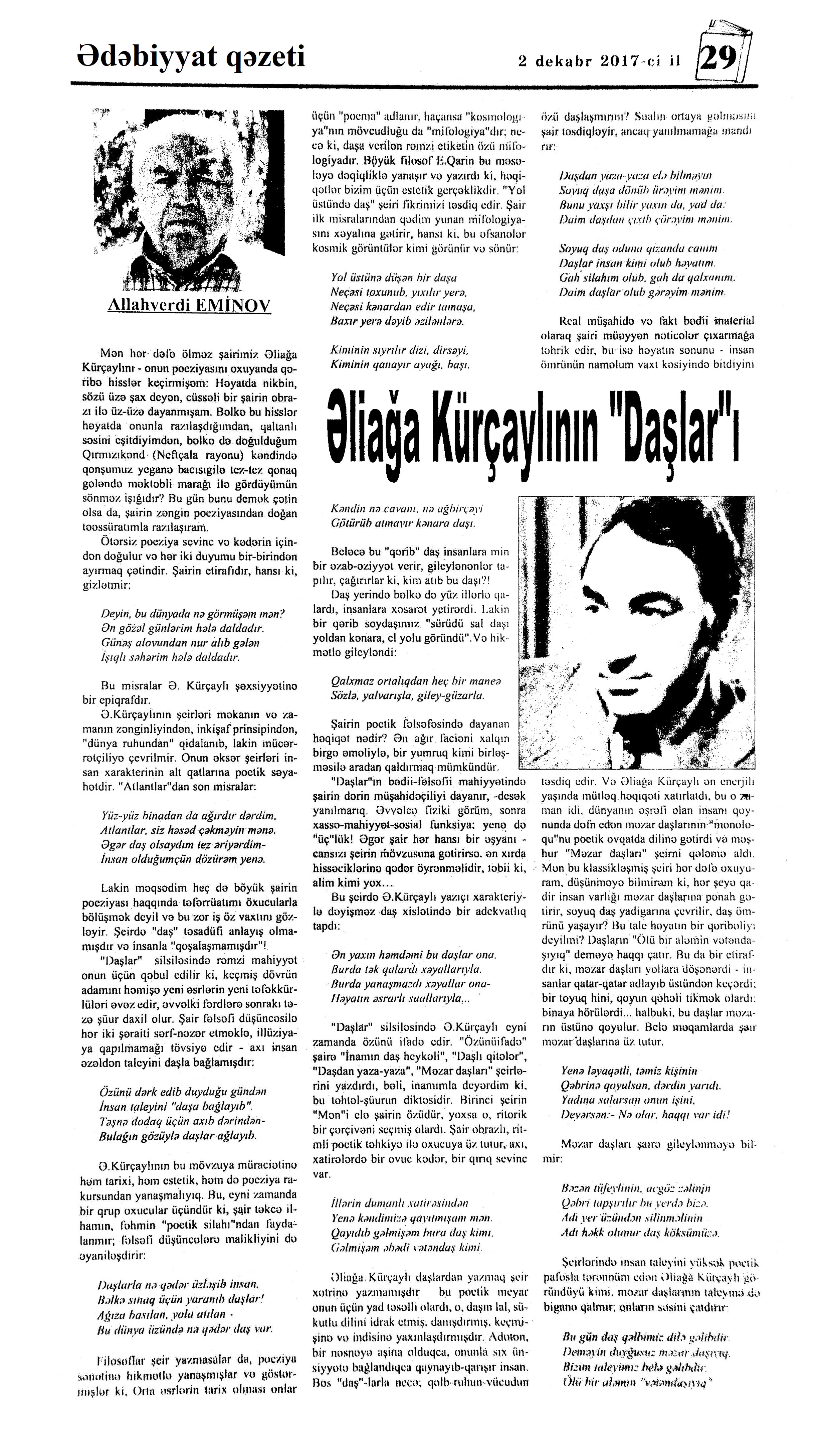 616. Ələkbərli, M. İlahi; Bir qatar yol gedir; Qaranquşla söhbət; Bu körpə Zəhranın qanı; Qovuşa bilmədim o məhəbbətə və s. //Ədəbiyyat qəzeti.- 2017.- 16 dekabr.- S.29. 617. Əlihüseyn, V. Həyatımın qadını; Səndən öncə darıxdığım bir qadın var; Mən də elə darıxıram //Kaspi.- 2017.- 16-18 dekabr.- S.18. 618. Əlioğlu, Ç. Səni düşünürəm; Vida şeiri; Yaxşı adamlar (“Yaxşılıq” şeirinin müəllifi Söhrab Tahirə); Narlı gecə: “Toğrul Nərimanbəyovun emalatxanasında”n və s. //Ədalət.-2017.- 2 dekabr.- S.14. 619. Əlioğlu, Ə. Mənimlə gedir; Puçurlar; Sərçələr; Buynuzu çıxıb; Tumurcuqlar və s. //Ədəbiyyat qəzeti.- 2017.- 30 dekabr.- S.25. 620. Əsəd, A. Ölkəm əmin əllərdədir //Ədalət.- 2017.- 23 dekabr.- S.9. 621. Əzimli, Ə. Söz; Şahid; Payız küləyi; Xatirə və s. //525-ci qəzet.- 2017.- 13 dekabr.- S.7. 622. Əziz, M. Mənim; Tikanlar; Keçdiyim yolları salamlayıram //Kaspi.- 2017.- 16-18 dekabr.- S.23. 623. Əziz, M. Sevinə-sevinə öləcəyəm mən; Özümə məktub; Ağlama və s. //Ədalət.- 2017.- 9-11 dekabr.- S.22. 624. Əziz, V. Daha ikimiz də cəhənnəmliyik...; Payız şabaş yağdırır...; Getmisən... və s. //Ədəbiyyat qəzeti.- 2017.-9 dekabr.- S.7. 625. Həsənli, İ. Mən niyə şair ola bilmədim... //525-ci qəzet.- 2017.- 30 dekabr.- S.23. 626. Hikmət, N. İnsan mənzərələri: Pirayə xanıma: [türk ədəbiyyatı] /tərc.etdi Dilsuz //Ədəbiyyat qəzeti.- 2017.- 2 dekabr.- S.16-17. 627. Hikmət, N. İnsan mənzərələri: Pirayə xanıma: [türk ədəbiyyatı] /tərc.etdi Dilsuz //Ədəbiyyat qəzeti.- 2017.- 9 dekabr.- S.16-17. 628. Horovlu, Ş. Payız donunda; Hardan biləsən ki...; İki damla yaş; Yol; Bacarmadım; //Ədəbiyyat qəzeti.- 2017.- 9 dekabr.- S.24. 629. Hüseynoğlu, S. Sən adlı zamandayam mən; Qaçqın; Biz iki davakar uşaq kimiyik...; Nədən qorxuramsa və s. //Ədəbiyyat qəzeti.- 2017.- 9 dekabr.- S.26. 630. Hüseynov, Q. Əli Fəhminin vəfatına: Ağa Cavadın vəfatına //Kredo.- 2017.- 15 dekabr.- S.2. 631. Xanbabazadə, M. Şairlərə daş atmayın; Xəlil Rza Ulutürklə görüş //Ədalət.- 2017.- 30 dekabr.- S.16. 632. İbrahimli, G. Dostla söhbət; Səni gözləyirəm; Məni ayrılıqla qorxudan adam...; Sən də get; Bir ev təkliyim var bu gecə... //Ədəbiyyat qəzeti.- 2017.- 2 dekabr.- S.11.