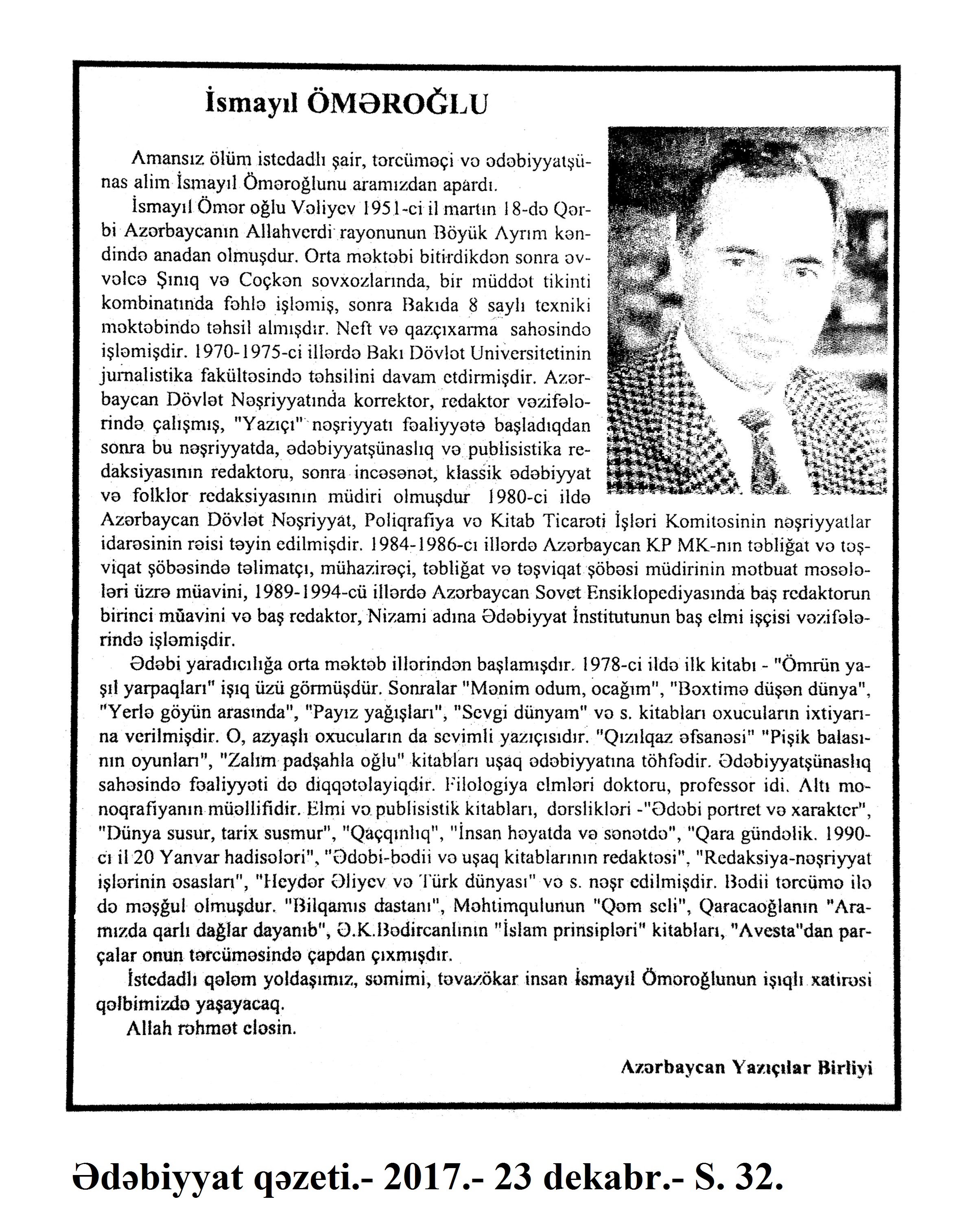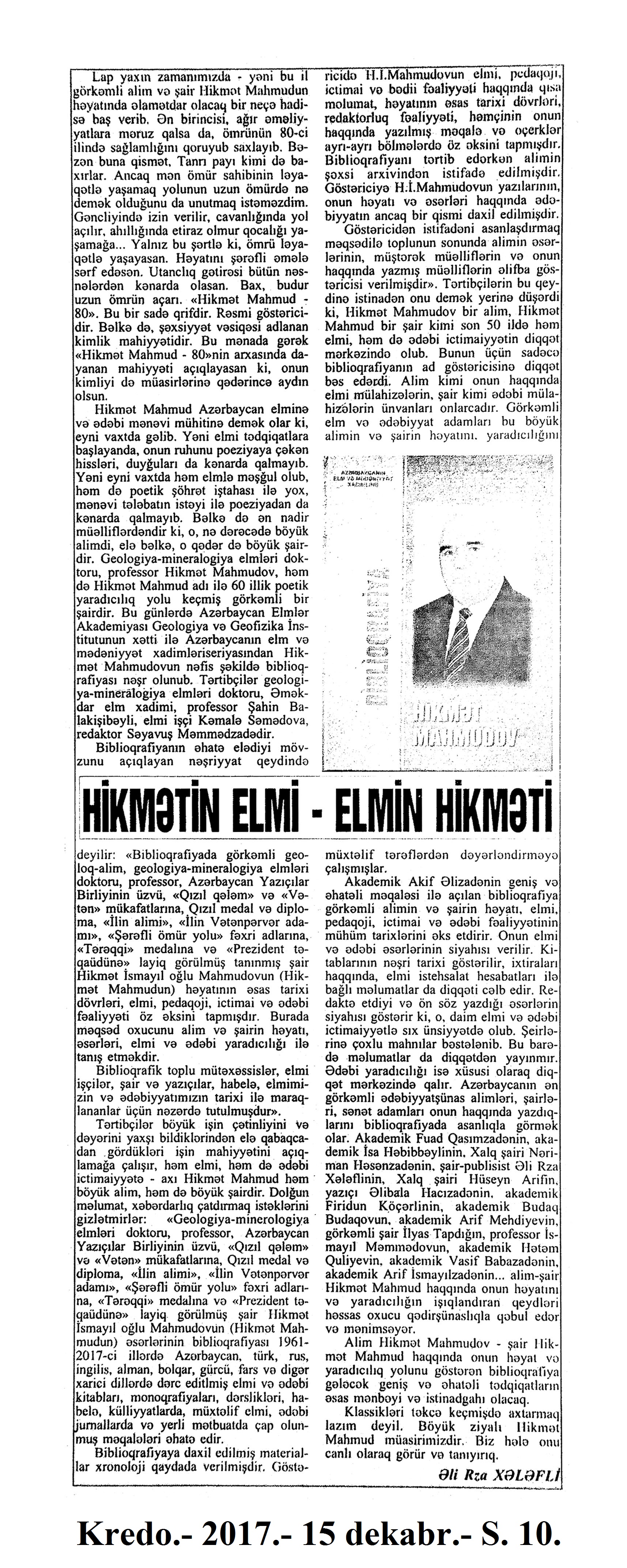 Ədəbi əlaqələr 1060. Ariadna, E. Efron Ariadnanın anası Marina Svetayeva haqqında xatirələri: [rus ədəbiyyatı] /tərc.etdi Xanım Aydın //Ədəbiyyat qəzeti.- 2017.- 23 dekabr.- S.31. 1061. Cemal, S. Cemal Süreyanın həyat yoldaşı Zühal Tekkanata yazdığı məktublar: [türk ədəbiyyatı] /tərc.etdi Xatirə Nurgül //Ədəbiyyat qəzeti.- 2017.- 16 dekabr.- S.28. 1062. Əlioğlu, Ç. Çingiz Aytmatov: Əsər günah yuyan etiraf kimi yazılmalıdır: Çingiz Əlioğlu ilə Çingiz Aytmatov barədə söhbət /söhbəti apardı Azər Turan //Ədəbiyyat qəzeti.- 2017.- 16 dekabr.- S.6-7. 1063. Fərəcov, S. “Şeirlərimi təmizqəlbli millətim üçün söyləyirəm...”: [Rusiya Federasiyasının Başqırdıstan Respublikasında anadan olmuş şair, jurnalist Babiç Şeyxzadə haqqında] //Mədəniyyət.- 2017.- 15 dekabr.- S.15. 1064. Gündoğdu, C. Şairlərin şöhrəti öləndən sonra başlayır: Cenk Gündoğdu: “Çılpaq həqiqətlərə ironiyalar geyindirməyə məhkumuq”: [Türk yazarı ilə müsahibə] /müsahibəni apardı Fərid Hüseyn //Ədalət.- 2017.- 9-11 dekabr.- S.12. 1065. Hacı K. Vicdan yolunda müəmmalı qəza və ya Alber Kamyunun “Çöküş”ü: [fransız yazıçının həyat və yaradıcılığı haqqında] //Ədəbiyyat qəzeti.- 2017.- 2 dekabr.- S.31. 1066. Hamid, M. Mohsin Hamid və “Qərbə çıxış” romanı: [pakistanlı yazıçı Mohsin Hamidin söhbəti] /Meqan Labrisin qələmə aldığı söhbəti ingilis dilindən tərc.etdi Baycan //Kaspi.- 2017.- 16-18 dekabr.- S.11. 1067. Hüseynzadə, X. Knut Hamsunun torpaq sevgisi: [Norveç yazıçısının yaradıcılğı haqqında] //Ədəbiyyat qəzeti.- 2017.- 23 dekabr.- S.27. 1068. Hüseynzadə, X. “Səni qurtum-qurtum deyil, damla-damla içəcəyəm”: [türk yazarı Gültən Akının həyat və yaradıcılığı haqqında] //Ədəbiyyat qəzeti.- 2017.- 2 dekabr.- S.30. 1069. Görgülü, M. “Öz əsərini danışdır”: Mehmet Ümit Görgülü – “Cibimizdəki cinnət”: [türk yazarla eyniadlı əsəri haqqında müsahibə] /müsahibəni apardı Hədiyyə Şəfaqət //Ədəbiyyat qəzeti.- 2017.- 2 dekabr.- S.12-13. 1070. İmran, G. Rolan Bart – Müəllifi öldürən adam: [fransız yazarın yaradıcılığı haqqında] //Ədəbiyyat qəzeti.- 2017.- 16 dekabr.- S.30. 1071. Qaliboğlu, S. “Türk dillərinin qədim leksikası”: [Baba Məhərrəmlinin eyniadlı monoqrafiyası haqqında] //Mədəniyyət.- 2017.- 8 dekabr.- S.13. 1072. Qismət, A. Marsel Prust anasından savayı heç bir qadını sevmədi: [fransız yazıçının həyat və yaradıcılığı haqqında] //Ədəbiyyat qəzeti. - 2017.- 2 dekabr.- S.27. 1073. Qismət, A. Sirli Abe: [yaponiyalı yazar, dramaturq, ssenarist Kobo Abe haqqında] //Ədəbiyyat qəzeti.- 2017.- 30 dekabr.- S.31. 1074. Pərvin. Azərbaycan alimləri Bursada Çingiz Aytmatova həsr olunmuş konfransda //525-ci qəzet. - 2017.- 1 dekabr.- S.5. 1075. Paçxataşvili, G. Gözləri qəlbinə köçmüş şair...: [Eldar Həsrətin yaradıcılığı haqqında] //Kaspi.- 2017.- 16-18 dekabr.- S.22.; Şərq.- 2017. -6 dekabr.- S.12. 1076. “Respublika Xatirə Kitabı”nın şəhid Aydın Abdullayev haqqında povesti çapdan çıxdı: Kitabın müəllifi “Bakı-Xəbər”in əməkdaşı İradə Sarıyevadır //Bakı Xəbər. - 2017.- 7 dekabr.- S.4. 1077. Smit, Z. Zedi Smit yazıçı uğursuzluğu haqqında: Mənbə: Zedi Smit. “Fail better” essay for Guardian, Yanuary 13, 2017.: [Böyük Britaniya ədəbiyyatı] /ingilis dilindən tərc.etdi Günay Rzalı //Ədəbiyyat qəzeti.- 2017.- 2 dekabr.- S.14-15. 1078. Smit, Z. Zedi Smit yazıçı uğursuzluğu haqqında: Mənbə: Zedi Smit. “Fail better” essay for Guardian, Yanuary 13, 2017.: [Böyük Britaniya ədəbiyyatı] /ingilis dilindən tərc.etdi Günay Rzalı //Ədəbiyyat qəzeti.- 2017.-9 dekabr.- S.10. 1079. Sonuncu Nobel mükafatçısının romanı Azərbaycan dilində: [yapon əsilli Britaniya yazıçısı Kazuo İşiquronun “O günlərdən qalanlar” kitabı] //Mədəniyyət.- 2017.- 6 dekabr.- S.10. 1080. Şnakenberq, R. Böyük yazarların sirli həyatı: Artur Konan Doyl: [Böyük Britaniya ədəbiyyatı] /tərc.etdi Qiyas Əyyub //Ədəbiyyat qəzeti.- 2017.- 30 dekabr.- S.30-31.