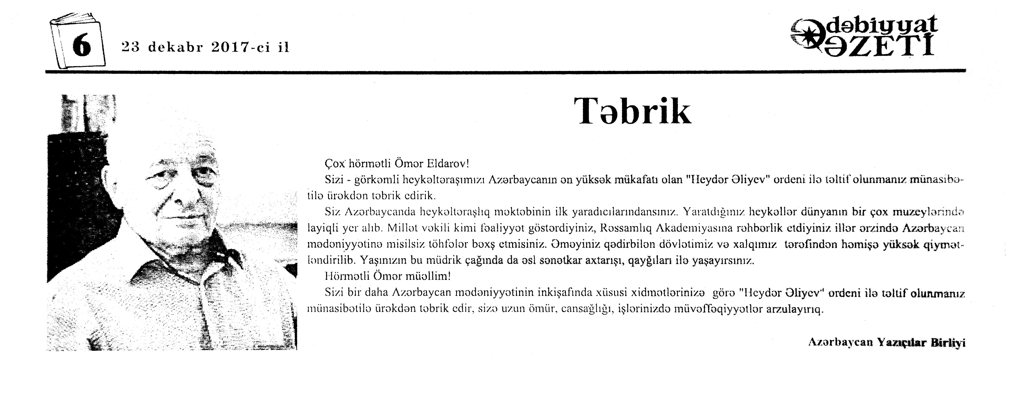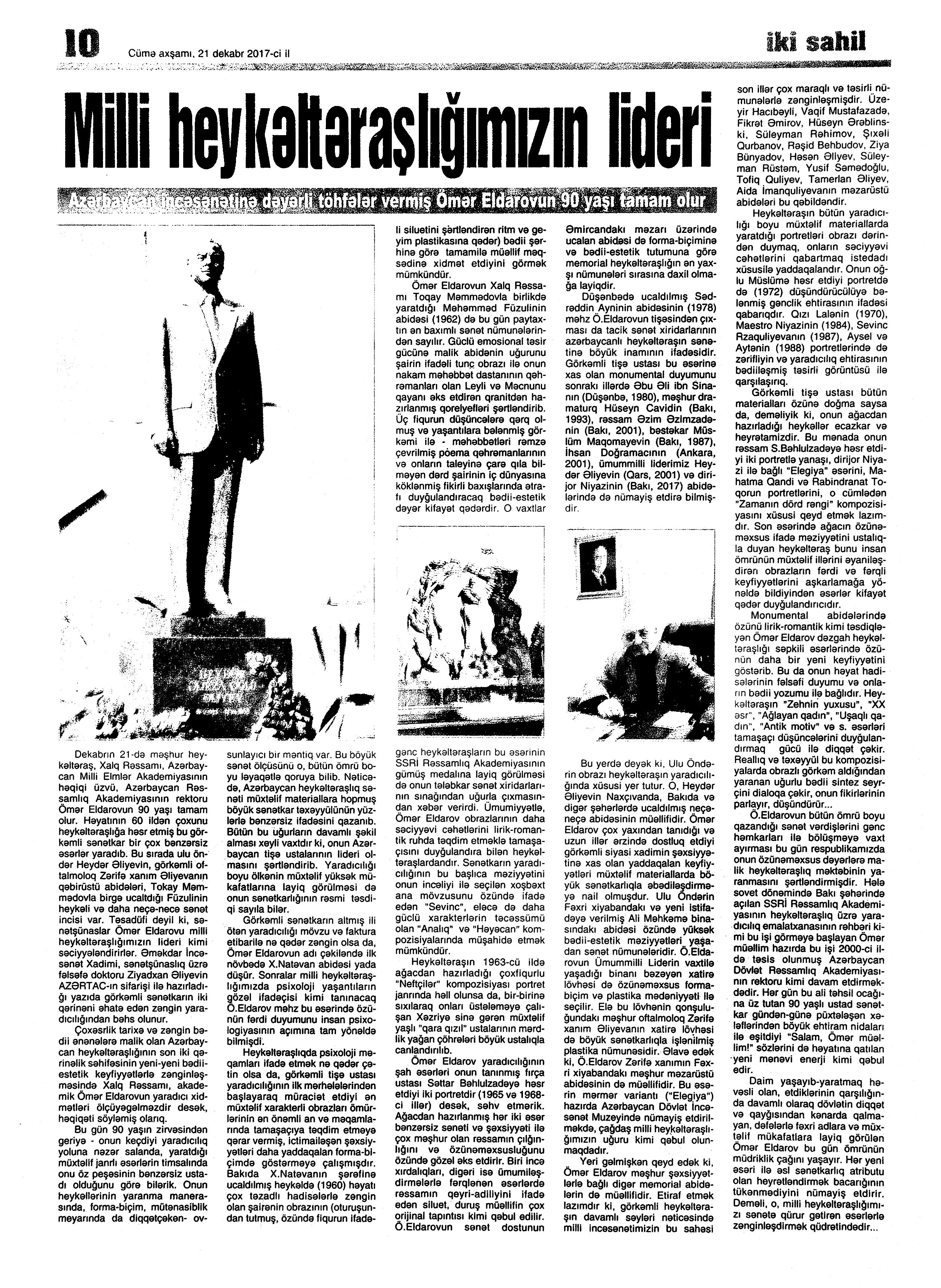 Bax: 132; 136; 143; 158 Ömər Eldarov – 90 269. Anar. Heykəlin şeiriyyəti:: “Səhər-səhər” rubrikası: [Xalq rəssamı, görkəmli heykəltəraş Ömər Eldarov haqqında] //525-ci qəzet.- 2017.- 16 dekabr.- S.11;13. 270. Eyvazlı, G. Pandora-gözəl pislik: [Xalq rəssamı Ömər Eldarov haqqında] //Ədəbiyyat qəzeti.- 2017.- 23 dekabr.- S.6. 271. Əliyev, Z. Milli heykəltəraşlığımızın lideri: O, bu böyük sənət ölçüsünü bütün ömrü boyu ləyaqətlə qoruyub: [heykəltəraşın yaradıcılığı haqqında] //Kaspi.- 2017.- 21 dekabr.- S.15. 272. Əliyev, Z. Səttar Bəhlulzadə dühasının parlaq plastik ifadəsi: Bir əsərin tarixçəsi: [heykəltəraşın yaradıcılığı haqqında] //Mədəniyyət.- 2017.-15 dekabr.- S.12. 273. Heydər Əliyev Mərkəzində Xalq Rəssamı Ömər Eldarovun fərdi sərgisi açılıb: [Heydər Əliyev Fondunun vitse-prezidenti Leyla Əliyeva sərginin açılışında iştirak edib] //Azərbaycan.- 2017.-22 dekabr.- S.9.; İki sahil.- 2017.- 22dekabr.- S.10. 274. “Heydər Əliyev” ordenli Ömər Eldarov: [Prezident İlham Əliyev Xalq rəssamına “Heydər Əliyev” ordenini təqdim edib] //Azərbaycan.- 2017.-21 dekabr.- S.1. 275. Həbibbəyli, İ. Düşünən və yaşayan heykəltəraşlıq: [Xalq rəssamı haqqında] //Azərbaycan.- 2017.-21 dekabr.- S.1; 7. 276. Hüseynov, R. Atı qanadlı atlı: [Xalq rəssamı Ömər Eldarovun yaradıcılığı haqqında] //525-ci qəzet.- 2017.- 23 dekabr.- S.18;20. 277. Xalq rəssamı Ömər Eldarov “Heydər Əliyev” ordeni ilə təltif edilib //Mədəniyyət.- 2017.-22 dekabr.- S.2. 278. Milli heykəltəraşlığımızın lideri: [Xalq rəssamı haqqında] //İki sahil.- 2017.- 21dekabr.- S.10. 279. Müşfiq, Ş. Akademik Ömər Eldarovun 90 illiyi qeyd olundu: [AMEA-nın Alimlər evinin təşkilatçılığı ilə keçirilən tədbir haqqında] //525-ci qəzet.-2017.- 23 dekabr.- S.32. 280. Müşfiq, Ş. Heydər Əliyev Mərkəzində Ömər Eldarovun sərgisi açıldı //525-ci qəzet.- 2017.- 23 dekabr.- S.32. 281. Təbrik: [Xalq rəssamının yubileyi münasibətilə AYB-nin təbriki] //Ədəbiyyat qəzeti.- 2017.- 23 dekabr.- S.6. 282. Zeynalov, A. Heykəltəraşlığımızın canlı klassiki: Akademik Ömər Eldarov – 90 //Xalq qəzeti.- 2017.- 20 dekabr.- S.8.