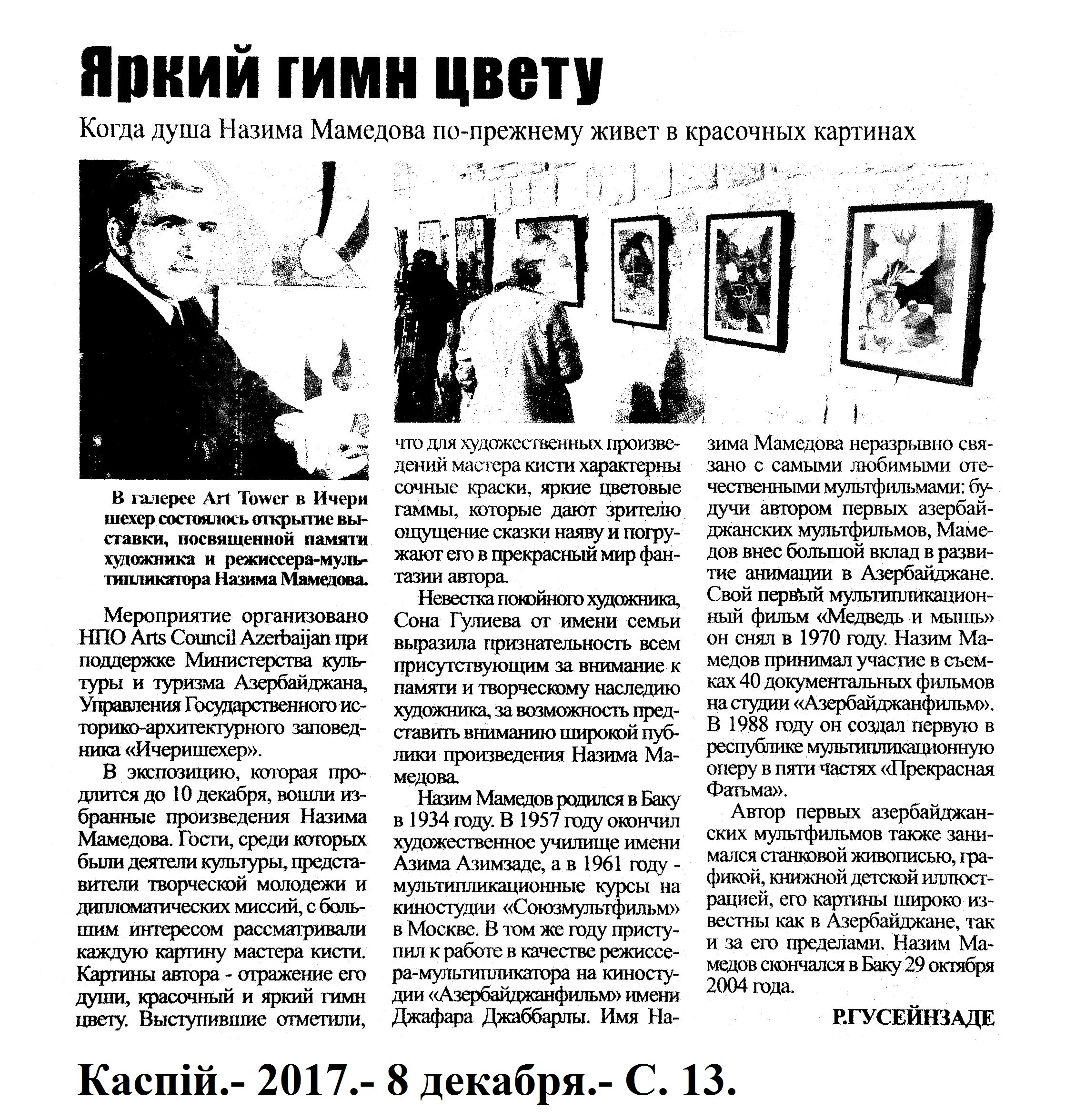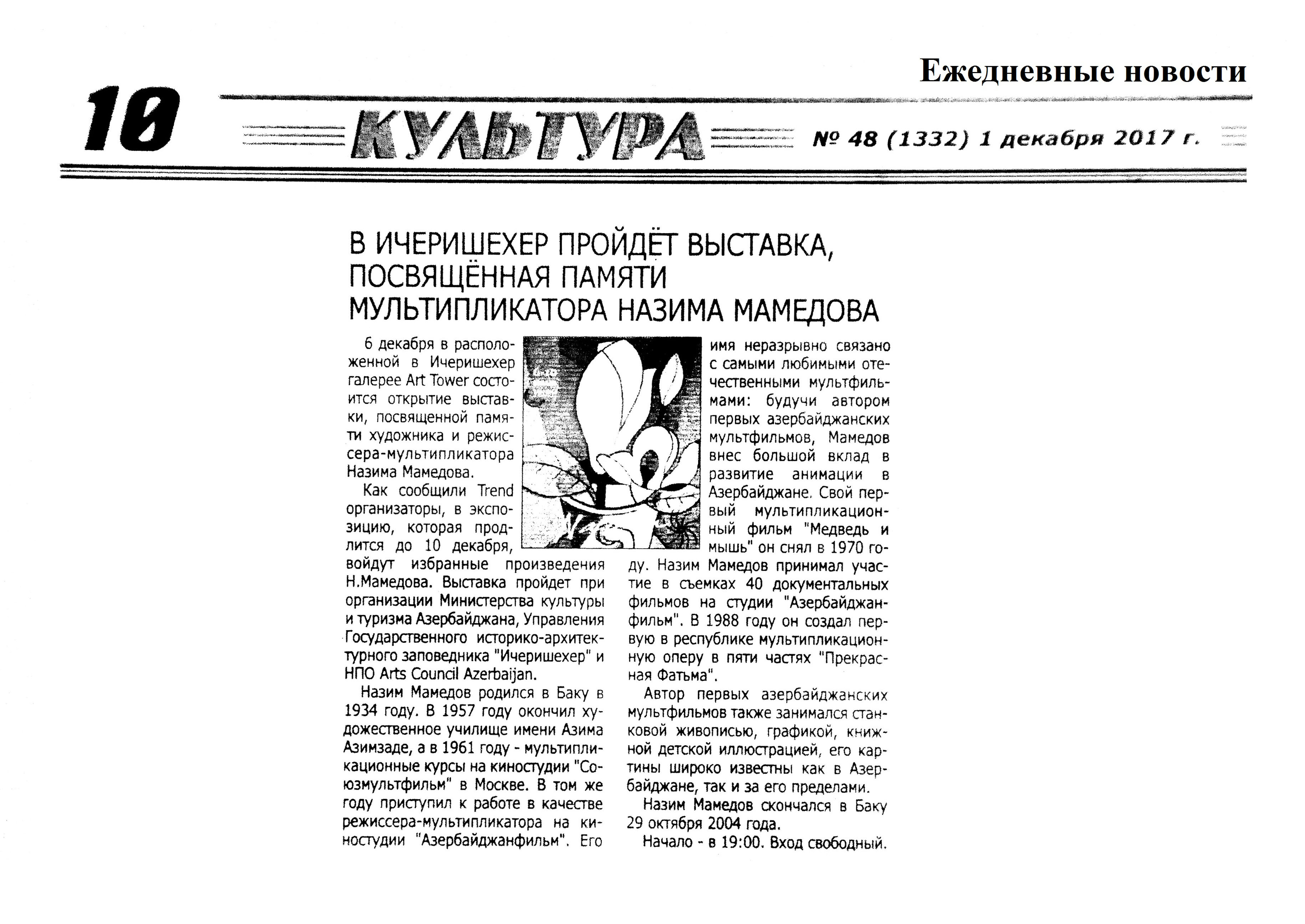 ГРАФИКА 1192. Асадова, И. Лучше один раз увидеть, чем сто раз услышать»: В Баку проходит выставка социальных комиксов: [художника Зохраба Салам-заде в галерее Art Tower] //Эхо.- 2017.- 29 декабря.- С. 8. 1193. В Ичеришехер пройдет выставка, посвященная памяти мультипликатора Назима Мамедова //Ежедневные новости.- 2017.- 1 декабря.- С. 10. 1194. В Музейном Центре откроется персональная выставка Бахрама Багирзаде Art In Boxes: [представлены карикатуры заслуженного артиста] //Бакинский рабочий.- 2017.- 16 декабря.- С. 10. 1195. Гусейнзаде, Р. Яркий гимн цвету: Когда душа Назима Мамедова по-прежнему живет в красочных картинах: [о творчестве художника] //Каспiй.- 2017.- 8 декабря.- С.13.