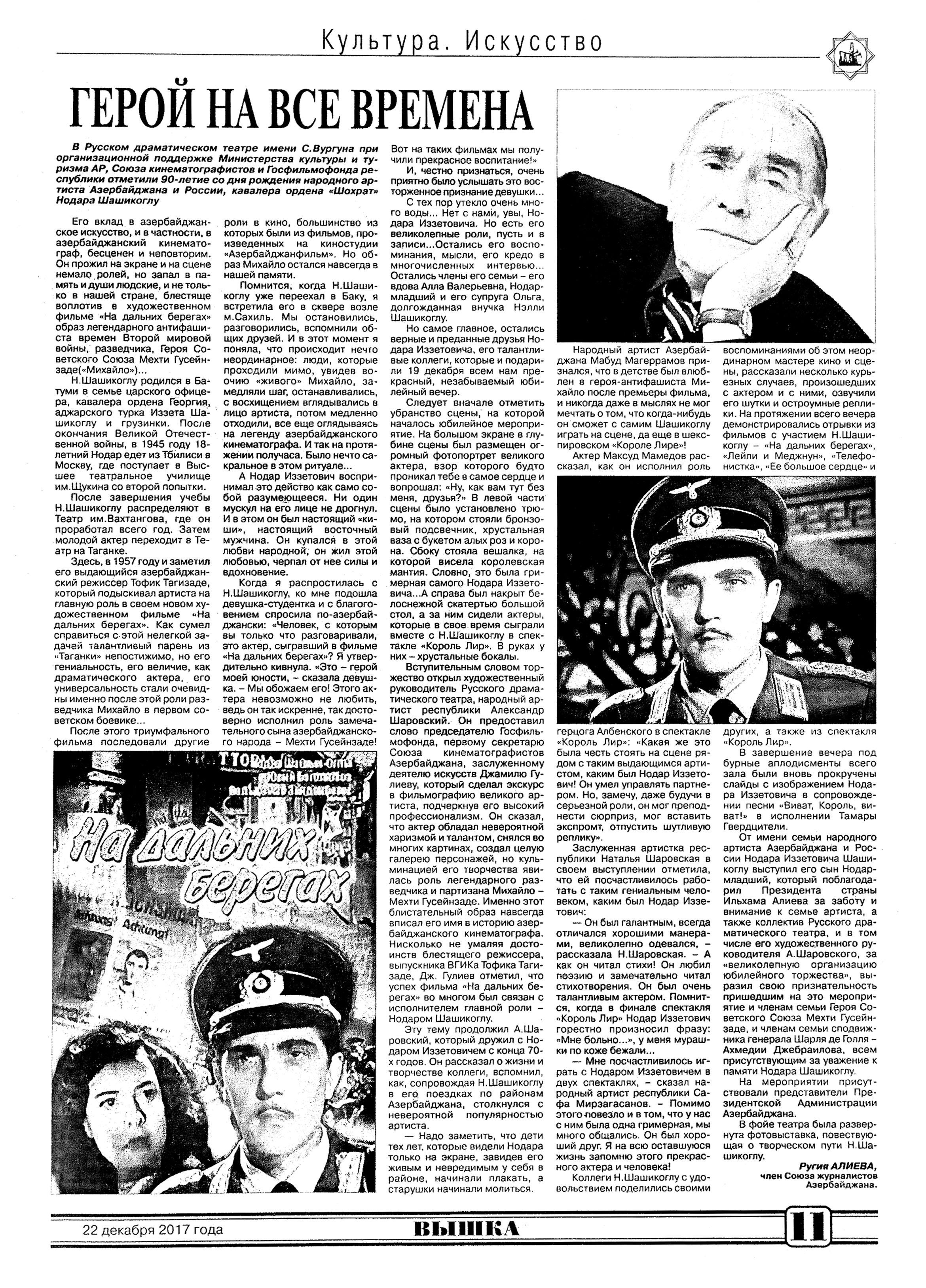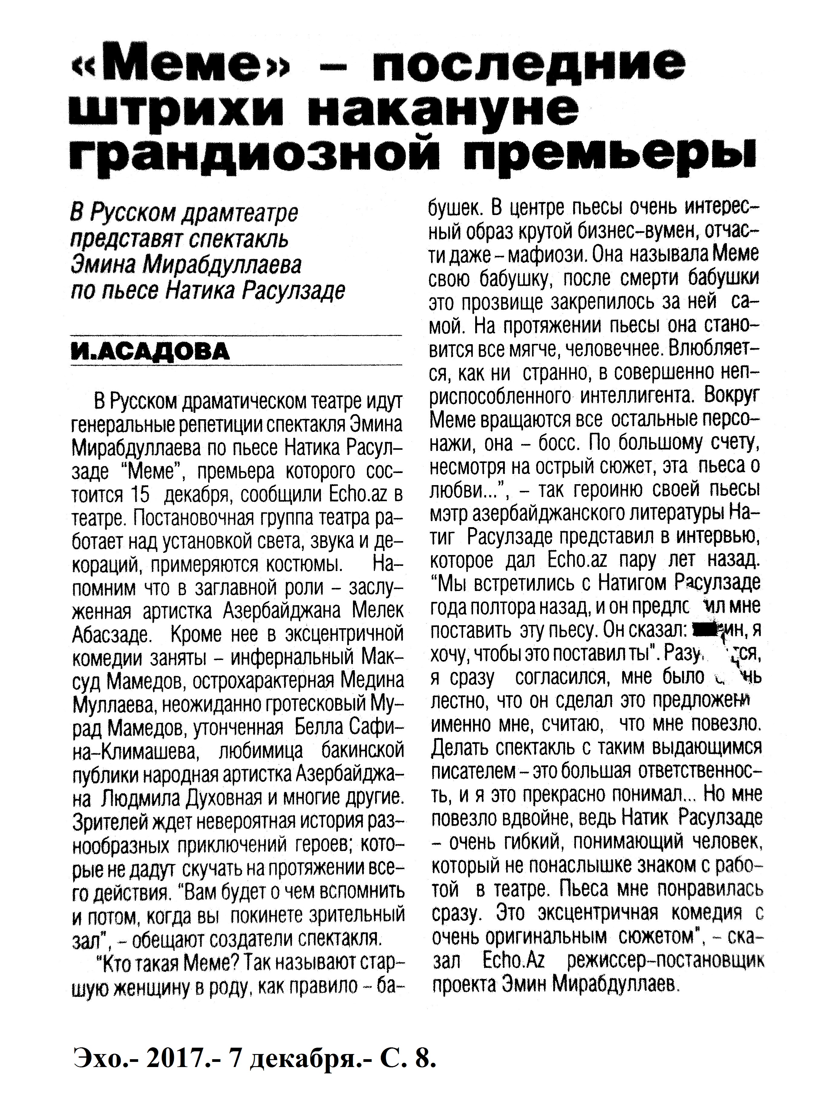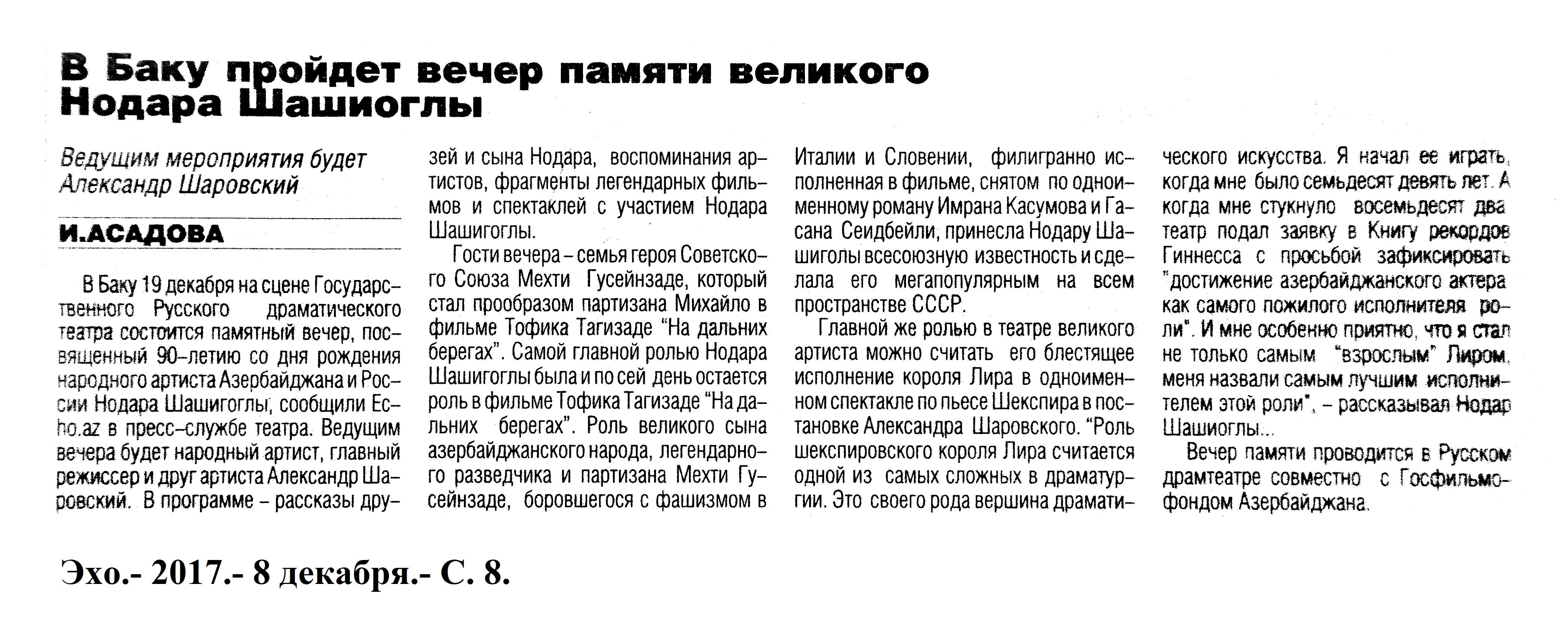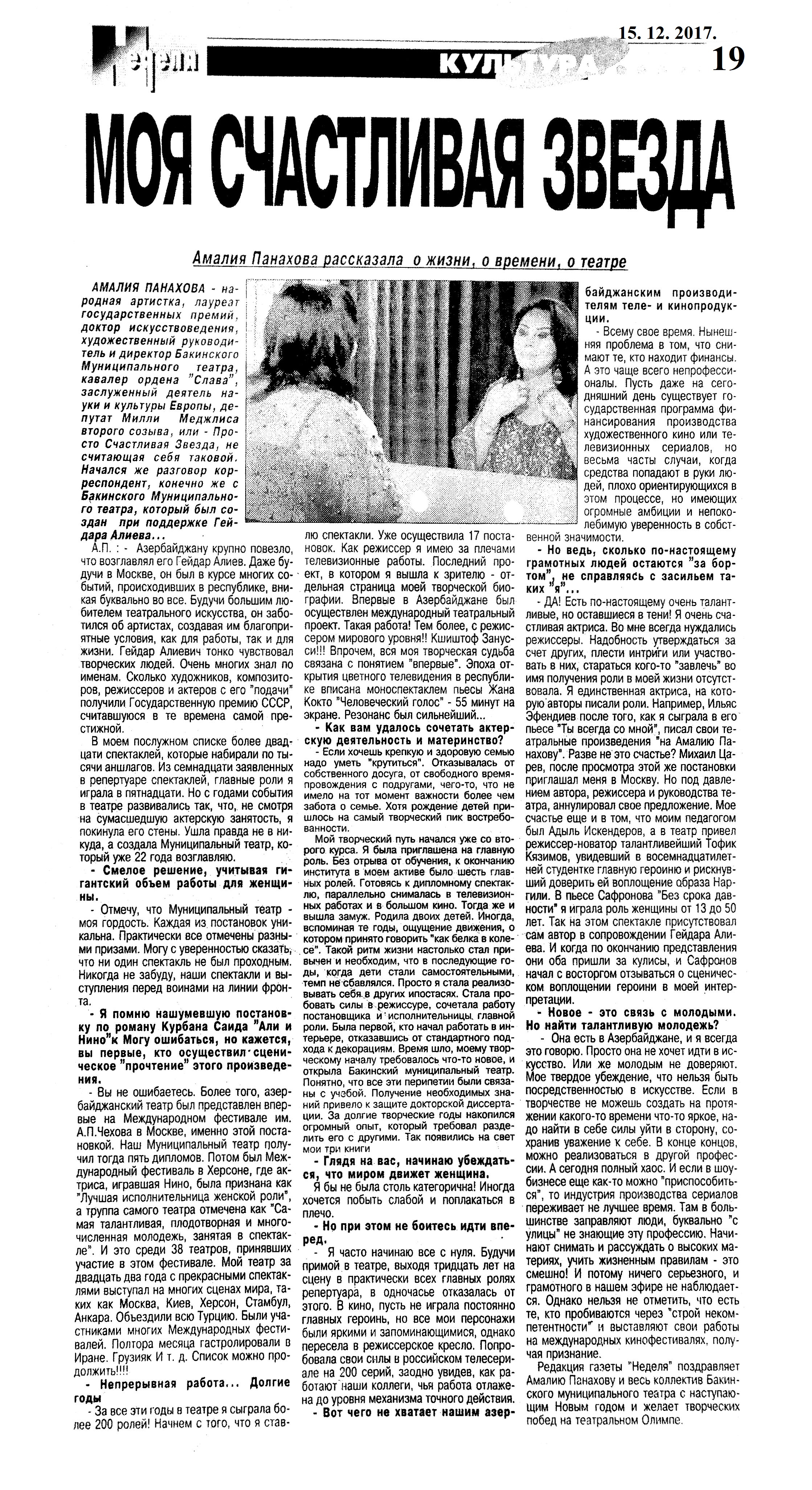 ТЕАТР 1253. Азерпаша Нейматов награждён орденом: [ «За службу Отечеству» второй степени] //Эхо.- 2017.- 27 декабря.- С. 8. 1254. Алиева, Р. Герой на все времена: [к 90-летию Нодара Шашикоглу] //Вышка.- 2017.- 22 декабря.- С.11. 1255. Асадова, И. В Баку пройдет вечер памяти великого Нодара Шашиоглы: Ведущим мероприятия будет Александр Шаровский //Эхо.- 2017.- 8 декабря.- С. 8. 1256. Асадова, И. «Меме» - последние штрихи накануне грандиозной премьеры: В Русском драмтеатре представят спектакль Эмина Мирабдуллаева по пьесе Натига Расулзаде //Эхо.- 2017.- 7 декабря.- С. 8. 1257. Асадова, И. Эмин Мирабдуллаев: В лице Натига Расулзаде обрел не только интересного драматурга…: В Русском Драматическом Театре состоялась премьера спектакля «Меме» //Эхо.- 2017.- 19 декабря.- С. 8. 1258. Ислам, А. Моноспектакль как театр одного актера: Элитарный вид искусства, ориентирующийся на интеллектуалов: [о спектакле «Наказание» режиссера Мехрибан Алекперзаде в ТЮЗе] // Каспiй.- 2017.- 22 декабря.- С. 13. 1259. Манафов, Р. «Дорогая Памела»: В Молдове под руководством азербайджанского режиссера состоялась премьера спектакля: [Турал Мустафаев в Гагаузском Национальном Театре имени Д.Танасоглу] //Эхо.- 2017.- 13 декабря.- С. 8. 1260. Микеладзе, Г. «Сильва» собирает аншлаги: Классическая оперетта Имре Кальмана вновь в репертуаре Музыкального Театра: [режиссер-Борис Лукинский] //Каспiй.- 2017.- 22 декабря.- С.12. 1261. Панахова, А. Актриса. Личность. Деятель: К 25-летию Муниципального Театра Амалии Панаховой: [беседа с народной артисткой] //Каспiй.- 2017.- 2 декабря.- С.12-13. 1262. Панахова, А. Моя счастливая звезда: Амалия Панахова рассказала о жизни, о времени, о театре //Неделя.- 2017.- 15 декабря.- С.19. 1263. Хакимов, А. О планах мышей и людей: При поддержке посольства США в Азербайджане состоялась премьера постановки инклюзивного театра: [о спектакле «Люди и мыши» режиссера Н. Гуламзаде в Театра «ЭСА»] //Эхо.- 2017.- 21 декабря.- С.8.