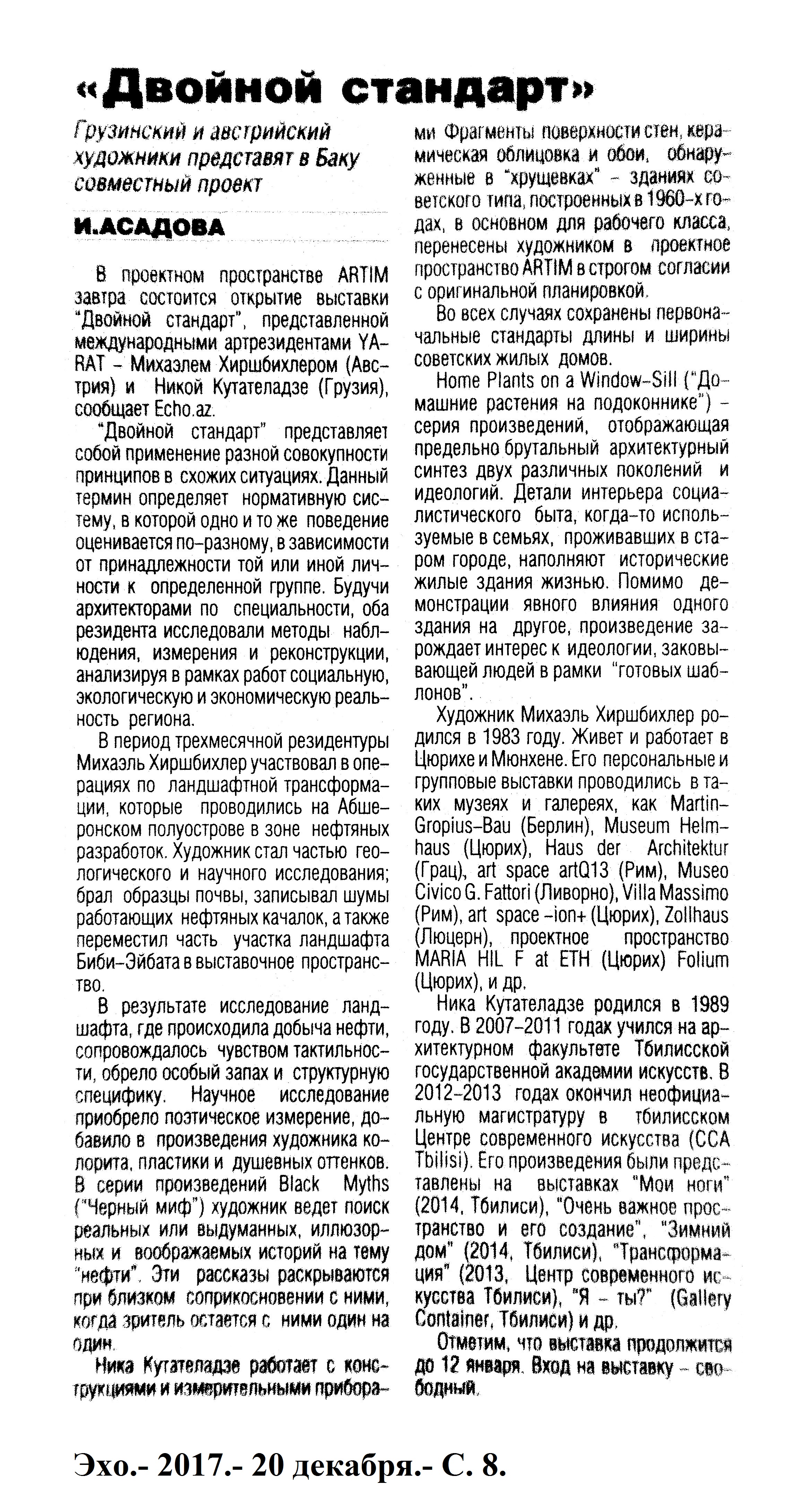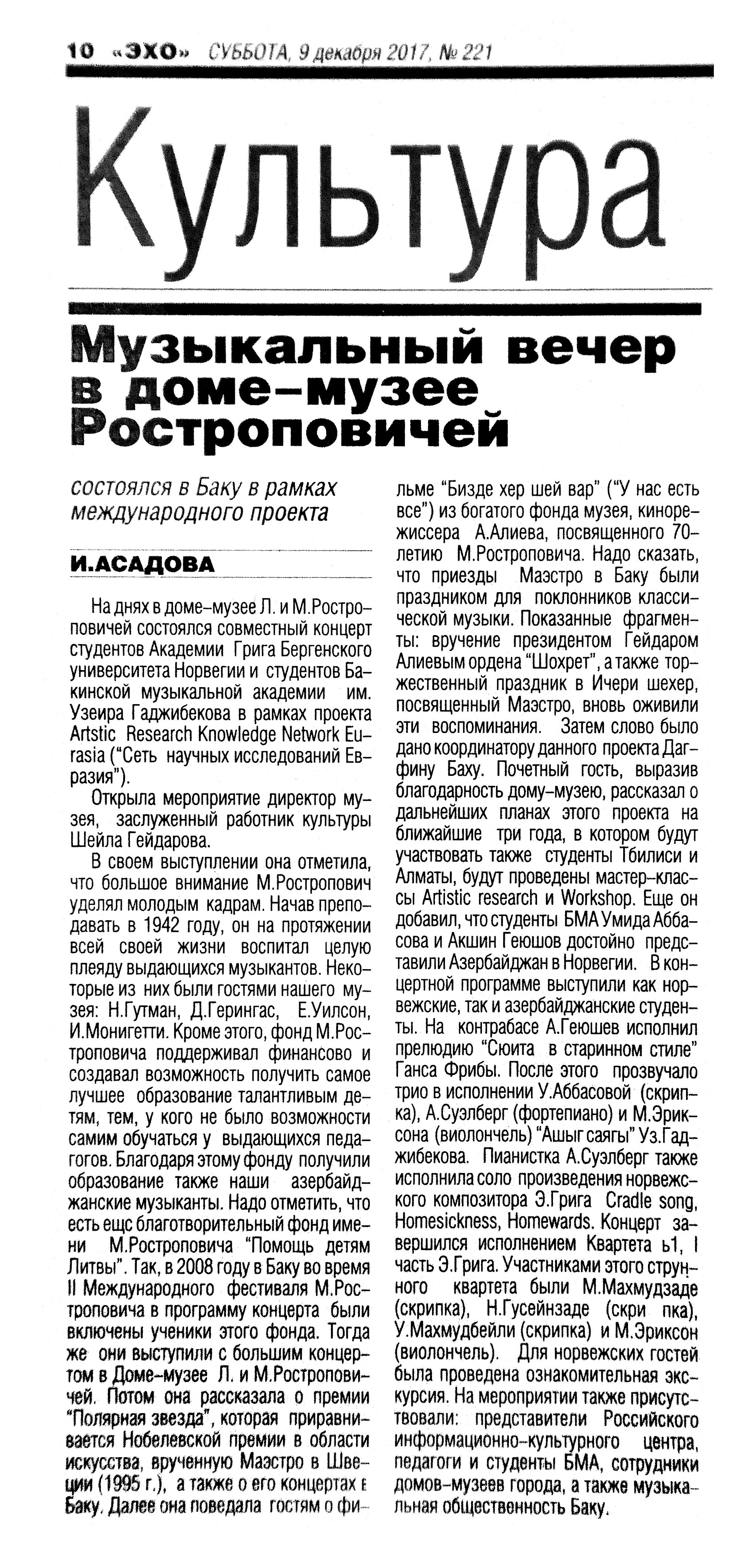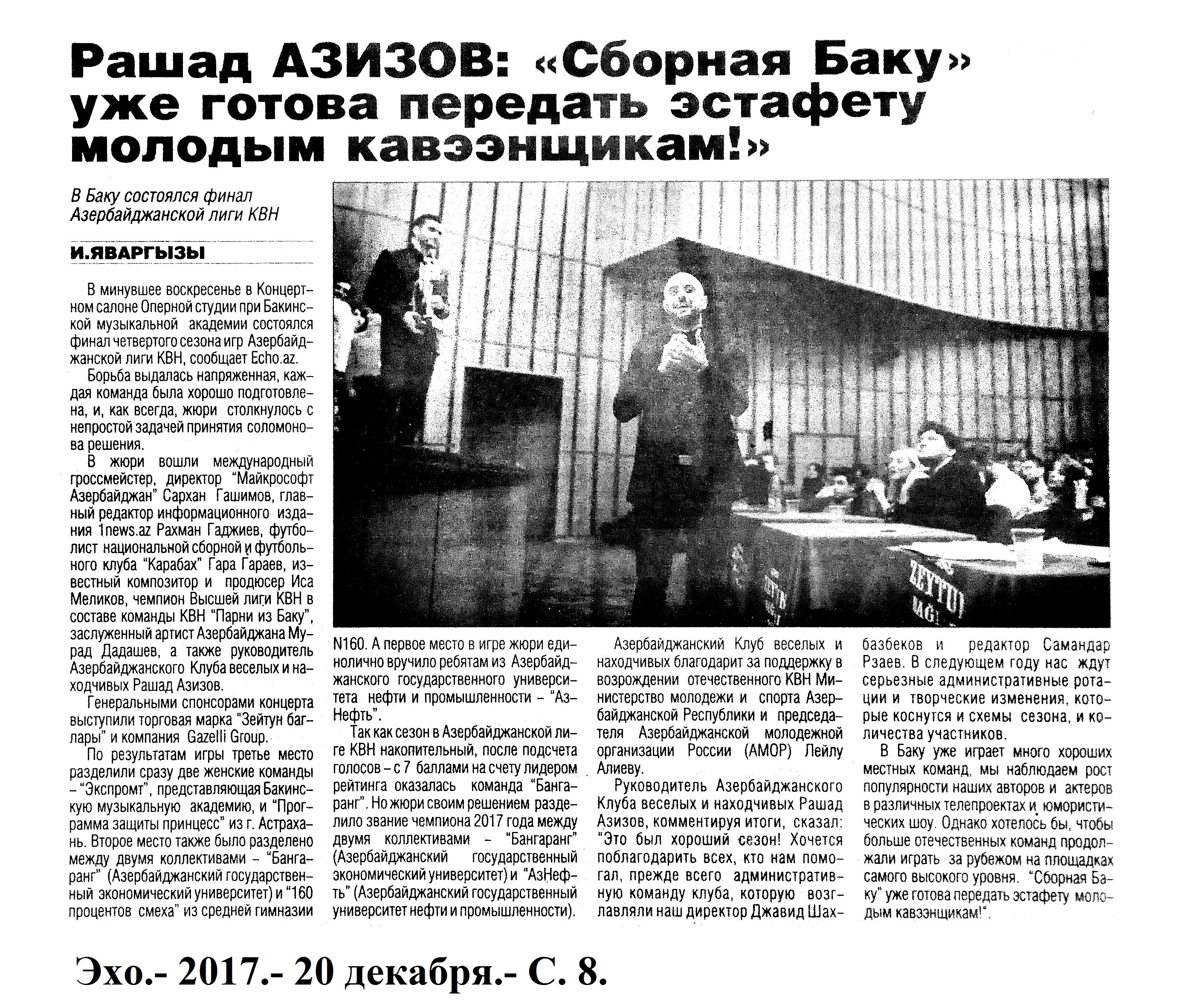 ЭСТРАДА. ЦИРК 1238. Асадова, И. Горячие анонсы «Жары»: [о предстоящем музыкальном фестивале] //Эхо.- 2017.- 27 декабря.- С.8 1239. Асадова, И. EMIN на концерте в Баку: «Меня можете не охранять, я здесь дома»: [о выступлении музыканта во Дворце Гейдара Алиева] //Эхо.- 2017.- 19 декабря.- С.8 1240. Асадова, И. По пути в Баку сольник в Сrocus City Hall: Стартуют концерты Емина в поддержку альбома «Прости, моя любовь» //Эхо.- 2017.- 6 декабря.- С.8. 1241. Дадашева, А. Ляман Дадашева призывает соратников к единству: [о творчестве певицы, полуфиналистки проекта «Голос Азербайджан»] //Эхо.- 2017.- 28 декабря.- С.8. 1242. Нагиев, Т. «Есть команды, которые выигрывают только благодаря залу»: Интервью с фронтменом команды КВН «Сборная Баку» Тамерланом Нагиевым /провела И.Асадова //Эхо.- 2017.- 15 декабря.- С.8 1243. Яваргызы, И. Рашад Азизов: «Сборная Баку» уже готова передать эстафету молодым кавээнщикам!»: В Баку состоялся финал Азербайджанской лиги КВН //Эхо.- 2017.- 20 декабря.- С.8.