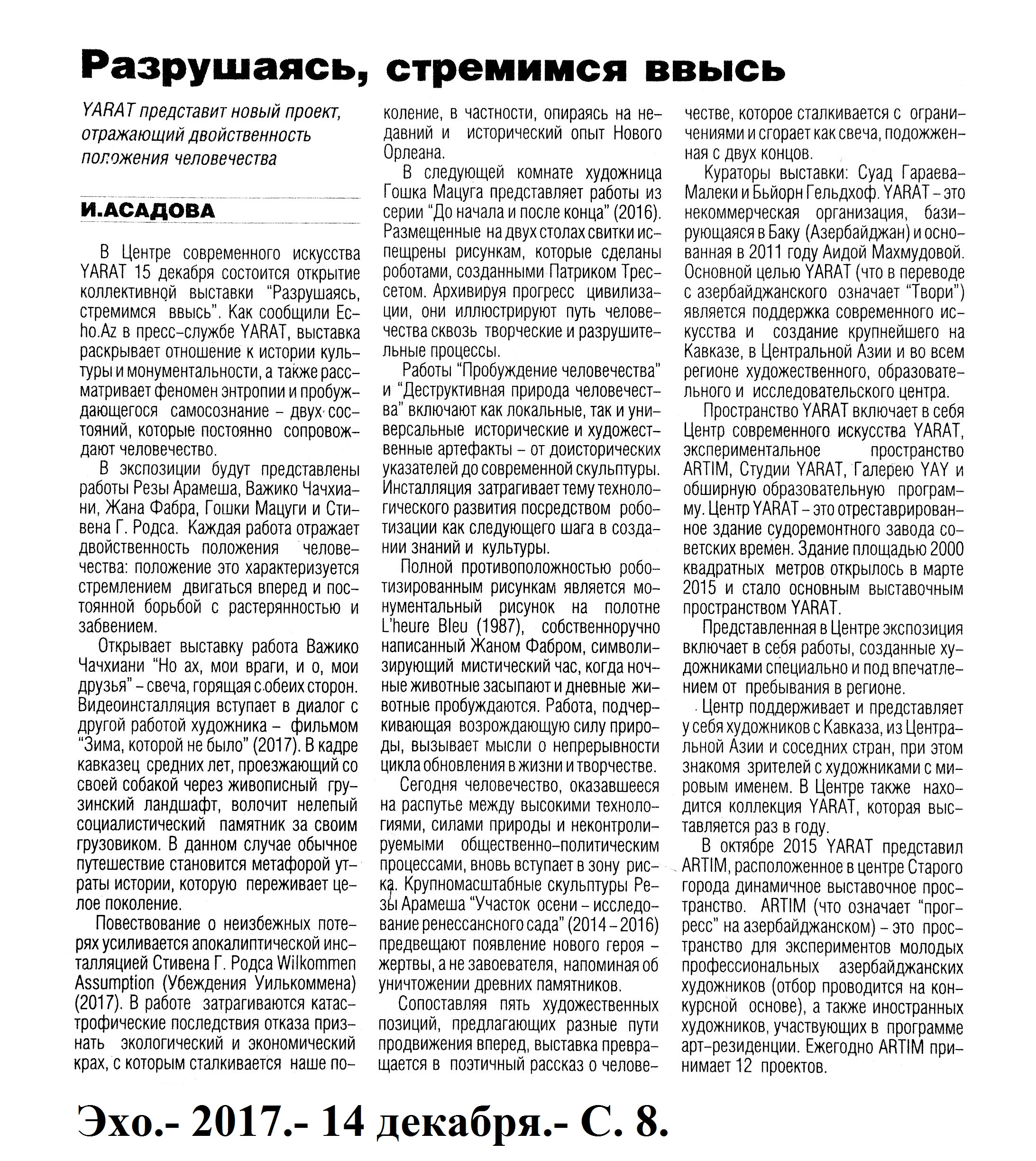 Bax: 174 İNCƏSƏNƏT 232. “YARAT”da “Dağılaraq zirvələrə doğru qalxırıq” adlı qrup sərgisi açılıb //Xalq qəzeti.- 2017.- 17 dekabr.- S.4.
