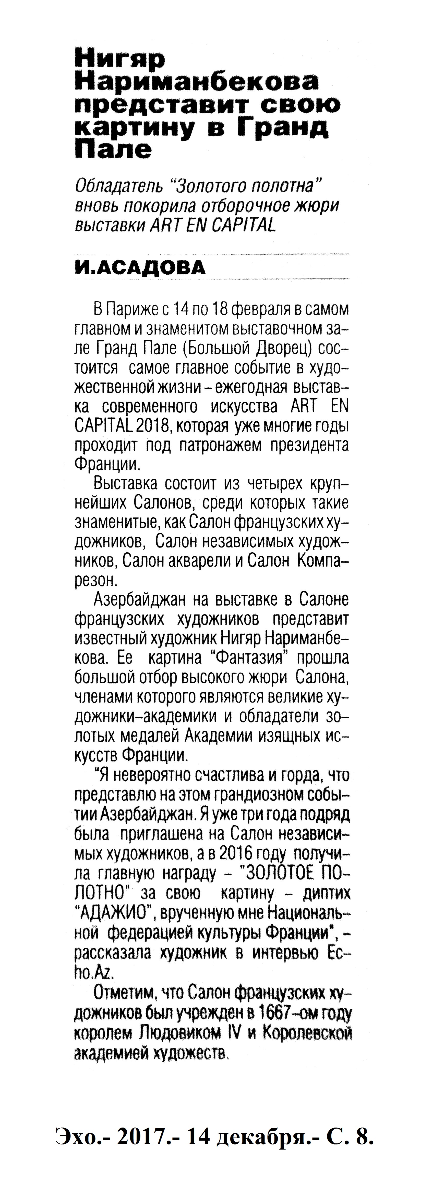 ИЗОБРАЗИТЕЛЬНОЕ ИСКУССТВО 1179. Азербайджанская художница представит картины на самой большой выставке сюрреализма в Европе: [Заслуженный художник Мехрибан Эфенди в проекте «Международный сюрреализм сегодня»] //Бакинский рабочий.-2017.- 14 декабря.- С. 5. 1180. Алиева, С. Художник со светящейся душой: В галерее Nur ART Hause открылась выставка произведений Сакита Мамедова //Каспiй.-2017.- 26 декабря.- С. 13. 1181. Алиева, Э. Открыть ту самую дверь: Лала Оруджева: Я сидела тихо и наблюдала, как дедушка подбирает цвета...: [из беседы с молодым художником, внучкой Заслуженного художника Мамедали Исмаилова] //Каспiй.-2017.- 16 декабря.- С. 11. 1182. Асадова, И. Ирина Эльдарова - почетный член РАХ: Заслуги известного азербайджанского художника отметили в Российской Академии Художеств //Эхо.- 2017.- 8 декабря.- С. 8. 1183. Асадова, И. Нигяр Нариманбекова представит свою картину в Гранд Пале: Обладатель «Золотого полотна» вновь покорила отборочное жюри выставки ART EN CAPITAL //Эхо.- 2017.- 14 декабря.- С. 8.