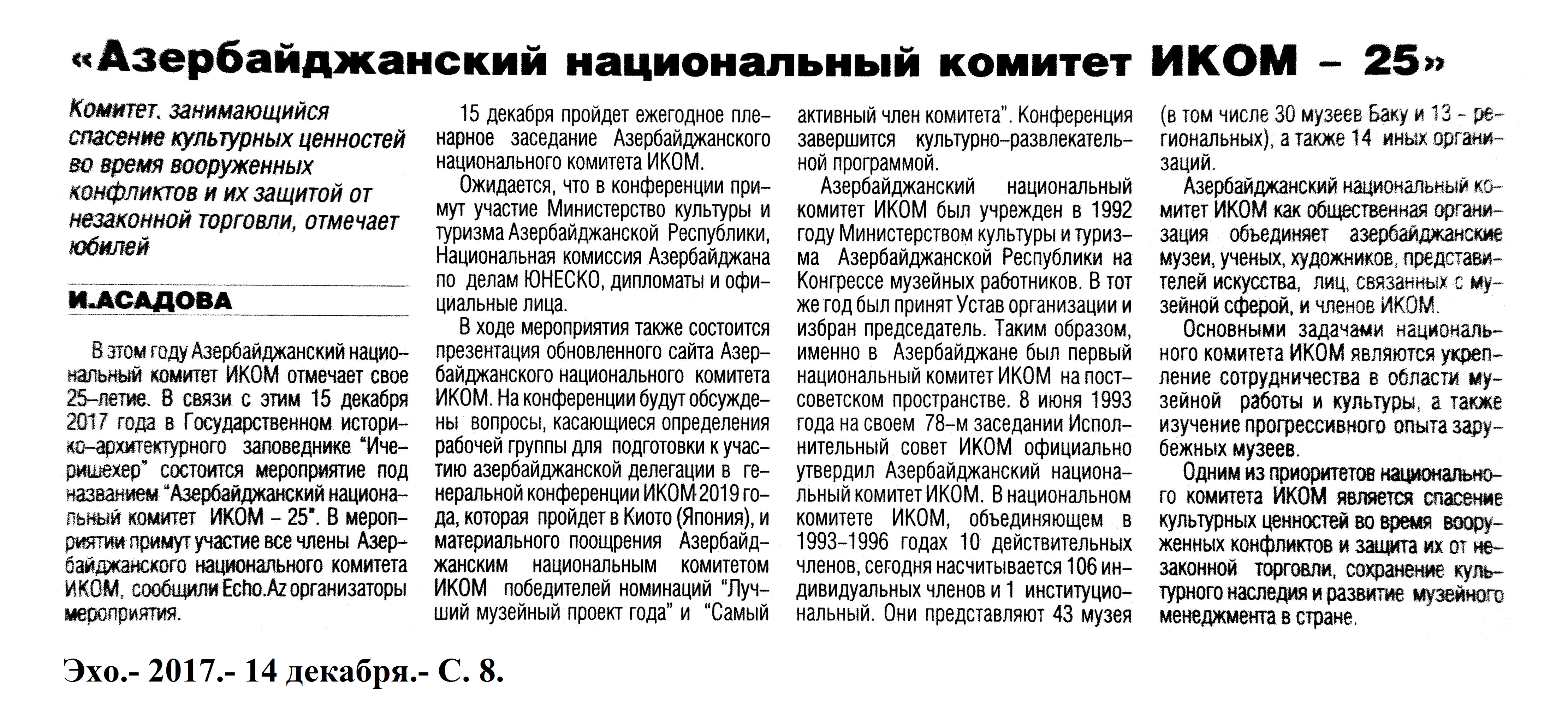 МУЗЕЙНОЕ ДЕЛО 1170. Алиева, Э. Коллекция-юбиляр: Миниатюрные книги, завоевавшие мировое признание: [о Музее Миниатюрной Книги и его директоре З.Салаховой] //Каспiй.-2017.- 23 декабря.- С.12-13. 1171. Асадова, И. «Азербайджанский национальный комитет ИКОМ–25»: Комитет, занимающийся спасением культурных ценностей во время вооруженных конфликтов и их защитой от незаконной торговли, отмечает юбилей: [о развитии музейной работы ИКОМ] //Эхо.- 2017.- 14 декабря.- С. 8. 1172. В Губе открылся Музей Флага: [в рамках поездки Президента Ильхама Алиева в Губинский район] //Бакинский рабочий.-2017.- 8 декабря.- С.4. 1173. В Сумгайыте открылся Музей Флага //Бакинский рабочий.-2017.- 16 декабря.- С.4.