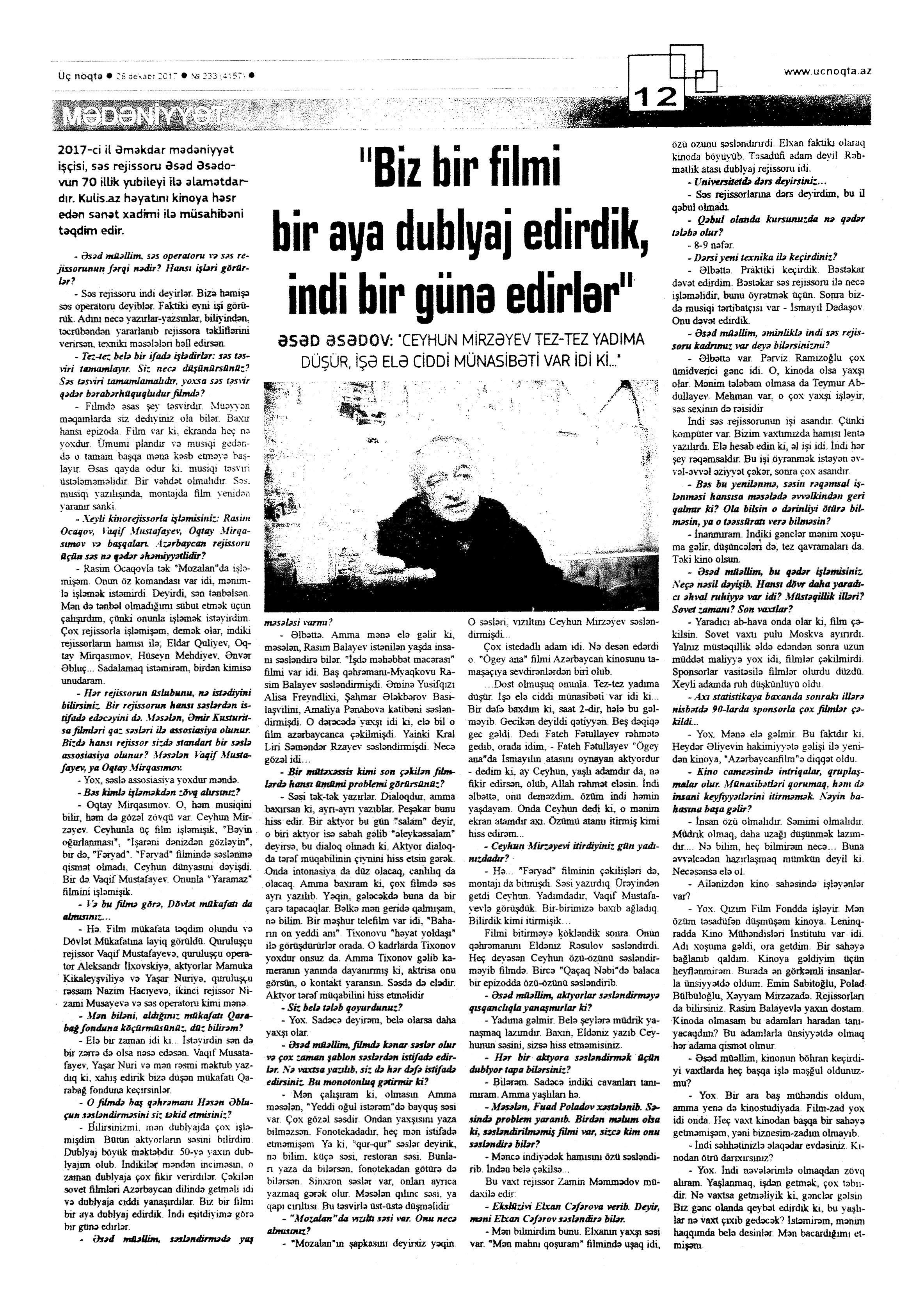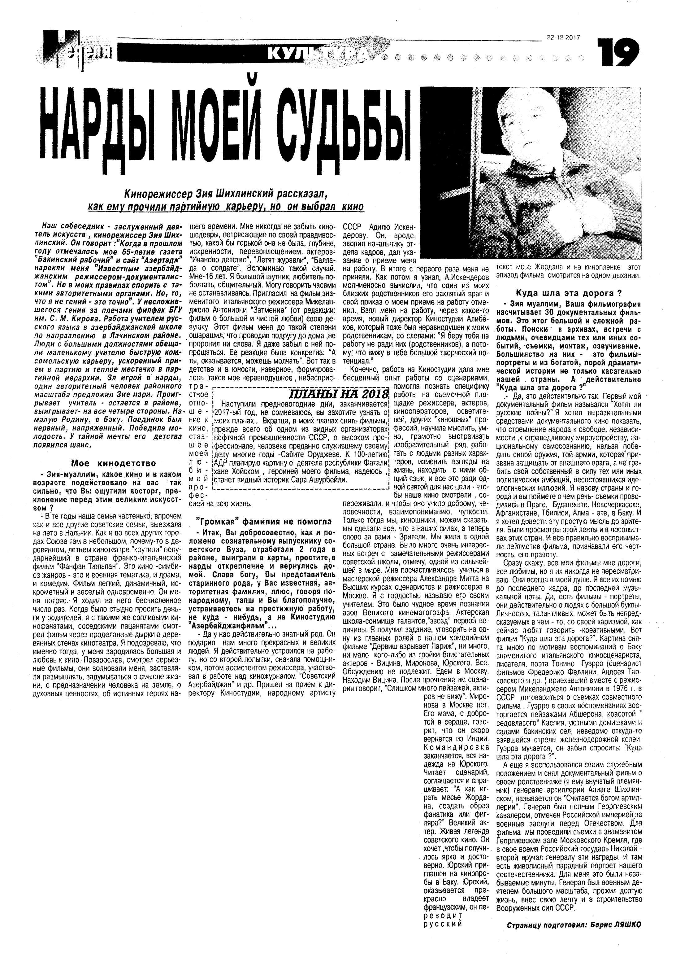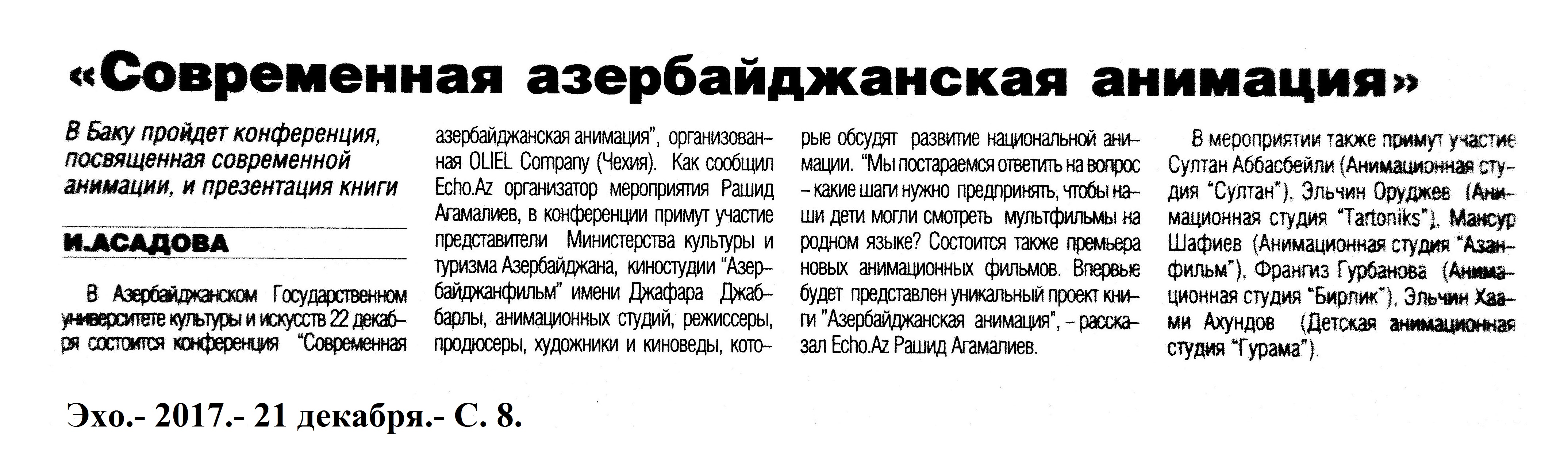 КИНО 1245. Агамалиев, Р. Импульс национальной анимации: Мультфильмы как средство воспитания детей: [беседа с кинорежиссером Р.Агамалиевым] /провела А.Мамедова //Каспiй.- 2017.- 28 декабря.- С.13. 1246. Асадова, И. «Али и Нино» показали в Саудовской Аравии: [об одноименном фильме А.Кападиа] //Эхо.- 2017.- 28 декабря.- С. 8. 1247. Асадова, И. «Вагиф Мустафаев–это бренд»: [о мировой известности кинорежиссера] //Эхо.- 2017.- 28 декабря.- С. 8. 1248. Асадова, И. «Современная азербайджанская анимация»: В Баку пройдет конференция, посвященная современной анимации, и презентация книги //Эхо.- 2017.- 21 декабря.- С. 8. 1249. Дадашева, А. «Щедрый скупой»: В Баку показали фильмы о знаменитых азербайджанских меценатах: [созданных центром ARB ARAN в Музее Истории] //Эхо.- 2017.- 26 декабря.- С. 8. 1250. Мехти, У. Ульви Мехти: «То, что Баку остался без кинофестиваля-это нонсенс!»: Интервью с киноисториком-кинопублицистом, членом Гильдии Киноведов и Кинокритиков России /провела И.Асадова //Эхо.- 2017.- 21 декабря.- С. 8. 1251. Хатамов, М. Горизонты отечественного кинематографа: Мушфиг Хатамов: Если наше кино демонстрируется в пятидесяти странах мира, это о чем-то говорит: [беседа с директором киностудии «Азербайджанфильм»] /провела А.Ислам //Каспiй.- 2017.- 14 декабря.- С. 8-9. 1252. Шихлинский, З. Нарды моей судьбы: Кинорежиссер Зия Шихлинский рассказал, как ему прочили партийную карьеру, но он выбрал кино: [беседа с заслуженным деятелем искусств] //Неделя.- 2017.- 22 декабря.- С.19.