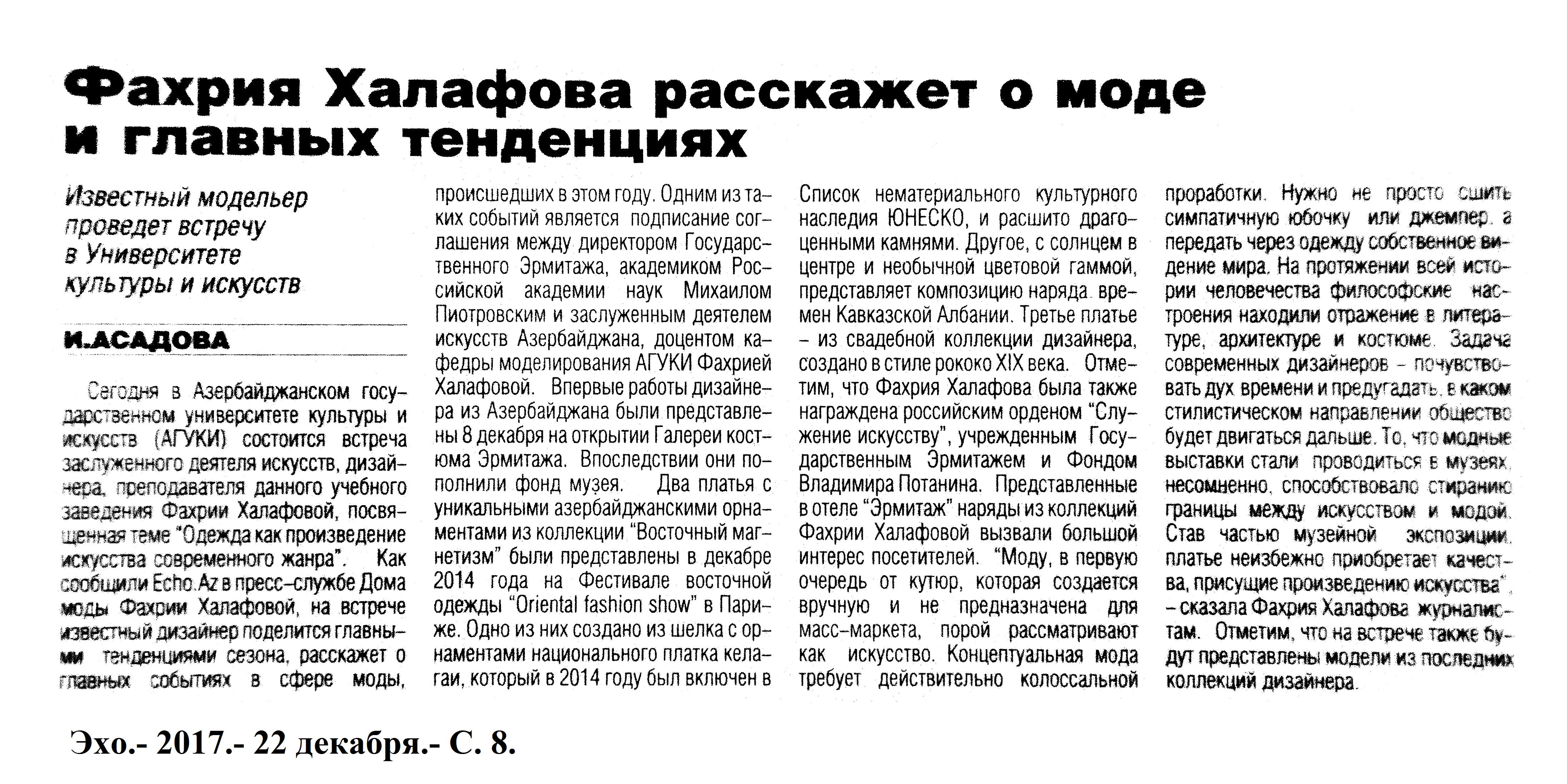 МОДА. ДИЗАЙН 1207. Асадова, И. В Excelsior Hotel & Spa прошло собрание клуба профессионалов и любителей моды Baku Fashion Club: [под руководством Л. Гуторовой-Пойраз] //Эхо.- 2017.- 5 декабря.- С.8. 1208. Асадова, И. Фахрия Халафова расскажет о моде и главных тенденциях: Известный модельер проведет встречу в Университете Культуры и Искусств //Эхо.- 2017.- 22 декабря.- С.8. 1209. Впервые работы азербайджанского дизайнера Фахрии Халафовой представлены в Эрмитаже //Бакинский рабочий.-2017.- 8 декабря.- С.10. 1210. Манафов, Р. Фахрия Халафова: Надеюсь, начинающие модельеры из Азербайджана станут одними из первых слушателей учебного центра Эрмитажа: [работы Заслуженного деятеля искусств вошли в постоянную экспозицию галереи] //Эхо.- 2017.- 12 декабря.- С.8. 1211. Фахрия Халафова: «Надеюсь, начинающие модельеры из Азербайджана станут одними из первых слушателей учебного центра Эрмитажа» //Бакинский рабочий.- 2017.- 12 декабря.- С.5.