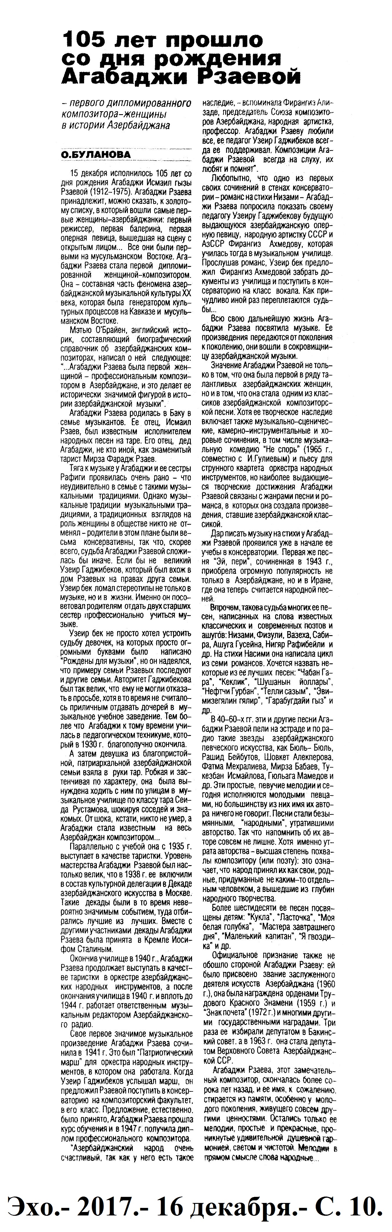 БАЛЕТ. ТАНЦЫ 1244. Бабазаде, А. Очарованная и чарующая танцем: В Бакинской Академии Хореографии отметили 90-летие со дня рождения одной из ярких представительниц национальной школы хореографии Хумар Зульфугаровой //Эхо.- 2017.- 1 декабря.- С.8.