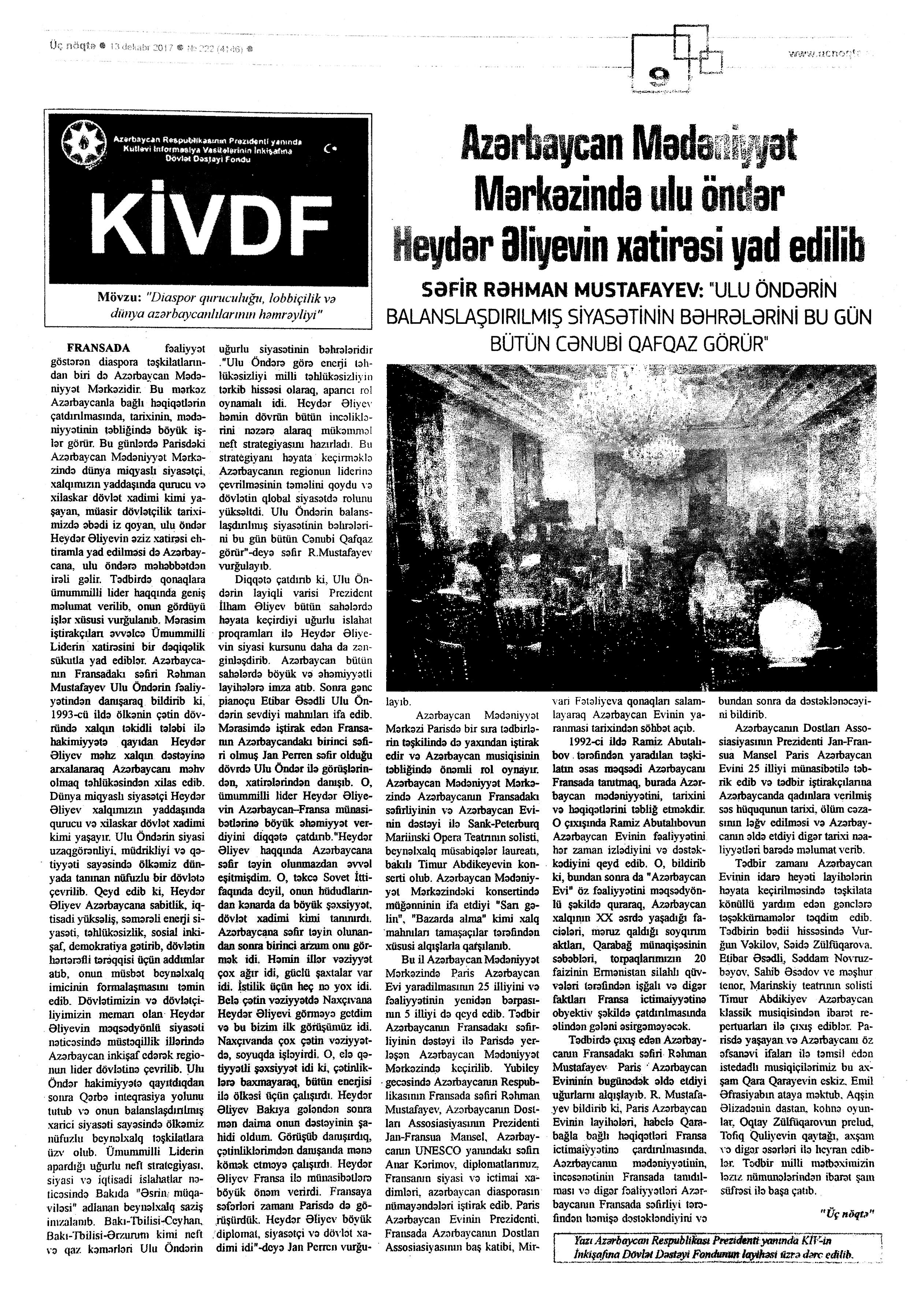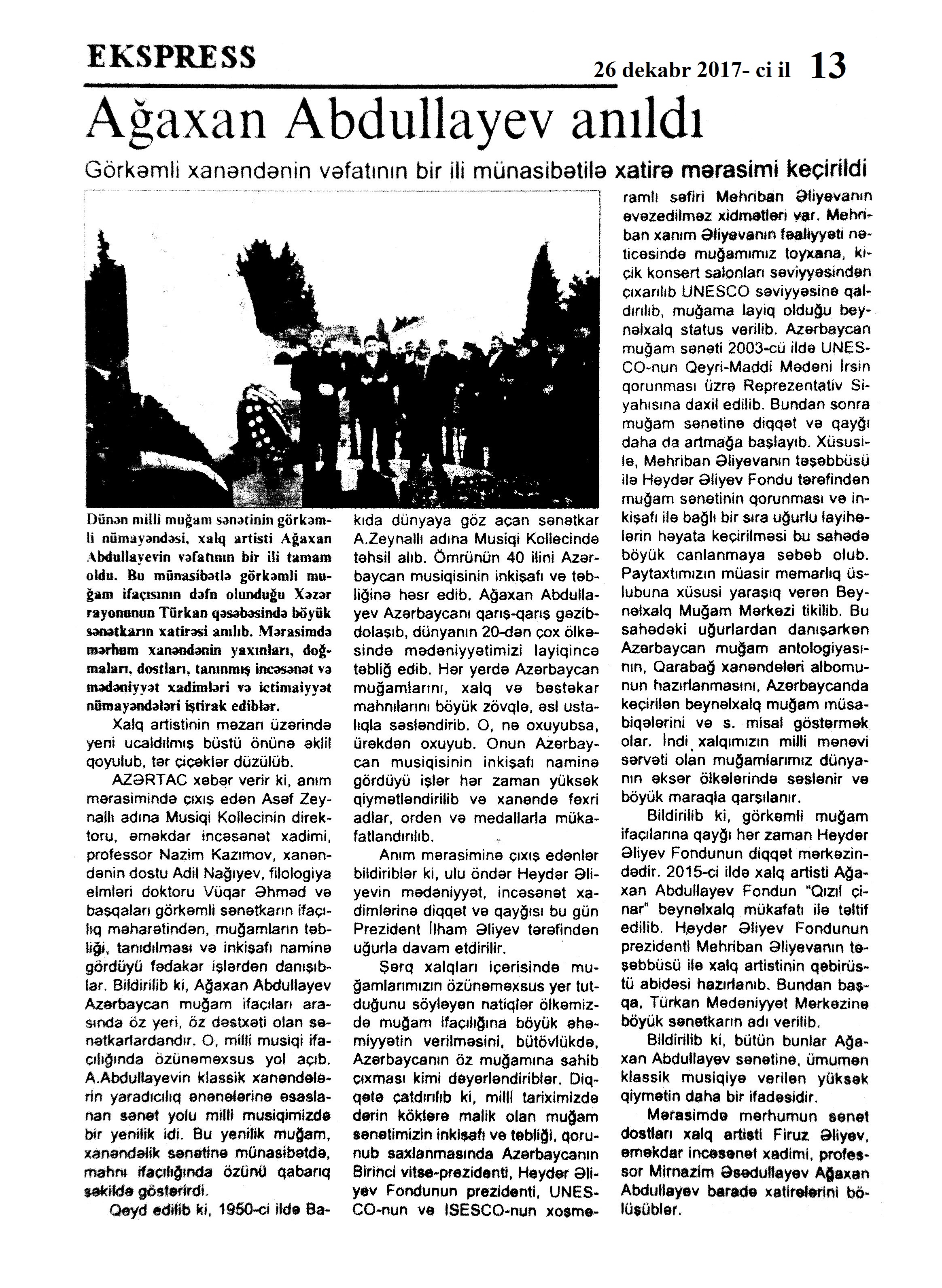 Heydər Əliyevin əziz xatirəsinə 78. Azərbaycan Mədəniyyət Mərkəzində ulu öndər Heydər Əliyevin xatirəsi yad edilib: [Fransada] //Üç nöqtə.- 2017.- 13 dekabr.- S.9. 79. ATMU-da ulu öndərin anım günü //Mədəniyyət.-2017.- 13 dekabr.- S.6. 80. Azərbaycanın özü qədər əbədi: Ümummilli lider Heydər Əliyevin xatirəsi yad edilib //Mədəniyyət.- 2017.- 13 dekabr.- S.2. 81. Azəri, L. “Sən elə bir zirvəsən”: [Siyasi Sənədlər Arxivində keçirilən tədbir haqqında] //Mədəniyyət.- 2017.- 13 dekabr.- S.6. 82. Azəri, L. Ulu öndərə ithaf olunmuş musiqi axşamı: [Müslüm Maqomayev adına Azərbaycan Dövlət Akademik Filarmoniyasında] //Mədəniyyət.- 2017.- 13 dekabr.- S.2. 83. Cəfərli, T. Təsviri sənətimizin əzmkar və yenilməz müdafiəçisi: Heydər Əliyev ölkəyə rəhbərlik etdiyi dövrlərdə daim rəssamların, heykəltəraşların, memarların yaradıcılığını yüksək qiymətləndirib //Kaspi.- 2017.- 13 dekabr.- S.7. 84. Cəfərov, E. Əbədiyaşar xatirə: [Azərbaycan Dövlət Musiqili Teatrında “Qəlbin yaddaşı” adlı anım mərasiminin keçirilməsi haqqında] //Azərbaycan.- 2017.- 13 dekabr.- S.6. 85. “Heydər Əliyev və Azərbaycan mədəniyyəti” mövzusunda elmi sessiya: [Bakı Xoreoqrafiya Akademiyasında ümummilli liderin anım gününə həsr olunmuş elmi sessiyanın keçirilməsi haqqında] //Mədəniyyət.- 2017.- 13 dekabr.- S.6. 86. Həsənzadə, N. Əbədi yaddaşımızın Heydər Əliyev məqamı: [Xalq şairi Nəriman Həsənzadə ilə söhbət] /söhbəti apardı Elnarə Akimova //Ədəbiyyat qəzeti.- 2017.- 9 dekabr.- S.2-3. 87. Xalqa bağışlanan ömür: [Dövlət İdarəçilik Akademiyasında ümummilli lider Heydər Əliyevin vəfatının 14-cü ildönümünə həsr olunmuş mədəni tədbirin keçirilməsi haqqında] //Mədəniyyət.- 2017.- 13 dekabr.- S.6. 88. Lalə. Azərbaycanın özü qədər əbədi: Ulu öndər Heydər Əliyevə həsr olunmuş konfrans: [Milli Kitabxanada] //Mədəniyyət.- 2017.- 8 dekabr.- S.5. 89. Mehdiyev, M. “Sən elə bir zirvəsən!...”: [Azərbaycan Respublikası Prezidentinin İşlər İdarəsi Siyasi Sənədlər Arxivinin inzibati binasında keçirilən tədbir haqqında] //Xalq qəzeti.- 2017.- 13 dekabr.- S.11. 90. Mehriban Zəki: “Heydər Əliyevin adımı fəxri adlar siyahısına əlavə etməsi mənim üçün çox böyük stimul idi”: [Əməkdar artistin söhbəti] /söhbəti qələmə aldı Pərvin //525-ci qəzet.- 2017.- 12 dekabr.- S.4. 91. Məhərrəmova, T. Heydər Əliyev incəsənətin hamisi idi: Ulu öndər xatirələrdə böyük hörmətlə anılır //Kaspi.- 2017.- 13 dekabr.- S.9. 92. Mirzəyeva, A. Ümummilli lider Heydər Əliyevin siyasi kursunda tolerantlıq və multikultural dəyərlər //Xalq qəzeti.- 2017.- 10 dekabr.- S.5. 93. Muzeydə xatirə tədbiri: [Musiqi Mədəniyyəti Dövlət Muzeyində] //Mədəniyyət.- 2017.- 13 dekabr.- S.2. 94. Naxçıvanda “Ümummilli lider Heydər Əliyev dini həmrəyliyin yaradıcısıdır” mövzusunda konfrans keçirilib: [“İslam Həmrəyliyi İli” çərçivəsində] //Azərbaycan.- 2017.-7 dekabr.- S.6. 95. Rəis, X. Müasir Azərbaycanın memarı, unudulmaz şəxsiyyət: Sənət adamları ulu öndər Heydər Əliyevlə bağlı xatirələrini bölüşürlər //Kaspi.- 2017.- 13 dekabr.- S.10.