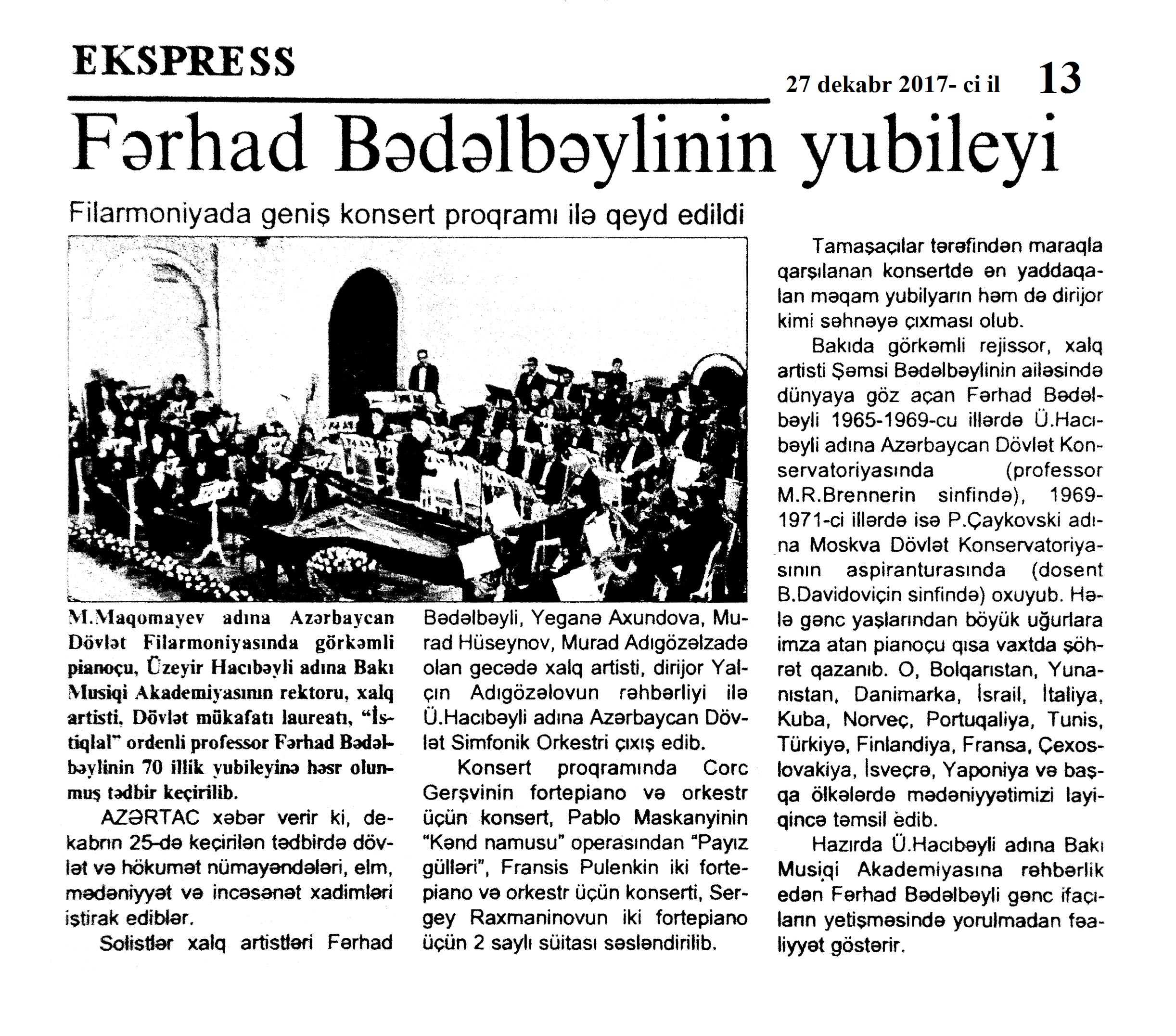 Fərhad Bədəlbəyli – 70 426. Anar. İstedadın cazibəsi //525-ci qəzet.- 2017.- 26 dekabr.- S.4. 427. Azəri, L. Görkəmli pianoçunun 70 illiyinə həsr olunan musiqi gecəsi: [Dövlət Akademik Filarmoniyasında Xalq artistinin yubileyinə həsr olunmuş konsert proqramı haqqında] //Mədəniyyət.-2017.- 27 dekabr.- S.3. 428. “Bir arzum var: Şuşada konsert vermək!”: Moskvada görkəmli Azərbaycan musiqiçisi Fərhad Bədəlbəylinin yubiley gecəsi keçirilib //Ekspress.- 2017.- 15 dekabr.- S.13. 429. Dadaşzadə, Z. Sənətin möcüzəsi: Fərhad Bədəlbəyli –70 //Azərbaycan. - 2017.- 26 dekabr.- S.11. 430. Əliyev, İ. Fərhad Bədəlbəyli: “Azad Azərbaycanın Prezidentindən “İstiqlal” ordeni almağımın böyük mənası var”: Prezident İlham Əliyevin nitqi: [İlham Əliyev Xalq artisti, görkəmli pianoçu Fərhad Bədəlbəyliyə “İstiqlal” ordenini təqdim edib] //Azərbaycan.- 2017.-26 dekabr.- S.4. 431. Fərhad Bədəlbəyli “İstiqlal” ordeni ilə təltif olunub //Mədəniyyət.- 2017.- 27 dekabr.- S.2. 432. Fərhad Bədəlbəyli Azərbaycan mədəniyyətini dünyada layiqincə təmsil edib: [Azərbaycan Dövlət Filarmoniyasında Xalq artistinin yubileyinə həsr olunmuş tədbirin keçirilməsi haqqında] //Azərbaycan.- 2017.- 26 dekabr.- S.11. 433. Fərhad Bədəlbəylinin 70 illik yubiley tədbiri keçirildi: [Ü.Hacıbəyli adına Bakı Musiqi Akademiyasında] //525-ci qəzet.- 2017.- 28 dekabr.- S.7. 434. Fərhad Bədəlbəylinin 70 illik yubileyi geniş konsert proqramı ilə qeyd olunub: [Azərbaycan Dövlət Filarmoniyasında] //Respublika.- 2017.- 26 dekabr.- S.15. 435. Fərhad Bədəlbəylinin 70 illiyinə həsr edilmiş konsert: [Üzeyir Hacıbəyli adına Bakı Musiqi Akademiyasında] //Mədəniyyət.- 2017.- 22 dekabr.- S.2. 436. Fərhad Bədəlbəylinin yubileyi: Filarmoniyada geniş konsert proqramı ilə qeyd edildi //Ekspress.- 2017.- 27 dekabr.- S.13. 437. Kərimova, S. “İstiqlal” ordenli yubilyar: Prezident İlham Əliyev Xalq artisti Fərhad Bədəlbəyliyə “İstiqlal” ordenini təqdim edib //Azərbaycan müəllimi.- 2017.- 29 dekabr.- S.2. 438. “Mənim ancaq bir arzum var: Şuşada konsert vermək!”: Moskvada görkəmli Azərbaycan musiqiçisi Fərhad Bədəlbəylinin yubiley gecəsi keçirilib //Mədəniyyət.- 2017.- 15 dekabr.- S.8.