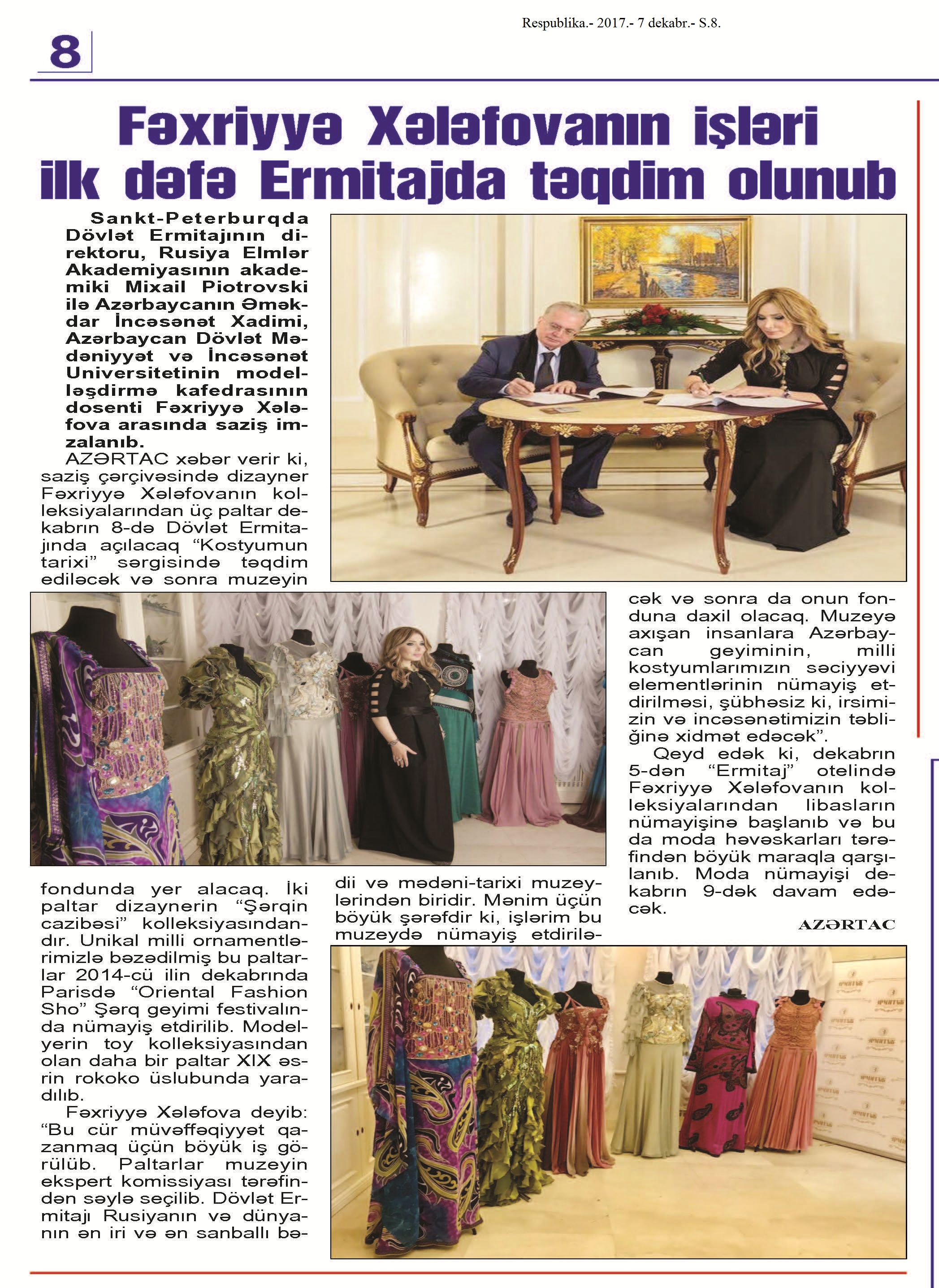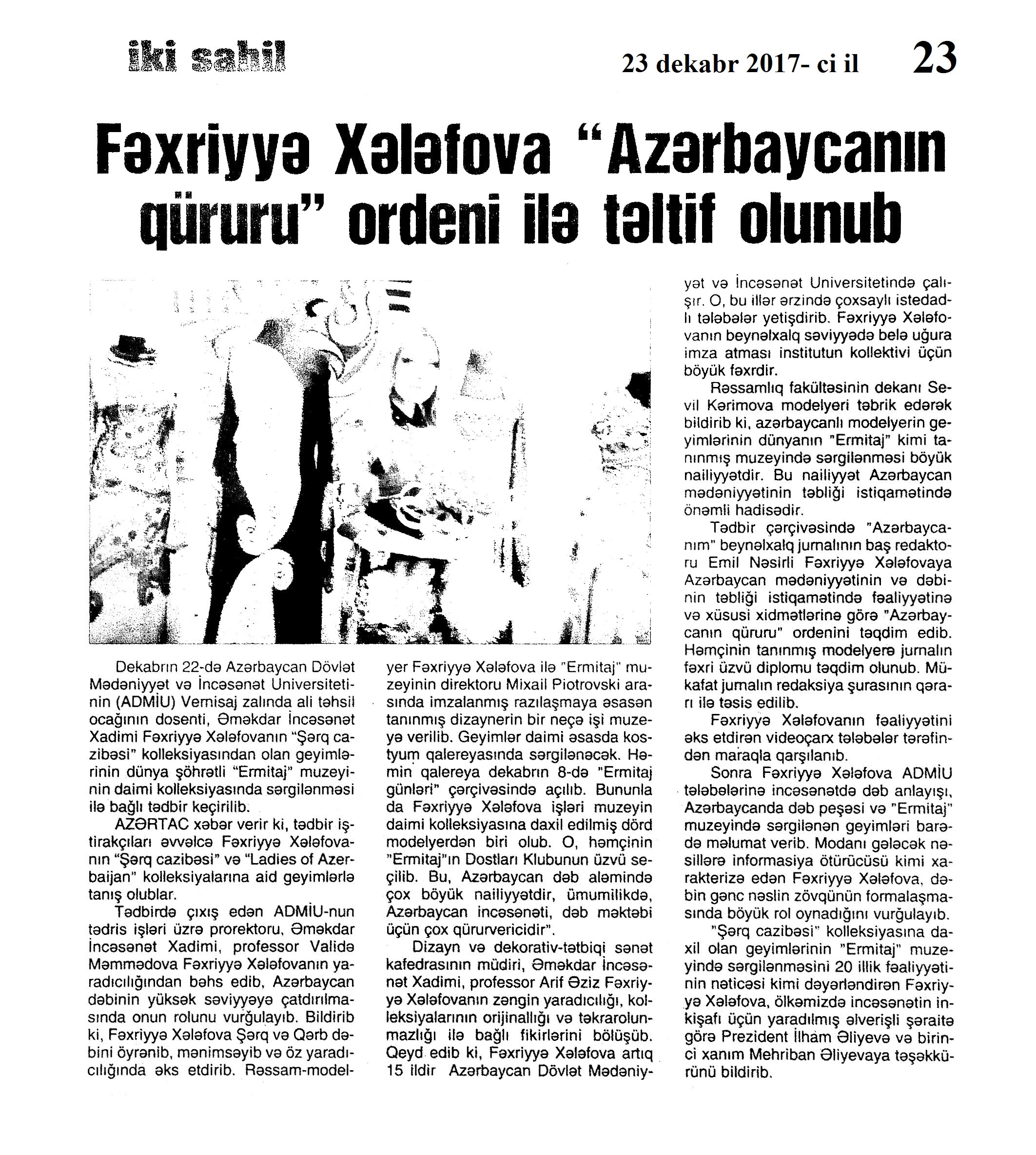 MODA VƏ DİZAYN 297. Bakı Milli Geyim Evinin təlim-tədris mərkəzi açılıb: [Azərbaycan Dövlət Mədəniyyət və İncəsənət Universitetində] //Mədəniyyət.- 2017.- 1 dekabr.- S.4. 298. Fəxriyyə Xələfovanın işləri ilk dəfə Ermitajda təqdim olunur //Respublika.- 2017.- 7 dekabr.- S.8. 299. Fəxriyyə Xələfova “Azərbaycanın qüruru” ordeni ilə təltif olunub //İki sahil.- 2017.- 23 dekabr.- S.23. 300. Fəxriyyə Xələfova Azərbaycan mədəniyyətinin təbliğinə görə mükafatlandırılıb: [Azərbaycan Dövlət Mədəniyyət və İncəsənət Universitetində Əməkdar İncəsənət Xadimi Fəxriyyə Xələfova “Azərbaycanım” beynəlxalq jurnalının təsis etdiyi “Azərbaycanın qüruru” ordeni ilə təltif olunub] //Azərbaycan.- 2017.-23 dekabr.- S.15. 301. Fəxriyyə Xələfova: “Ümidvaram, Azərbaycanın gənc modelyerləri “Ermitaj”ın Elm-Tədris Mərkəzinin ilk dinləyicilərindən olacaqlar”: [“Ermitaj” muzeyinin daimi ekspozisiyasında rəssam-modelyer, Azərbaycanın Əməkdar İncəsənət Xadimi Fəxriyyə Xələfovanın işləri yer alıb] //Azərbaycan.- 2017.- 12 dekabr.- S.11. 302. Hüseynov, F. Milli geyimlərimiz – ənənədən gələcəyə: “Sara Xatun” jurnalının yubiley buraxılışının və Bakı Milli Geyim Evinin yeni kolleksiyasının təqdimatı keçirildi: [Muzey Mərkəzində] //Mədəniyyət.- 2017.- 6 dekabr.- S.8. 303. Qurbanova, N. “Şubanı dünya geyim mədəniyyətinə Azərbaycan verib” //Həftə içi.- 2017.- 29 dekabr.- S.7. 304. Modelyer Fəxriyyə Xələfovanın geyim nümunələri Ermitajda sərgilənəcək: [Sankt-Peterburqdakı Dövlət Ermitajında] //Mədəniyyət.- 2017.- 8 dekabr.- S.16. 305. Sarıyeva, İ. Azərbaycanda moda tarixçiliyi elmi…: [sənətşünaslar Səkinə Baharlının və Şəlalə Maqsudun moda geyim mədəniyyəti haqqında fikirləri] //Bakı xəbər.- 2017.- 5 dekabr.- S.13. 306. Sarıyeva, İ. Muzeylərimiz müasir milli geyim evləri ilə necə əməkdaşlıq edirlər?: Könül Vəlibəyova: “Çox yaxşı olardı ki, ölkəmizdə Milli Geyim Muzeyi yaradılsın”: [Bakı Milli Geyim Evinin rəhbərinin fikirləri] //Bakı xəbər.- 2017.- 5 dekabr.- S.12. 307. Səmərqənddə Qarabağ geyimlərinın dəb sərgisi //İki sahil.- 2017.- 2 dekabr.- S.22.