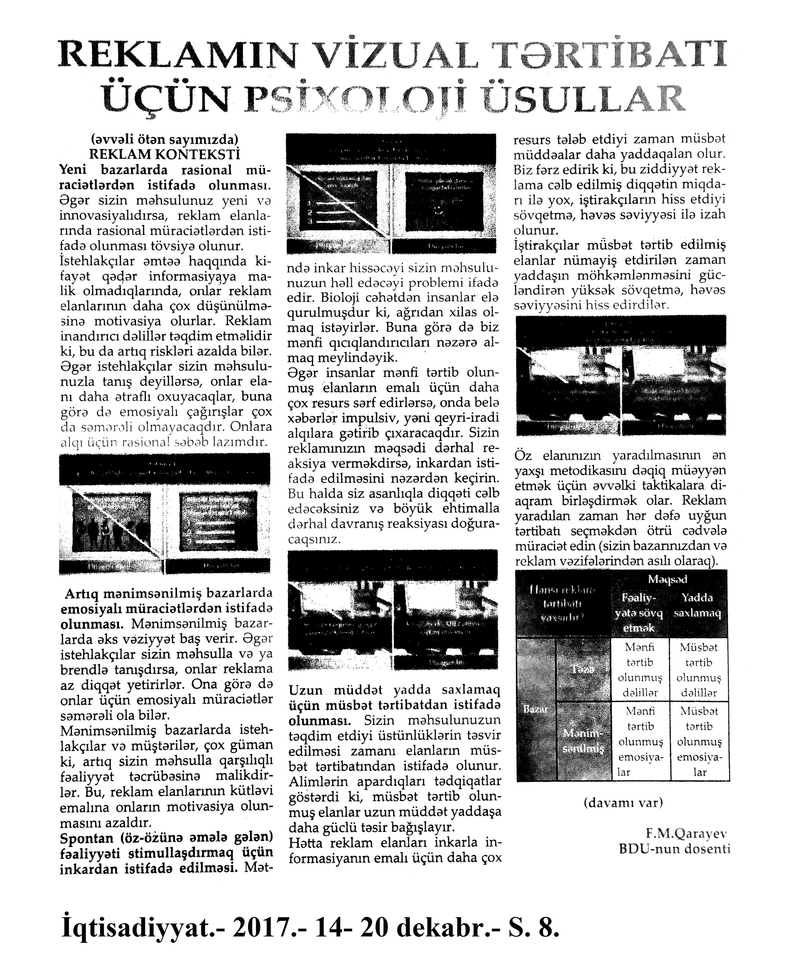 İNFORMASİYA VƏ REKLAM İŞİ 203. Qarayev, F. M. Reklamın vizual tərtibatı üçün psixoloji üsullar //İqtisadiyyat.- 2017.- 14-20 dekabr.- S.8. 204. Qarayev, F. M. Reklamın vizual tərtibatı üçün psixoloji üsullar //İqtisadiyyat.- 2017.- 21-27 dekabr.- S.8.
