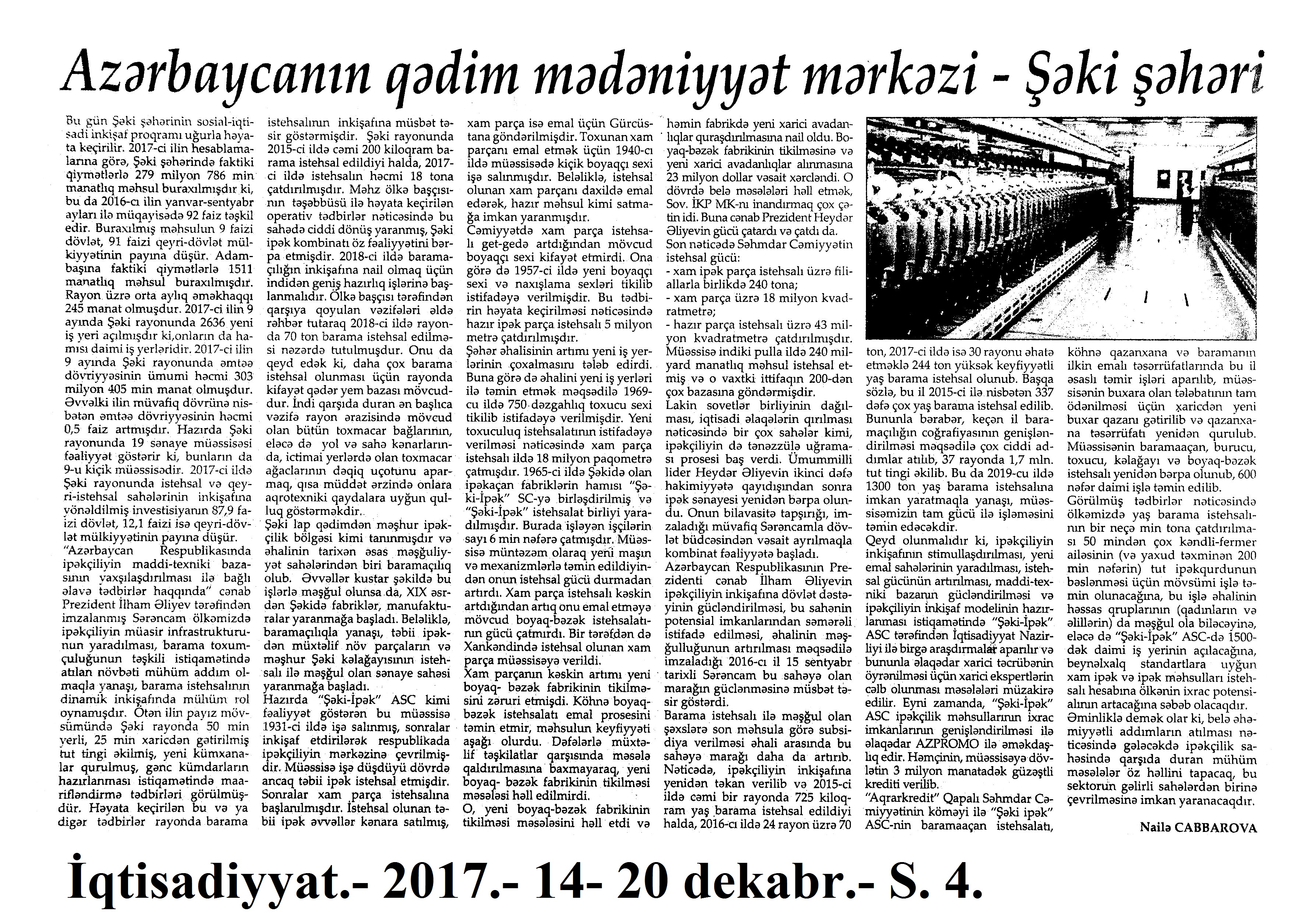 DEKORATİV-TƏTBİQİ İNCƏSƏNƏT 283. Abdullayev, M. Azərbaycanın regionlarında yeni xalçaçılıq fabrikləri yaradılır //Yeni Azərbaycan.- 2017.- 13 dekabr.- S.7. 284. Azərbaycanın tarixi qəhrəmanları gənclərin gözü ilə: [Daş Salnamə Muzeyində yeniyetmə və gənclərin əl işlərinin nümayişi haqqında] Mədəniyyət.- 2017.- 22 dekabr.- S.9. 285. Dünyanın ən qədim xalısından bəhs edən kitab: [Xalçaçı rəssam Məmmədhüseyn Hüseynovun müəllifi olduğu “Pazırık xalısı – rəmzlər dünyası” kitabının nəşri haqqında] //Mədəniyyət.- 2017.- 15 dekabr.- S.7. 286. Əliyev, Z. Qobelen psixoloji yaşantıların daşıyıcısı kimi: [Adil Şıxəliyev haqqında] //Kaspi.- 2017.- 23-25 dekabr.- S.24. 287. Həsənli, T. Quba xalçaçılığının Qonaqkənd qolu //525-ci qəzet. - 2017.- 1 dekabr.- S.6. 288. Xalça Muzeyində qədim parça qalıqları bərpa olunub: [arxeoloji parçaların bərpası haqqında] //Mədəniyyət.- 2017.- 8 dekabr.- S.10. 289. Kazımova, Z. Xalça Muzeyində III-V əsrə aid olduğu güman edilən parça qalıqları bərpa olunub //Xalq qəzeti.- 2017.- 10 dekabr.- S.8. 290. Qubada güclü xalçaçılıq ənənələri formalaşıb: [Prezident İlham Əliyev və birinci xanım Mehriban Əliyeva “Azərxalça” Açıq Səhmdar Cəmiyyətinin Quba filialının açılışında iştirak ediblər] //Azərbaycan.- 2017.-8 dekabr.- S.3-4. 291. Nərimanoğlu, M. Ağaca, daşa “can verənlər”: xalq sənətkarlığı: bədii oyma //Azərbaycan.- 2017.-14 dekabr.- S.7. 292. Salamzadə, Ə. “Naxçıvan xalçaçılığı: ənənə və müasirlik” //Xalq qəzeti.- 2017.- 30 dekabr.- S.9.