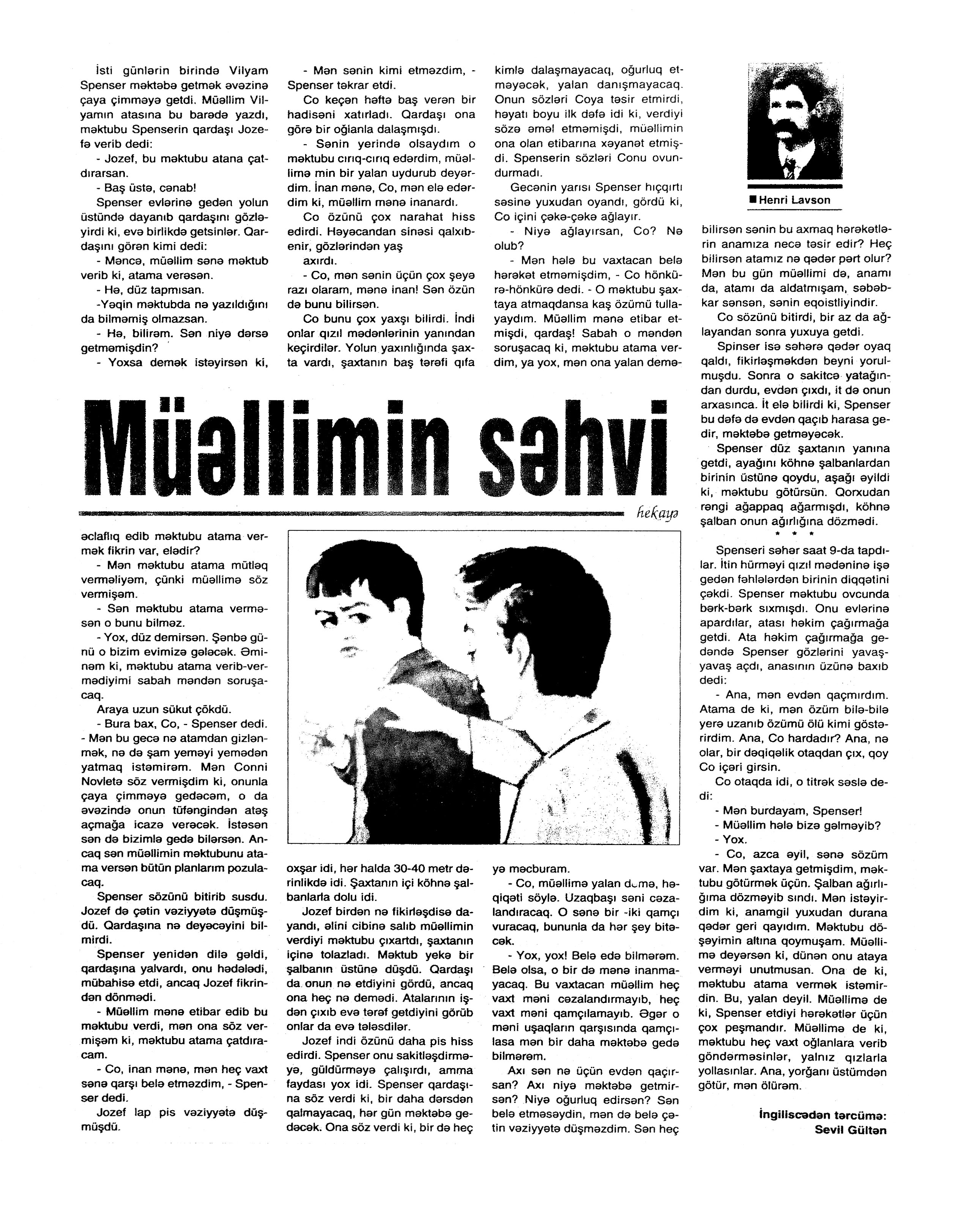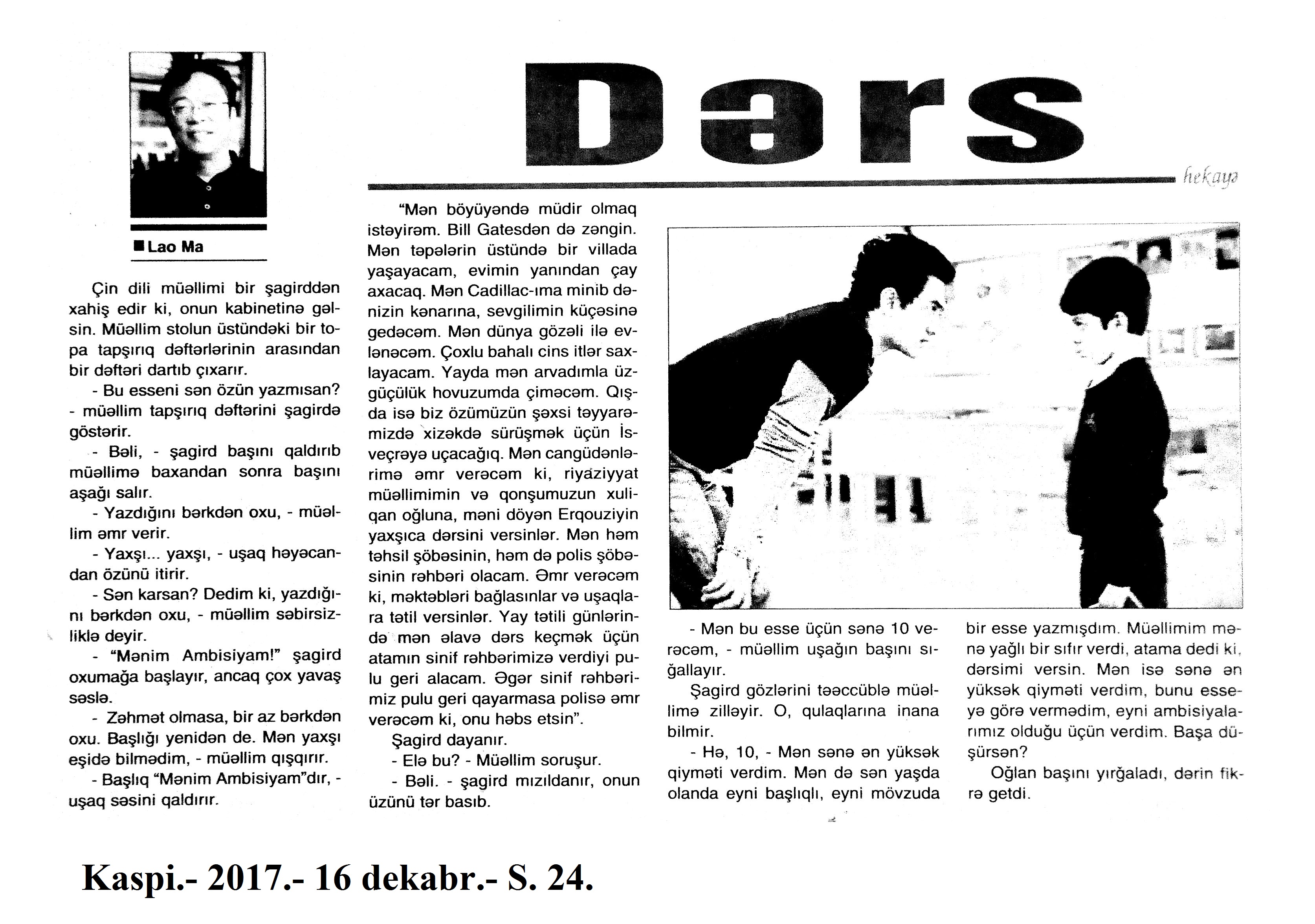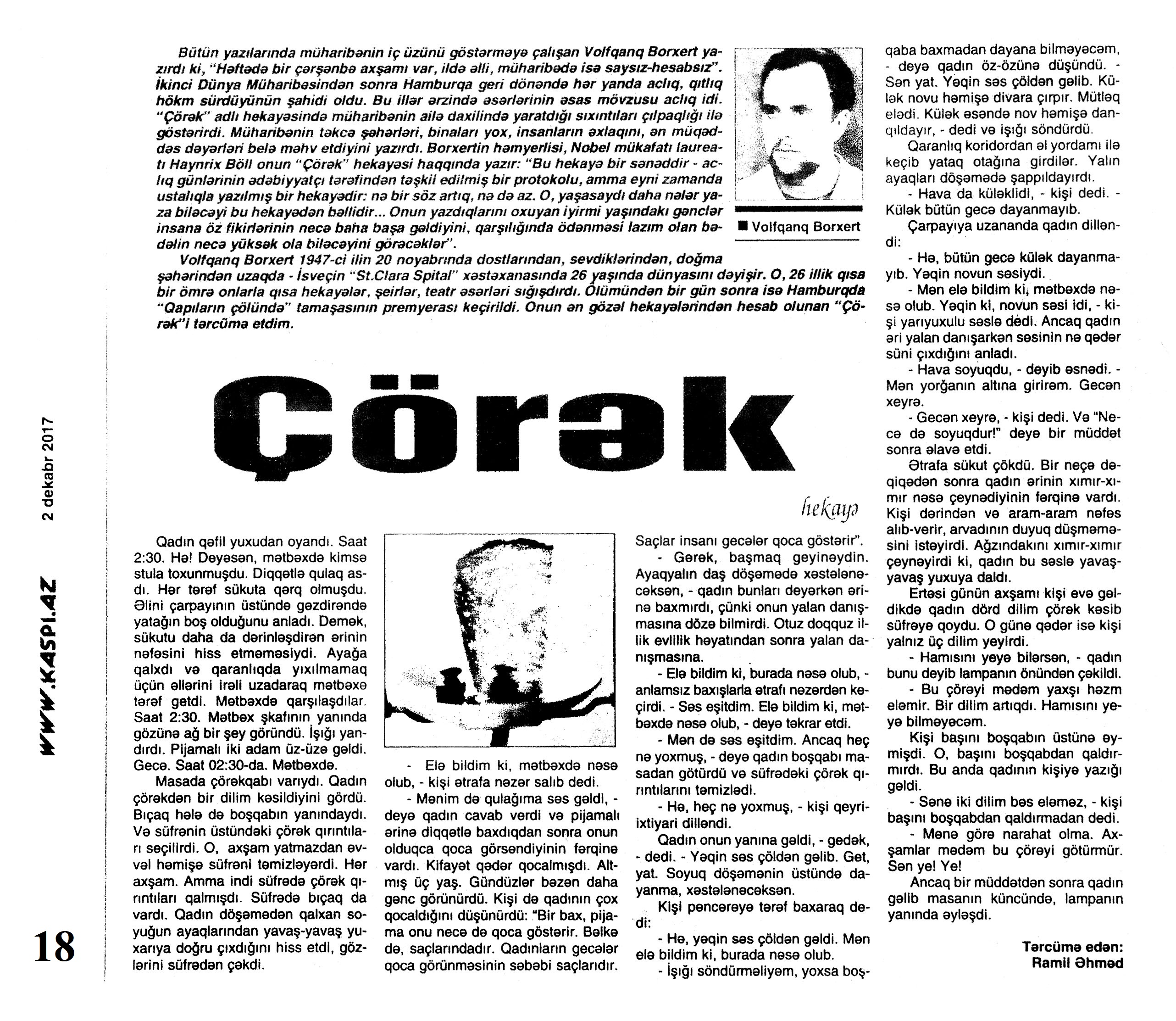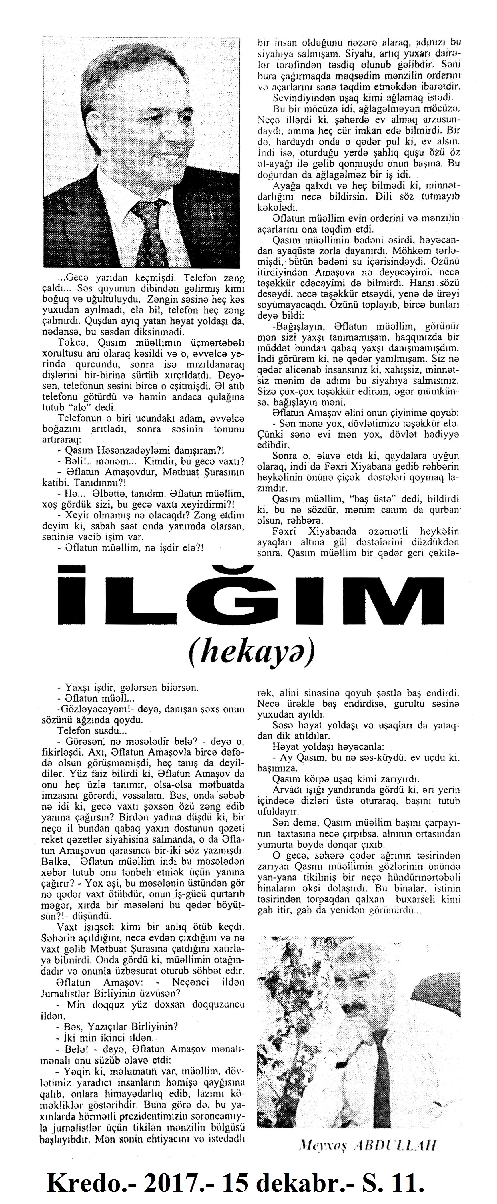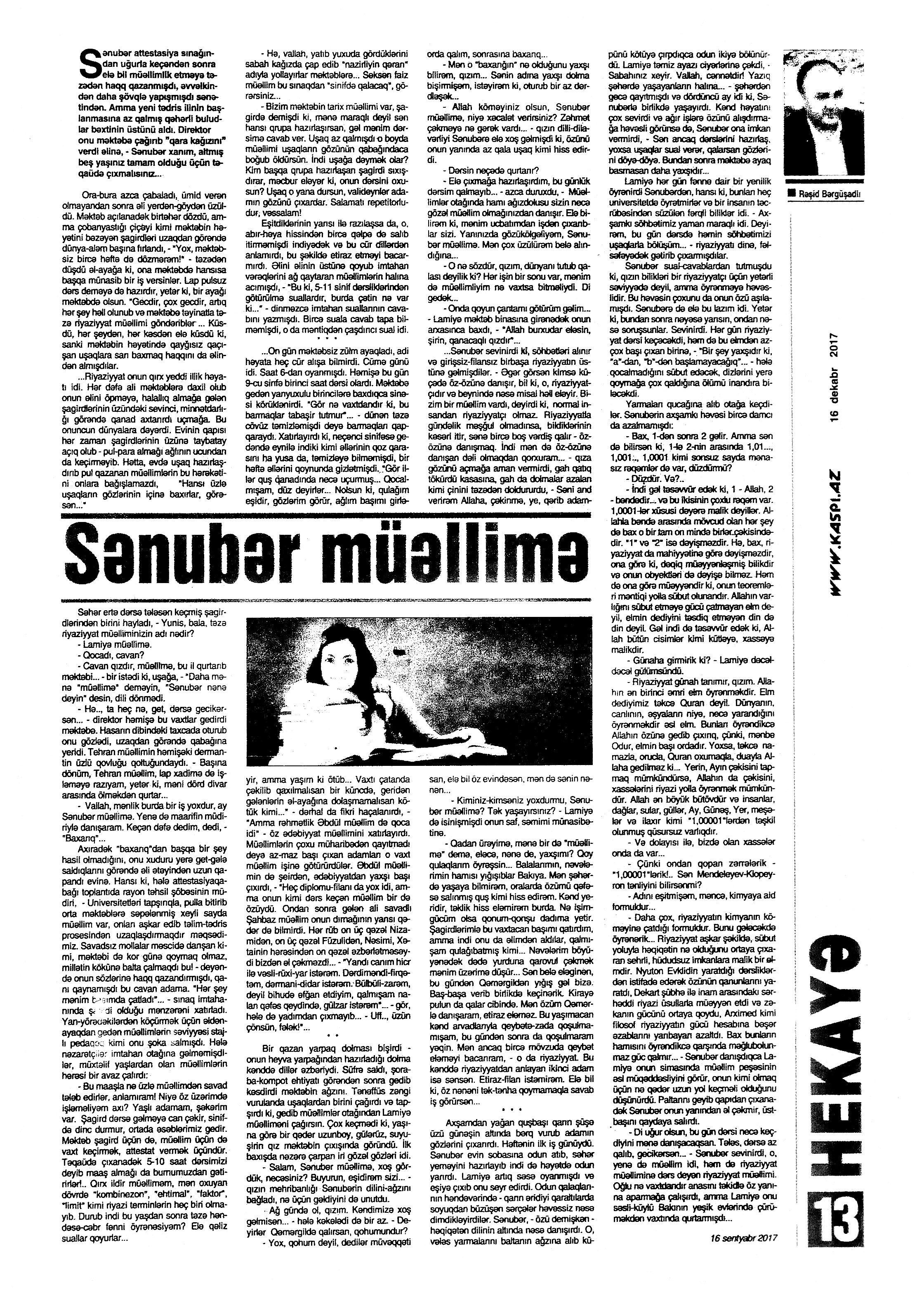 HEKAYƏLƏR 685. Abdullah, M. Daşlara həkk olunan xoşbəxtlik... //Ədəbiyyat qəzeti -2017.- 23 dekabr.- S.5. 686. Abdullah, M. İlğım //Kredo.- 2017.- 15 dekabr.- S. 11. 687. Aran, S. Oynama və ya Səltənətin bir gündə üç dəfə bayılması //Ədəbiyyat qəzeti.- 2017.- 9 dekabr.- S.14-15. 688. Baum, F. Şən dəyirmançı: [ingilis dilindən tərcümə] /tərc.etdi Sevil Gültən //Kaspi.- 2017.- 30 dekabr.- S.11. 689. Bərgüşadlı, R. Sənubər müəllimə //Kaspi.- 2017.- 16-18 dekabr.- S.13. 690. Bərgüşadlı, R. Zamanın nəbzi //525-ci qəzet.- 2017.- 7 dekabr.- S.8. 691. Bəyim, N. Kəpənək sevgisi //Ədəbiyyat qəzeti.- 2017.- 30 dekabr.- S.26-27. 692. Borxert, V. Çörək //Kaspi.-2017.- 2 dekabr.- S.18. 693. Elçin. Rəssam Muxtar Manaflının həyatı, sənəti və bu dünyadan qaçışı //Ədəbiyyat qəzeti.- 2017.- 2 dekabr.- S.6-7. 694. Elçin. Tut budağı, Ərik Budağı və Sarı Bülbülün nağılı //Ədəbiyyat qəzeti. - 2017.- 30 dekabr.- S.4-5.; 525-ci qəzet.- 2017.- 30 dekabr.- S.14. 695. Fərəcov, F. Asan xidmət //Ədalət.- 2017.- 23 dekabr.- S.14. 696. Fərəcov, F. Papaq //Ədalət.- 2017.- 30 dekabr.- S.14. 697. Fikrətoğlu, O. Ağrı //Ədəbiyyat qəzeti.- 2017.- 9 dekabr.- S.24. 698. Fikrətoğlu, O. Cemin atası //Ədəbiyyat qəzeti.-2017.- 2 dekabr.- S.8-9. 699. Fikrətoğlu, O. Qürbətdə //Kaspi.-2017.- 2 dekabr.- S.21. 700. Hacı K. Yeraltı külək: uzun hekayə //Ədəbiyyat qəzeti.- 2017.- 16 dekabr.- S.20-22. 701. Heminquey, E. Yağış altında pişik balası: [amerikan ədəbiyyatı] /tərc.etdi Nəccar Ümid //Ədəbiyyat qəzeti.- 2017.- 9 dekabr.- S.29. 702. Hüseynzadə, X. Qatır Qulam //Ədəbiyyat qəzeti.- 2017.- 16 dekabr.- S.18. 703. Xəlil, Z. Qarğaların dostluğu; Ayı və armud; Pəri və Miri; Adil məktəbə gedir və s. //Ədəbiyyat qəzeti.- 2017.- 9 dekabr.- S.8-9. 704. İmranoğlu, K. Markesin ölümü //525-ci qəzet.- 2017.- 2 dekabr.- S.23-24. 705. İmranoğlu, K. Natura //Kaspi.- 2017.- 16-18 dekabr.- S.20-21. 706. İsabəyli, Q. Aauuu...; Ayı və ovçular; Şəm-Şəmlə Nökərin əhvalatı //Ədəbiyyat qəzeti.- 2017.- 30 dekabr.- S.11. 707. İsgəndərli, B. Amerika sevdası, yaxud boşa çıxmış xəyallar //525-ci qəzet.- 2017.- 13 dekabr.- S.8. 708. Kamal, R. Yazı masası haqqında ballada //Ədəbiyyat qəzeti.- 2017.- 30 dekabr.- S.12. 709. Kəngərli, A. Atasının balası //Ədəbiyyat qəzeti.- 2017.- 30 dekabr.- S.12. 710. Qismət, A. Şi-Tsu //Ədəbiyyat qəzeti.- 2017.- 16 dekabr.- S.4. 711. Qiyas, Ə. Düd...Düüd...Düüüd... //Ədəbiyyat qəzeti.- 2017.- 16 dekabr.- S.8. 712. Lavson, H. Müəllimin səhvi: [amerikan ədəbiyyatı] /ingilis dilindən tərc.etdi Sevil Gültən //Kaspi.- 2017.- 9-11 dekabr.- S.24. 713. Ma, L. Dərs /ingilis diluindən tərc.etdi Sevil Gültən //Kaspi.- 2017.- 16-18 dekabr.- S.24. 714. Ma, L. Yığmaq /ingilis diluindən tərc.etdi Sevil Gültən //Kaspi.- 2017.- 16-18 dekabr.- S.24. 715. Mopassan, G. Müqəddəs: [fransız ədəbiyyatı] /ingilis dilindən tərc.etdi Sevil Gültən //Kaspi.- 2017.- 9-11 dekabr.- S.11.