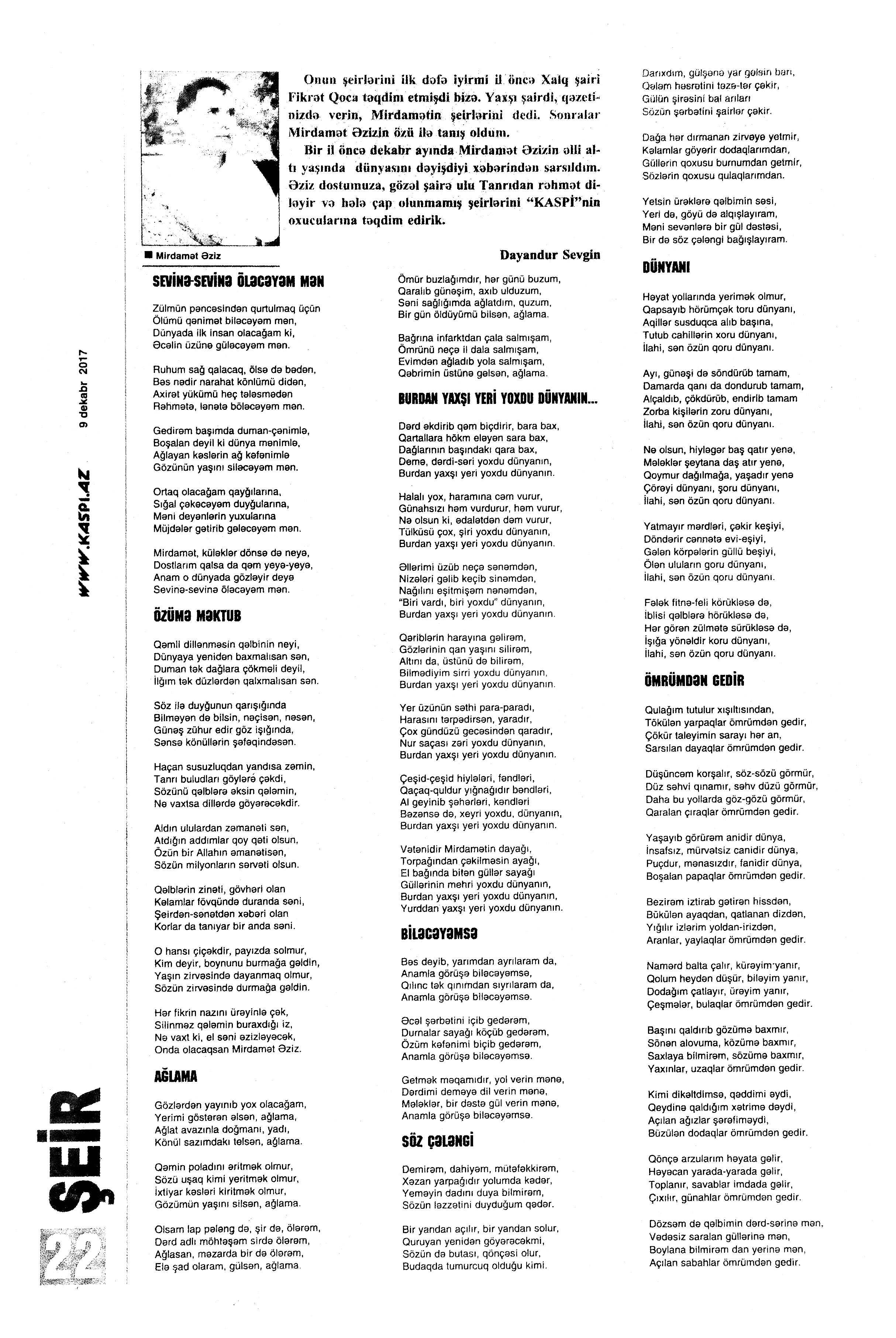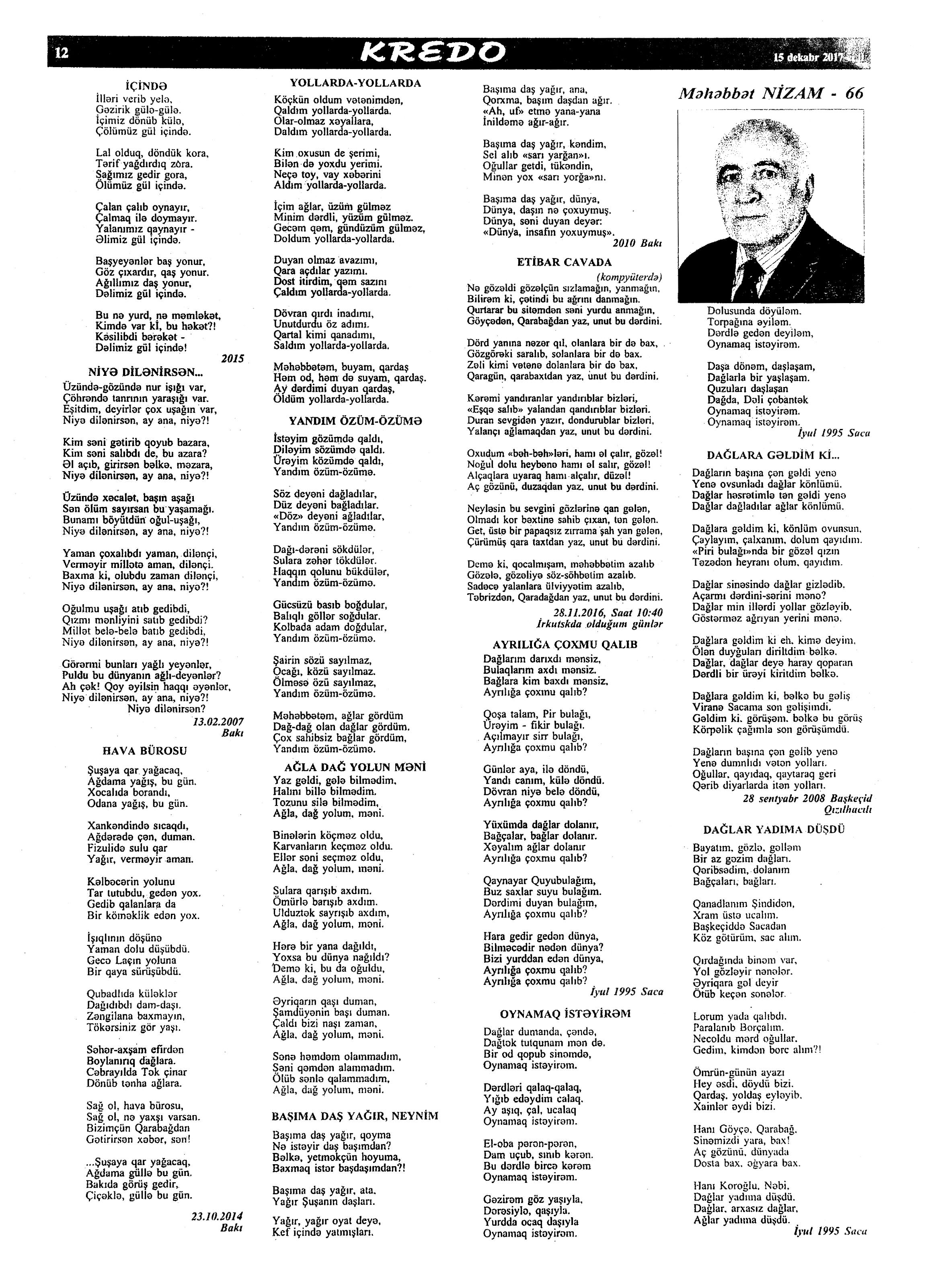 BƏDİİ ƏDƏBİYYAT VƏ ƏDƏBİYYATŞÜNASLIQ ŞEİRLƏR 603. Abbas, S. İnsan öz-özünə sığışmayanda; Görüşmək nə yaxşıdır; Şirin yar; Gəlməz; Hanı; Nə qaldı //Ədəbiyyat qəzeti.- 2017.- 30 dekabr.- S.27. 604. Abdin, T. Gedək: (Dostum Əbülfət Mədətoğlunun 59 yaşına) //Ədalət.- 2017.- 30 dekabr.- S.11. 605. Abdulla, K. Alın yazısı hədər yazılmır //Ədəbiyyat qəzeti.- 2017.- 9 dekabr.- S.11. 606. Anar. Rus şairlərindən çevirmələr //525-ci qəzet.- 2017.- 23 dekabr.- S.15. 607. Araz, M. Babək qılıncı: Ballada //Ədalət.- 2017.- 28 dekabr.- S.2. 608. Araz, M. ...Dünya heç kimin! - deyən şair; Mənim Naxçıvanım; Qarabağ düzü; Üstümə qayıdan yazılarım və s. //Ədalət.-2017.- 1 dekabr.- S.5. 609. Babaşov, B. Müəllim //Azərbaycan müəllimi.- 2017.- 8 dekabr.- S.14. 610. Budaq, R. Nağıl de nağıllaşaq; Dünya yarpağa bələnir; Dalğalar və s. //Kaspi.- 2017.- 30 dekabr.- S.22. 611. Cahan, M. Səni bağışlayıram...; Sütunsuz şeir...; Sənsizlik şəhəri...; Gedəndə //Ədəbiyyat qəzeti.-2017.- 2 dekabr.- S.2. 612. Cavadov, S. Əlvida, ötən il, salam, Təzə il! //Azərbaycan.- 2017.- 31 dekabr.- S.8. 613. Cəfərov, Ə. Leysanda islanan misralar: Xalq şairi Rəsul Rzaya; Dördlüklər; Dünya bu gün; Qısqanıram mən və s. //Olaylar.- 2017. - 16-18 dekabr.- S.13. 614. Cəmil, A. Bədbin tanışıma nikbin məktub; Payızla üz-üzə; Yarı bahar, yarı qışam; Bu karvanda; Sənin şəhərin; O eşqin sarayı uçmayıb, gülüm; Sirri açılmayan sabahdı onlar; Qayıt; Onun yolu – haqqın yolu; Ürəyinlə əritmisən daşı sən //Ədəbiyyat qəzeti.- 2017.- 23 dekabr.- S.26.