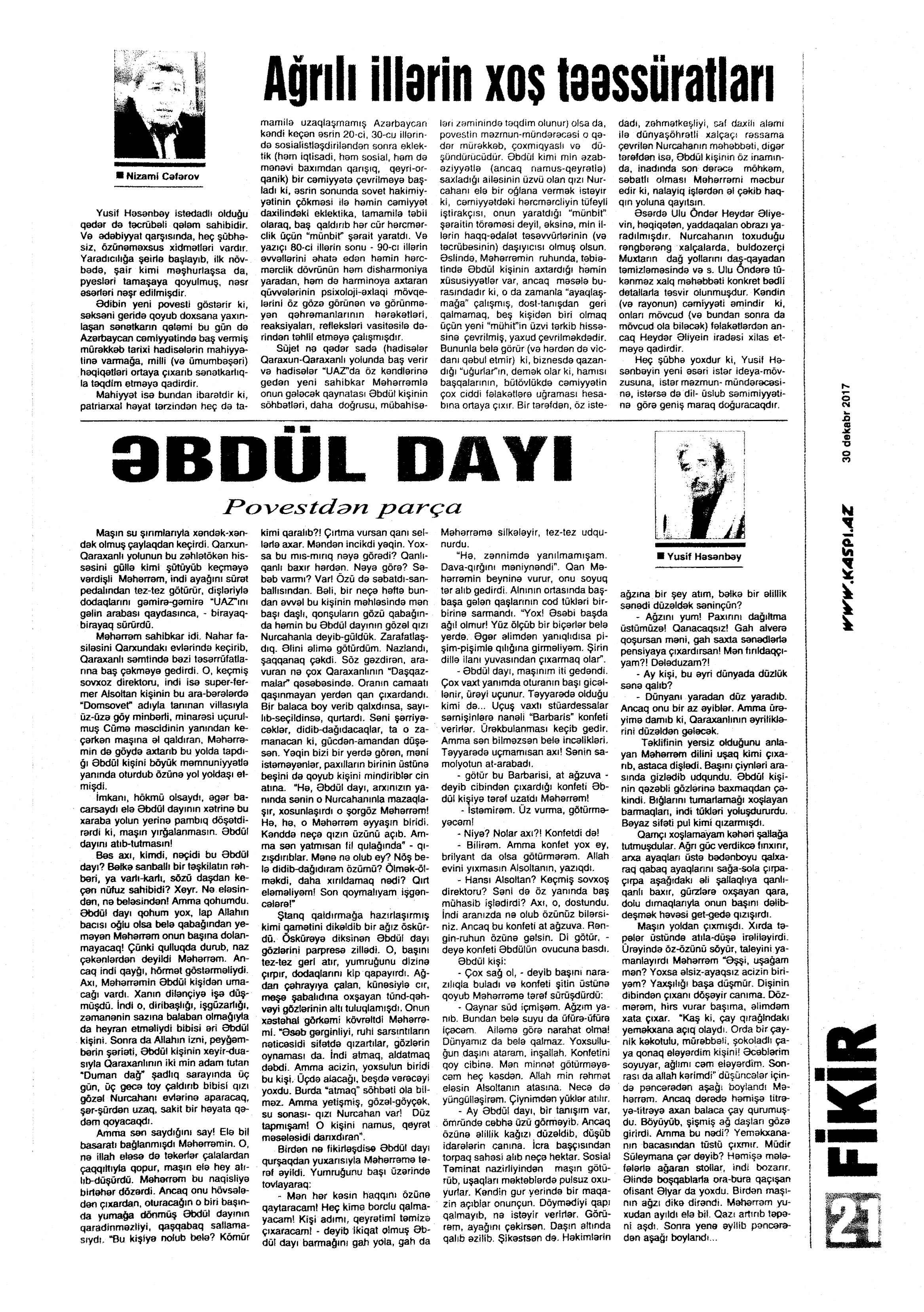 POVESTLƏR 735. Həsənbəy, Y. Əbdül dayı //Ədalət.- 2017.- 6 dekabr.- S.7. 736. Həsənbəy, Y. Əbdül dayı //Ədalət.- 2017.- 7 dekabr.- S.7. 737. Həsənbəy, Y. Əbdül dayı //Ədalət.- 2017.- 8 dekabr.- S.3. 738. Həsənbəy, Y. Əbdül dayı: povestdən parça //Kaspi.- 2017.- 30 dekabr.- S.21. 739. Şamilqızı, G. Div olanda noolar... //Ədəbiyyat qəzeti.- 2017.- 23 dekabr.- S.20-24.