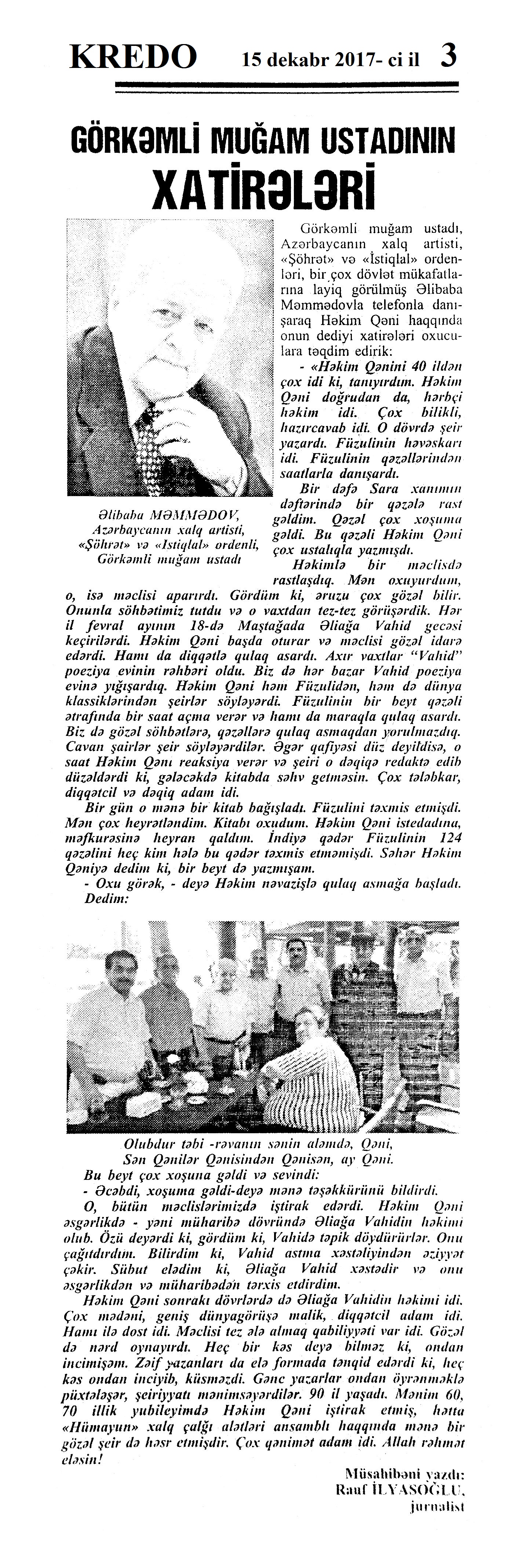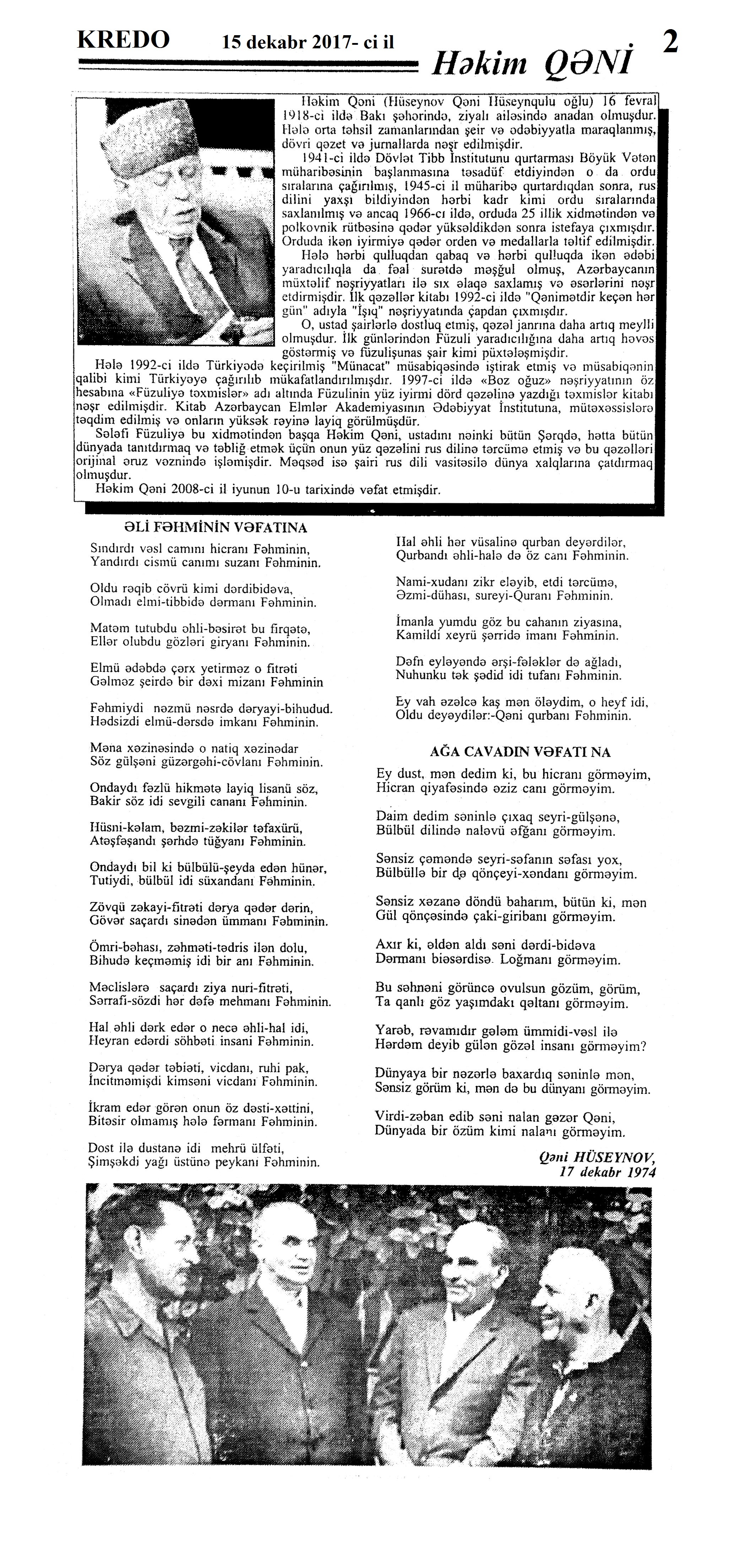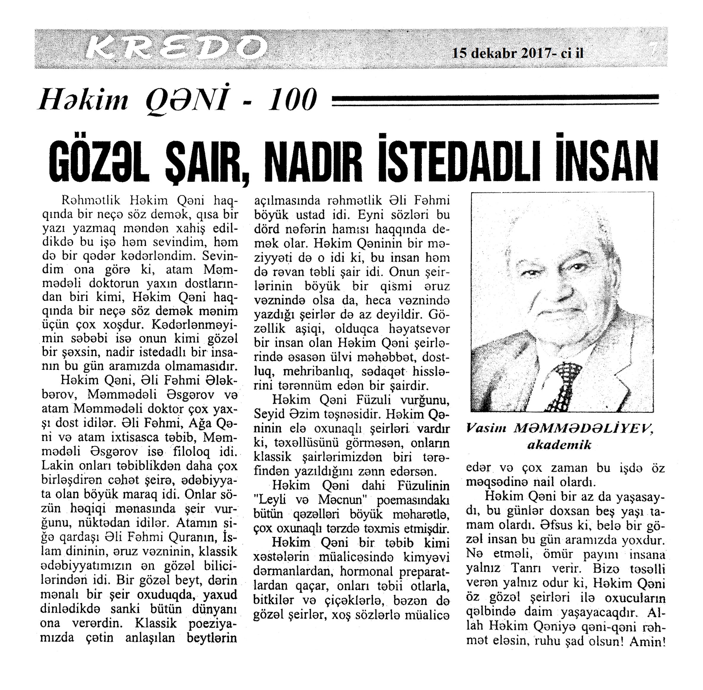 Həkim Qəni – 100 1048. Bakıxanov, T. Həkim Qəninin haqqında xatirələrim //Kredo.- 2017.- 15 dekabr.- S.4. 1049. Əkbərov, C. Nikbin təbiətli, gur səsli qorxmaz kişi: [Xalq artisti Canəli Əkbərovun şair, qəzəlxan haqqında xatirələri] //Kredo.- 2017.- 15 dekabr.- S.4. 1050. Hacıyev, T.; Hacıyeva, M. Həkim Qəni fenomeni //Kredo.- 2017.- 15 dekabr.- S.5. 1051. Hüseynov, R. Həkim Qəninin zənginliyi //Kredo.- 2017.- 15 dekabr.- S.6-7. 1052. Xələfli, Ə. Dünya bilər Qəni kimdi... //Kredo.- 2017.- 15 dekabr.- S.1. 1053. İlyasoğlu, R. Görkəmli muğam ustadının xatirələri: [şair, qəzəlxan haqqında muğam ustası Əlibaba Məmmədovun xatirələri] //Kredo.- 2017.- 15 dekabr.- S.2. 1054. Qəni oğlu, C. Atamı xatırlayarkən //Kredo.- 2017.- 15 dekabr.- S.7. 1055. Qəni oğlu, C. Dünyada bir Qəni vardı...: Cavid Həkim Qəni oğlu ilə müsahibə /müsahibəni apardı Əlirza Xələfli //Kredo.- 2017.- 15 dekabr.- S.3;16. 1056. Məmmədəliyev, V. Gözəl şair, nadir istedadlı insan: Həkim Qəni –100 //Kredo.- 2017.- 15 dekabr.- S.7.