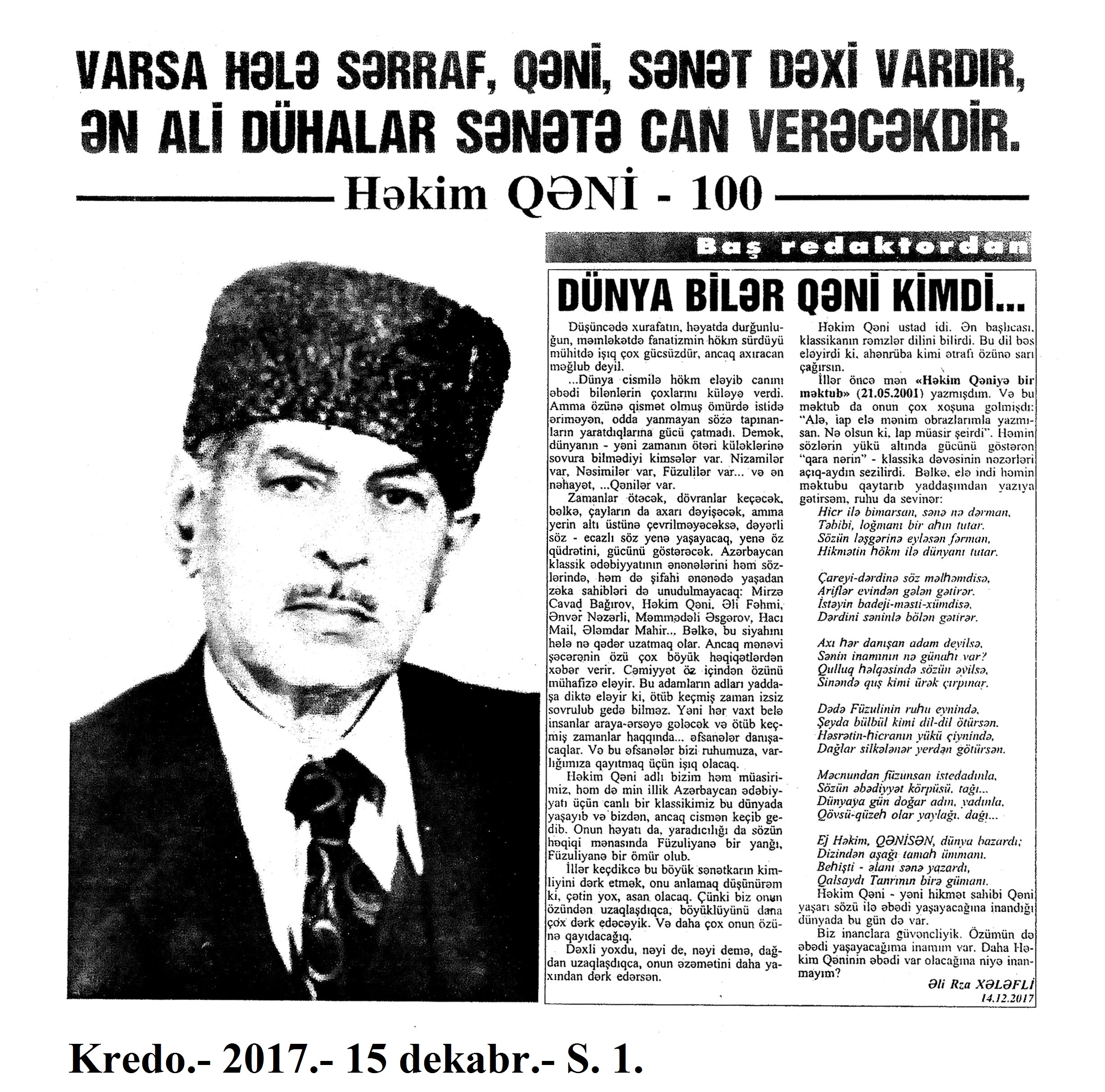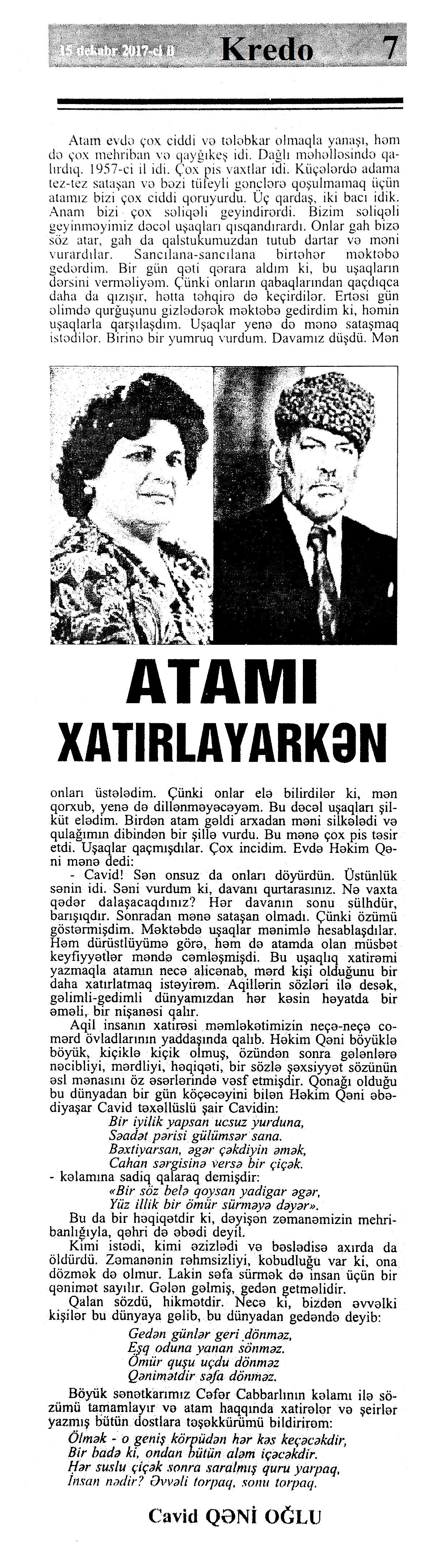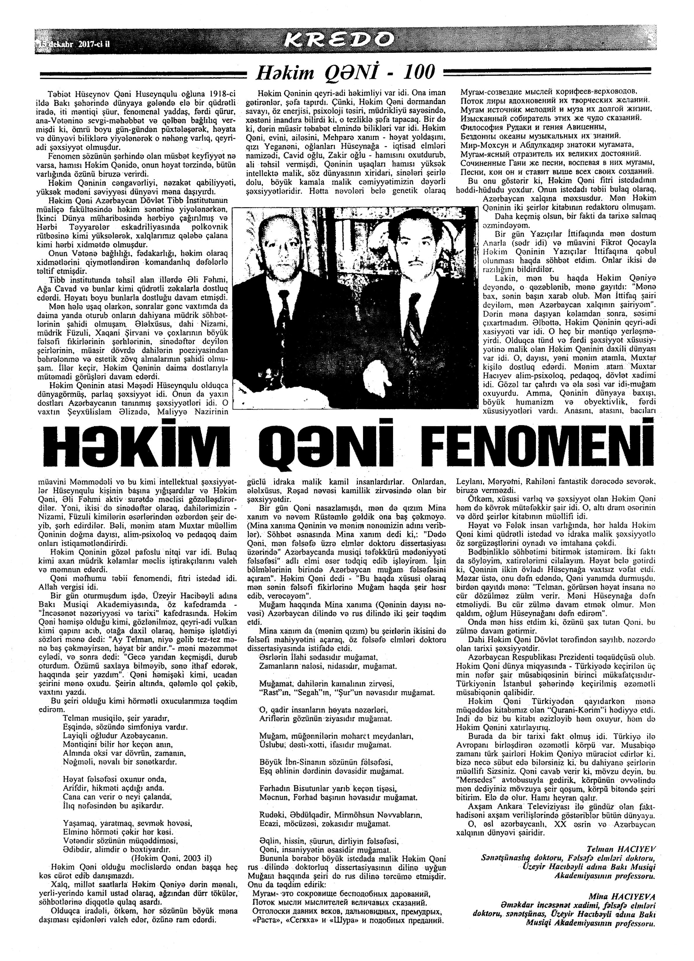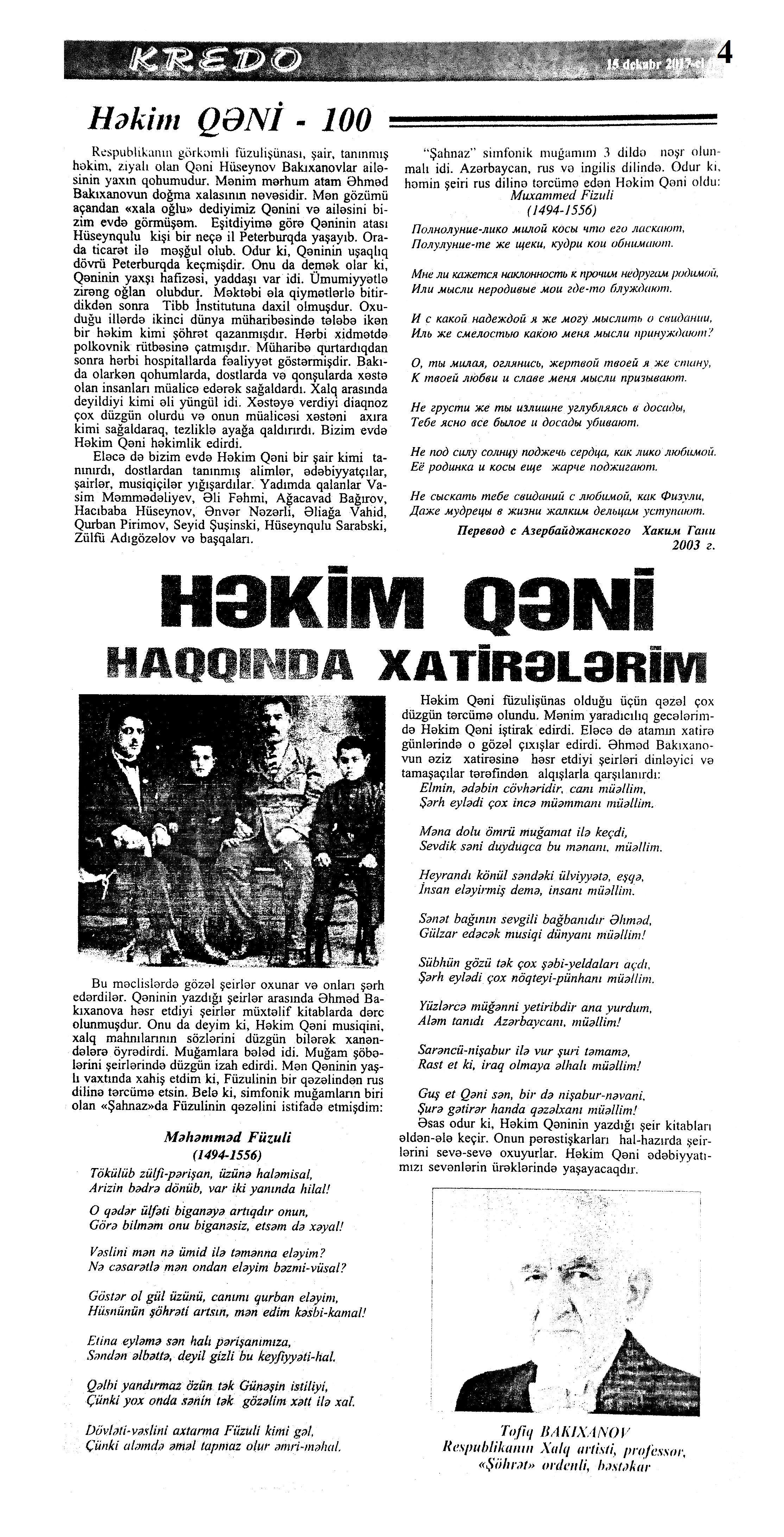 Həkim Qəni – 100 1048. Bakıxanov, T. Həkim Qəninin haqqında xatirələrim //Kredo.- 2017.- 15 dekabr.- S.4. 1049. Əkbərov, C. Nikbin təbiətli, gur səsli qorxmaz kişi: [Xalq artisti Canəli Əkbərovun şair, qəzəlxan haqqında xatirələri] //Kredo.- 2017.- 15 dekabr.- S.4. 1050. Hacıyev, T.; Hacıyeva, M. Həkim Qəni fenomeni //Kredo.- 2017.- 15 dekabr.- S.5. 1051. Hüseynov, R. Həkim Qəninin zənginliyi //Kredo.- 2017.- 15 dekabr.- S.6-7. 1052. Xələfli, Ə. Dünya bilər Qəni kimdi... //Kredo.- 2017.- 15 dekabr.- S.1. 1053. İlyasoğlu, R. Görkəmli muğam ustadının xatirələri: [şair, qəzəlxan haqqında muğam ustası Əlibaba Məmmədovun xatirələri] //Kredo.- 2017.- 15 dekabr.- S.2. 1054. Qəni oğlu, C. Atamı xatırlayarkən //Kredo.- 2017.- 15 dekabr.- S.7. 1055. Qəni oğlu, C. Dünyada bir Qəni vardı...: Cavid Həkim Qəni oğlu ilə müsahibə /müsahibəni apardı Əlirza Xələfli //Kredo.- 2017.- 15 dekabr.- S.3;16. 1056. Məmmədəliyev, V. Gözəl şair, nadir istedadlı insan: Həkim Qəni –100 //Kredo.- 2017.- 15 dekabr.- S.7.