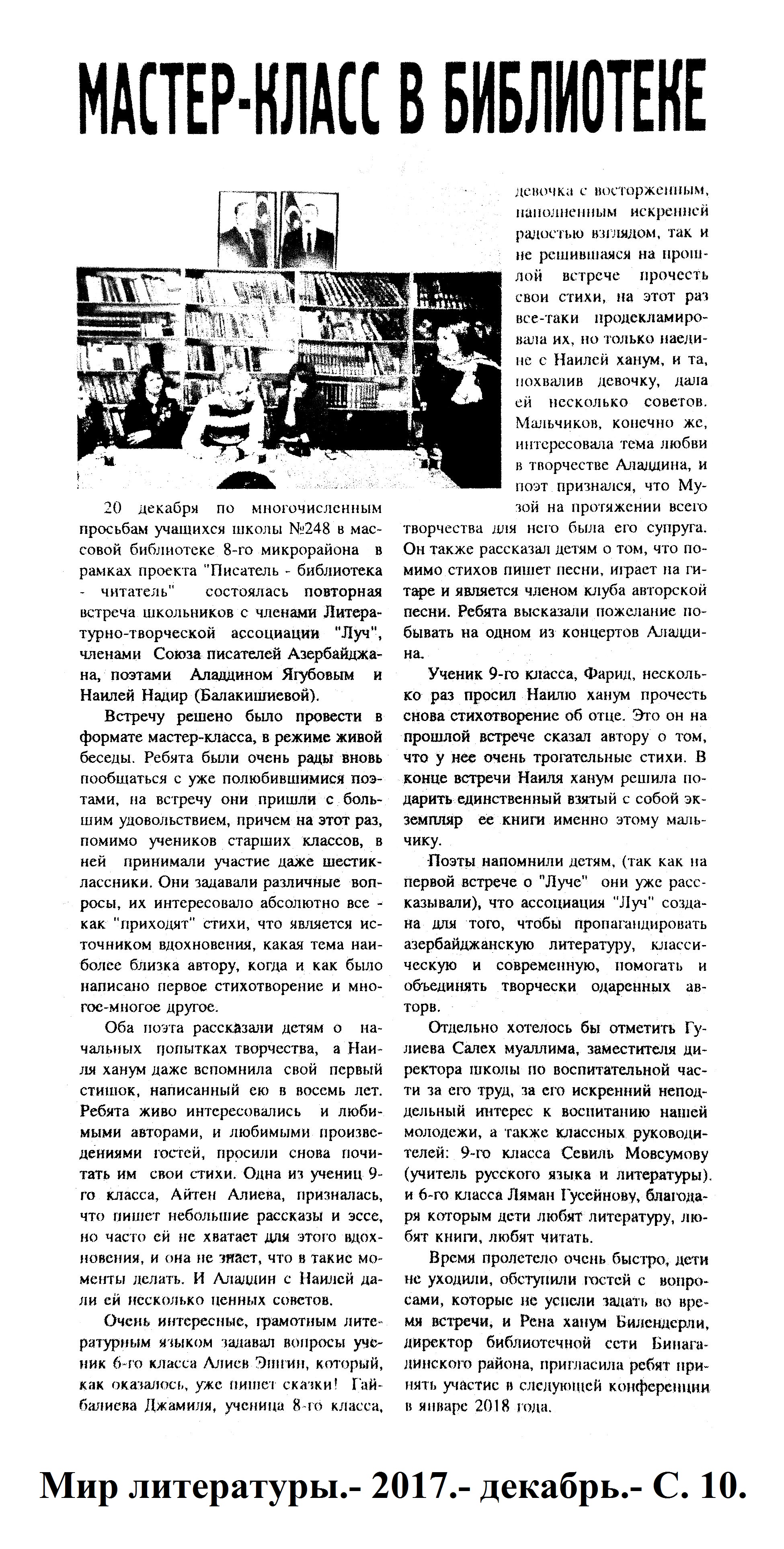 БИБЛИОТЕЧНОЕДЕЛО БИБЛИОТЕКОВЕДЕНИЕ 1166. Мамедова, Л. Для детей-книголюбов Азербайджана: О проектах в сфере развития и поддержки детского чтения //Вышка. - 2017.- 29 декабря.- С.10. 1167. Мастер-класс в библиотеке: [о проекте «Писатель – библиотека – читатель» в библиотеке школы №248] //Мир литературы. - 2017.- № 10 (124) декабрь.- С.10.