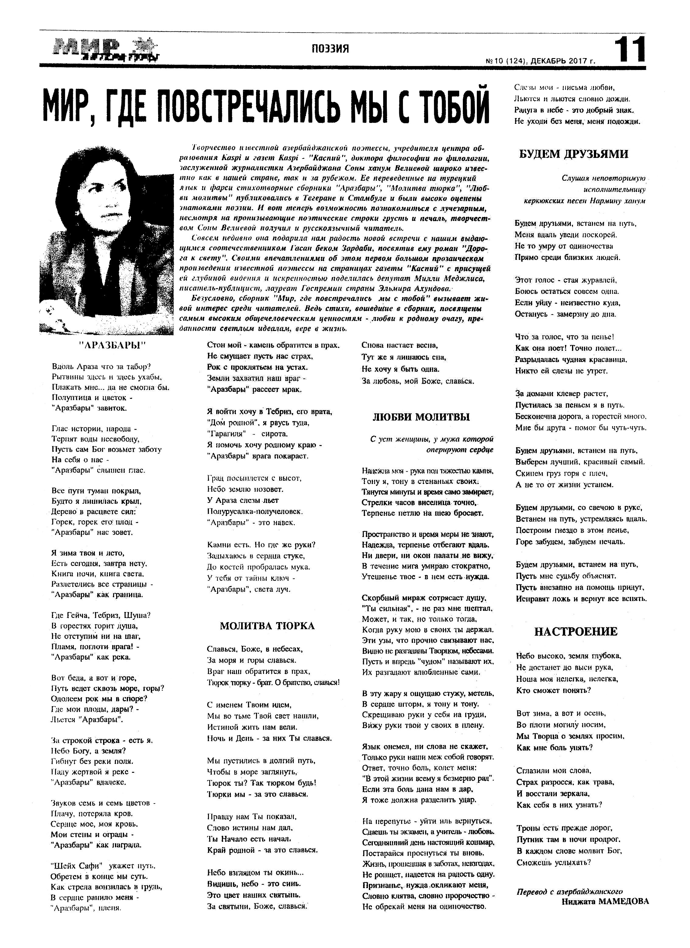 ПОЭЗИЯ 1290. Велиева, С. Мир, где повстречались мы с тобой: [стихи в переводе Ниджата Мамедова] //Мир литературы.- 2017.- № 10 (124) декабрь.- С.11.