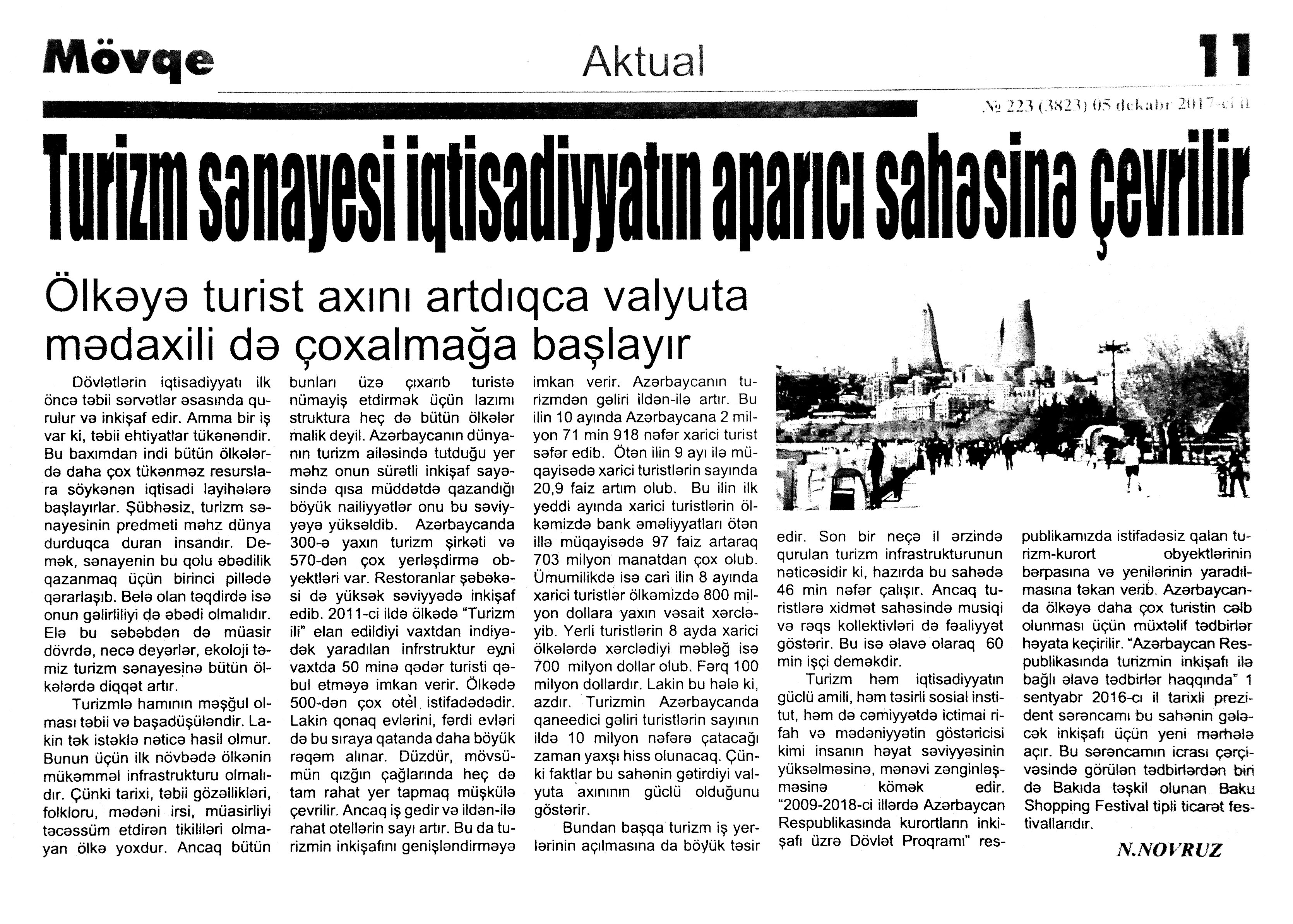ТУРИЗМ 1264. Алекперова, Дж. Эко-и лечебный туризм в Азербайджане //Эхо.- 2017.- 27 декабря.- С.1, 3. 1265. Асадова, И. Азербайджан лидирует в Грузии по количеству туристов за 2017 год //Эхо.- 2017.- 14 декабря.- С. 8. 1266. Асадова, И. Baku Guide-самое новое и интересное о Баку //Эхо.- 2017.- 7 декабря.- С. 8. 1267. Буланова, О. В Нафталан за чудо-нефтью //Эхо.- 2017.- 30 декабря.- С. 16. 1268. Гаврилова, О. Пламенные башни Баку: Flame Towers стали современным символом азербайджанской столицы //Азербайджанские известия.- 2017.- 21 декабря.- С. 3. 1269. Гаджиева, Л. «Шахдаг» открывает сезон: Популярный горнолыжный курорт приготовил для своих гостей немало сюрпризов //Азербайджанские известия.- 2017.- 21 декабря.- С. 3. 1270. Рустамова, Э. Туристический рынок нужно исследовать //Эхо.- 2017.- 28 декабря.- С. 1-2. 1271. Хайрулина, Т. Туристы выбирают Азербайджан: С начала года страну посетили миллионы иностранцев //Каспiй.- 2017.- 13 декабря.- С. 11.